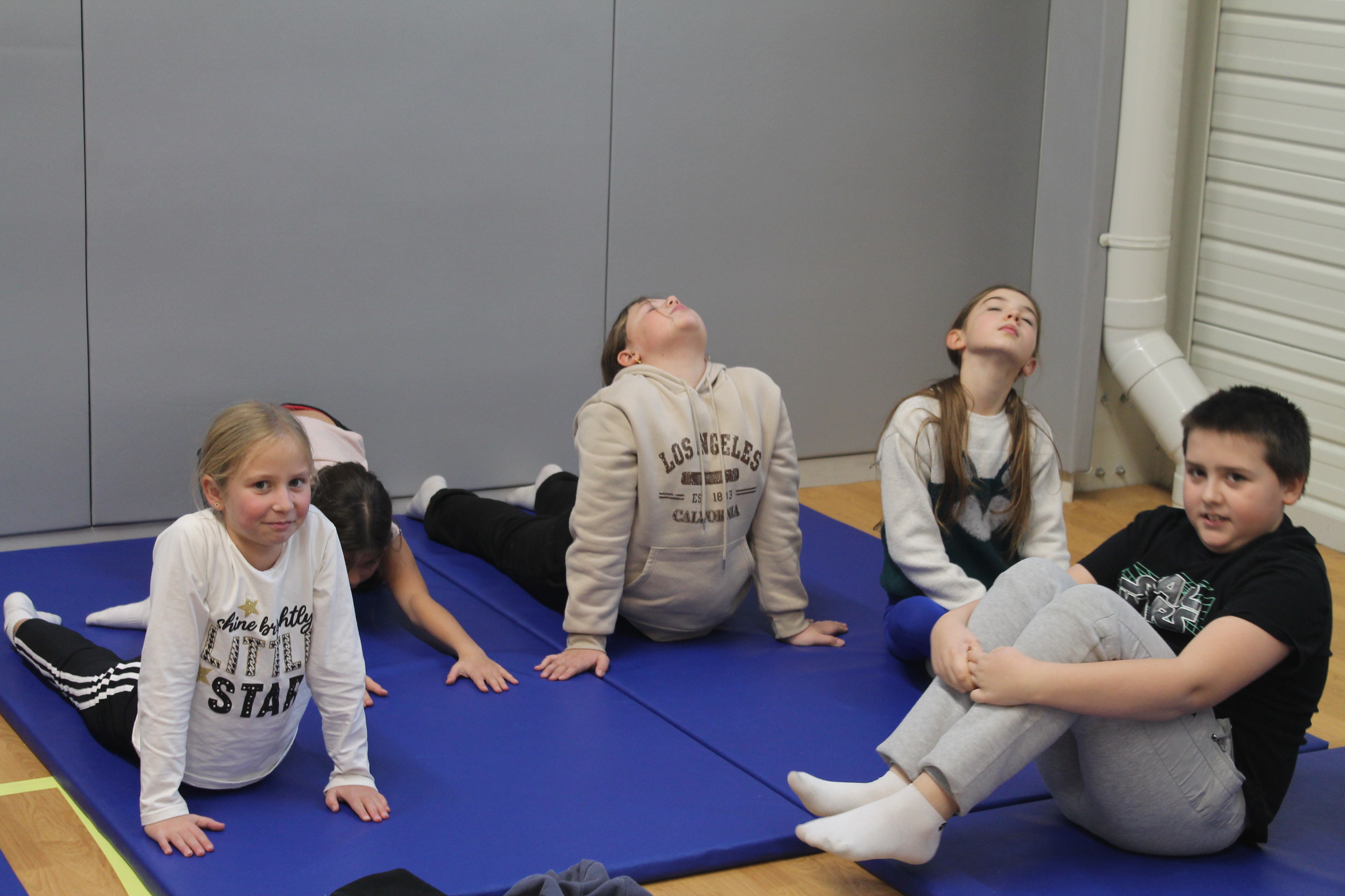 Pour le deuxième groupe, c'est la poutre, on doit se mettre en équilibre et marcher comme dans la rue. Le troisième qroupe, c'est le trampoline, on doit se mettre debout sur un tapis.