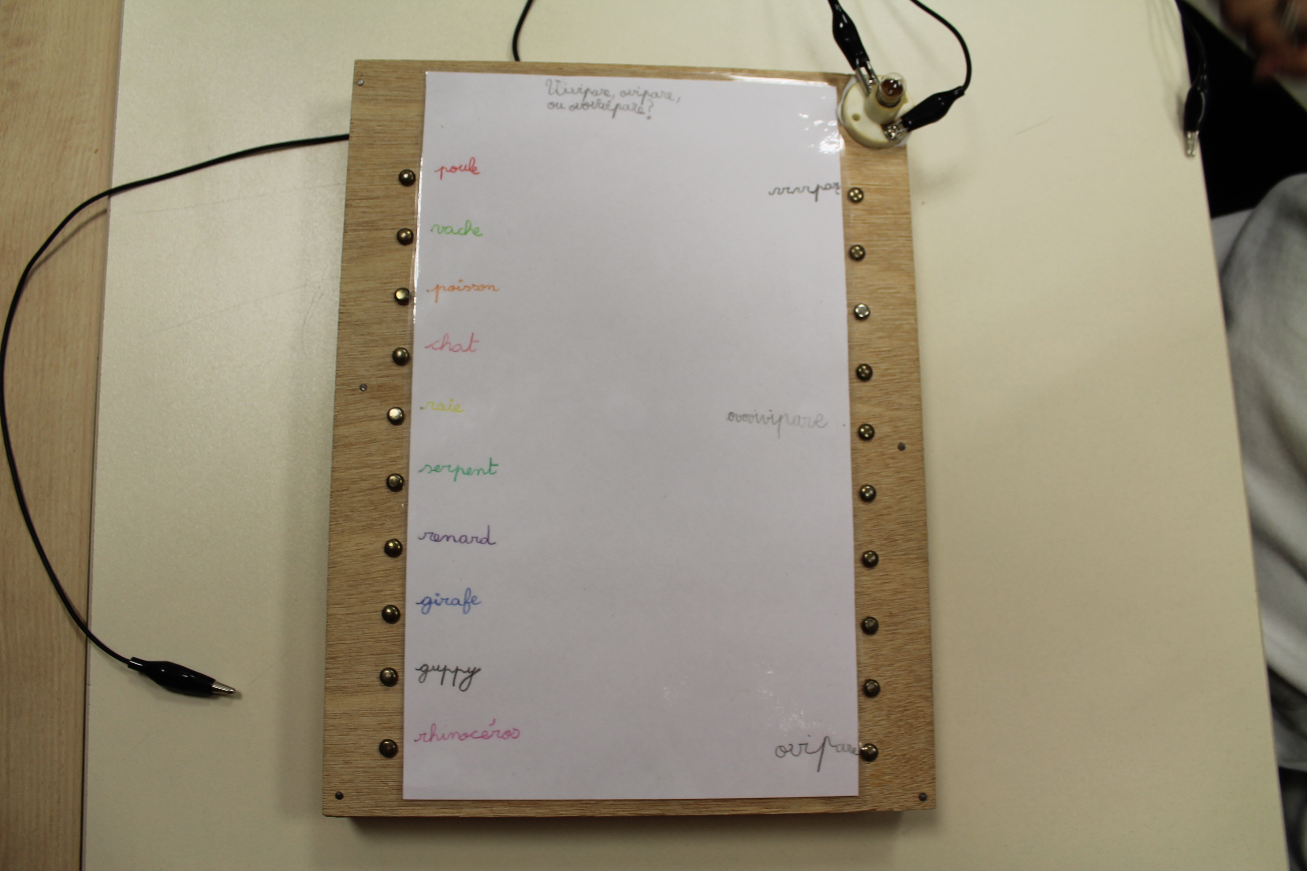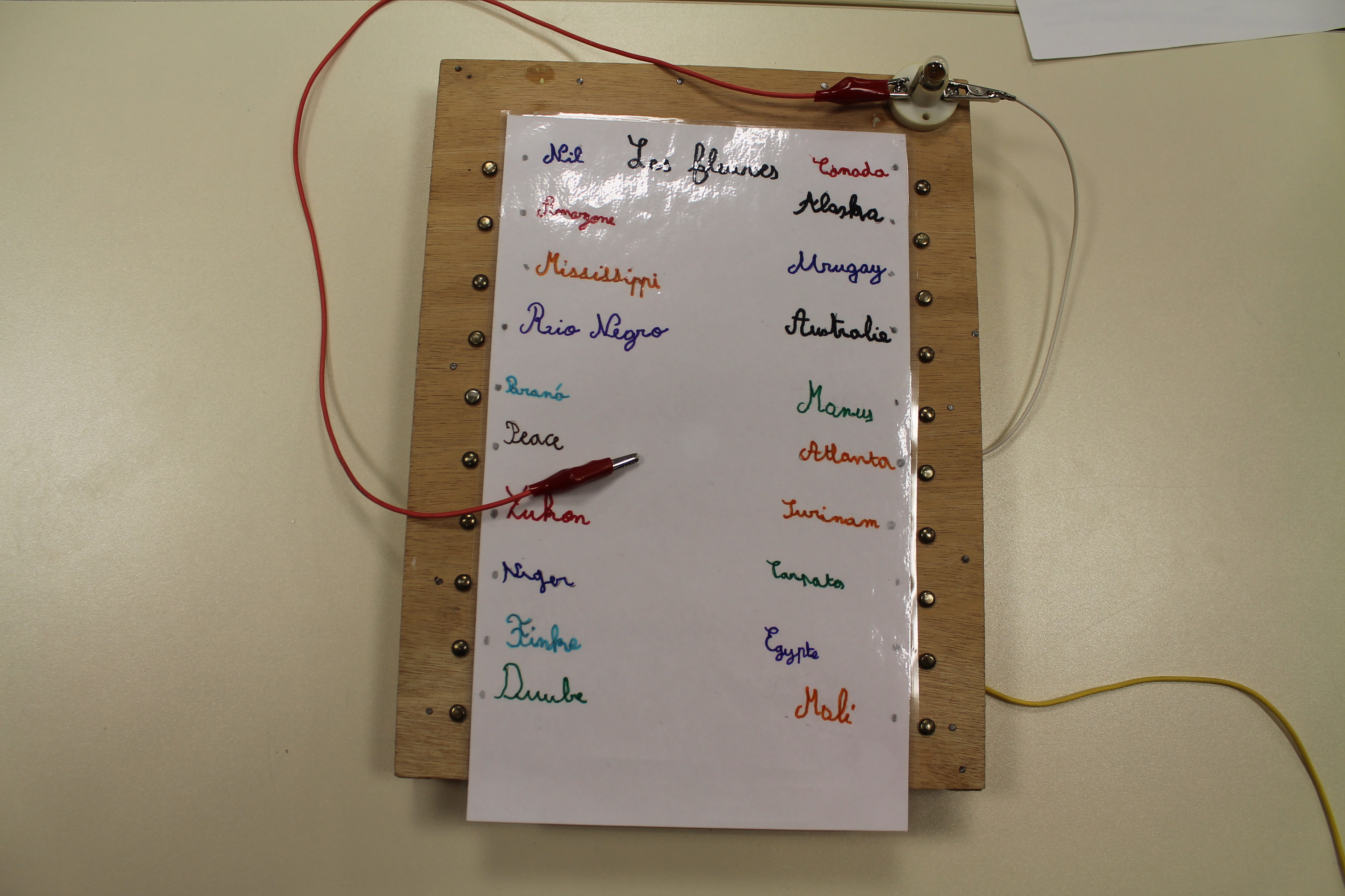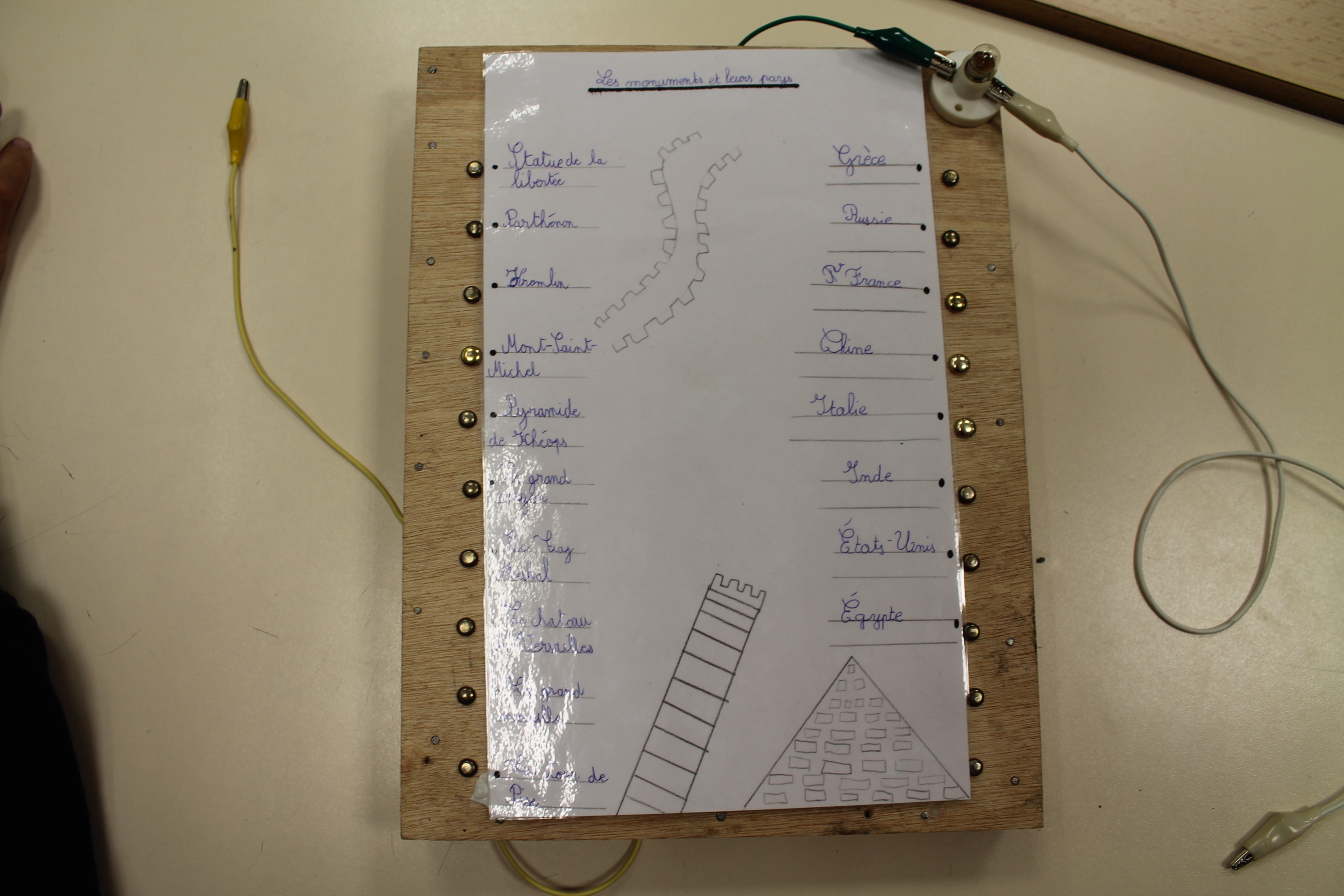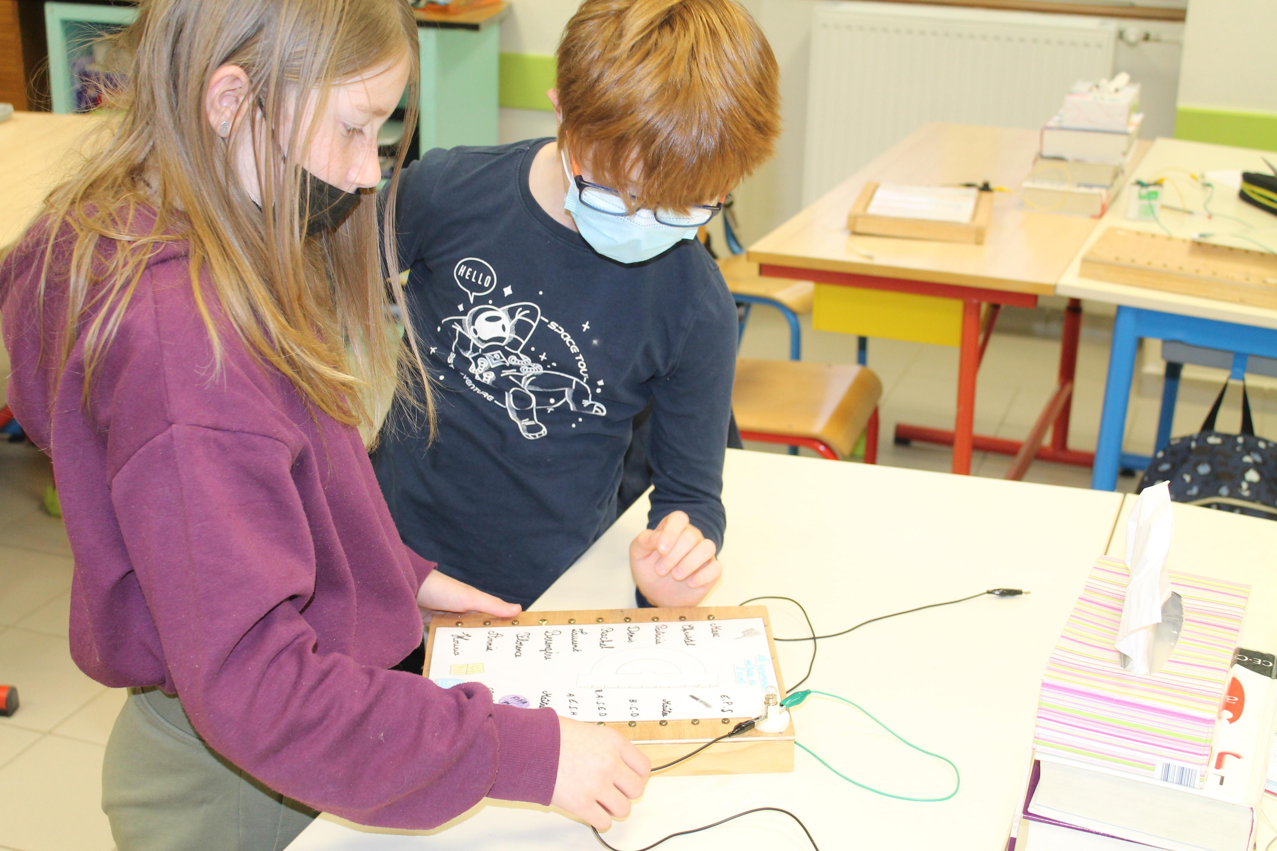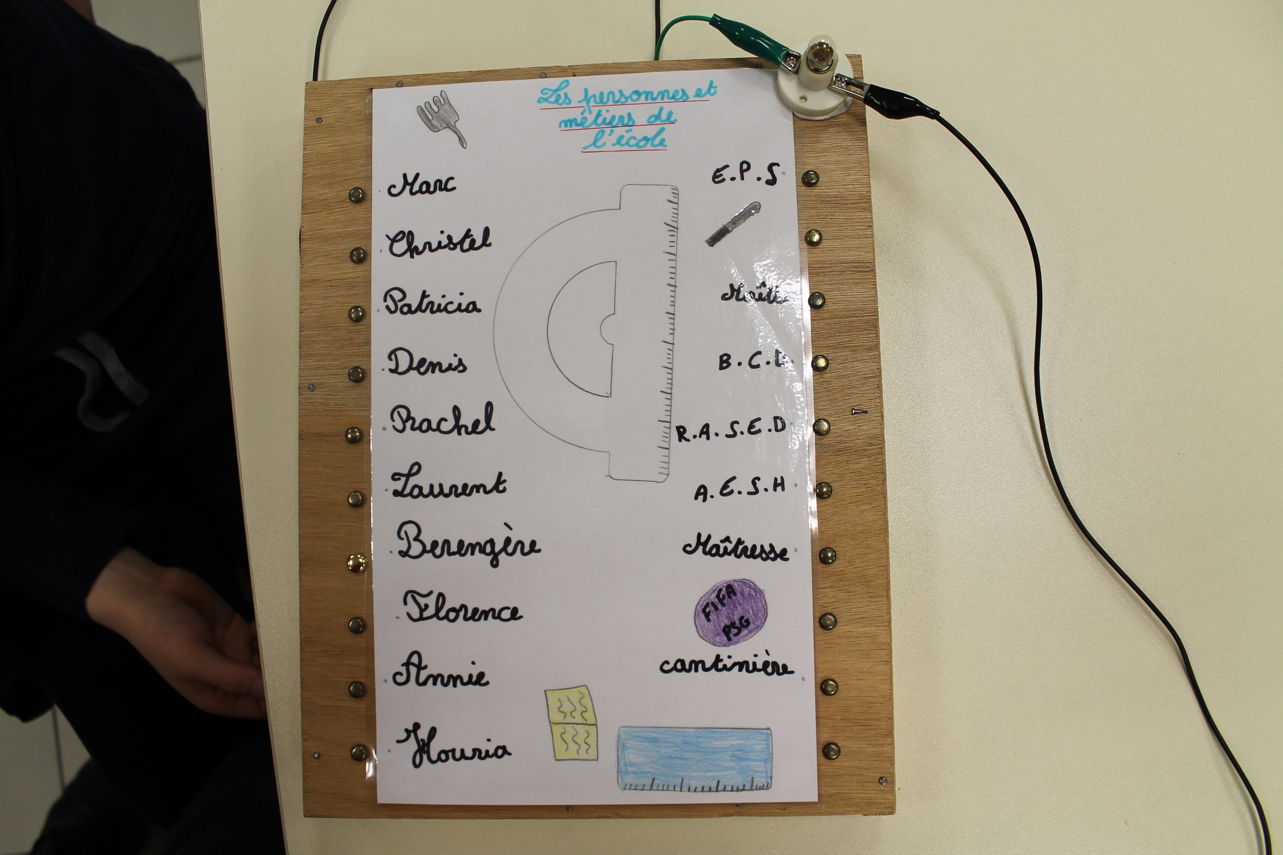 En science nous faisons des jeux électriques . En matériel nous utilisons une boite en bois, des attaches parisiennes, des fils pour devant et derrière, un support pour la lampe, une pile et une petite lampe. Les fils qui sont derrière sont reliés par rapport à la fiche . S'y on relie au bon endroit la lampe s'allumera si on ne met pas la bonne réponse la lampe ne s'allumera pas. Quand on a finit sur la fiche on plastifie. Ensuite il faut la coller avec de la Patafixe. La petite lampe il faut aussi la coller sur un coin de la boite et la pile il faut la coller derrière avec les fils. Quand on a finit on l'essaye pour voir si c'est bon.