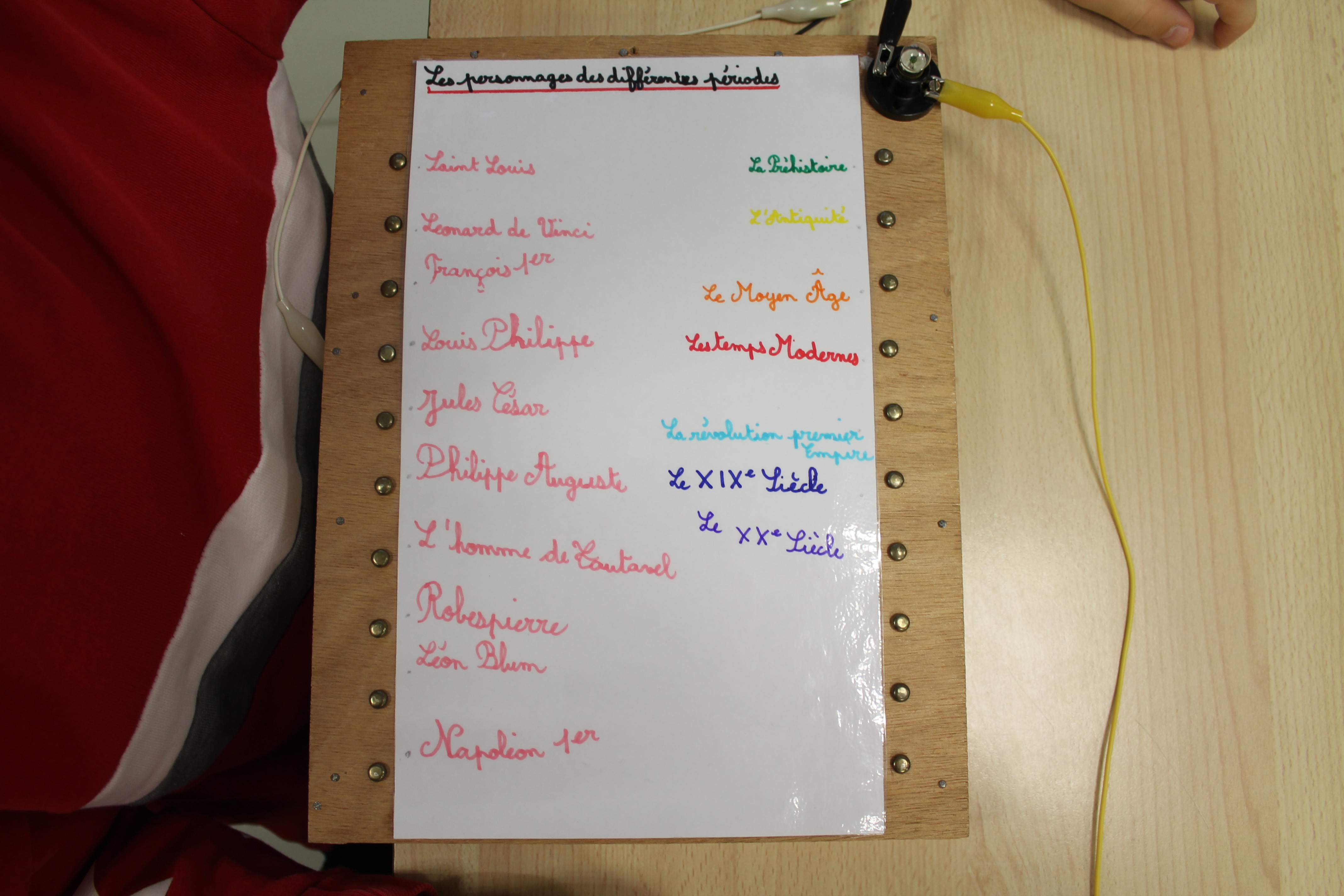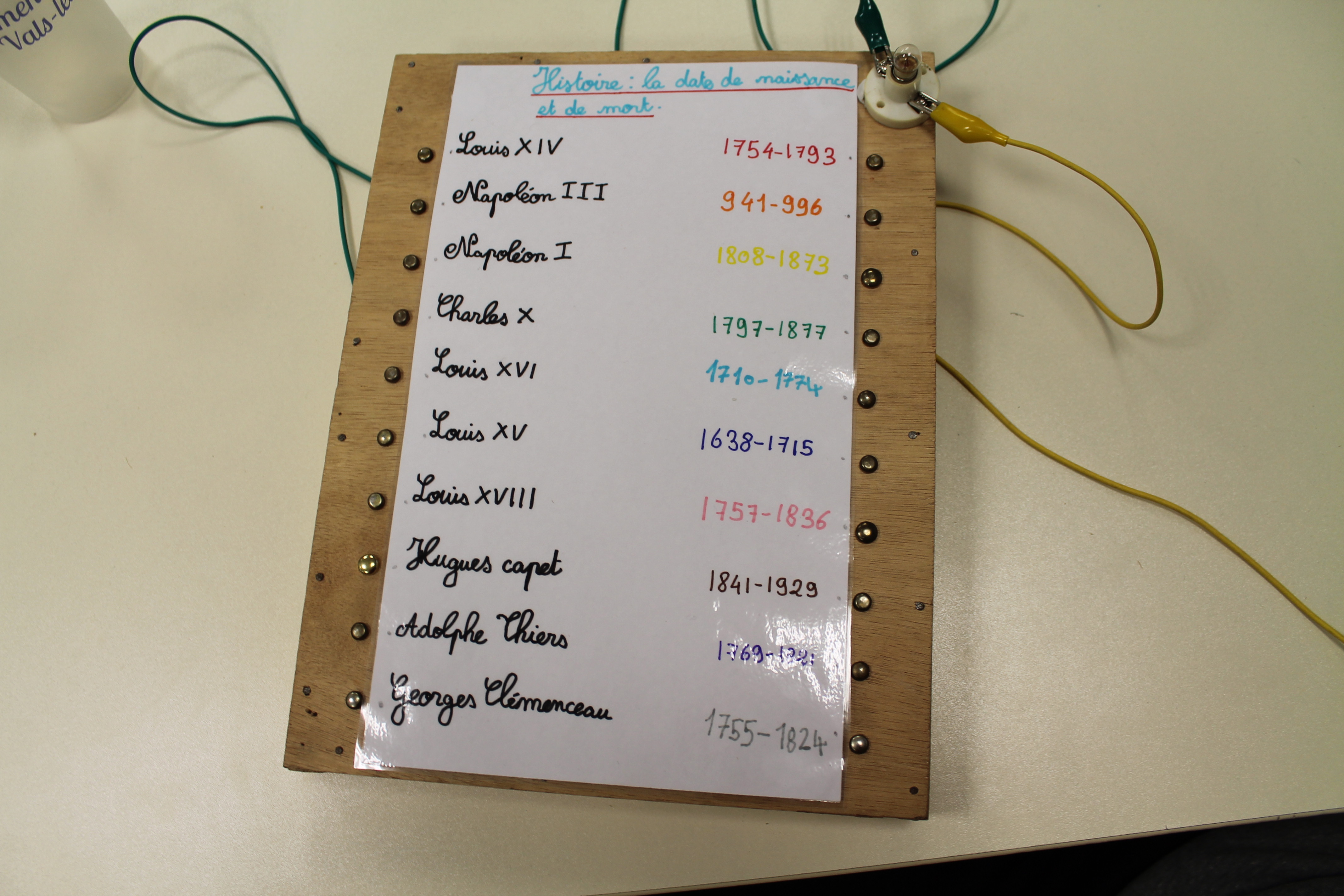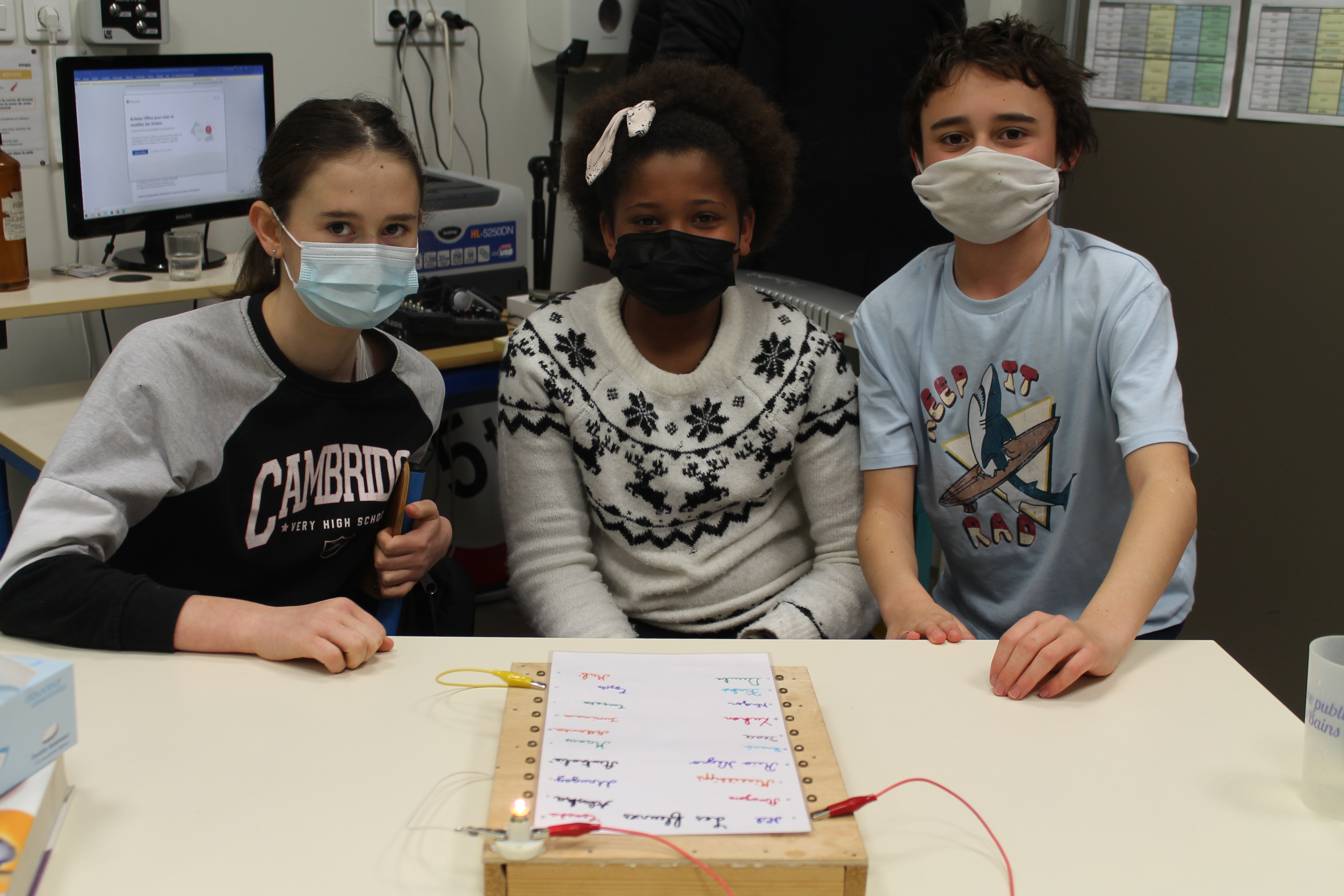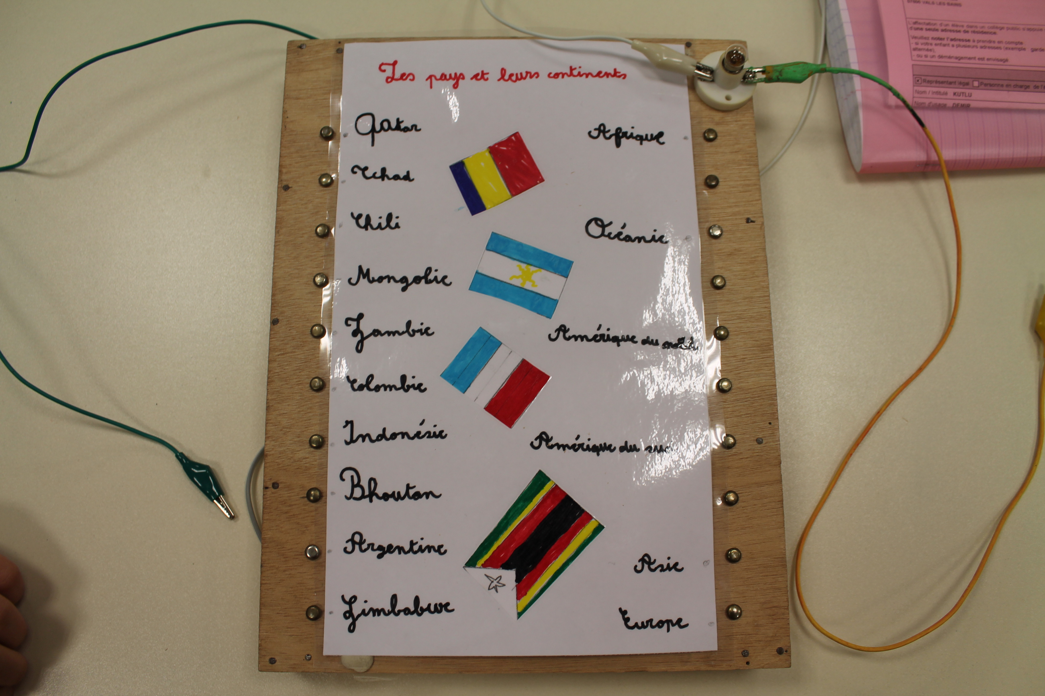 En science nous faisons des jeux électriques . En matériel nous utilisons une boite en bois, des attaches parisiennes, des fils pour devant et derrière, un support pour la lampe, une pile et une petite lampe. Les fils qui sont derrière sont reliés par rapport à la fiche . S'y on relie au bon endroit la lampe s'allumera si on ne met pas la bonne réponse la lampe ne s'allumera pas. Quand on a finit sur la fiche on plastifie. Ensuite il faut la coller avec de la Patafixe. La petite lampe il faut aussi la coller sur un coin de la boite et la pile il faut la coller derrière avec les fils. Quand on a finit on l'essaye pour voir si c'est bon.