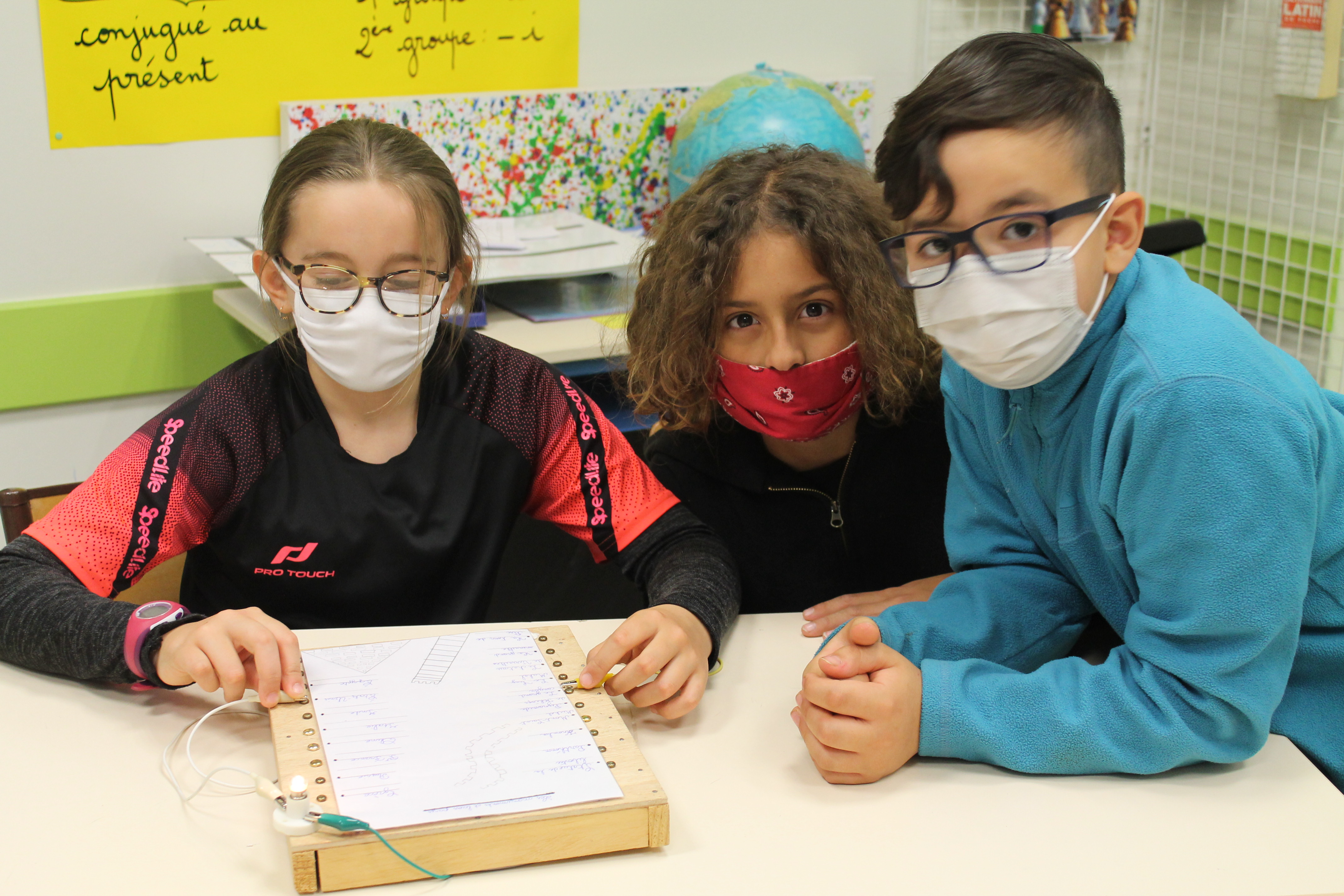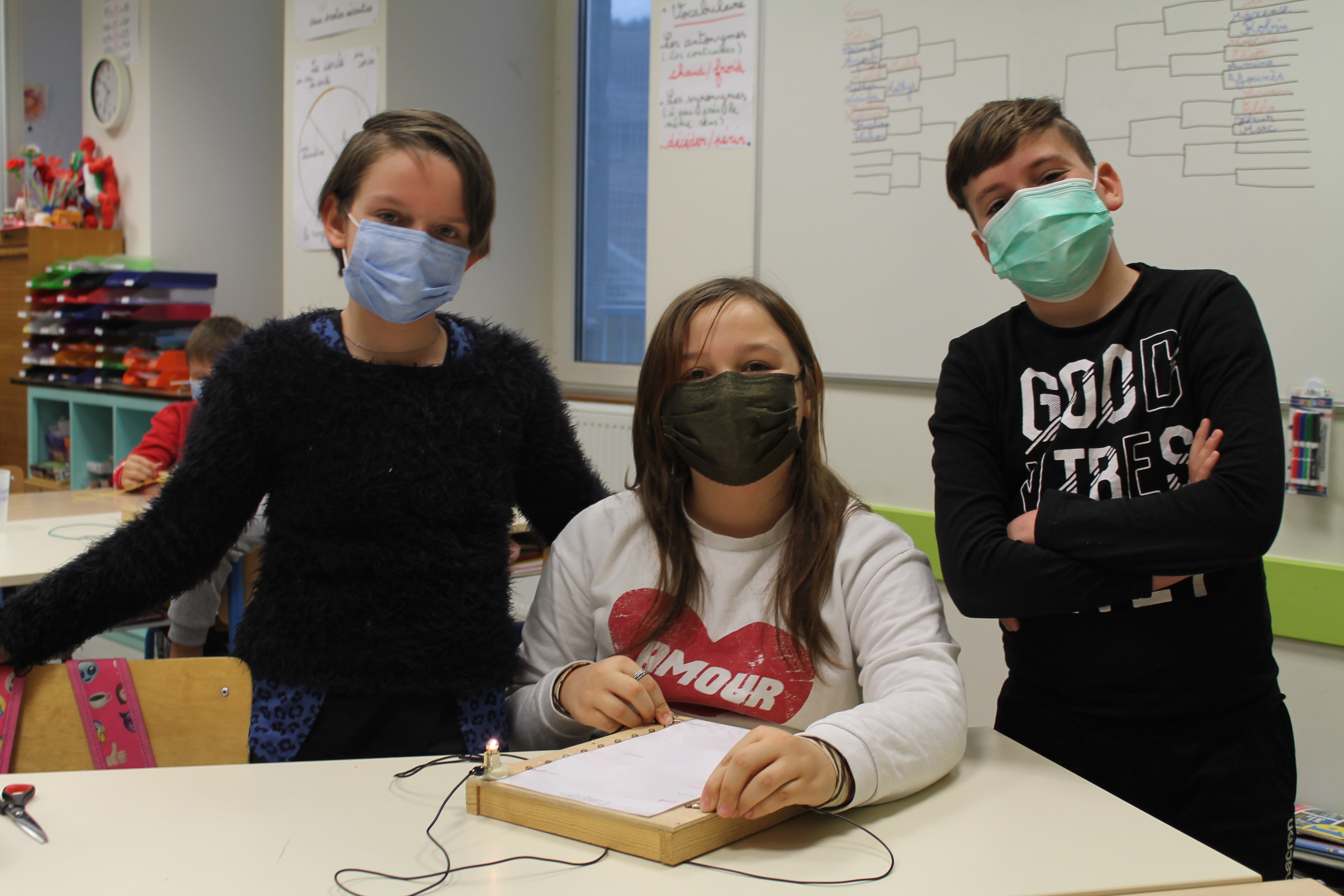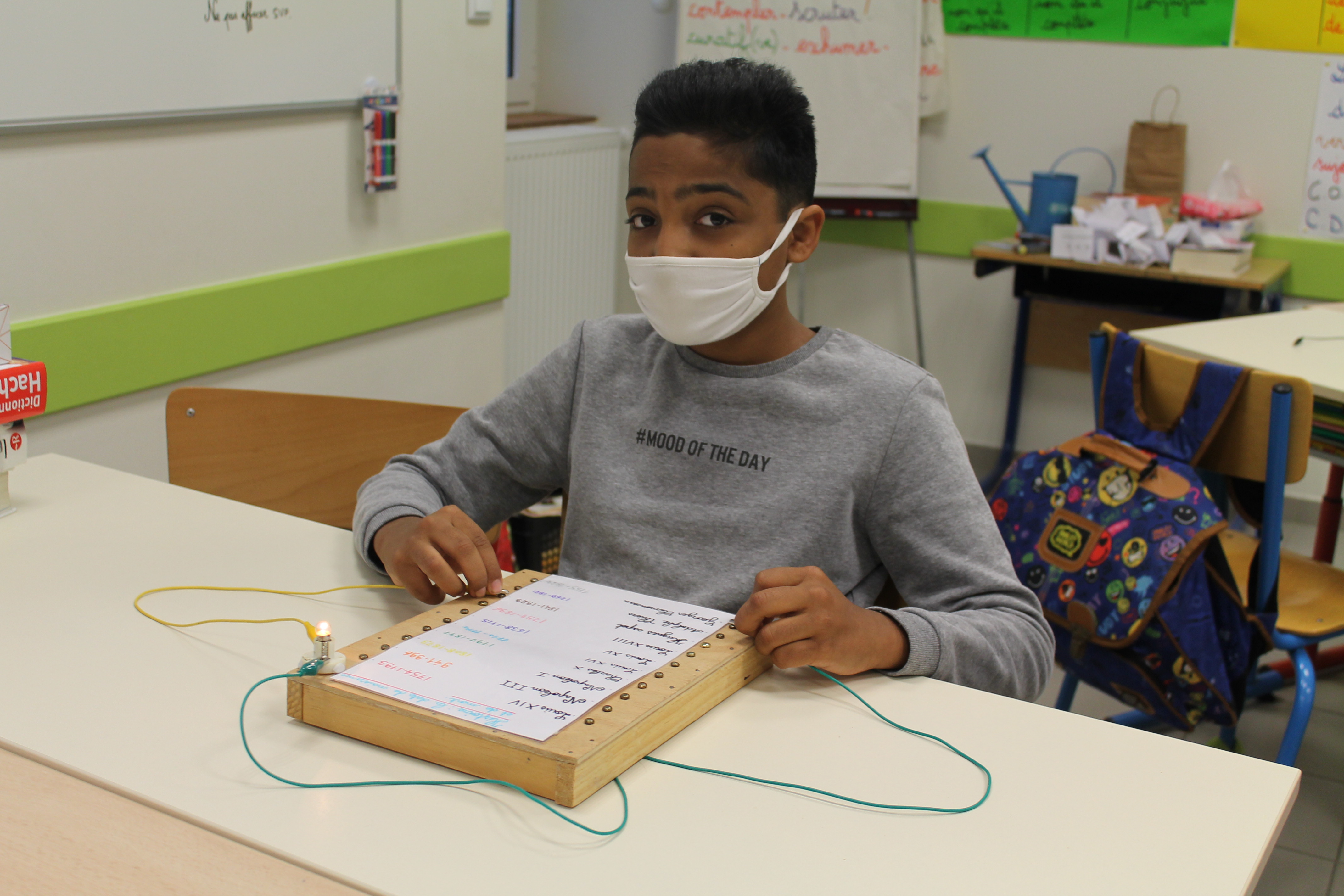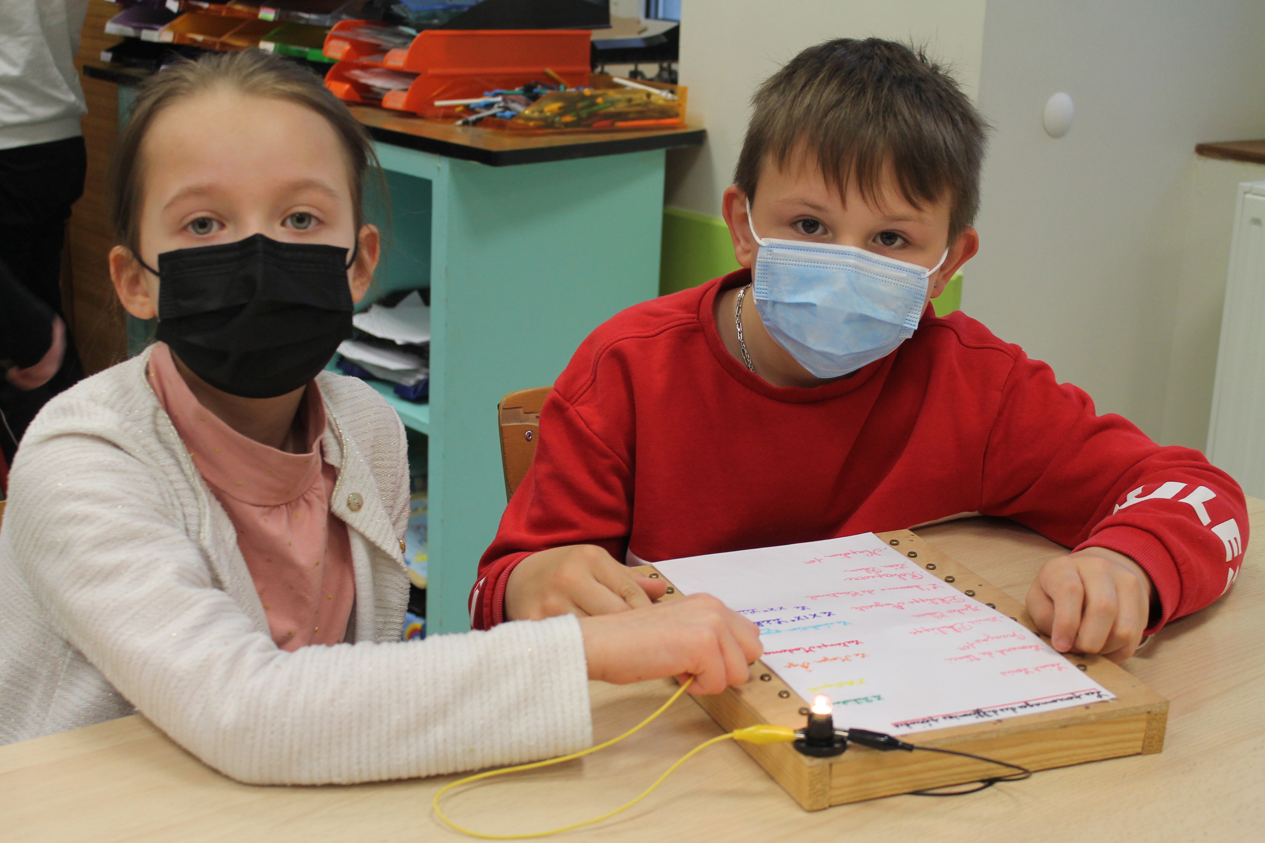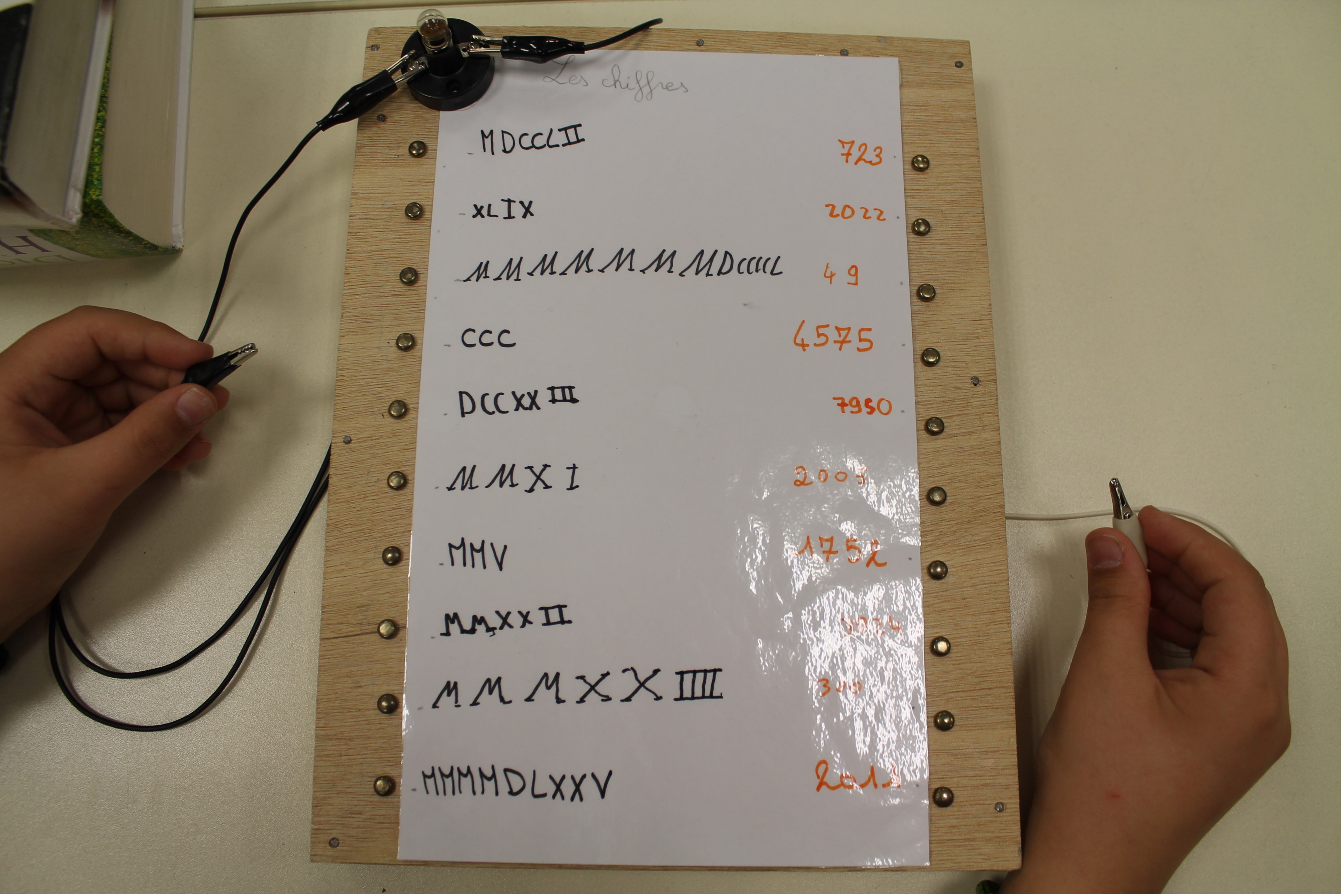 En science nous faisons des jeux électriques . En matériel nous utilisons une boite en bois, des attaches parisiennes, des fils pour devant et derrière, un support pour la lampe, une pile et une petite lampe. Les fils qui sont derrière sont reliés par rapport à la fiche . S'y on relie au bon endroit la lampe s'allumera si on ne met pas la bonne réponse la lampe ne s'allumera pas. Quand on a finit sur la fiche on plastifie. Ensuite il faut la coller avec de la Patafixe. La petite lampe il faut aussi la coller sur un coin de la boite et la pile il faut la coller derrière avec les fils. Quand on a finit on l'essaye pour voir si c'est bon.