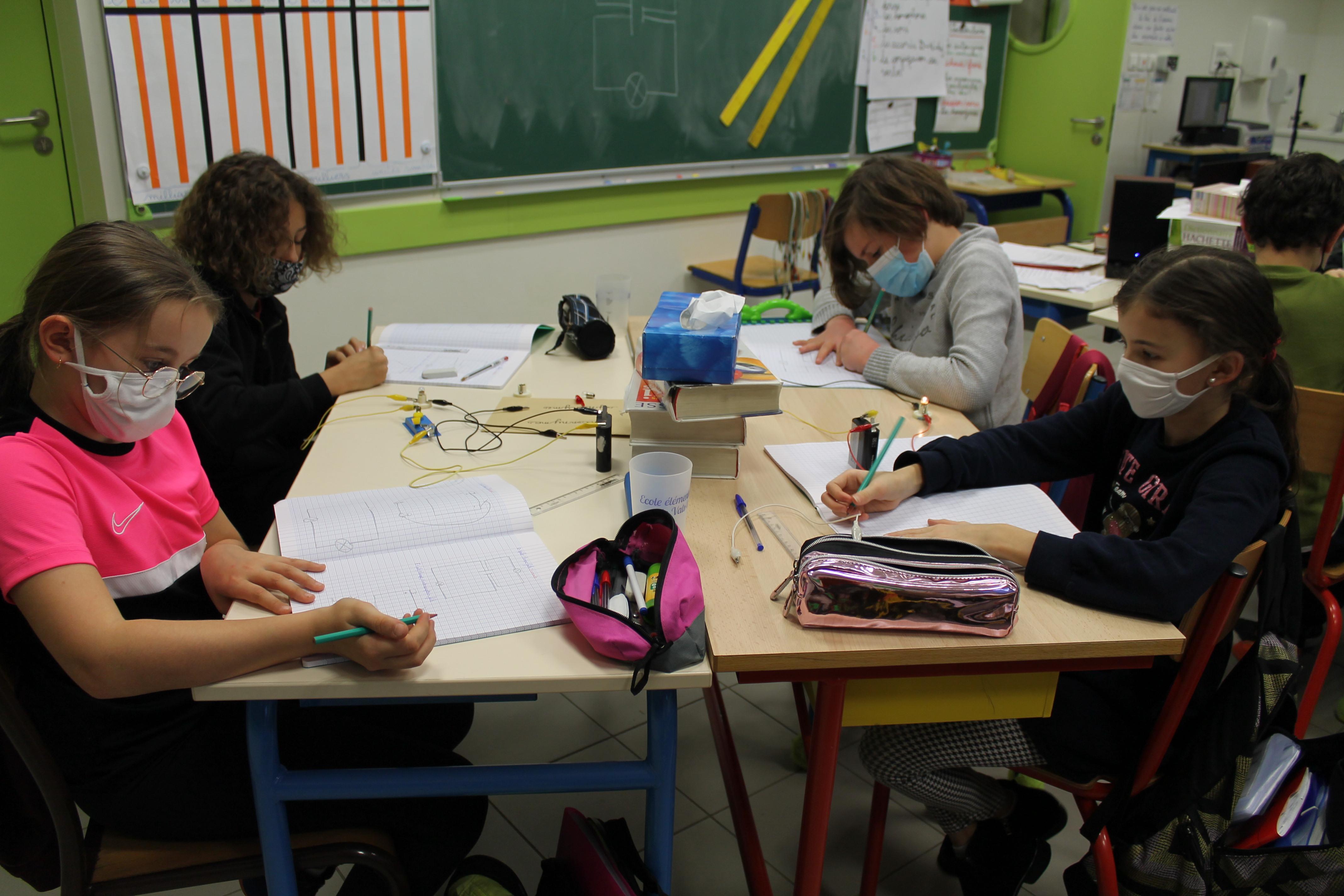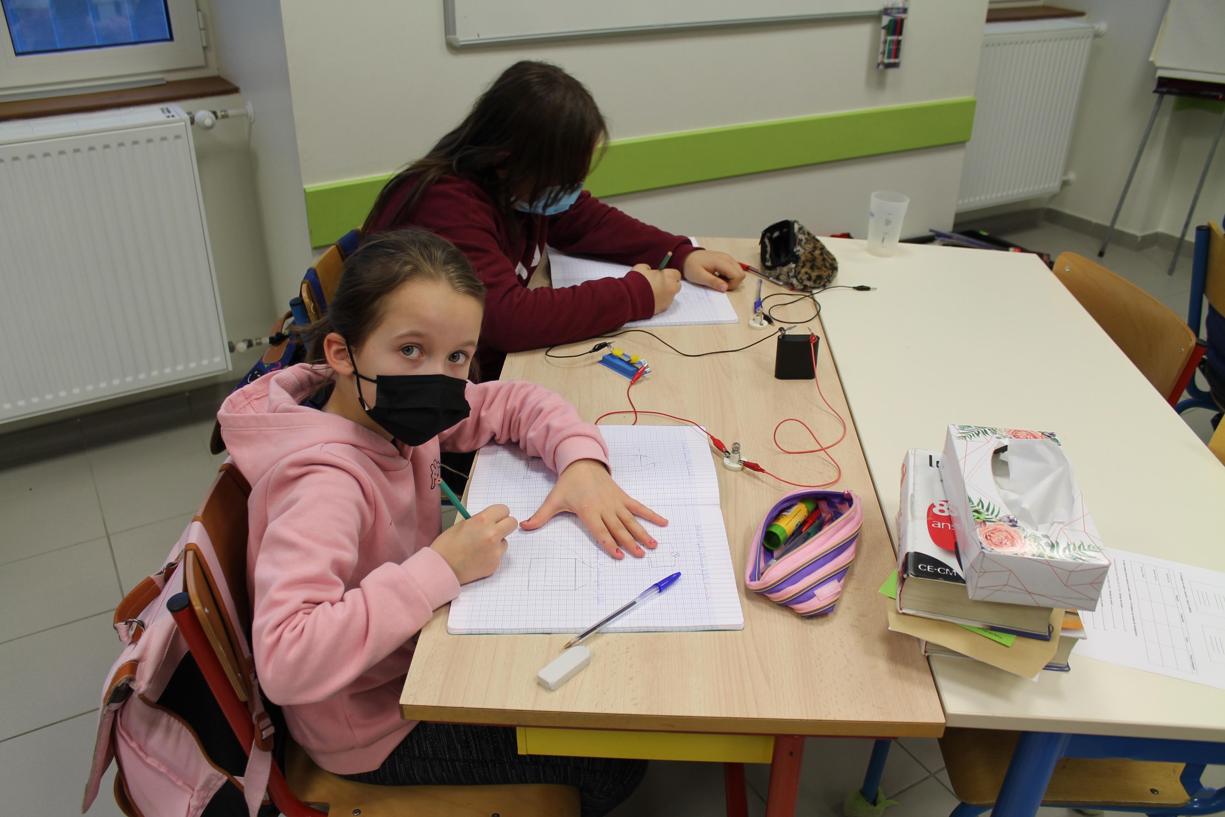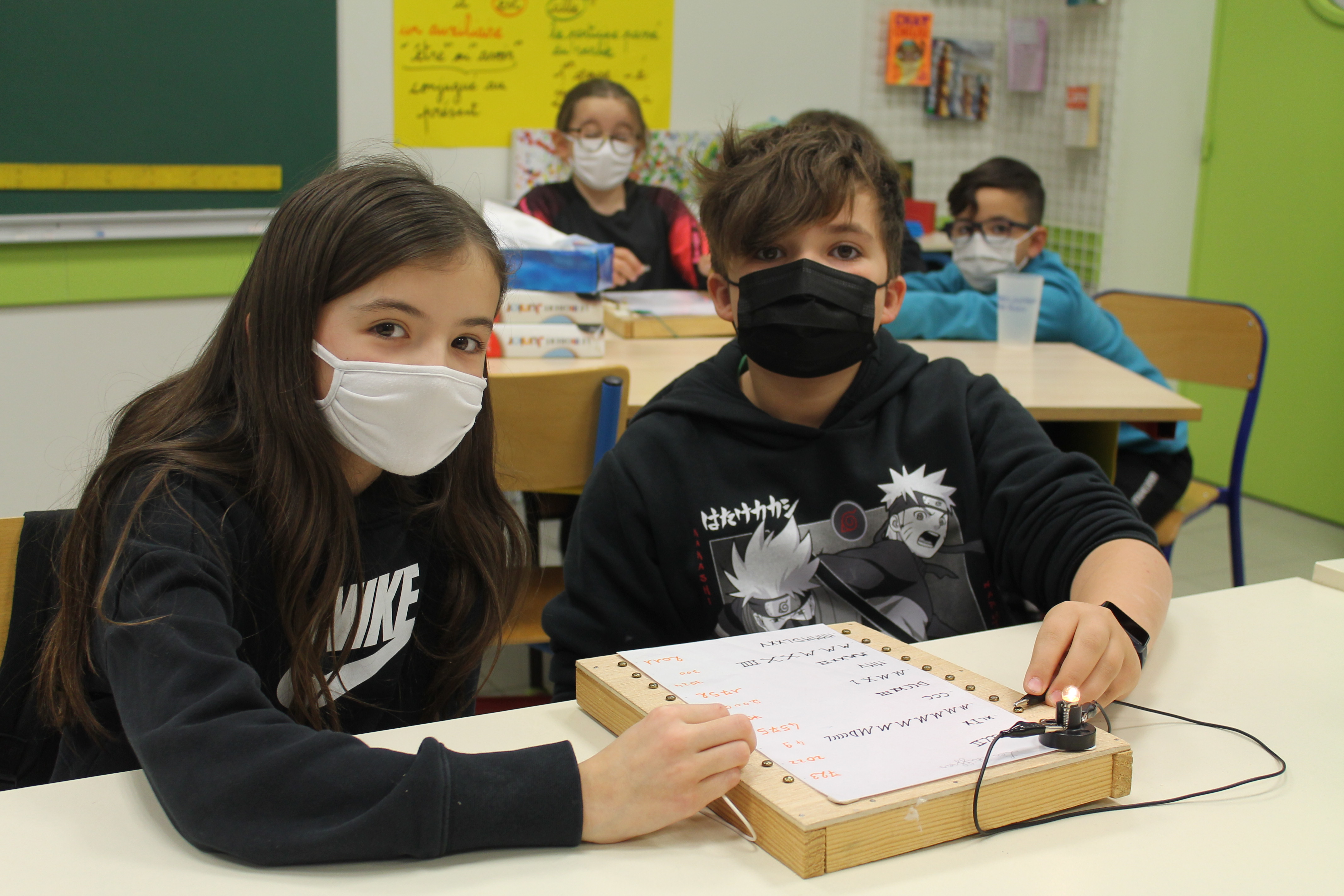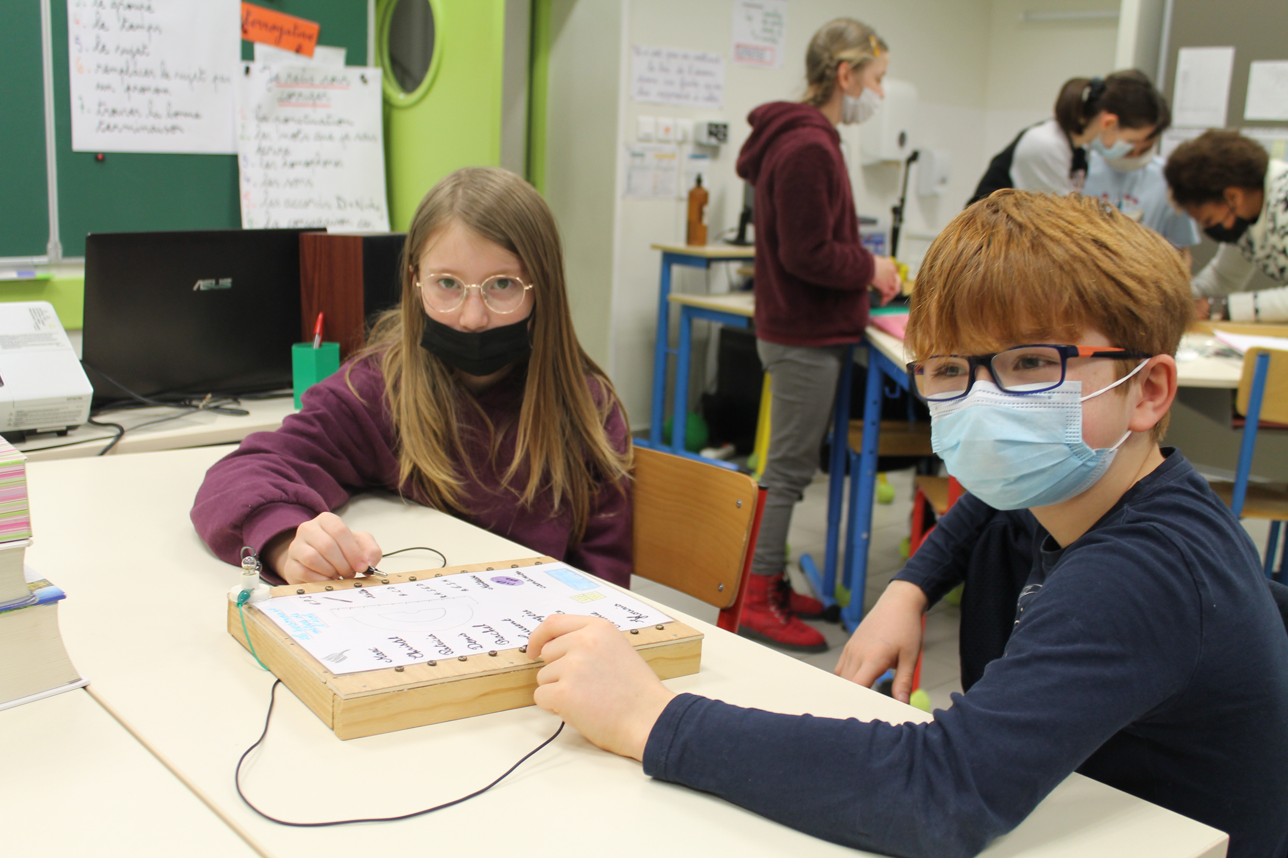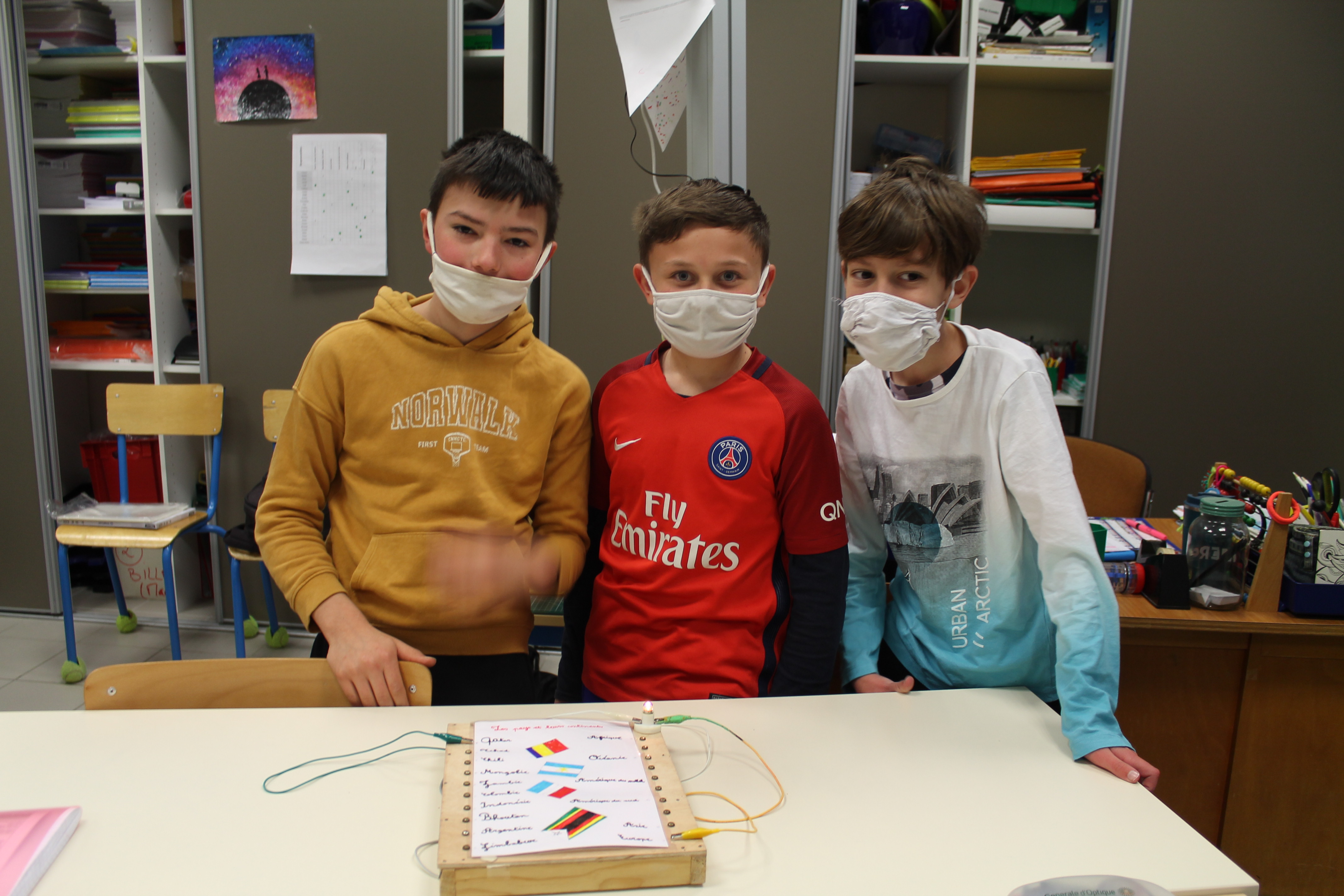 En science nous faisons des jeux électriques . En matériel nous utilisons une boite en bois, des attaches parisiennes, des fils pour devant et derrière, un support pour la lampe, une pile et une petite lampe. Les fils qui sont derrière sont reliés par rapport à la fiche . S'y on relie au bon endroit la lampe s'allumera si on ne met pas la bonne réponse la lampe ne s'allumera pas. Quand on a finit sur la fiche on plastifie. Ensuite il faut la coller avec de la Patafixe. La petite lampe il faut aussi la coller sur un coin de la boite et la pile il faut la coller derrière avec les fils. Quand on a finit on l'essaye pour voir si c'est bon.