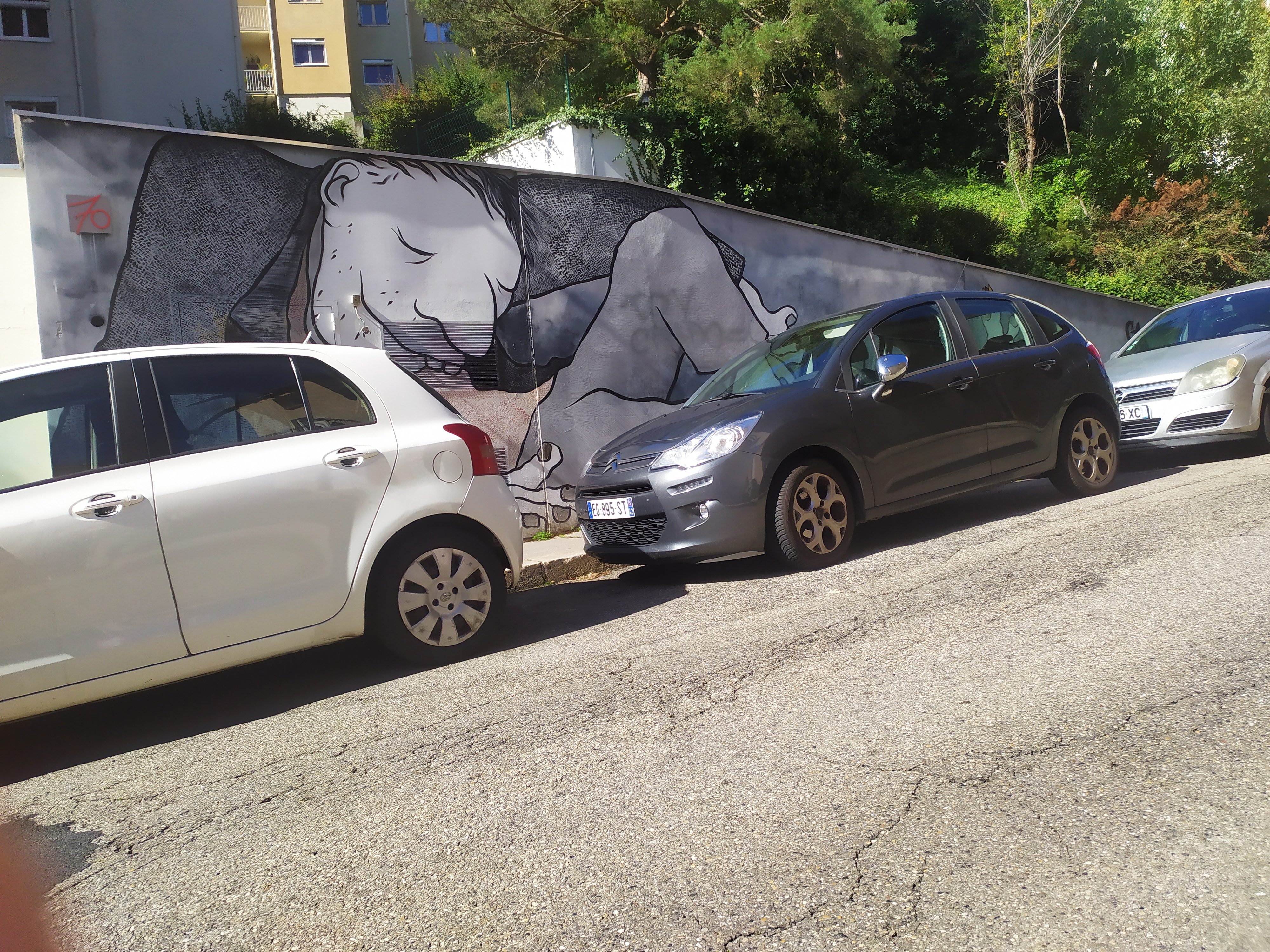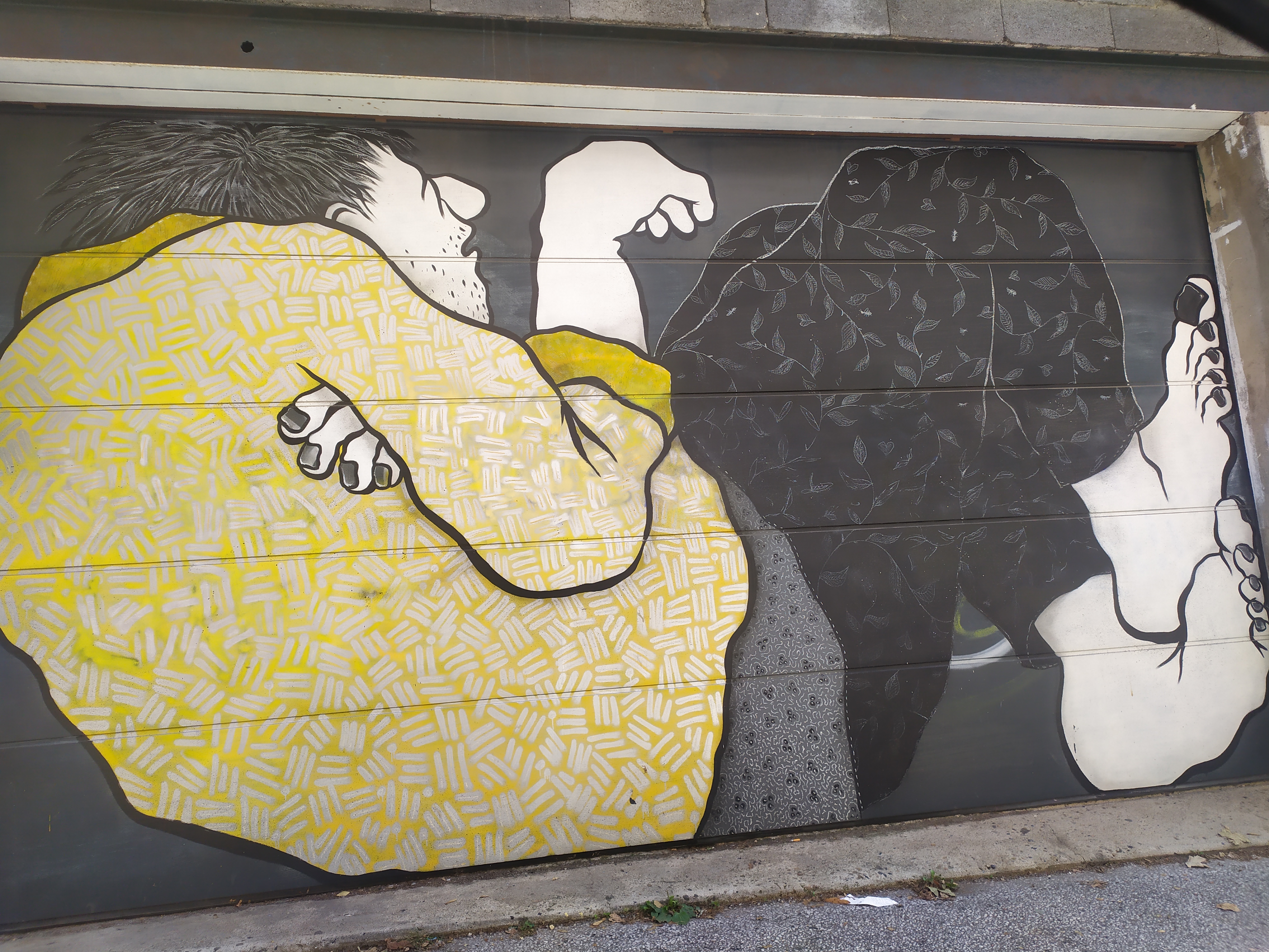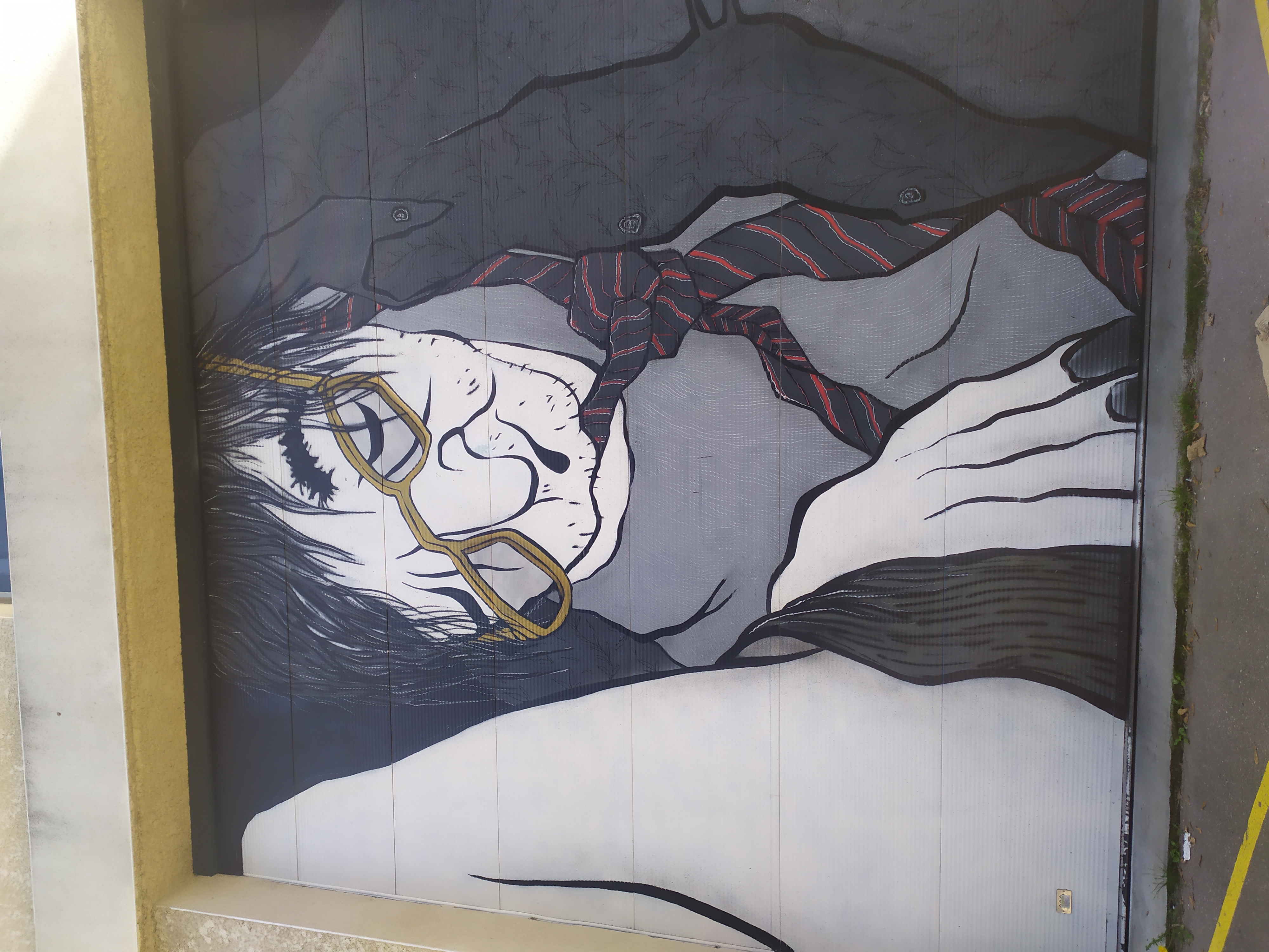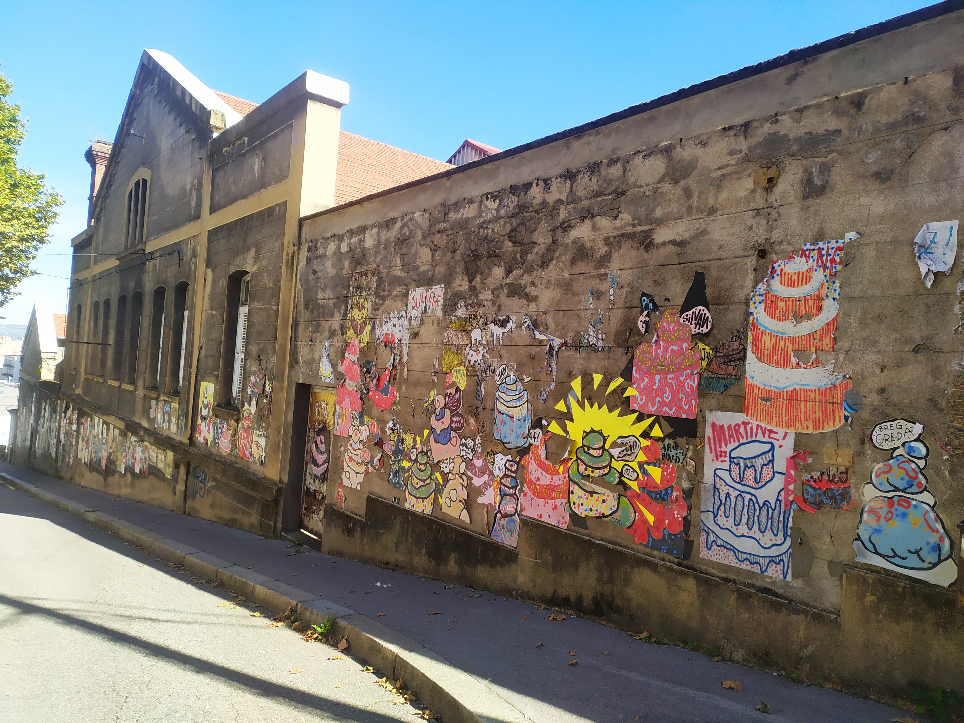 Dans cette rue, Ella et Pitre ont leur atelier, ils vendent aussi leurs œuvres moins chères, parce que Pitre et né la bas, en 1981. J’ai pris uniquement des photos de cette rue, mais ils ont aussi fait d’immenses fresques dont une sur la façade d’un chocolatier (WEISS), toujours à Saint-Etienne.