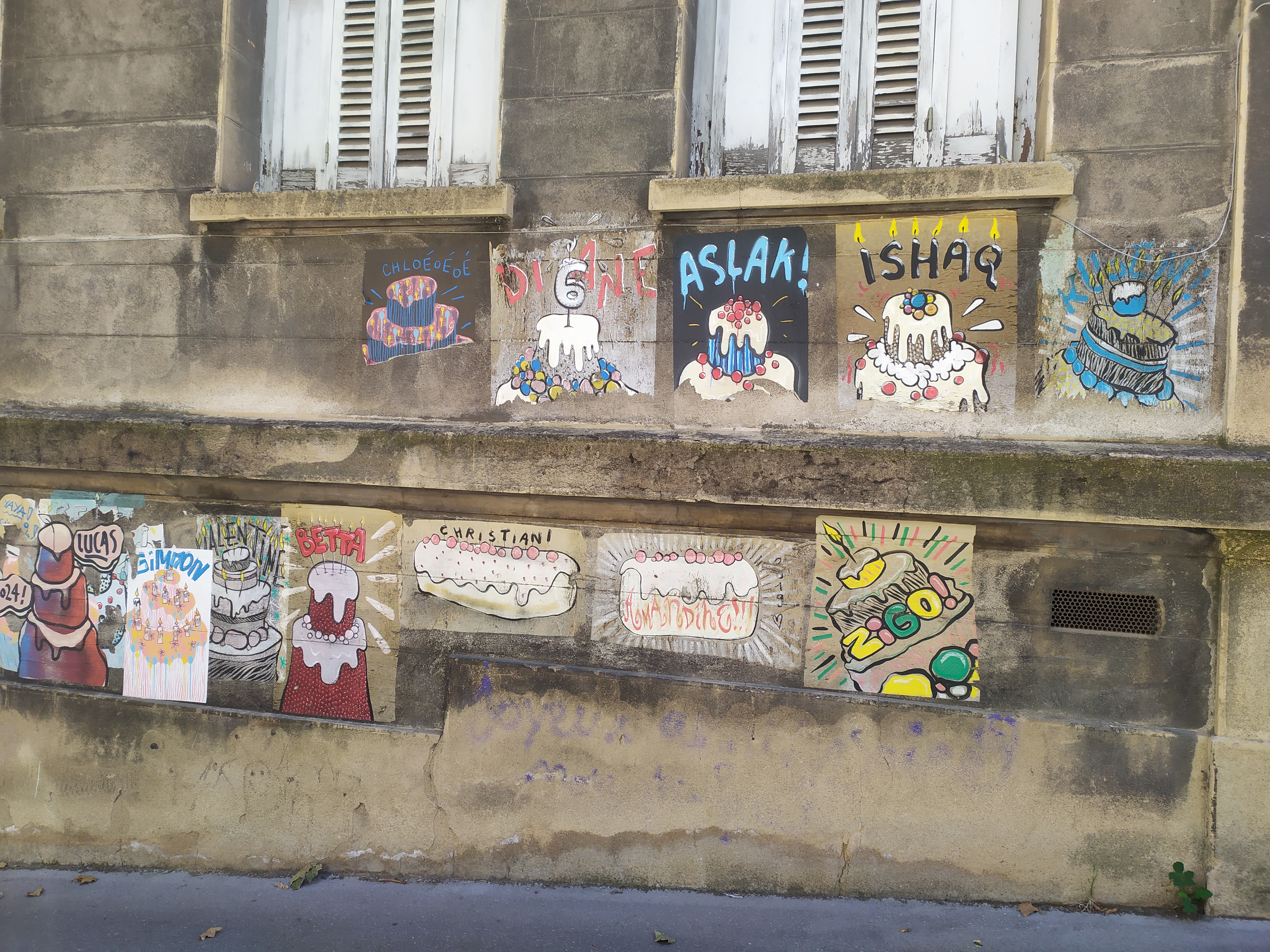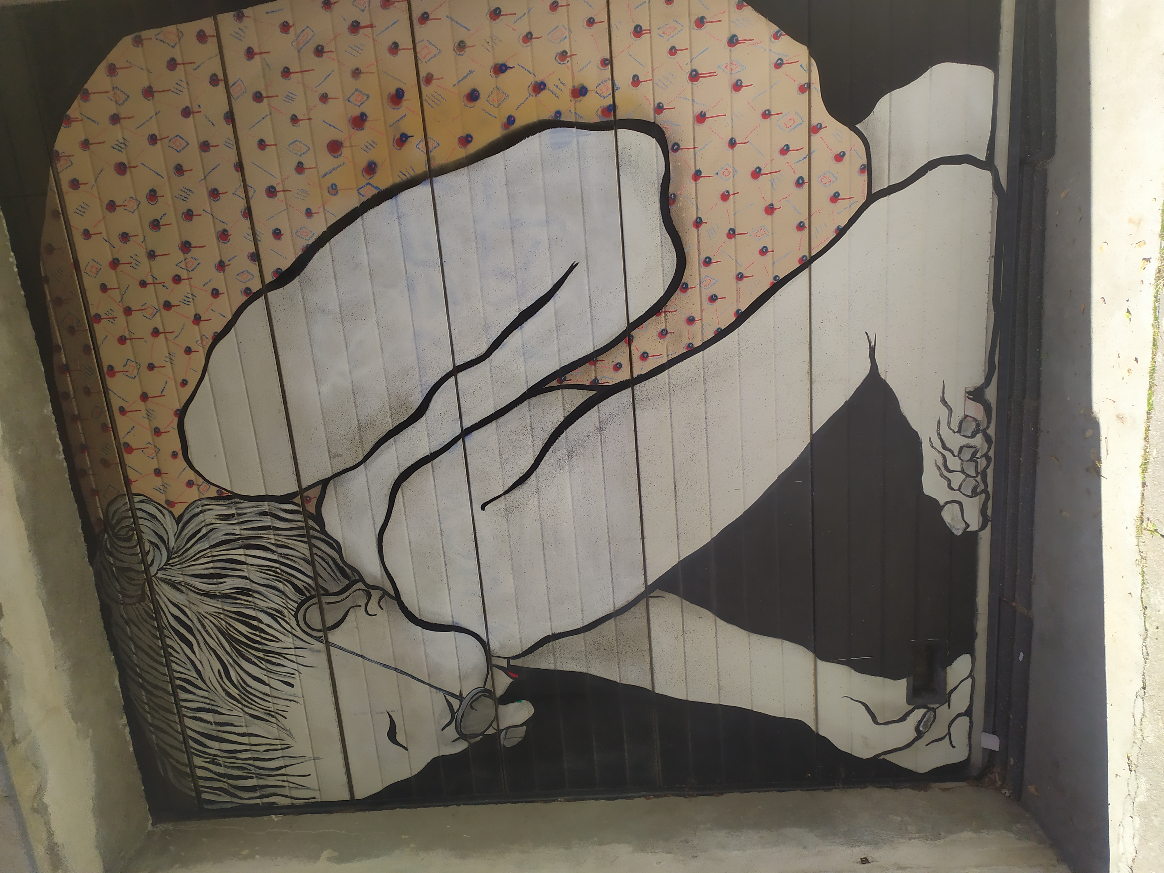 Donc, le texte des Petites histoires de l’Art portait sur Ella et Pitr, et l’œuvre sur laquelle nous avons travaillé s’intitule « Une mamie géante ». Ces artistes, je les connais bien, puisque dans tout Saint-Etienne ils ont peint des fresques, des peintures sur les garages et même parfois sur les vitres d’immeubles. Je suis donc allé à Saint-Etienne pour prendre des photos dans la rue Henri Gonnard.