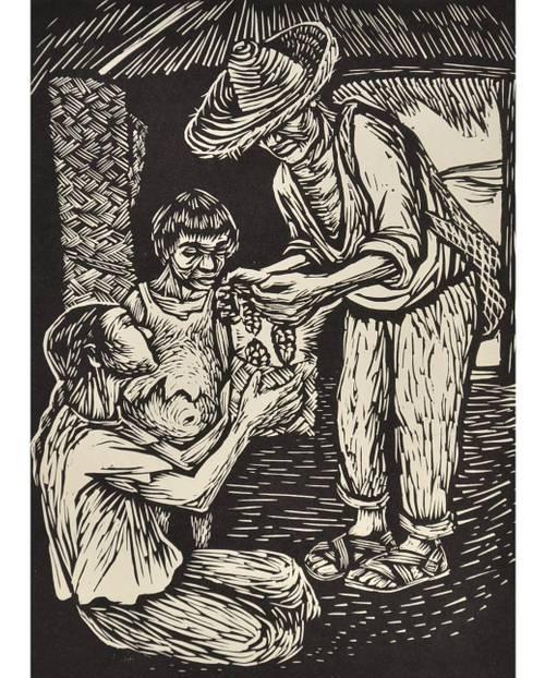 Elizabeth Catlett, Peones Mexicanos (Ouvriers agricoles mexicains), 1953, gravure sur linoléum, 18,4 x 13,3 cm, collection particulière © ADAGP, Paris, 2021