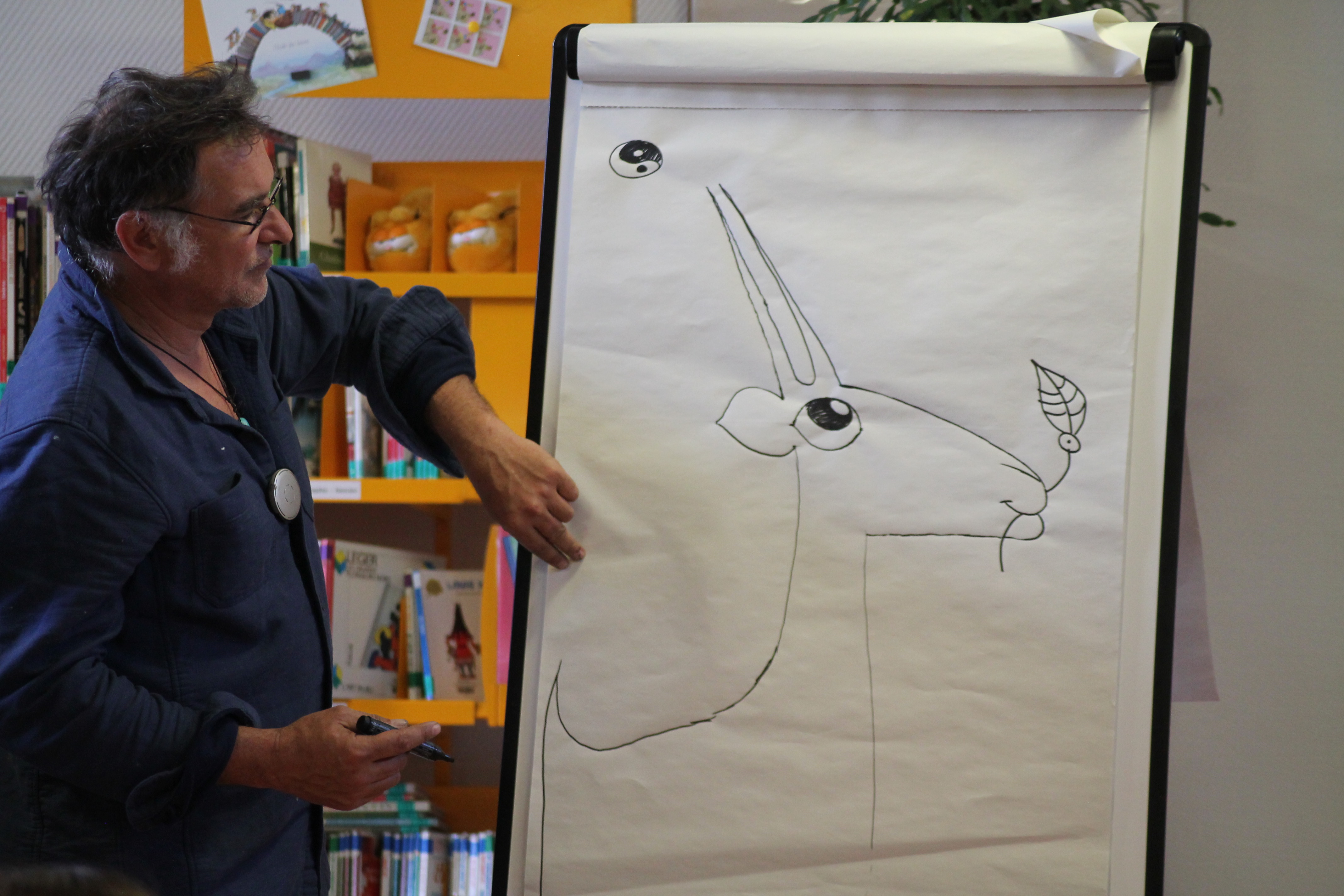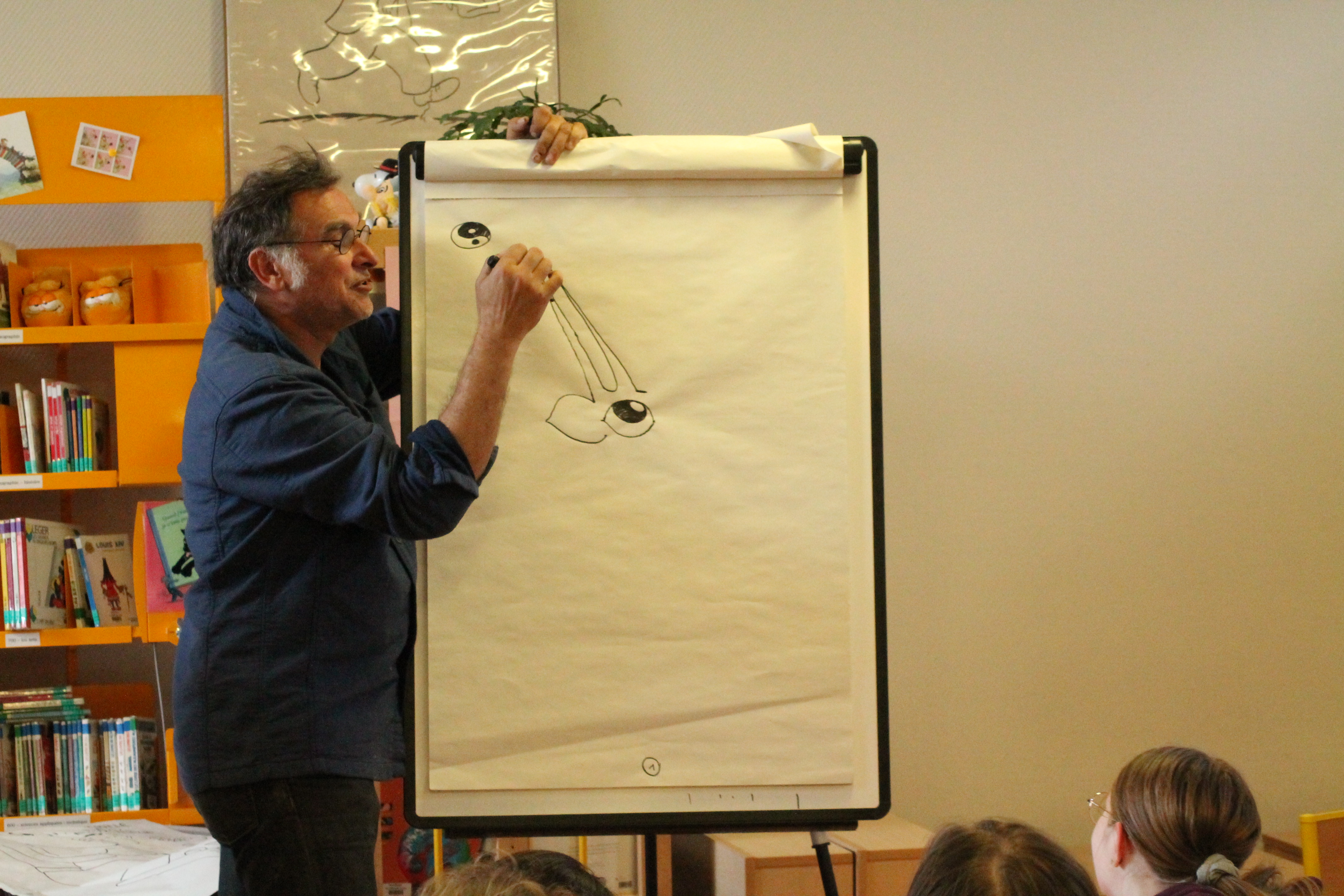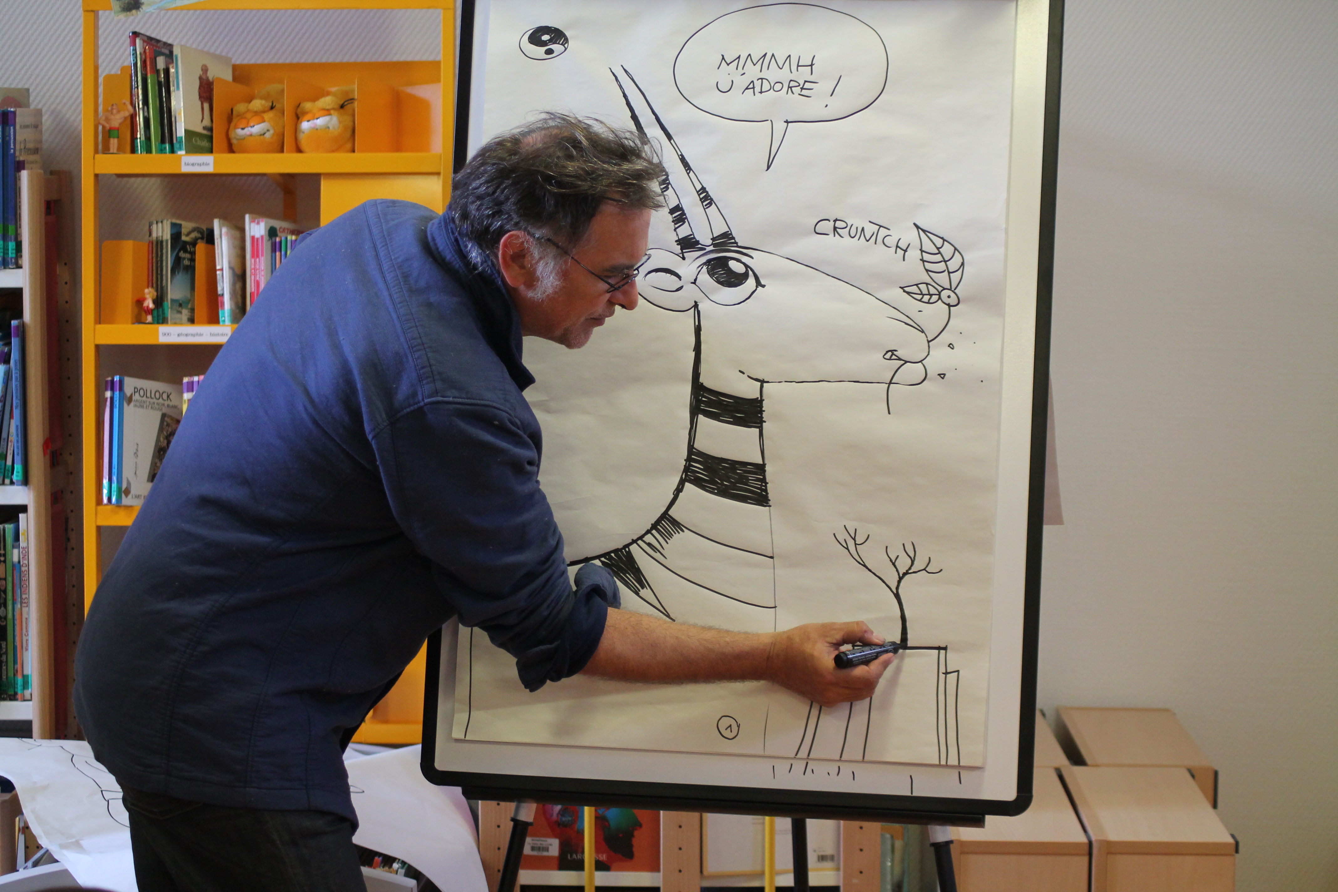 Celui-ci nous a raconté comment il a appris à dessiner, ce qui l’ avait inspiré et le chemin qu’il a parcouru. Yann Dégruel nous a montré certains livres qu’il a illustrés, nous a appris à dessiner quelques animaux de ses B.D.