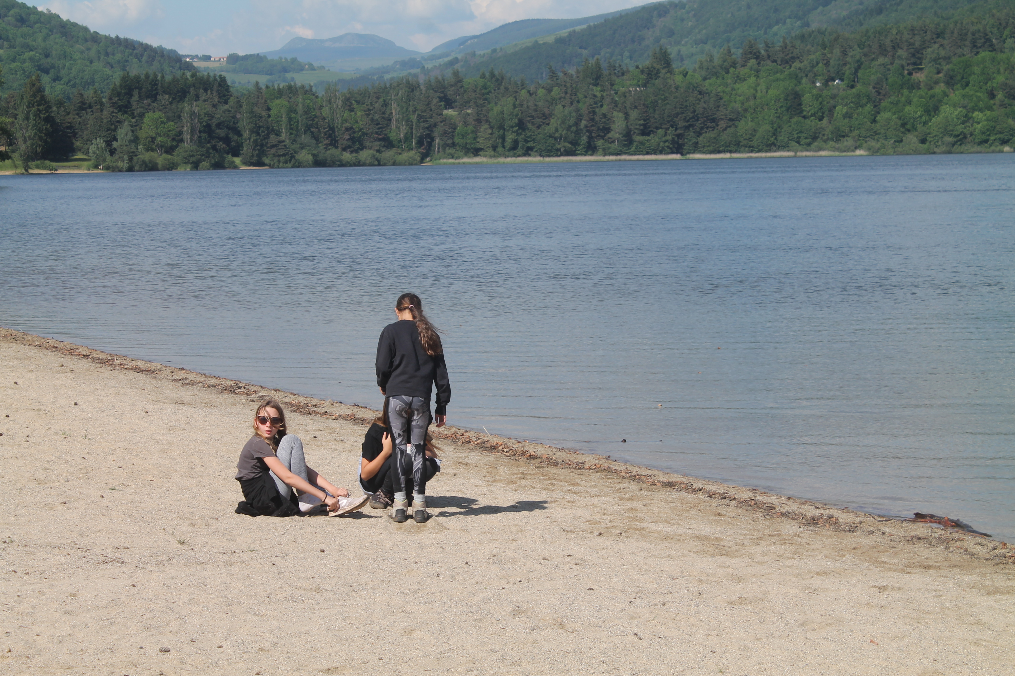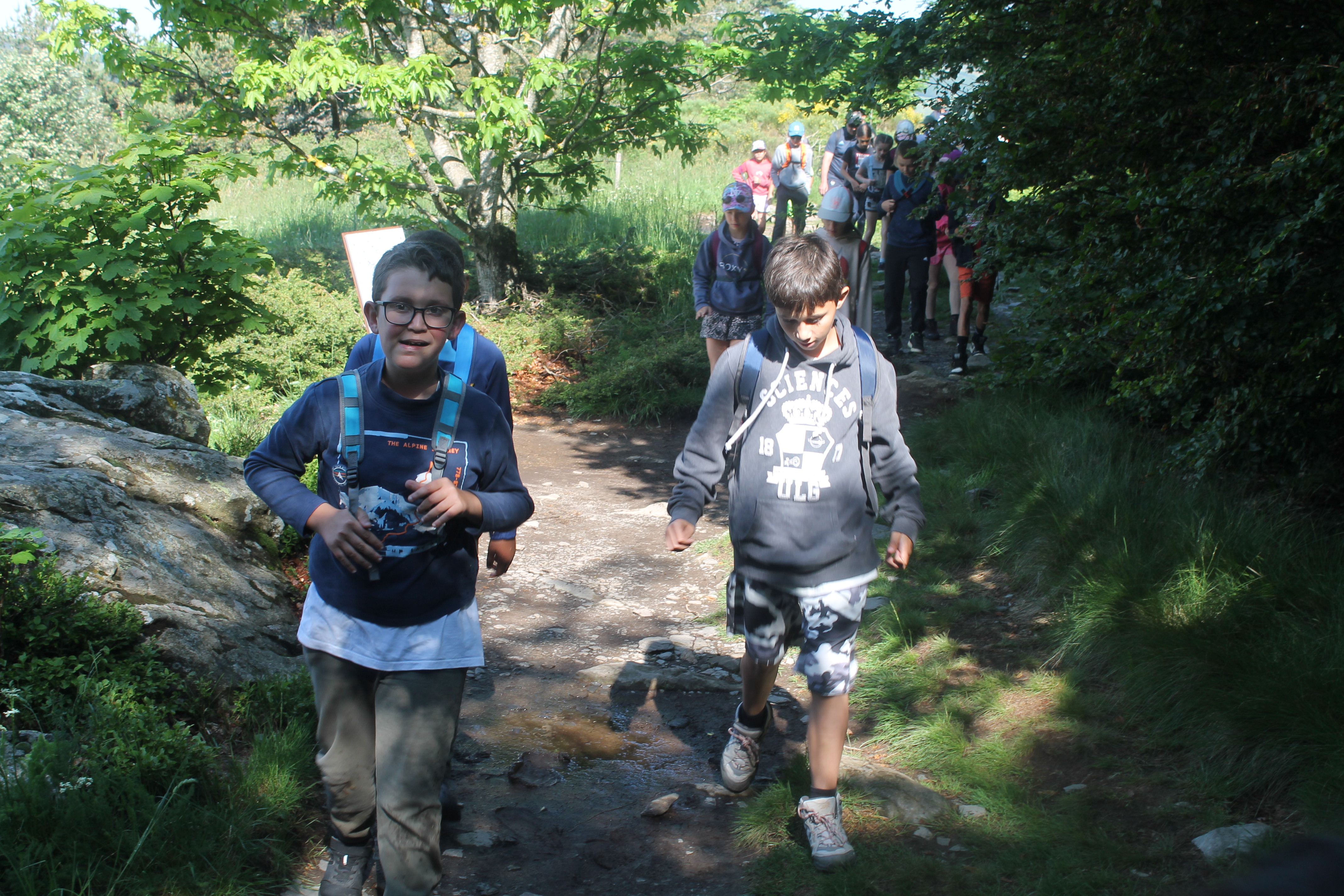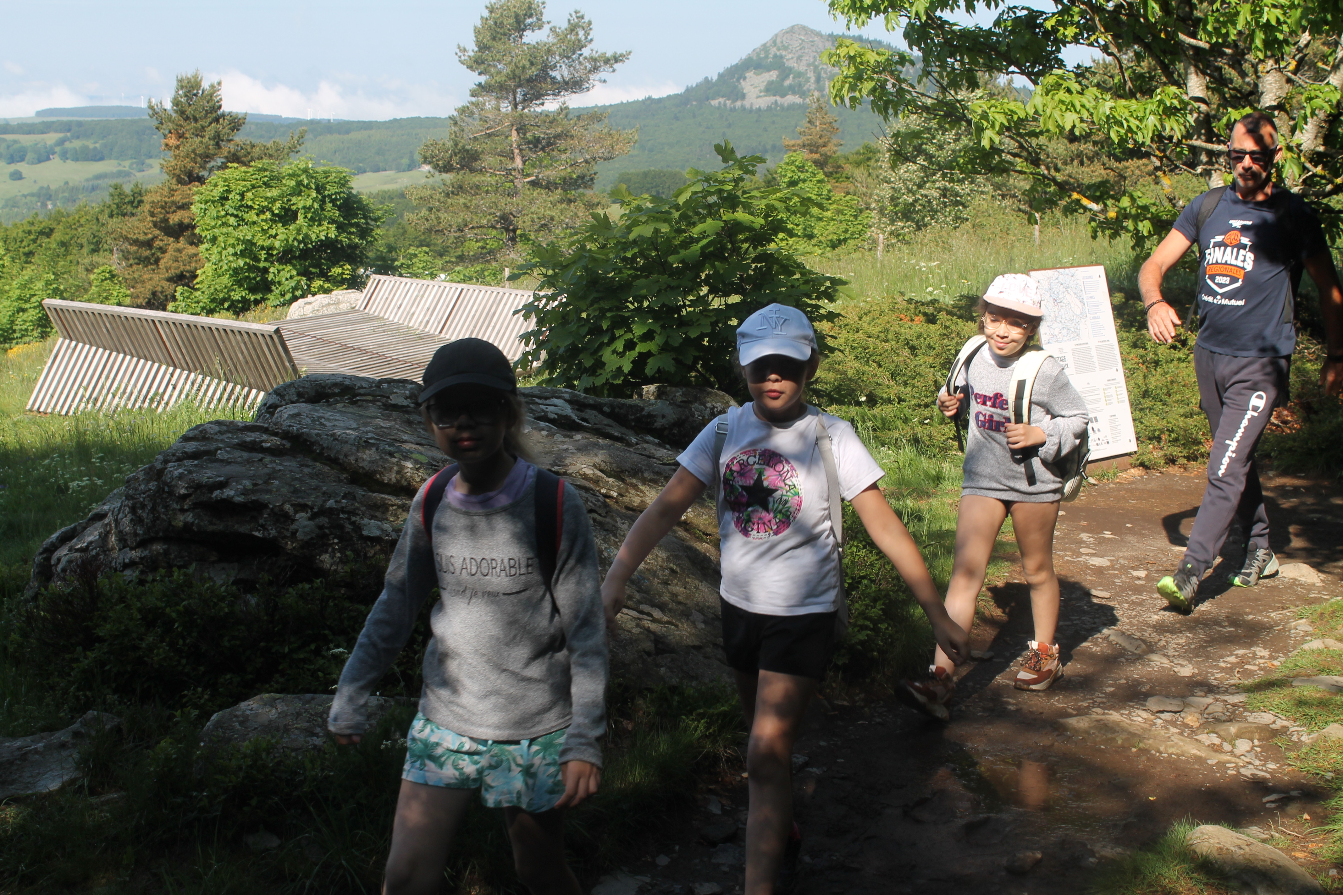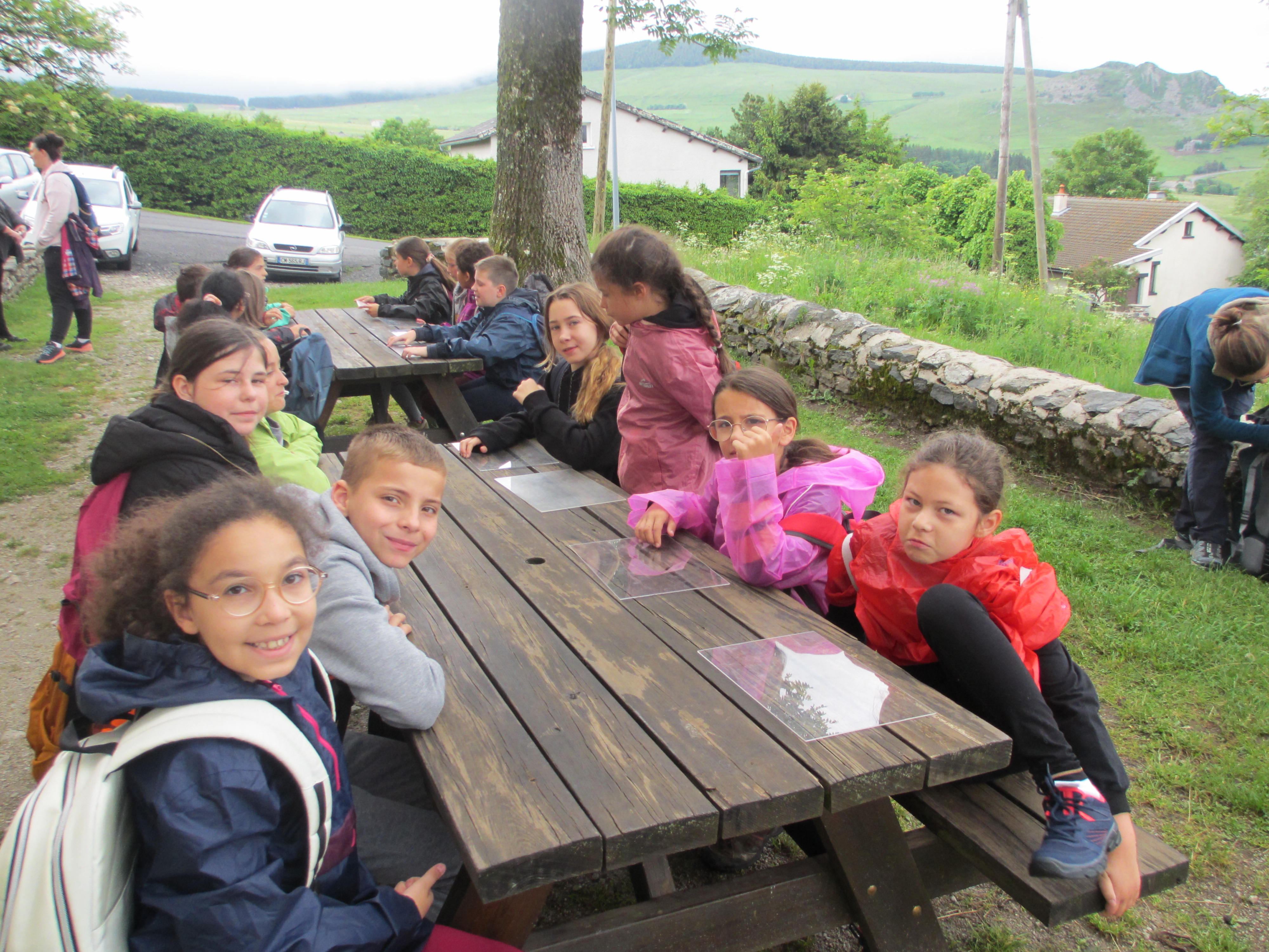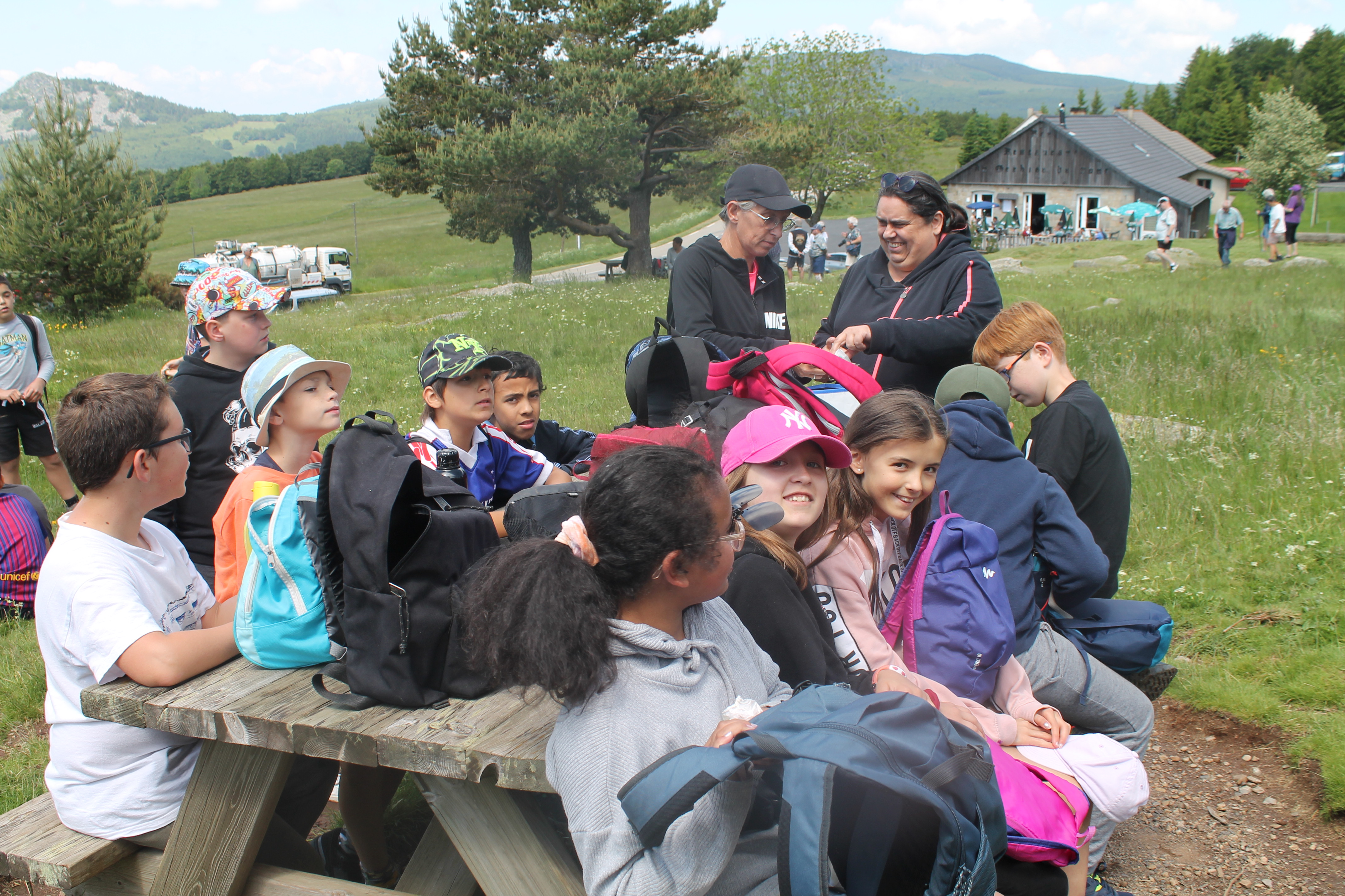 En sortant du bus, nous avons attaqué à gravir le Mont Gerbier de Jonc. En montant, nous nous sommes arrêtés quelques fois pour regarder le paysage puis, une fois arrivés au sommet, Hervé notre guide, nous a parlé du type de ce volcan et de ce qui l'entoure. A la fin, nous sommes redescendus puis nous avons pique-niqué au pied du volcan. Nous avons repris le bus pour aller au volcan du Cherche Muse où nous avons cassé des pierres (bombes volcaniques), que nous avons ramassées à l'aide d'Hervé et de Marylou une autre guide du chalet. En reprenant le bus, nous avons pris la direction du Lac d'Issarlés où nous avons parlé du volcan qu'il y avait dessous avec les deux guides. Nous avons goutté puis nous avons joué sur le sable. Nous avons repris le bus en direction du chalet où nous avons pris une douche, le soir nous avons mangé : une soupe de légumes, une poêlée forestière, de la pizza et une mousse au chocolat.