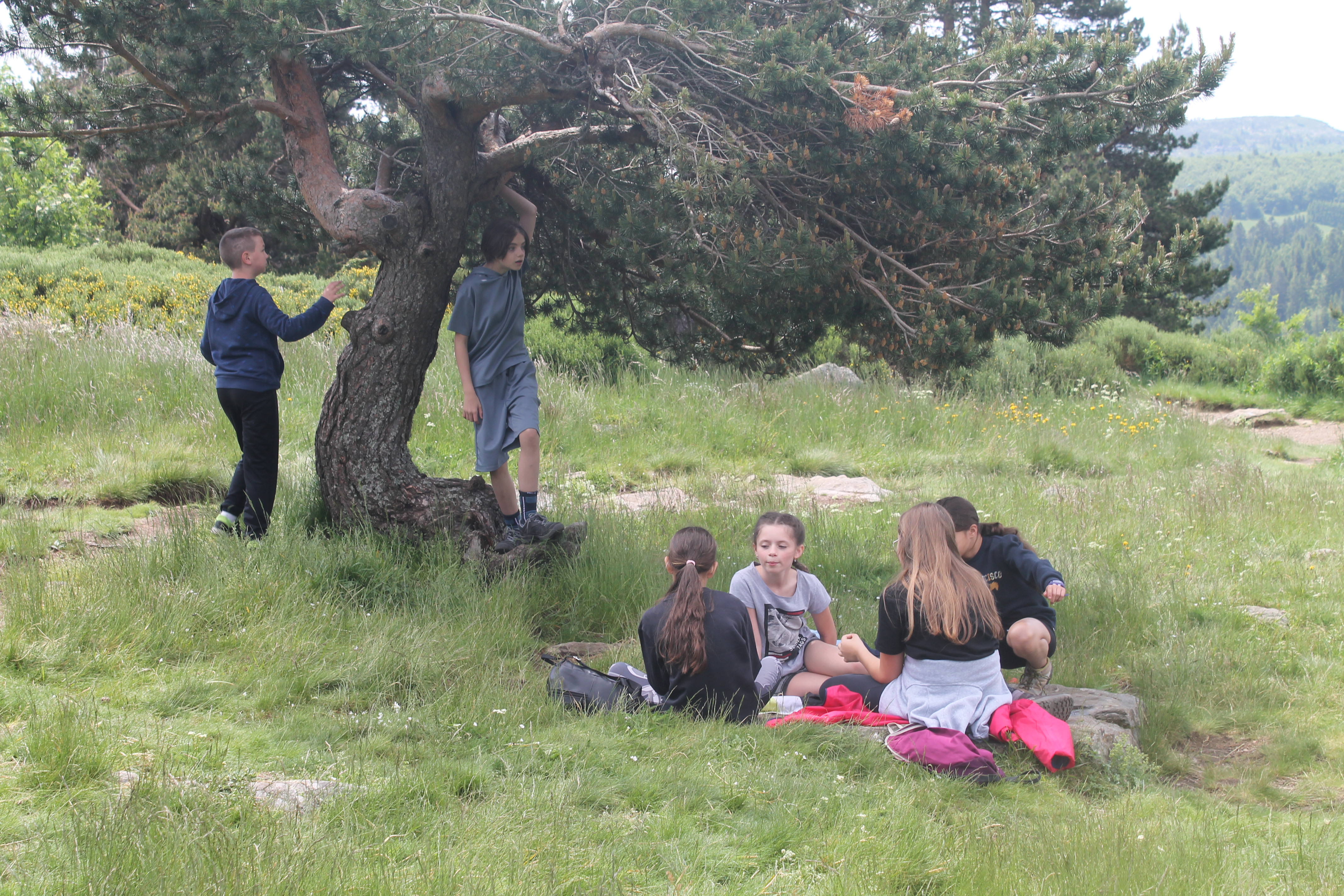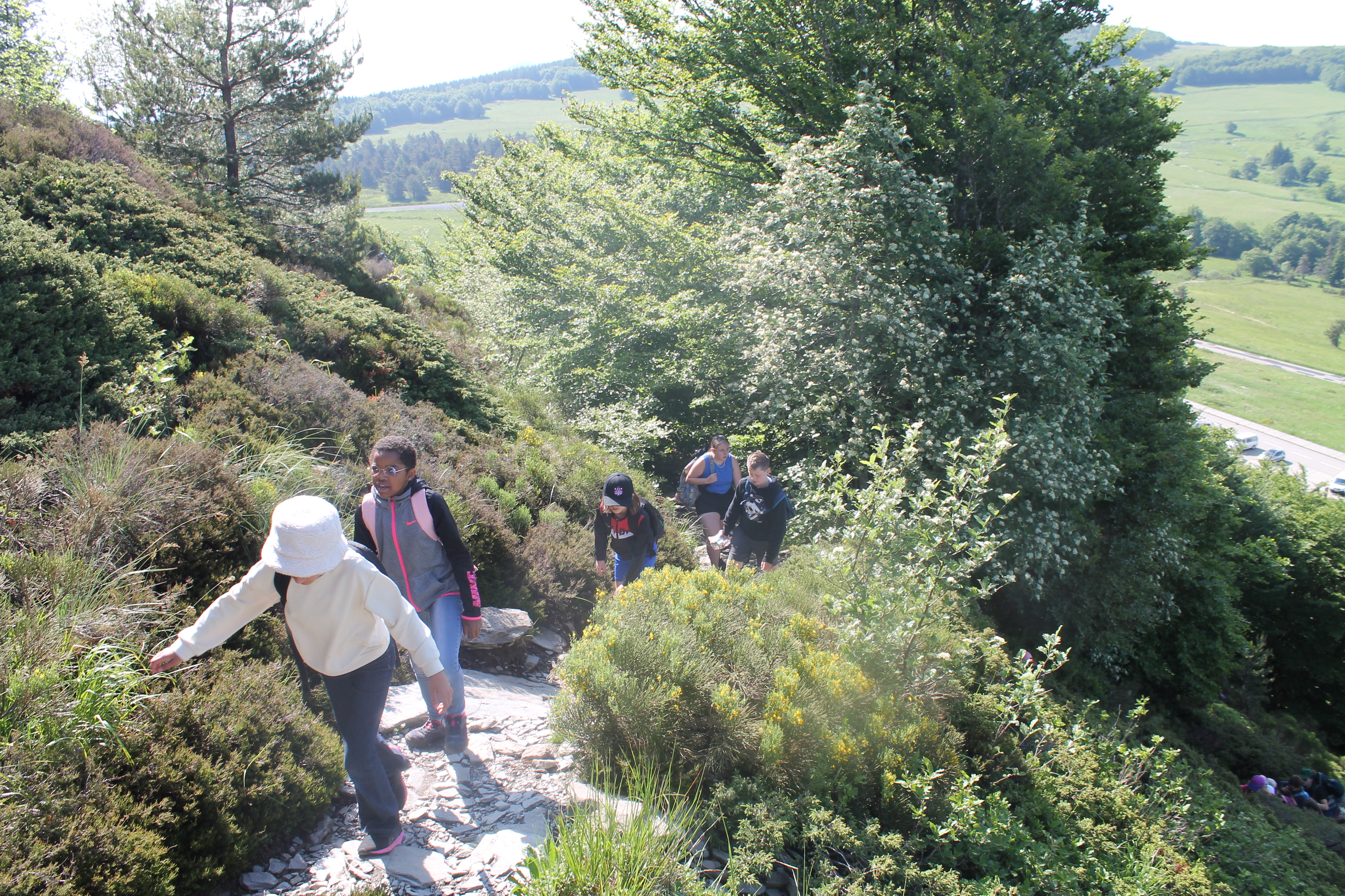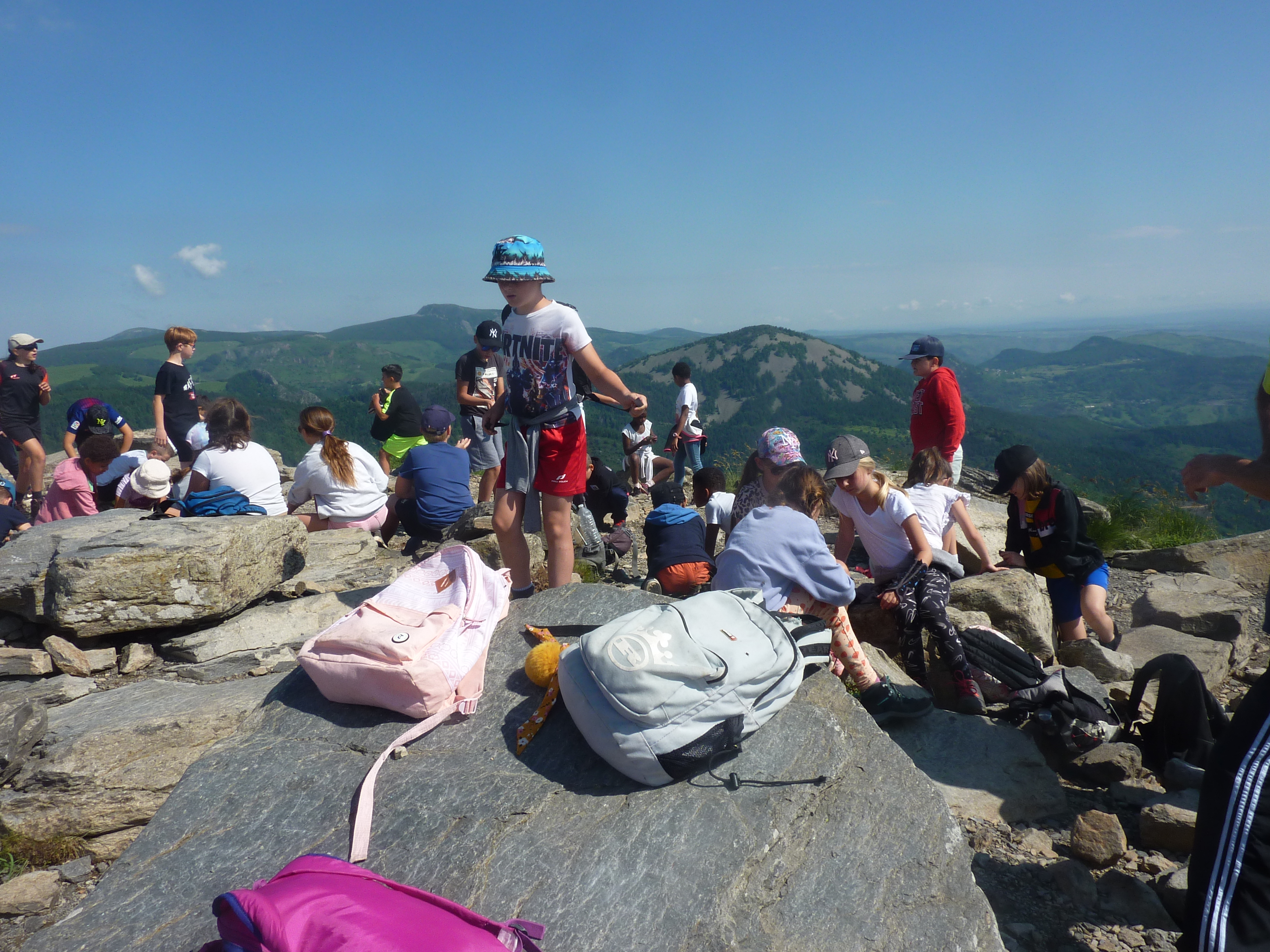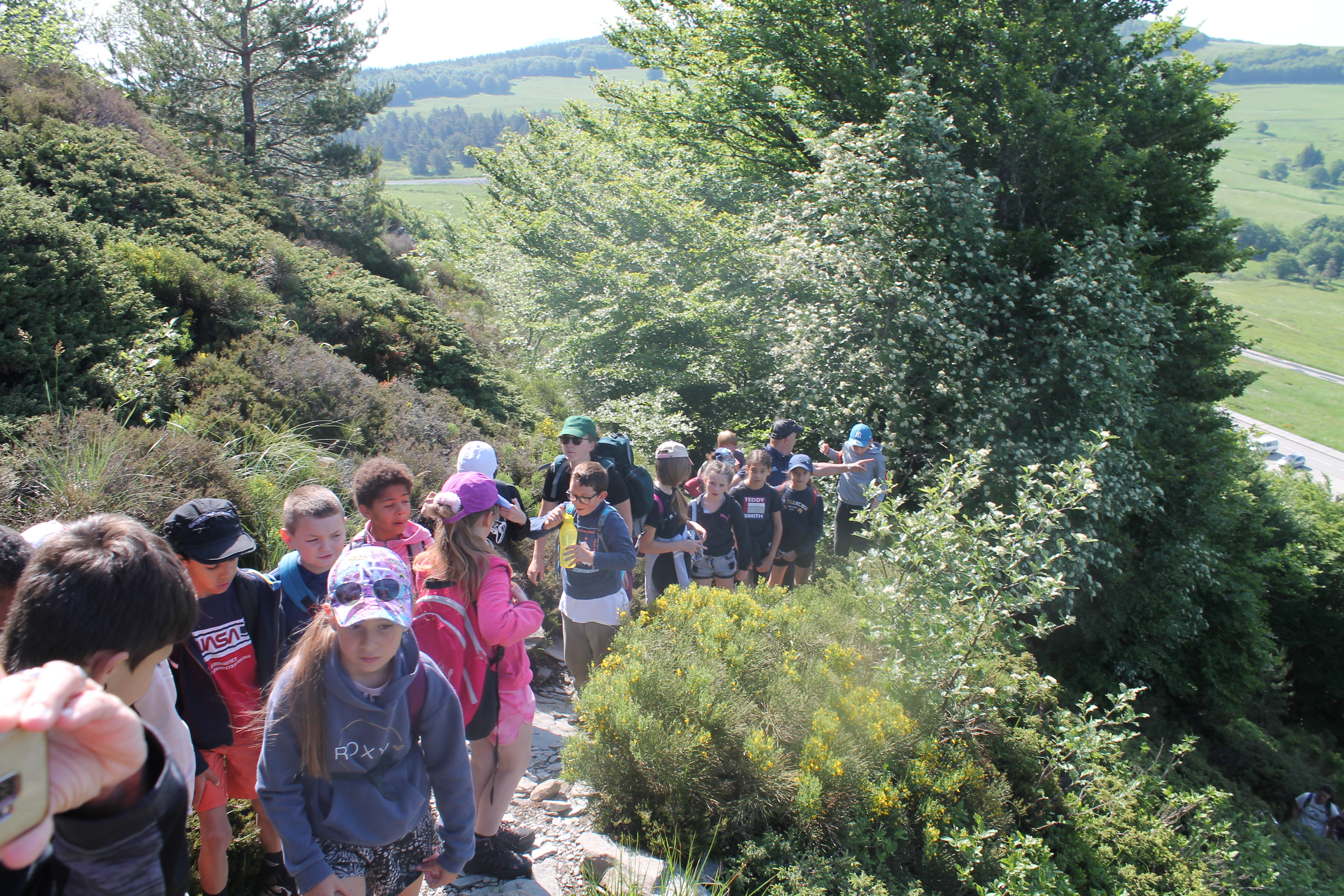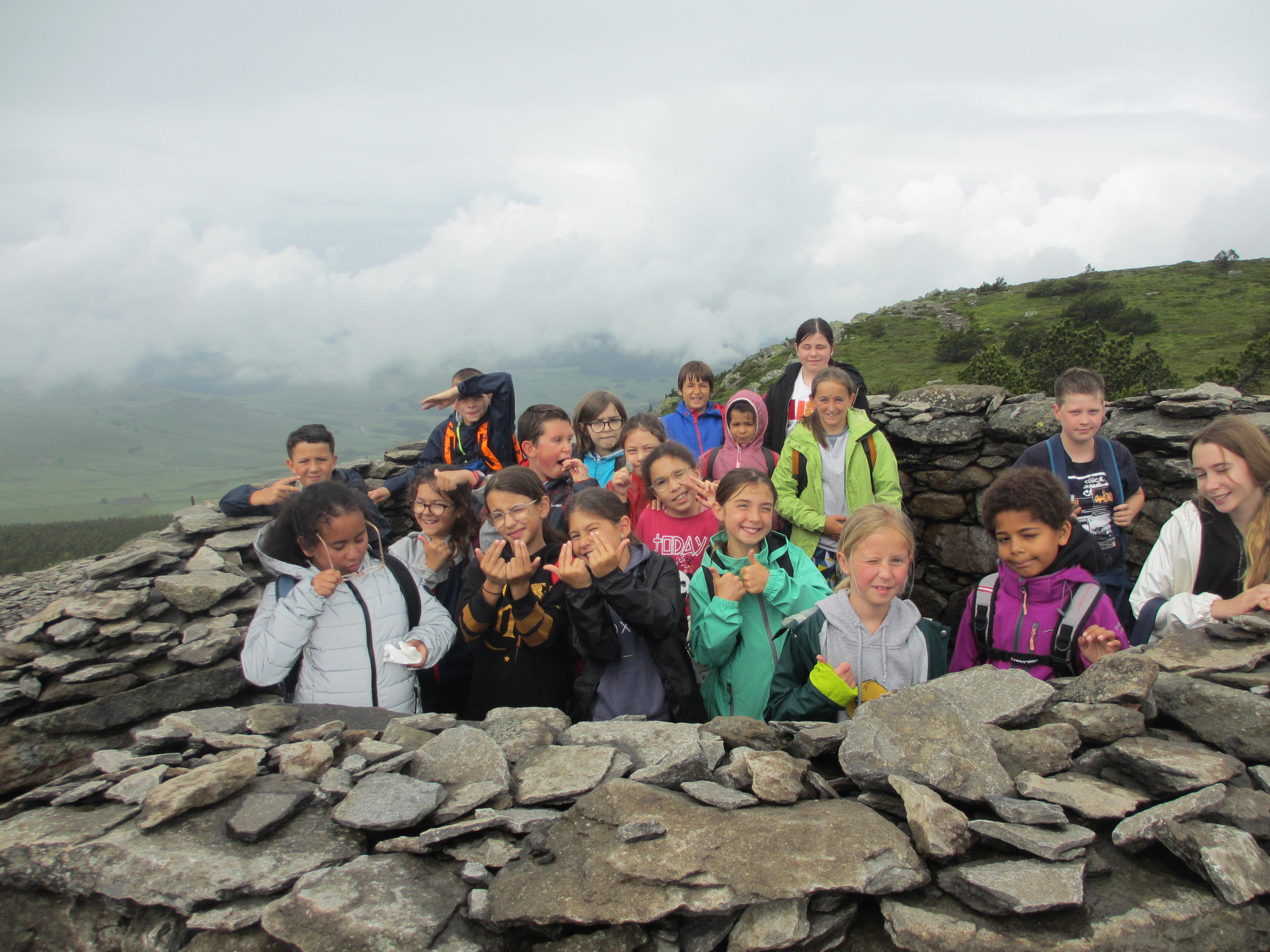 En sortant du bus, nous avons attaqué à gravir le Mont Gerbier de Jonc. En montant, nous nous sommes arrêtés quelques fois pour regarder le paysage puis, une fois arrivés au sommet, Hervé notre guide, nous a parlé du type de ce volcan et de ce qui l'entoure. A la fin, nous sommes redescendus puis nous avons pique-niqué au pied du volcan. Nous avons repris le bus pour aller au volcan du Cherche Muse où nous avons cassé des pierres (bombes volcaniques), que nous avons ramassées à l'aide d'Hervé et de Marylou une autre guide du chalet. En reprenant le bus, nous avons pris la direction du Lac d'Issarlés où nous avons parlé du volcan qu'il y avait dessous avec les deux guides. Nous avons goutté puis nous avons joué sur le sable. Nous avons repris le bus en direction du chalet où nous avons pris une douche, le soir nous avons mangé : une soupe de légumes, une poêlée forestière, de la pizza et une mousse au chocolat.