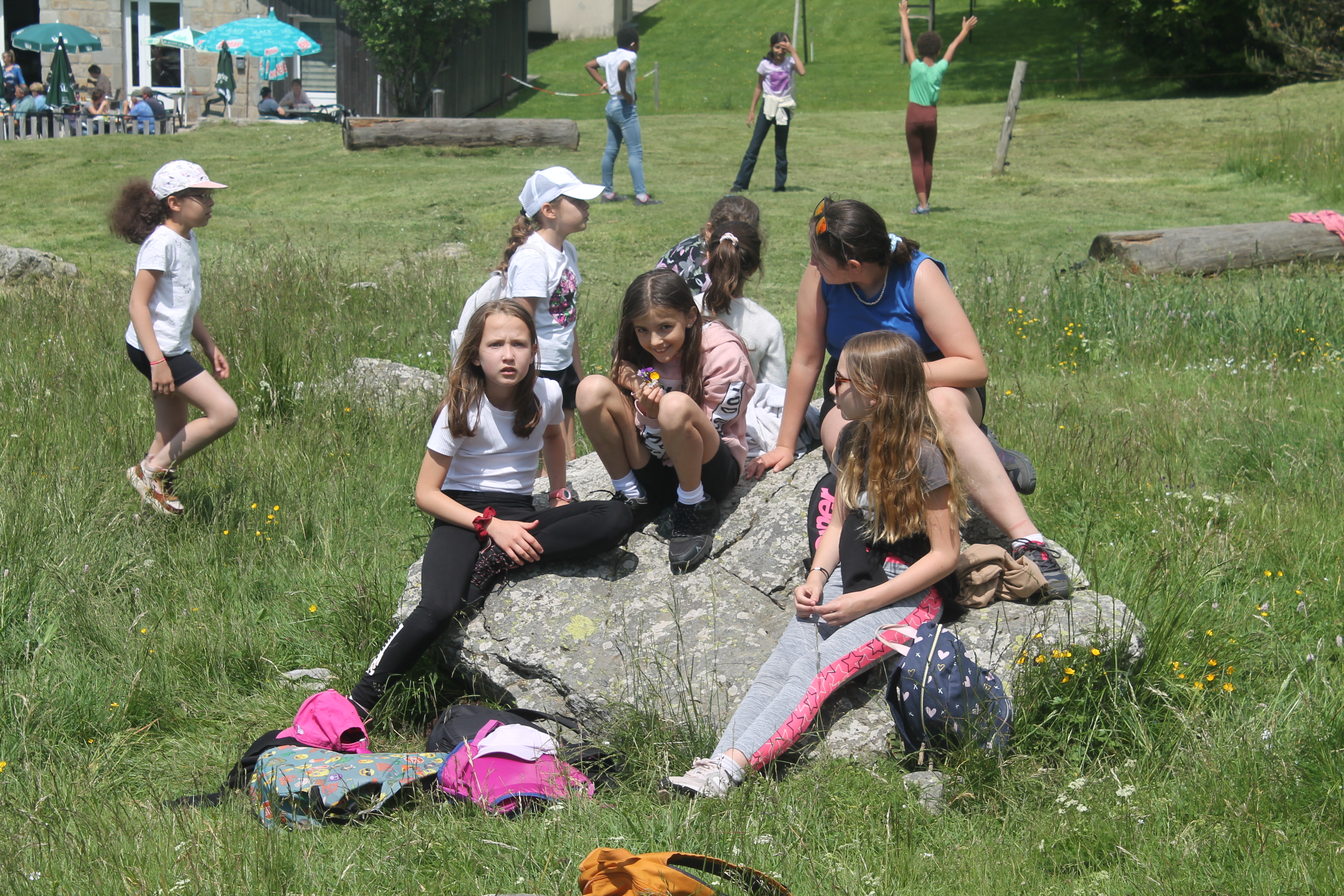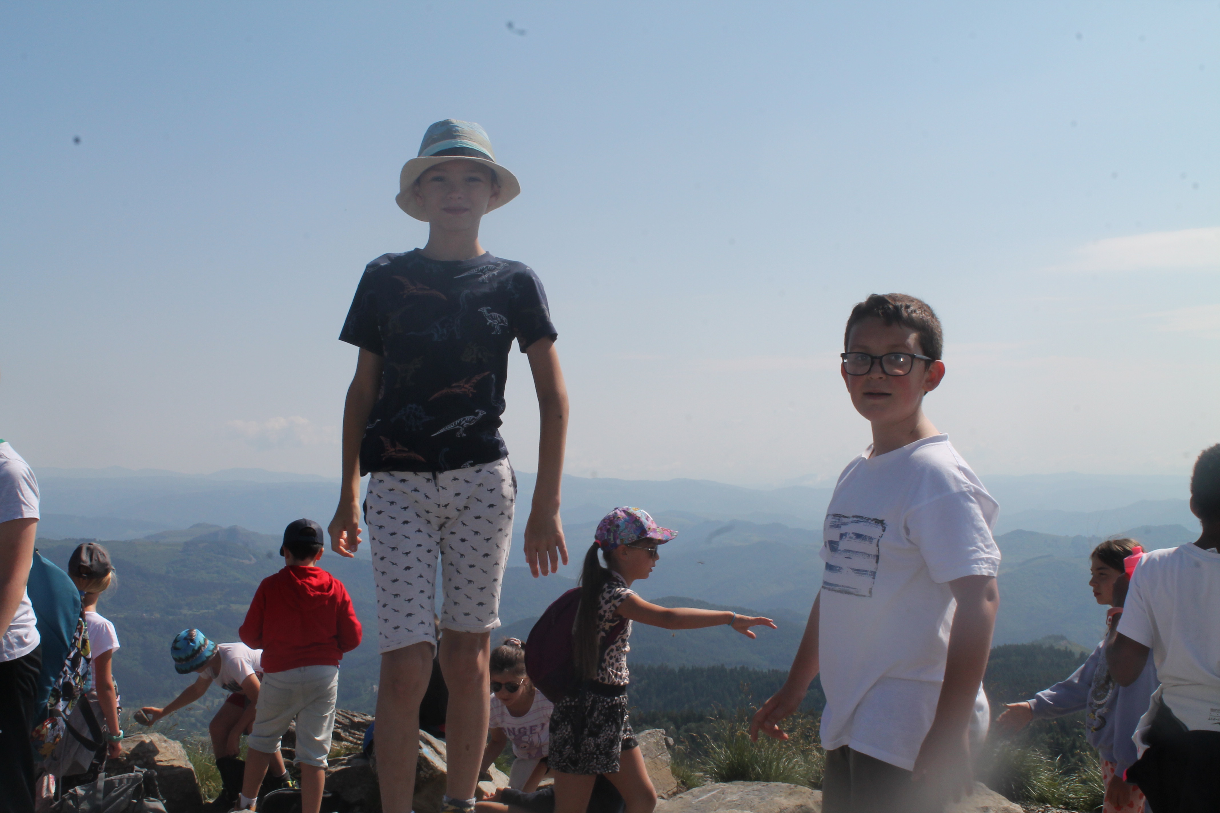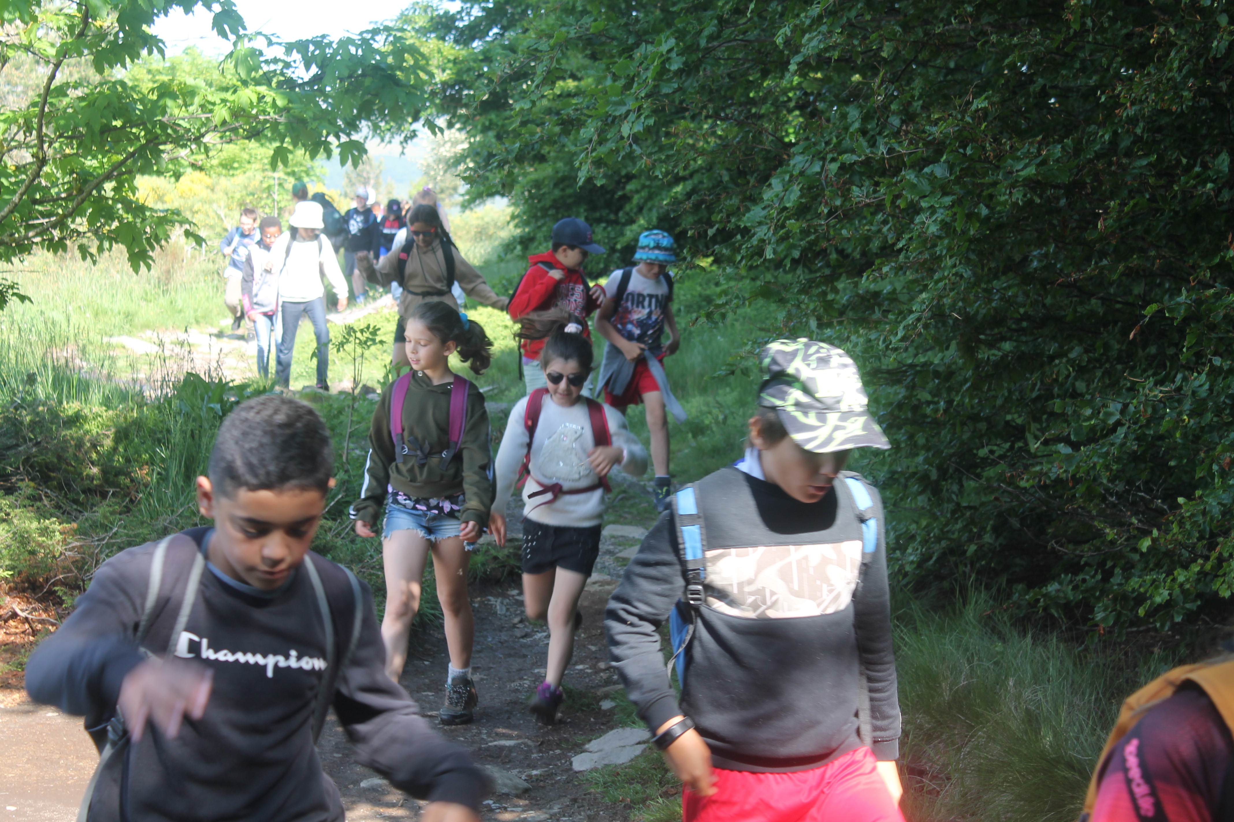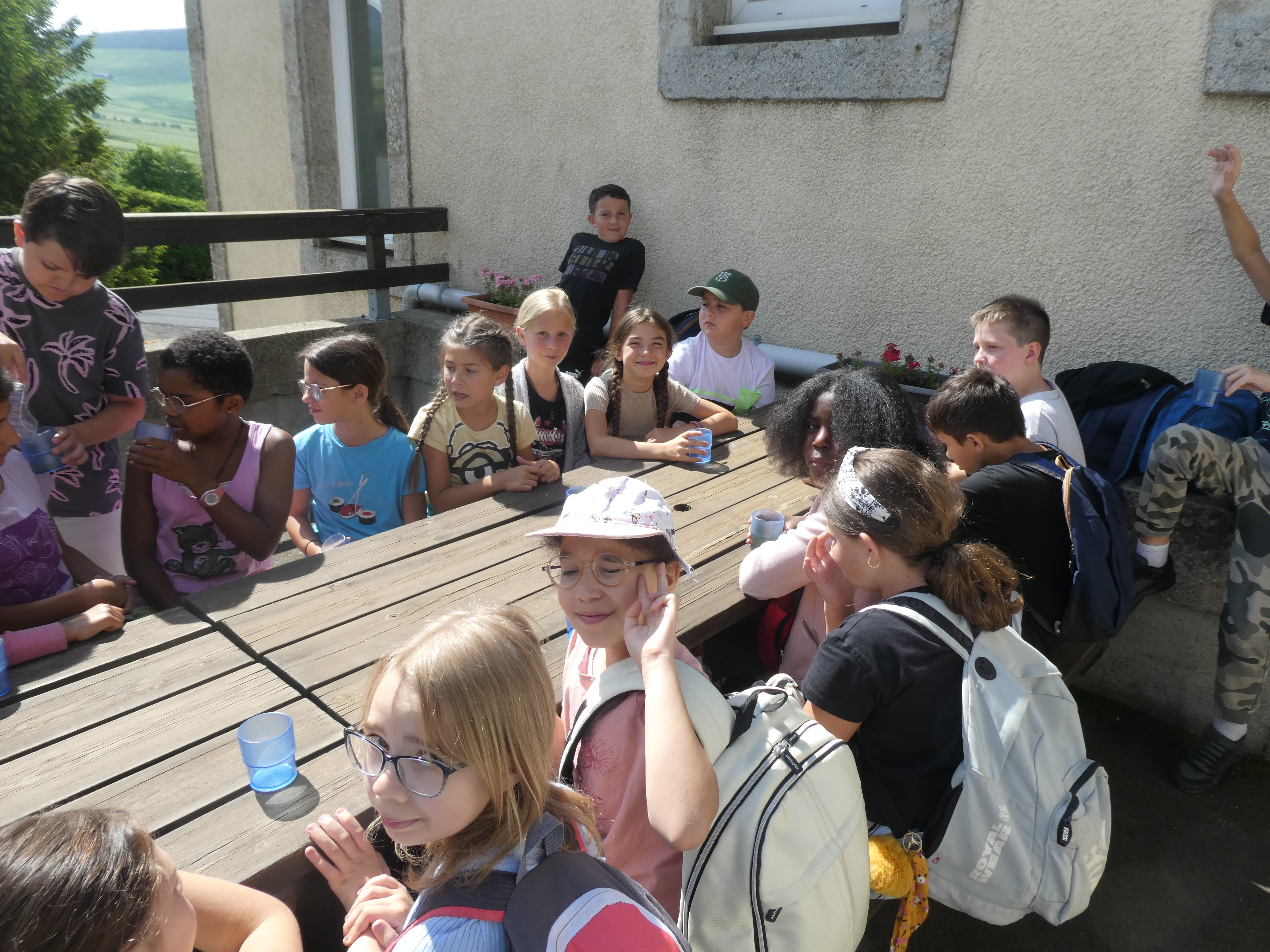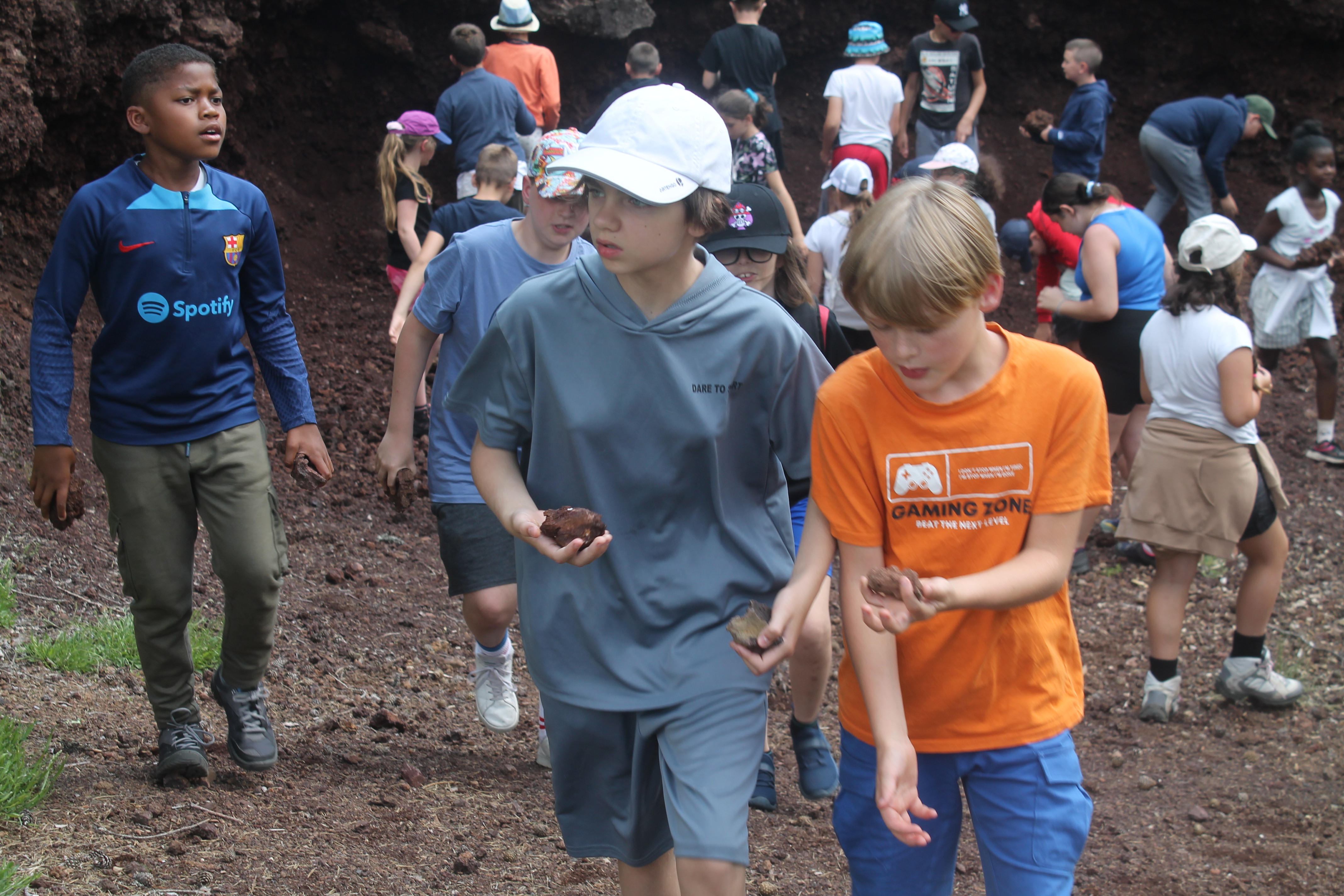 En sortant du bus, nous avons attaqué à gravir le Mont Gerbier de Jonc. En montant, nous nous sommes arrêtés quelques fois pour regarder le paysage puis, une fois arrivés au sommet, Hervé notre guide, nous a parlé du type de ce volcan et de ce qui l'entoure. A la fin, nous sommes redescendus puis nous avons pique-niqué au pied du volcan. Nous avons repris le bus pour aller au volcan du Cherche Muse où nous avons cassé des pierres (bombes volcaniques), que nous avons ramassées à l'aide d'Hervé et de Marylou une autre guide du chalet. En reprenant le bus, nous avons pris la direction du Lac d'Issarlés où nous avons parlé du volcan qu'il y avait dessous avec les deux guides. Nous avons goutté puis nous avons joué sur le sable. Nous avons repris le bus en direction du chalet où nous avons pris une douche, le soir nous avons mangé : une soupe de légumes, une poêlée forestière, de la pizza et une mousse au chocolat.