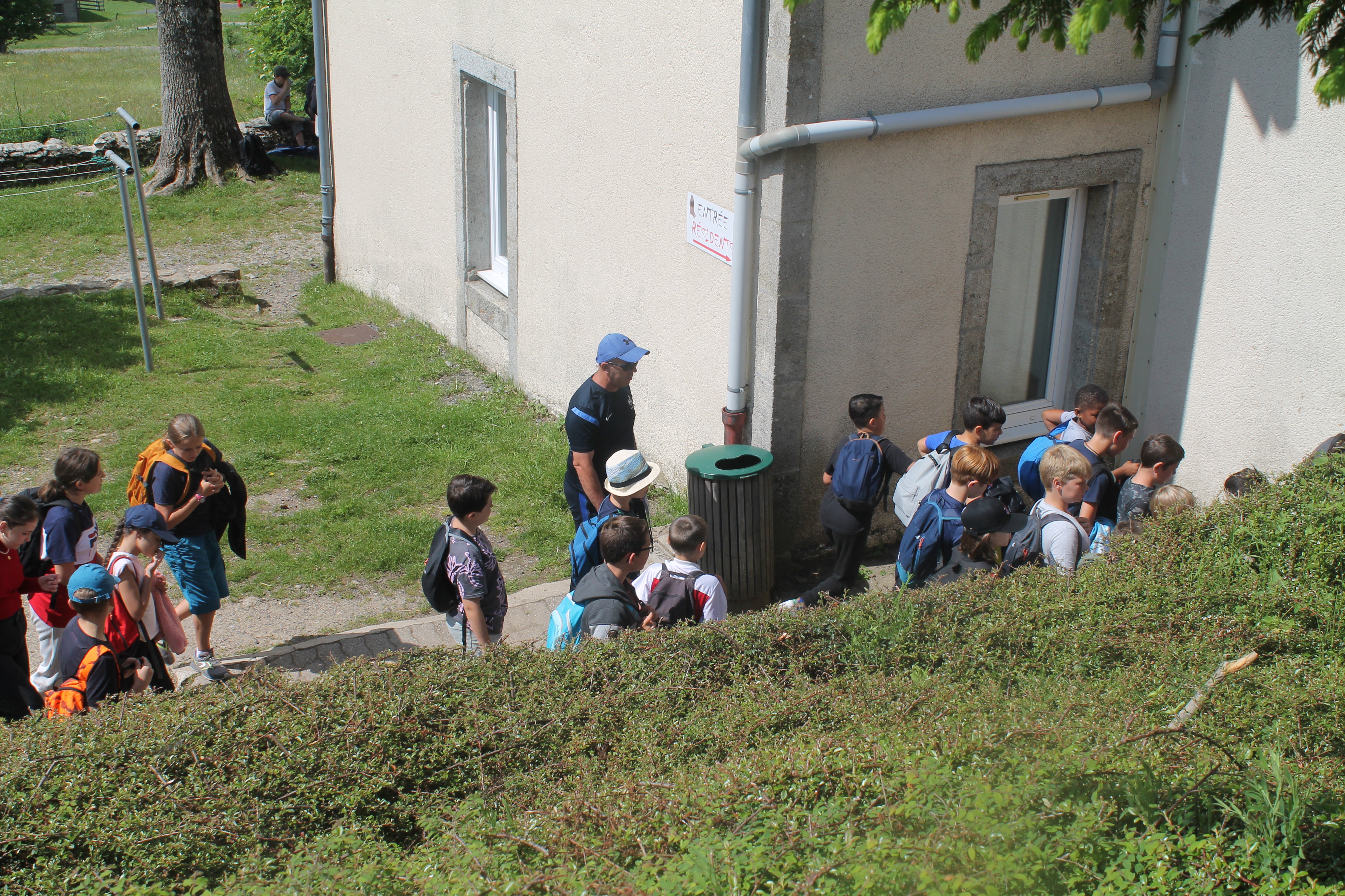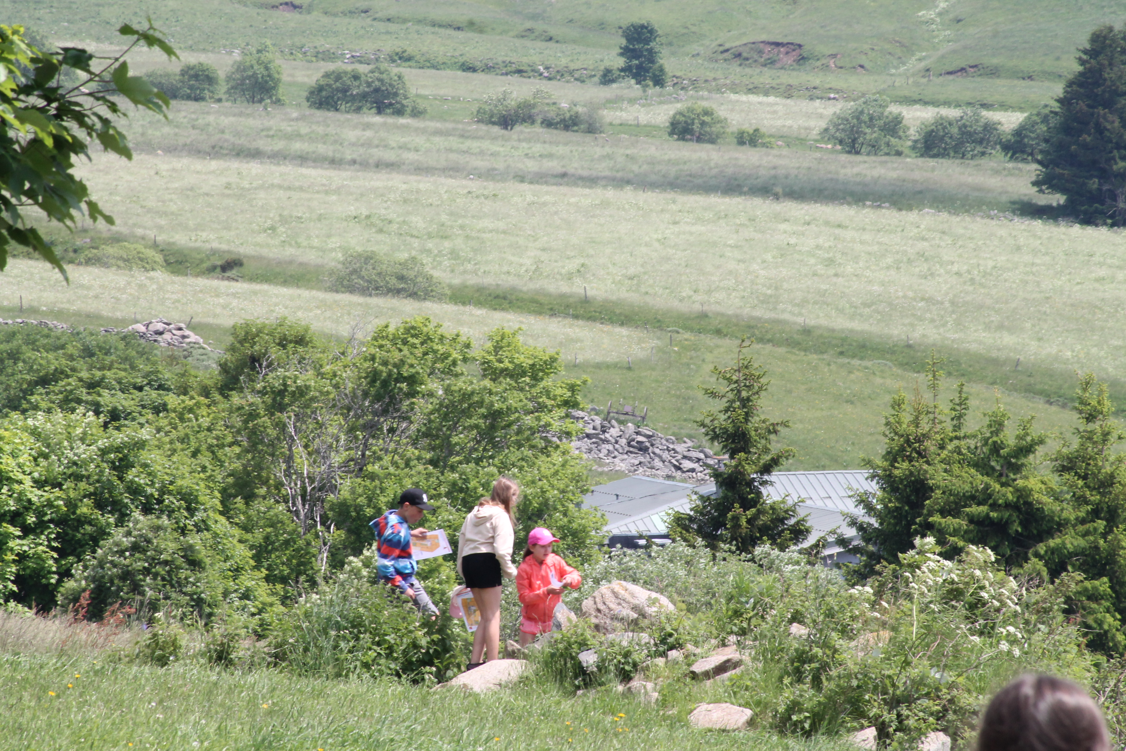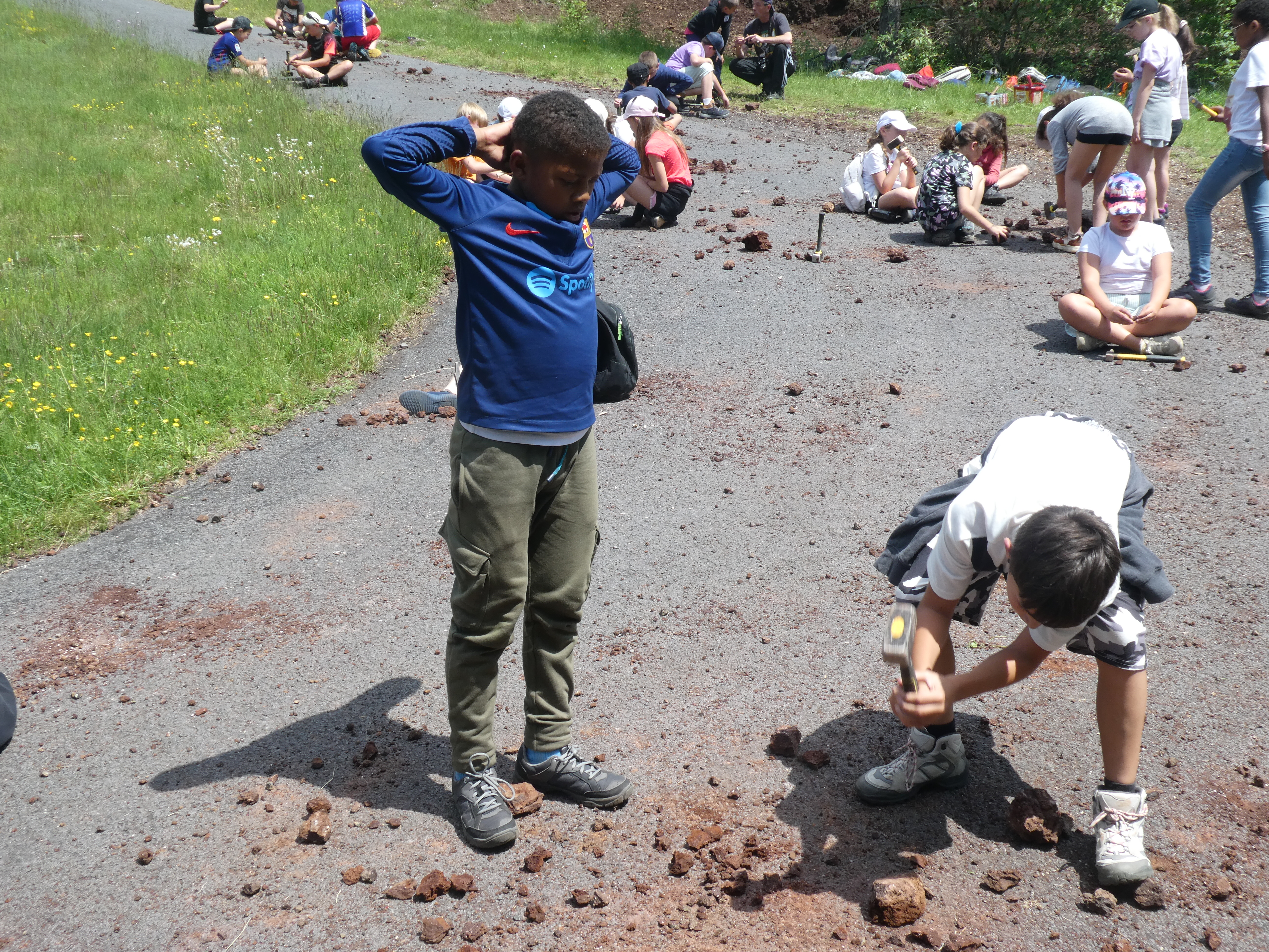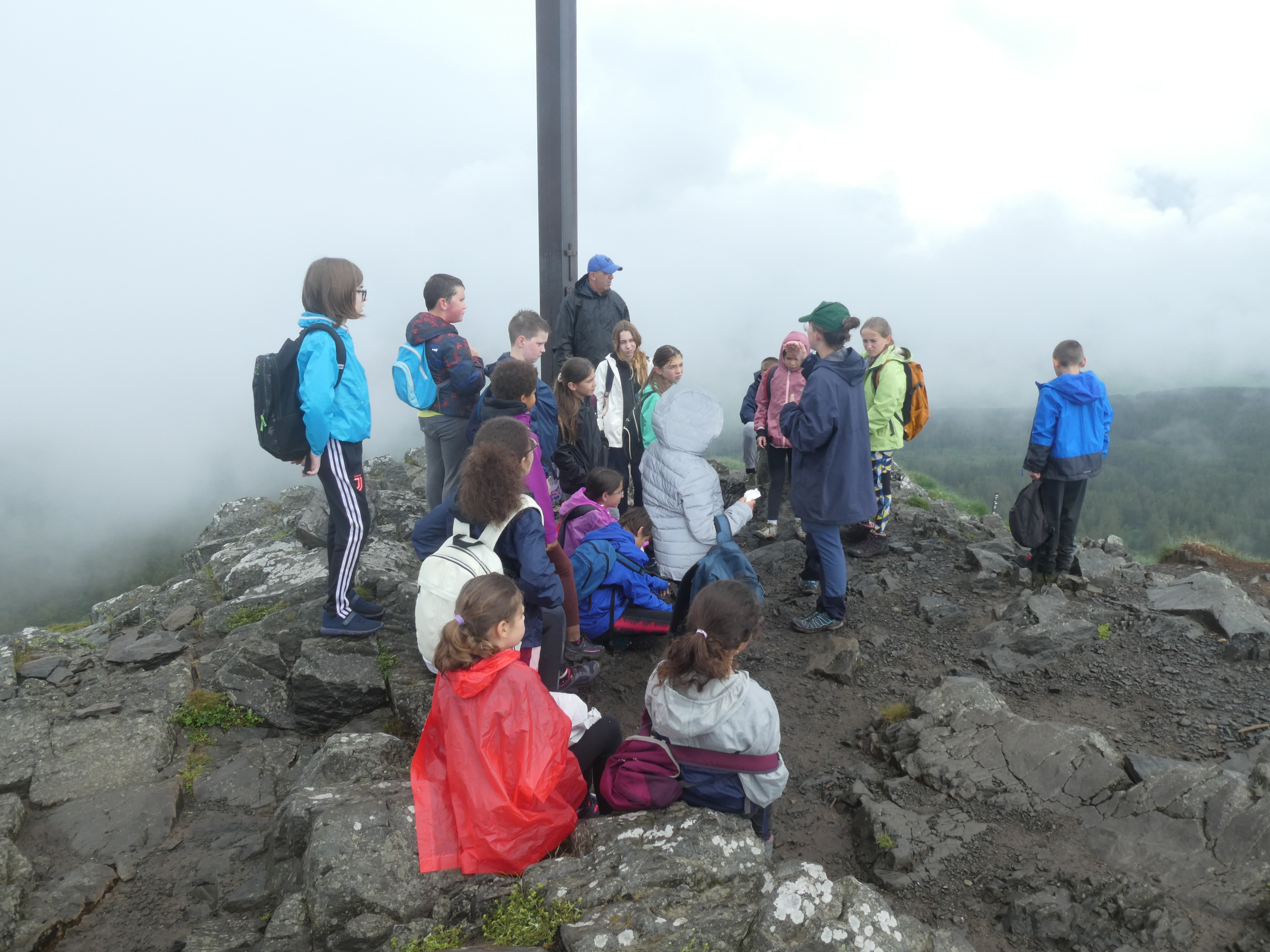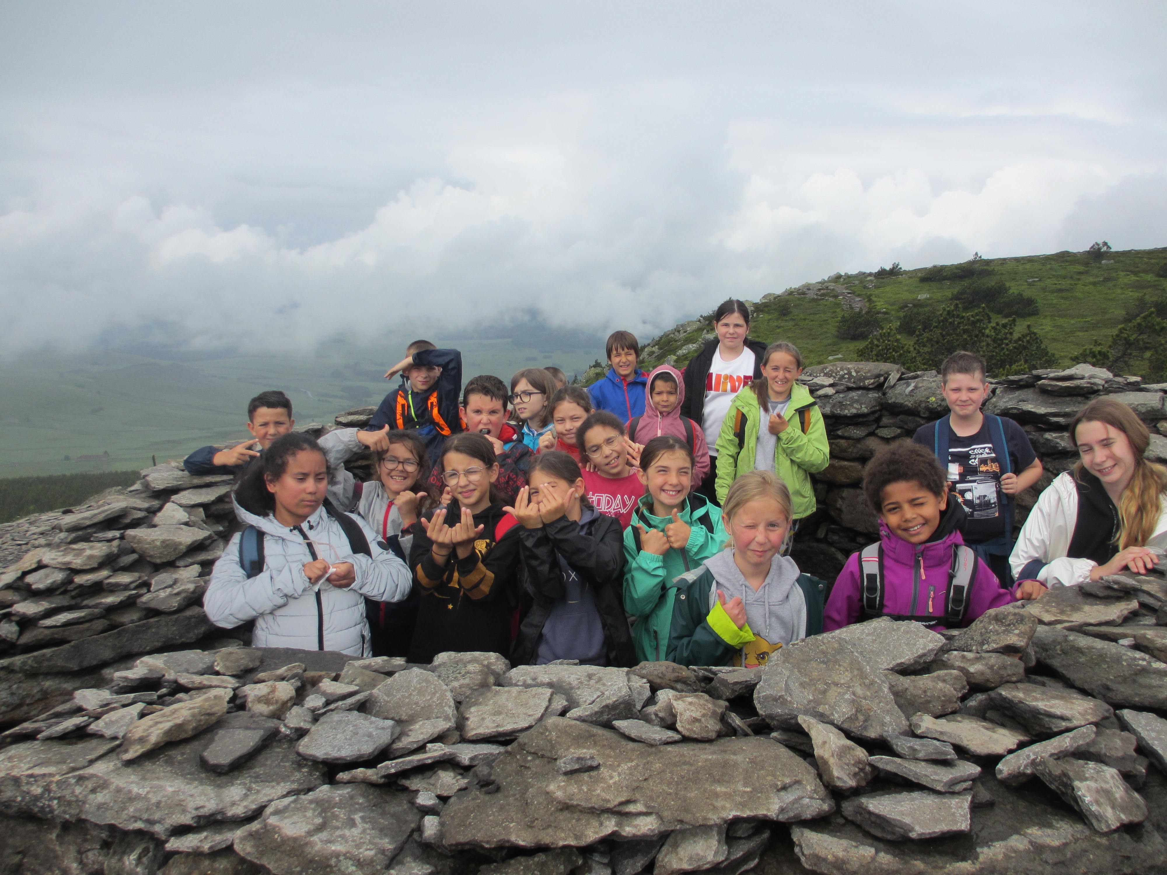 En sortant du bus, nous avons attaqué à gravir le Mont Gerbier de Jonc. En montant, nous nous sommes arrêtés quelques fois pour regarder le paysage puis, une fois arrivés au sommet, Hervé notre guide, nous a parlé du type de ce volcan et de ce qui l'entoure. A la fin, nous sommes redescendus puis nous avons pique-niqué au pied du volcan. Nous avons repris le bus pour aller au volcan du Cherche Muse où nous avons cassé des pierres (bombes volcaniques), que nous avons ramassées à l'aide d'Hervé et de Marylou une autre guide du chalet. En reprenant le bus, nous avons pris la direction du Lac d'Issarlés où nous avons parlé du volcan qu'il y avait dessous avec les deux guides. Nous avons goutté puis nous avons joué sur le sable. Nous avons repris le bus en direction du chalet où nous avons pris une douche, le soir nous avons mangé : une soupe de légumes, une poêlée forestière, de la pizza et une mousse au chocolat.