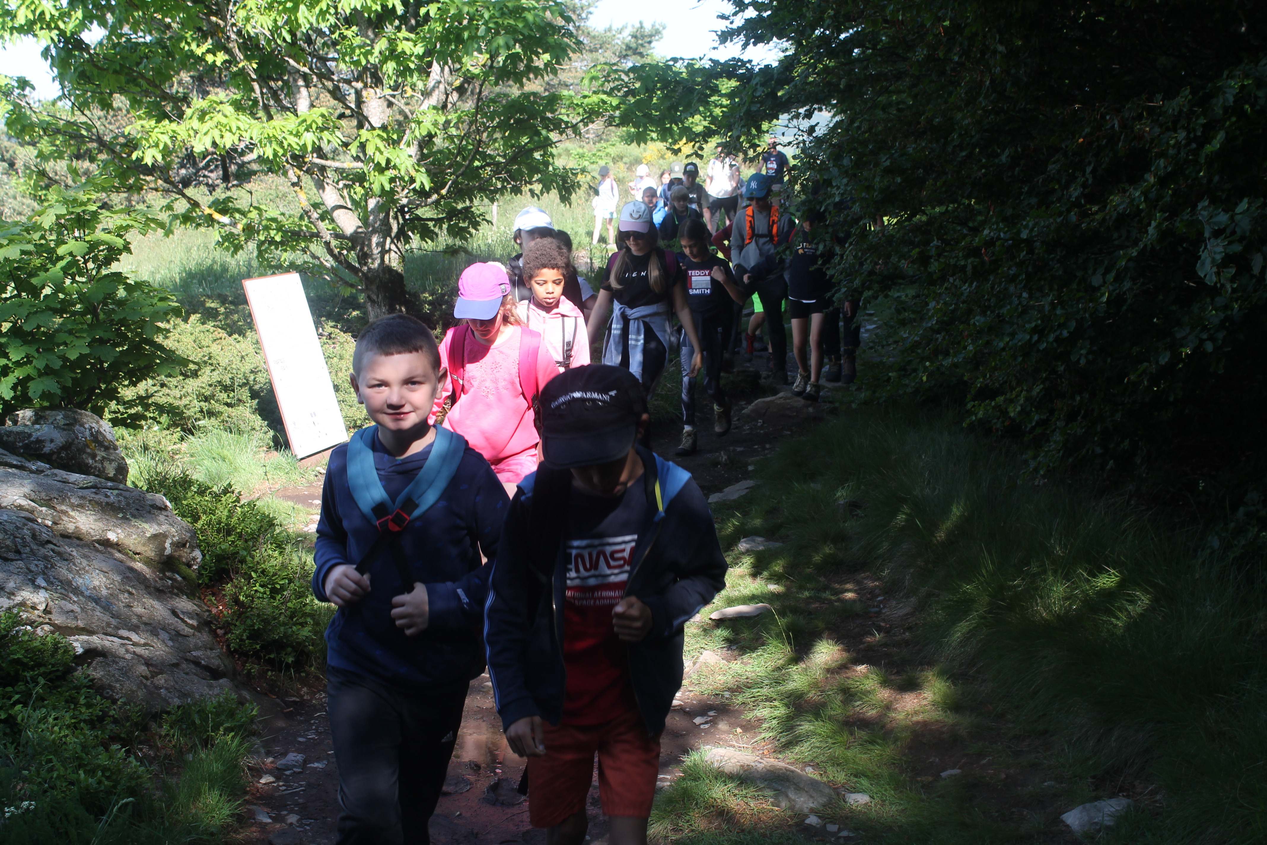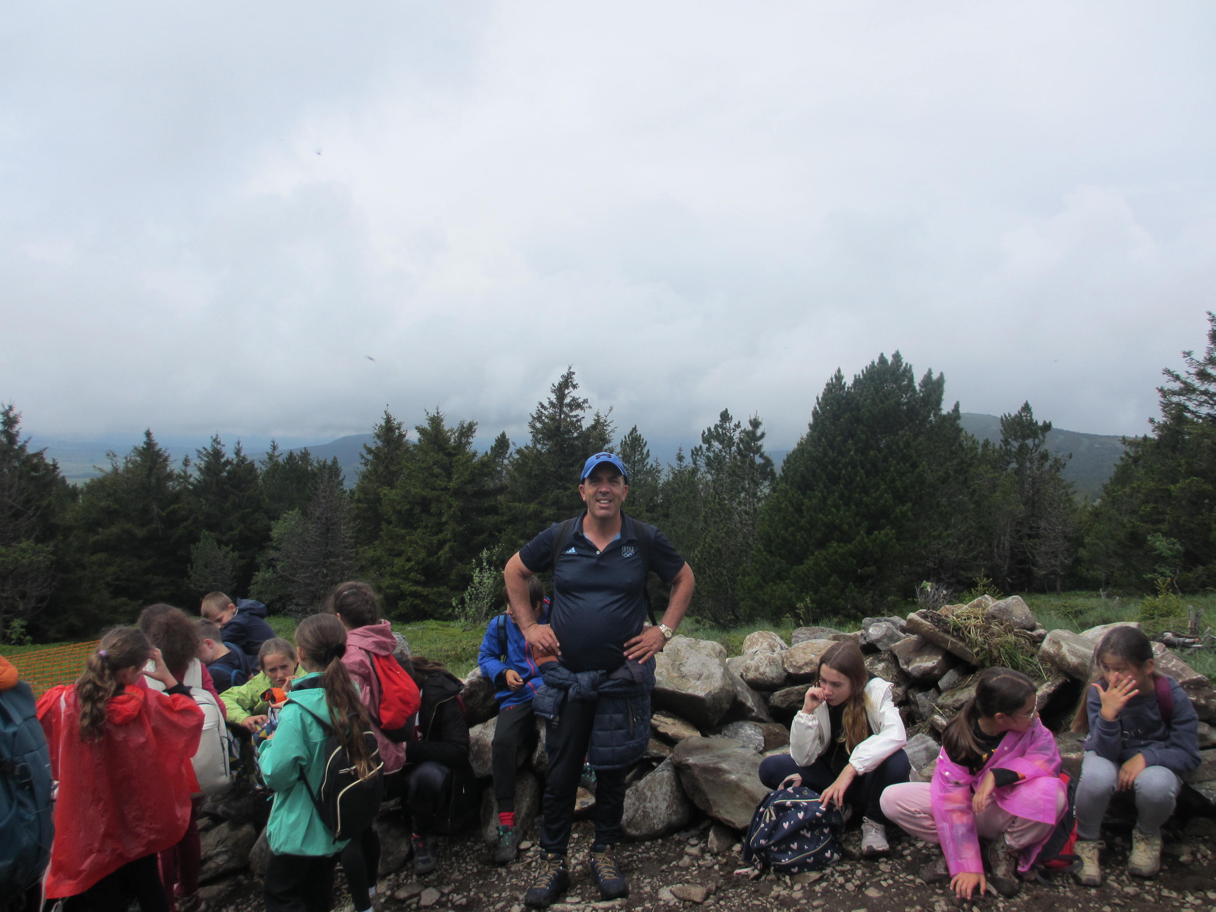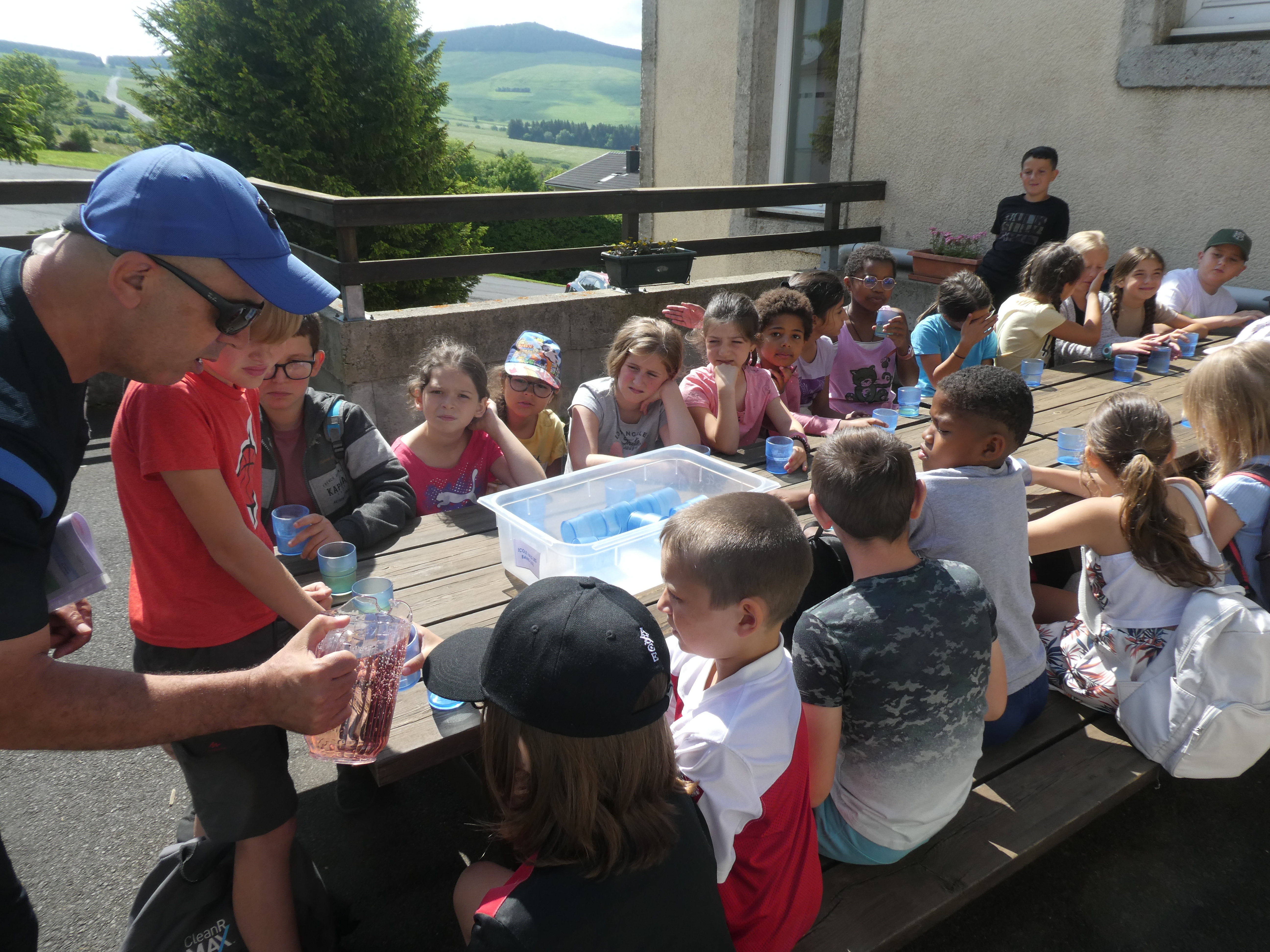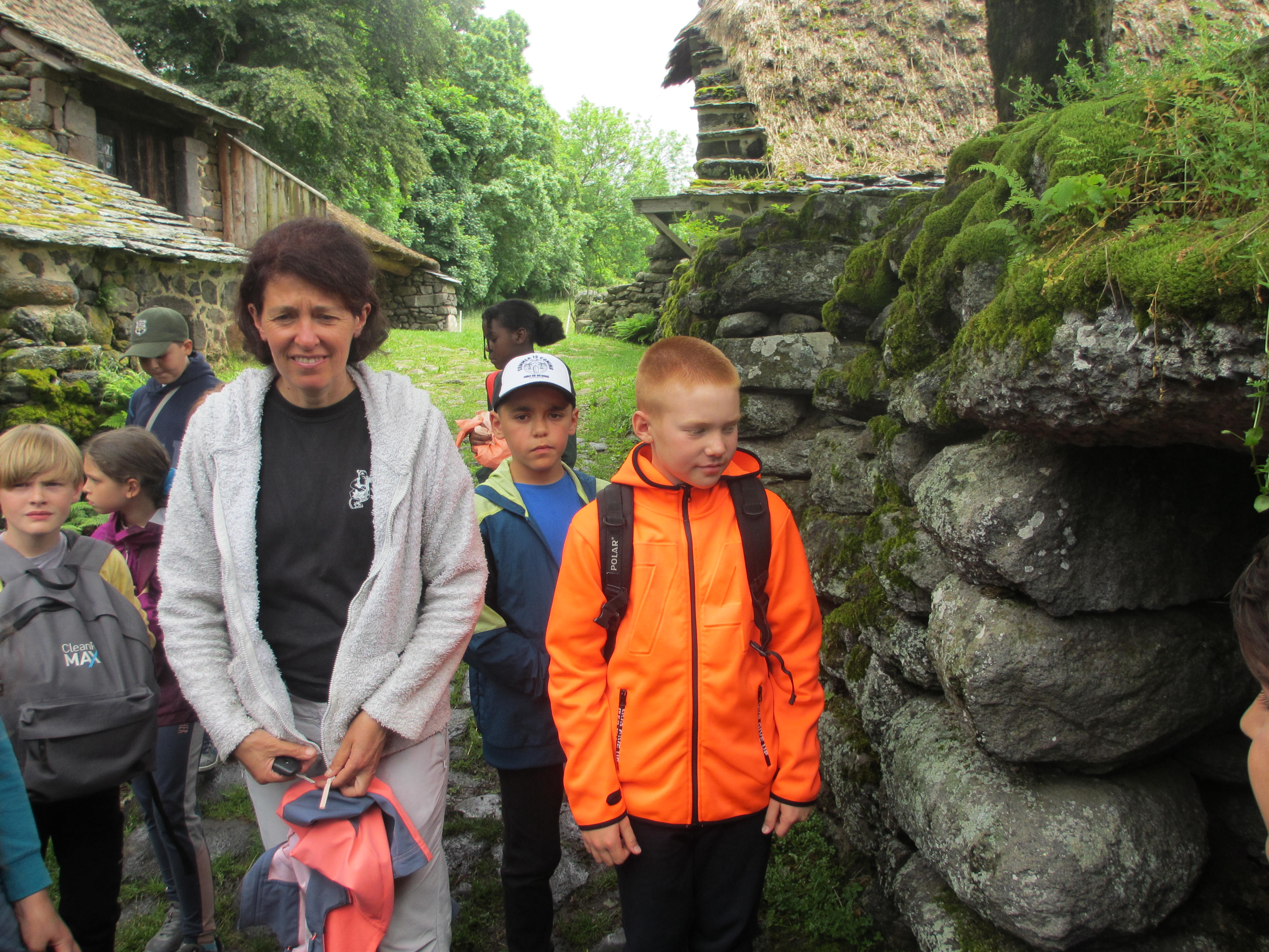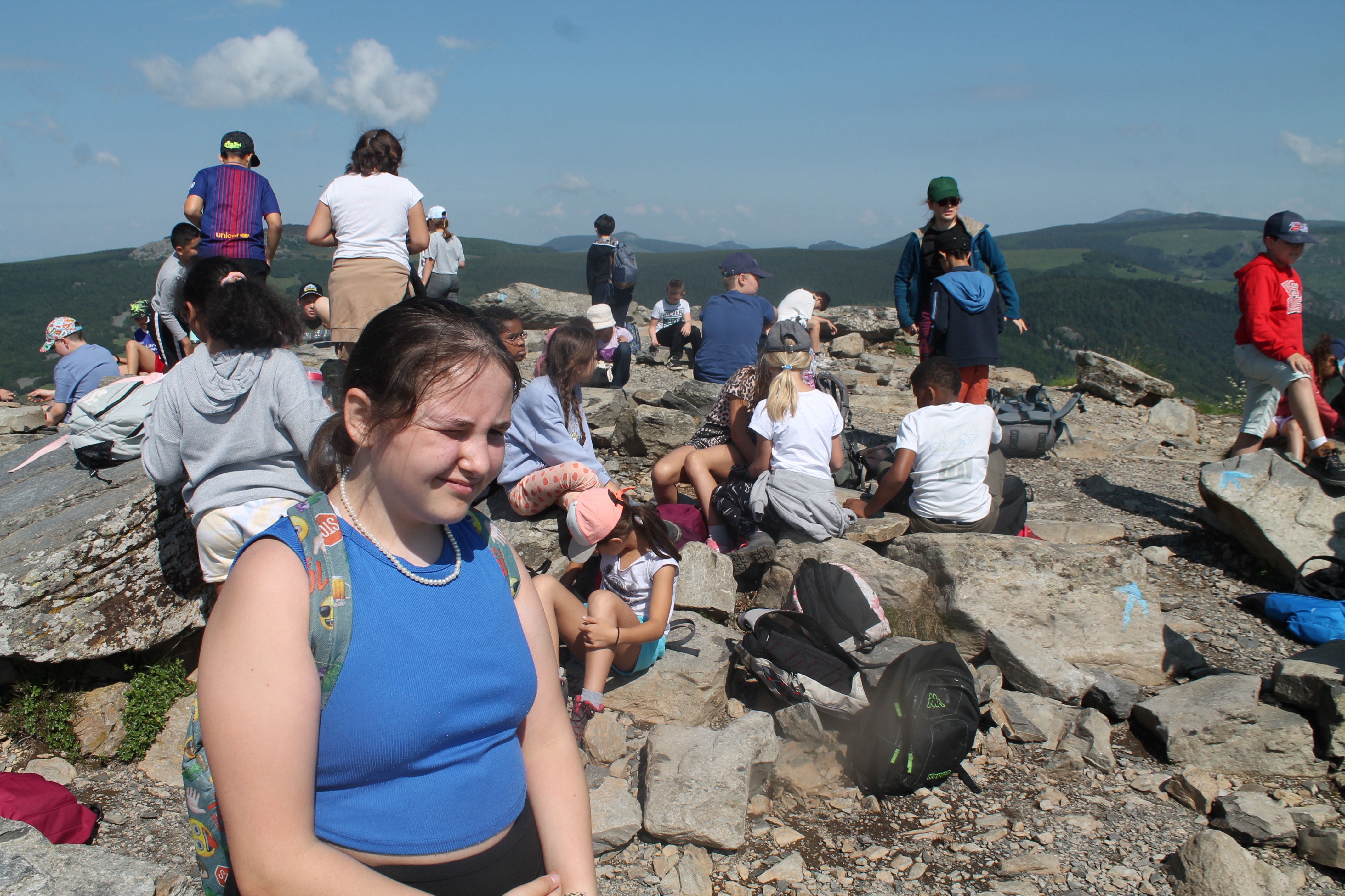 En sortant du bus, nous avons attaqué à gravir le Mont Gerbier de Jonc. En montant, nous nous sommes arrêtés quelques fois pour regarder le paysage puis, une fois arrivés au sommet, Hervé notre guide, nous a parlé du type de ce volcan et de ce qui l'entoure. A la fin, nous sommes redescendus puis nous avons pique-niqué au pied du volcan. Nous avons repris le bus pour aller au volcan du Cherche Muse où nous avons cassé des pierres (bombes volcaniques), que nous avons ramassées à l'aide d'Hervé et de Marylou une autre guide du chalet. En reprenant le bus, nous avons pris la direction du Lac d'Issarlés où nous avons parlé du volcan qu'il y avait dessous avec les deux guides. Nous avons goutté puis nous avons joué sur le sable. Nous avons repris le bus en direction du chalet où nous avons pris une douche, le soir nous avons mangé : une soupe de légumes, une poêlée forestière, de la pizza et une mousse au chocolat.
