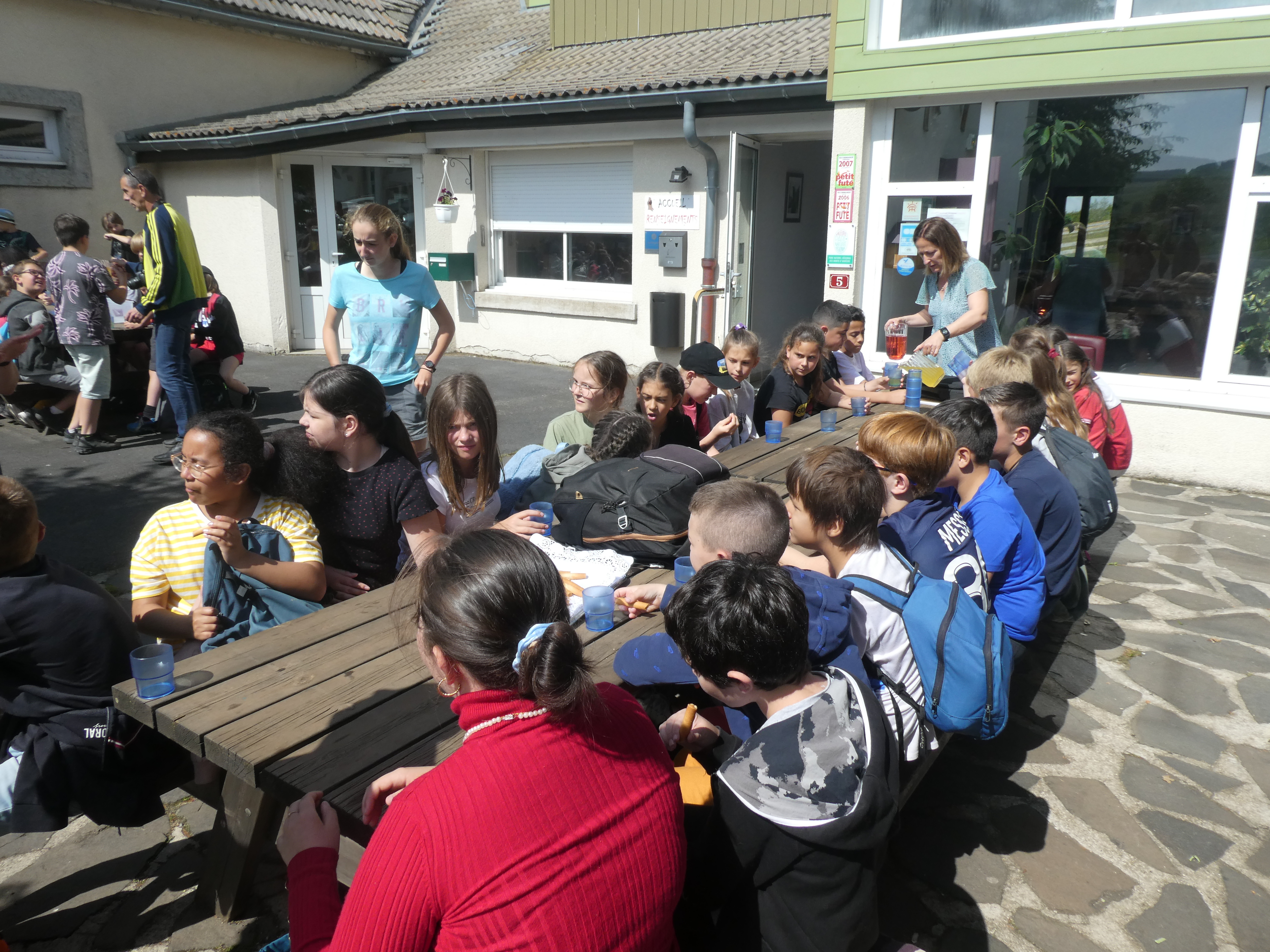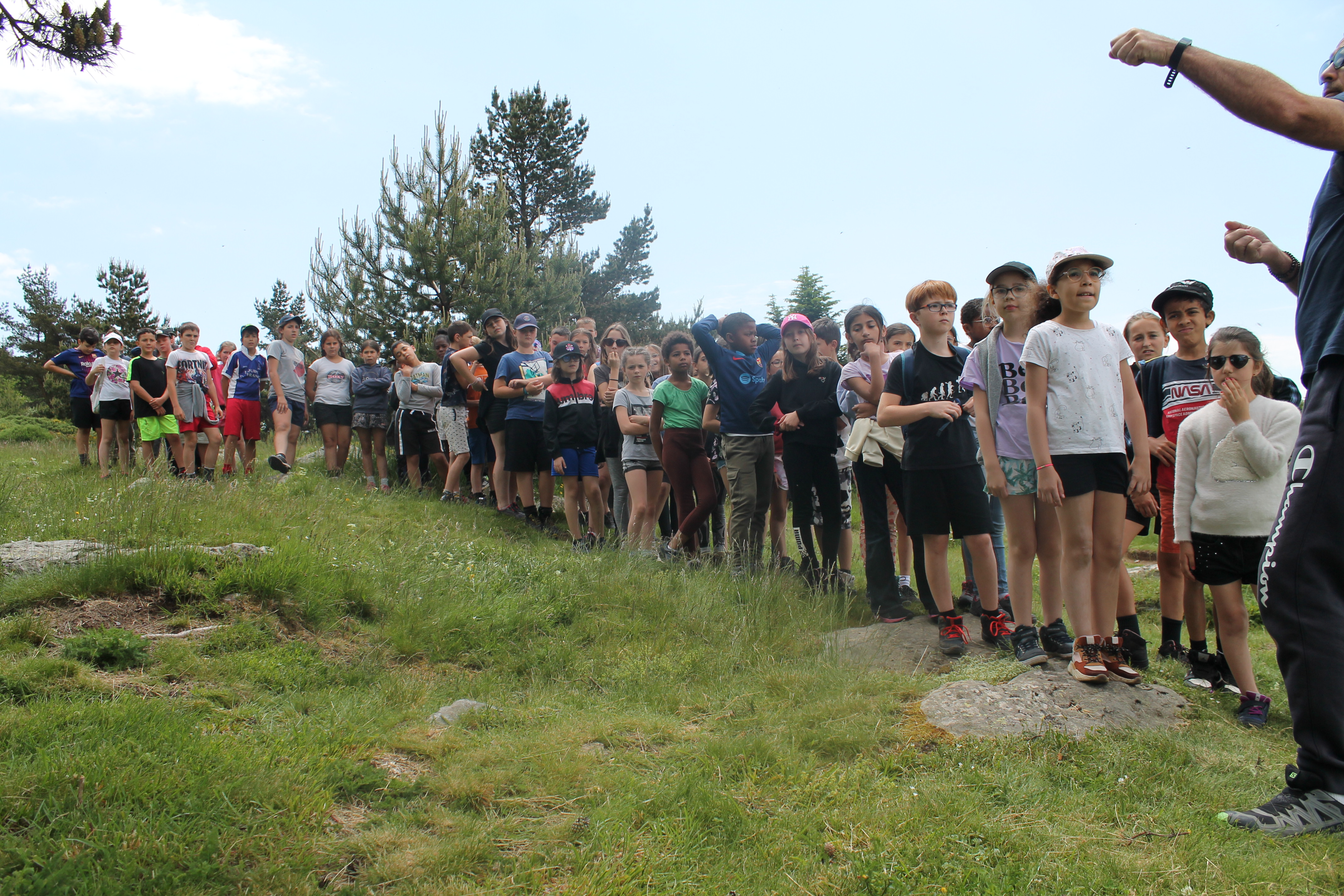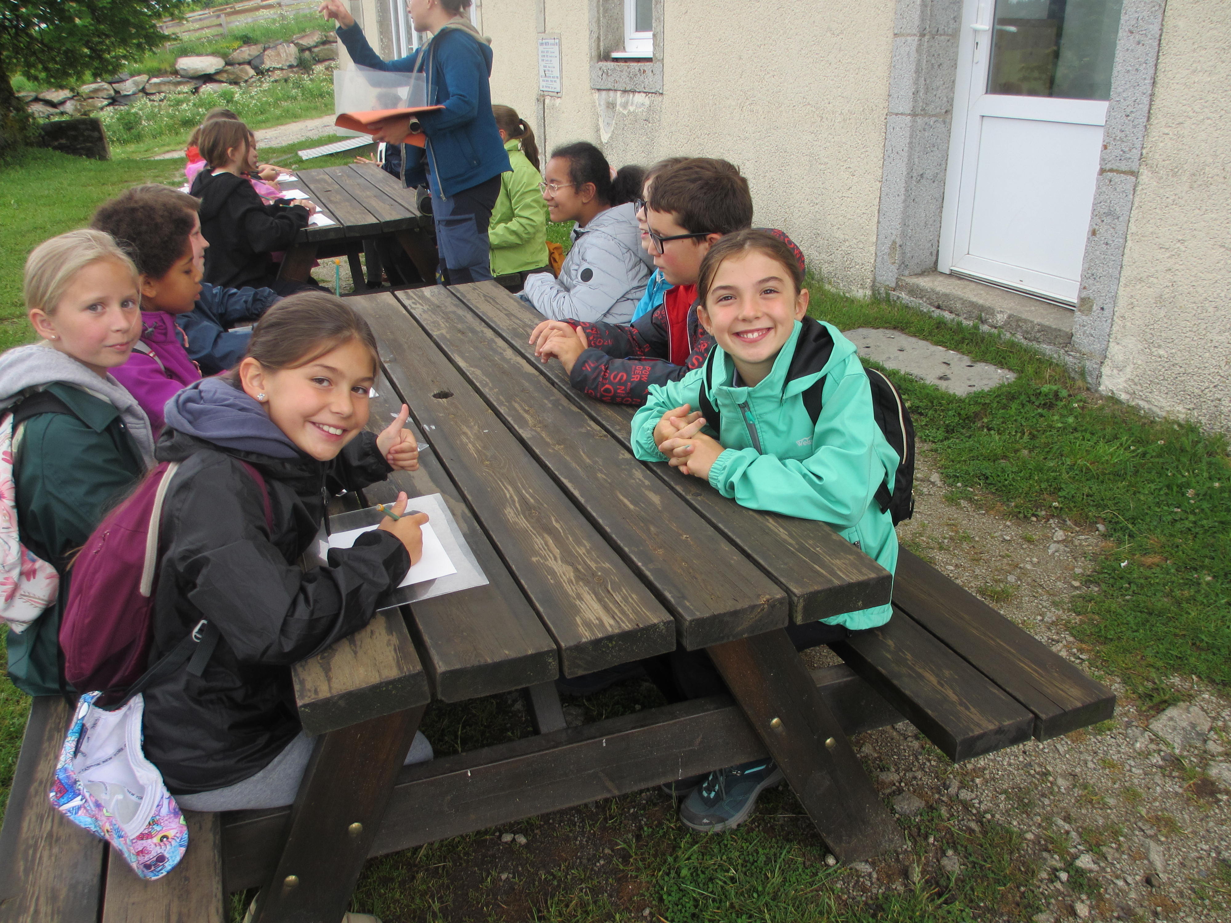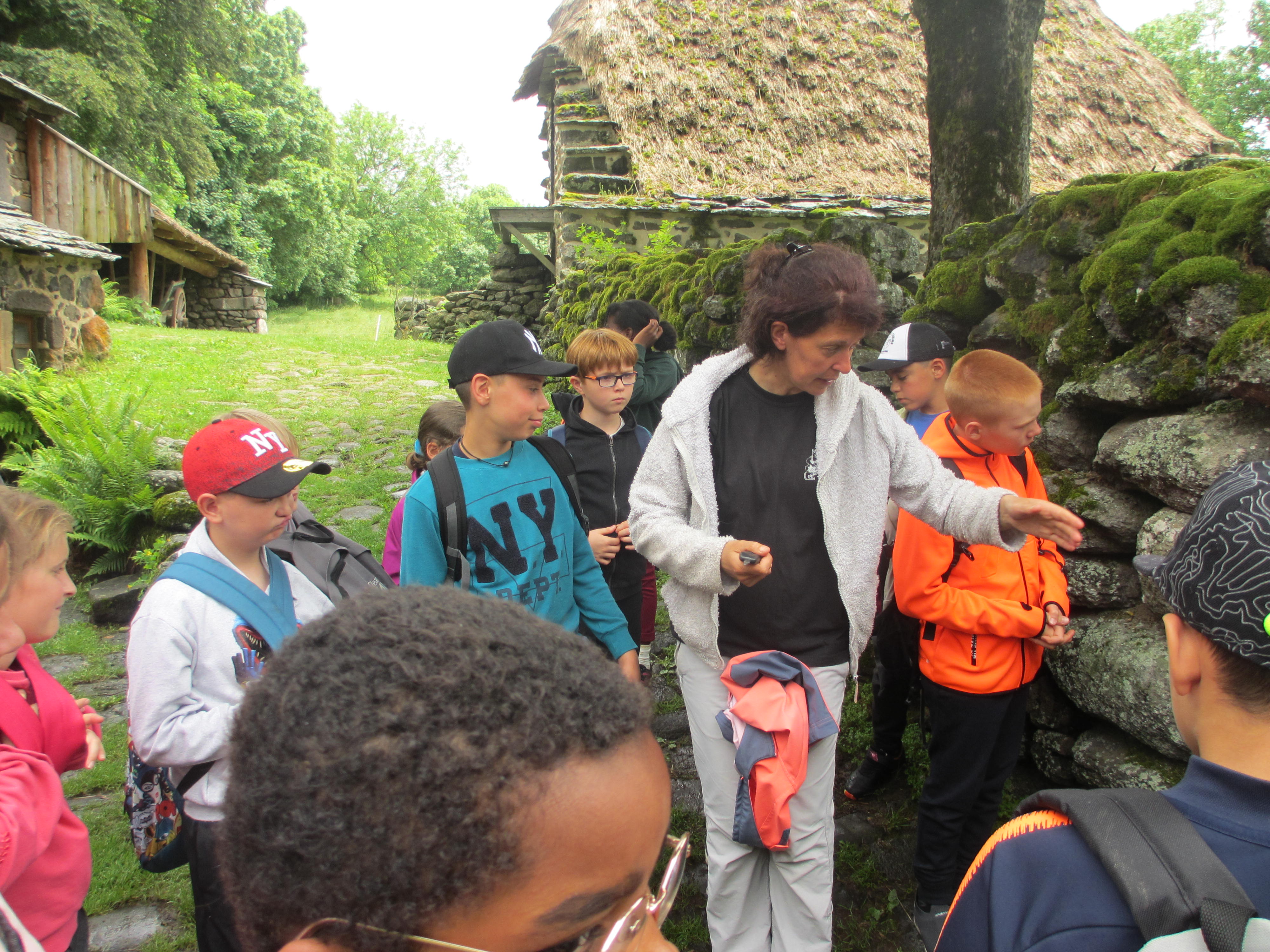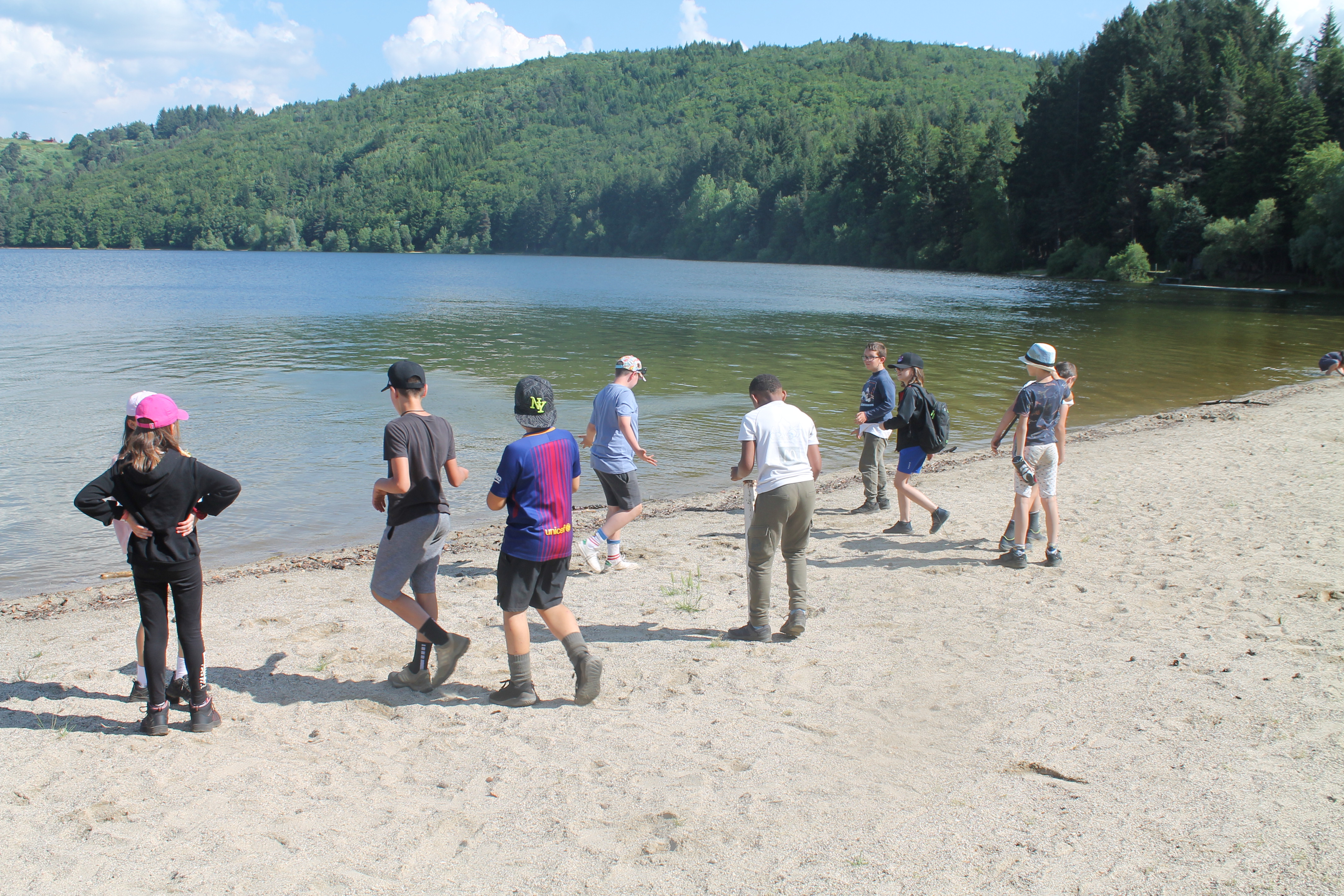 En sortant du bus, nous avons attaqué à gravir le Mont Gerbier de Jonc. En montant, nous nous sommes arrêtés quelques fois pour regarder le paysage puis, une fois arrivés au sommet, Hervé notre guide, nous a parlé du type de ce volcan et de ce qui l'entoure. A la fin, nous sommes redescendus puis nous avons pique-niqué au pied du volcan. Nous avons repris le bus pour aller au volcan du Cherche Muse où nous avons cassé des pierres (bombes volcaniques), que nous avons ramassées à l'aide d'Hervé et de Marylou une autre guide du chalet. En reprenant le bus, nous avons pris la direction du Lac d'Issarlés où nous avons parlé du volcan qu'il y avait dessous avec les deux guides. Nous avons goutté puis nous avons joué sur le sable. Nous avons repris le bus en direction du chalet où nous avons pris une douche, le soir nous avons mangé : une soupe de légumes, une poêlée forestière, de la pizza et une mousse au chocolat.