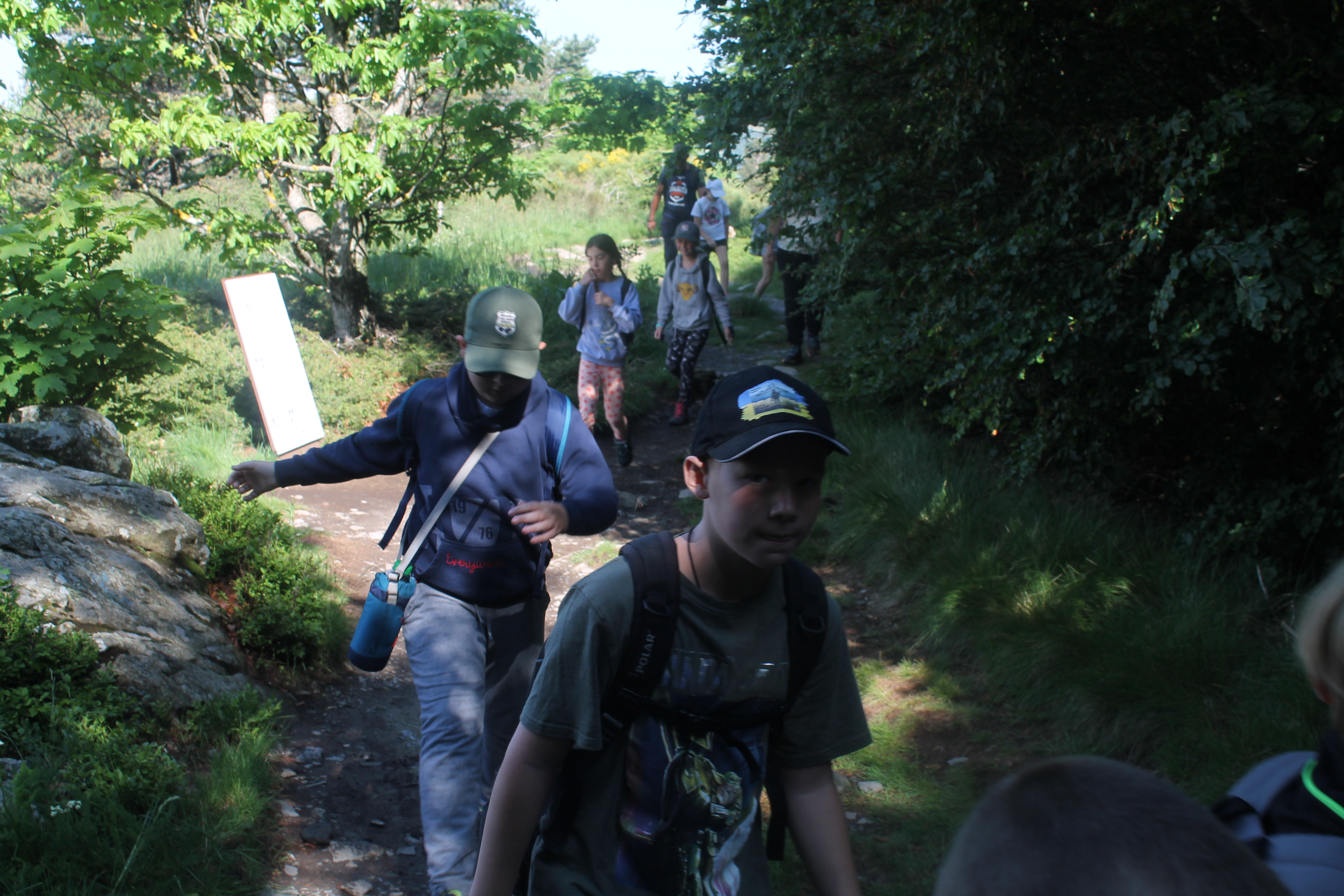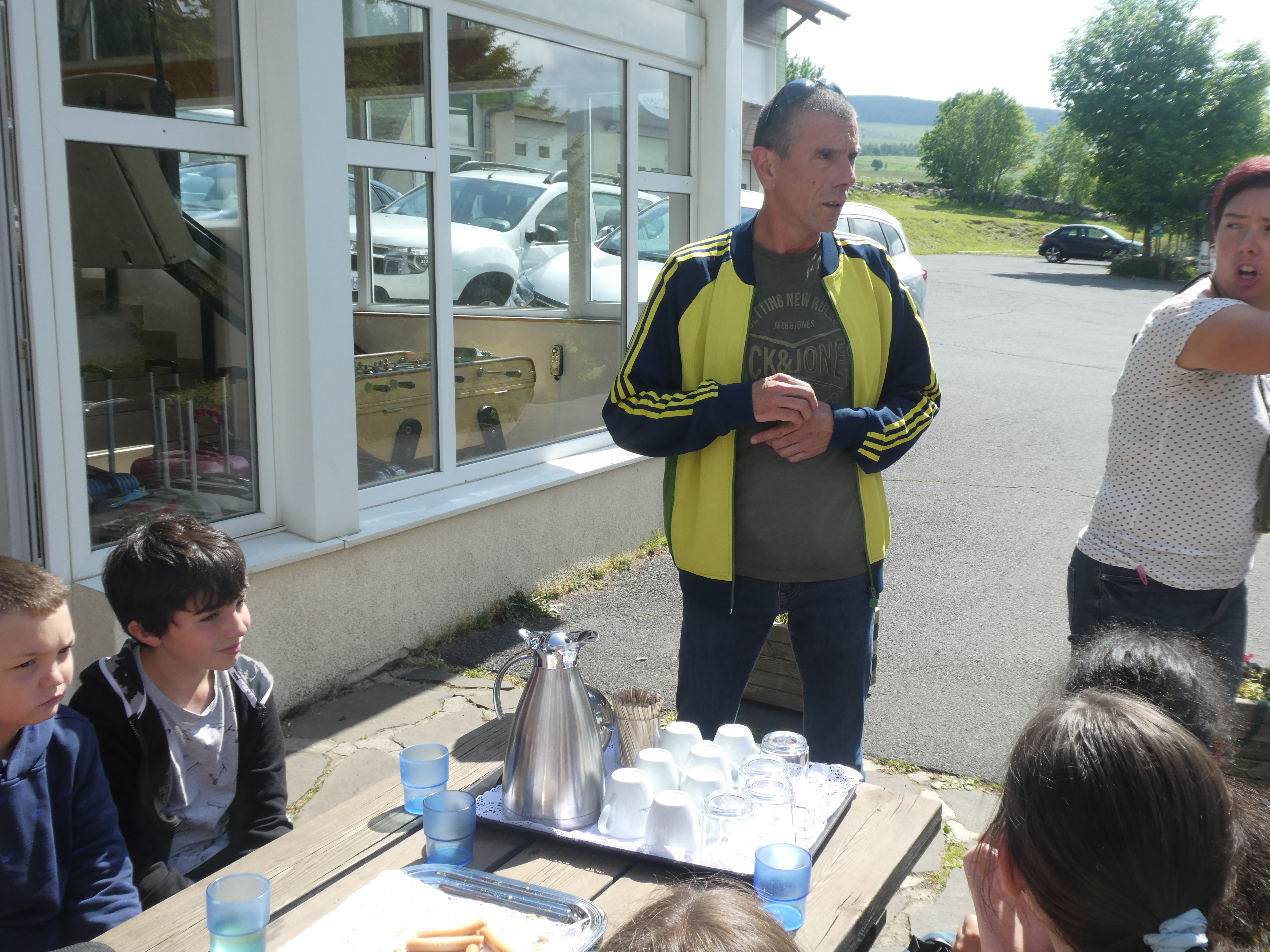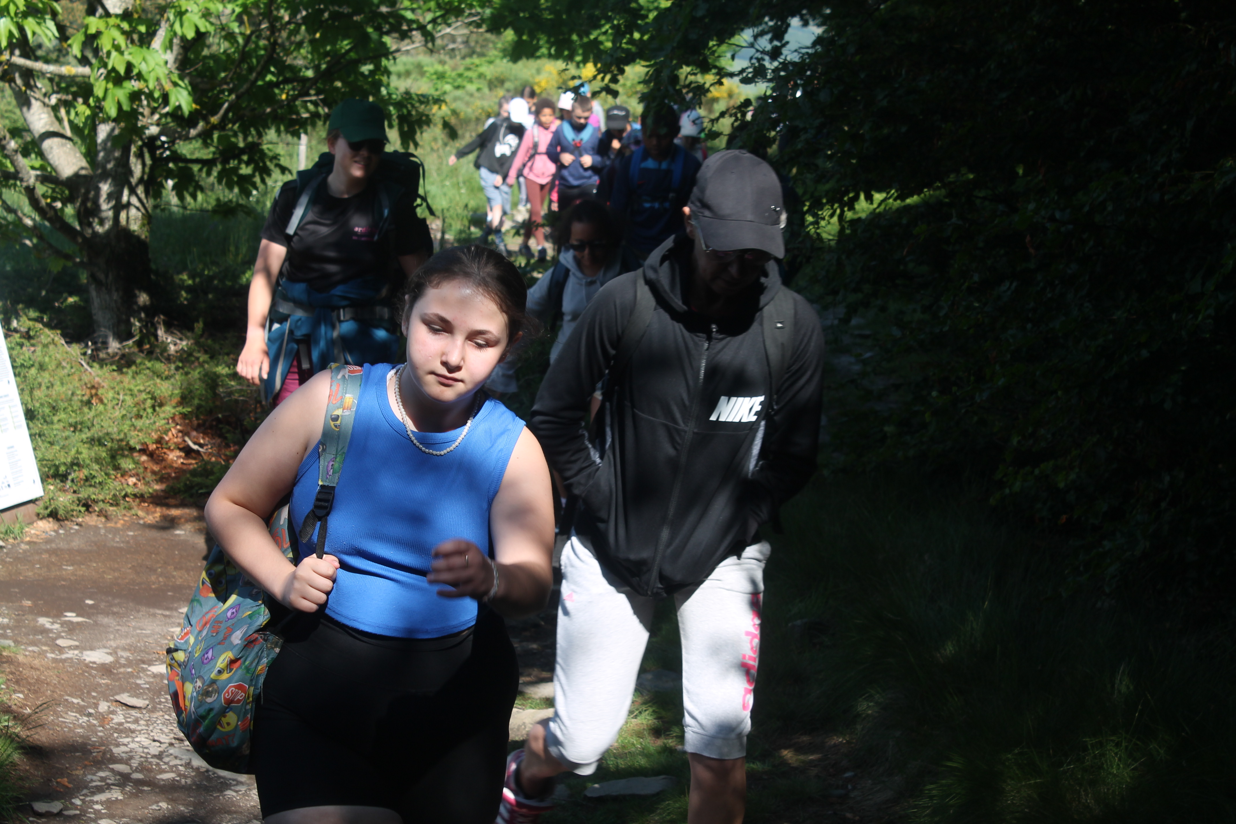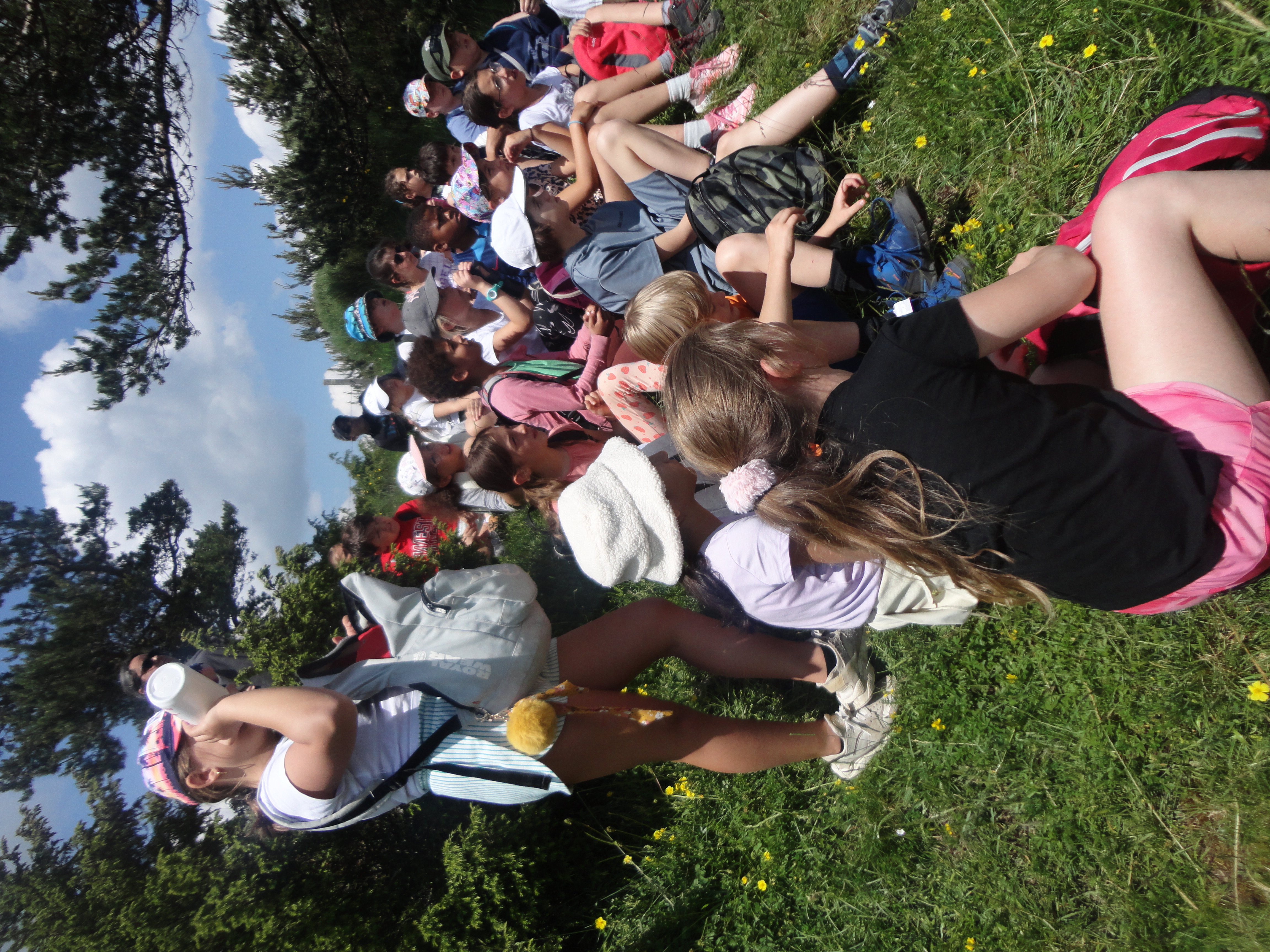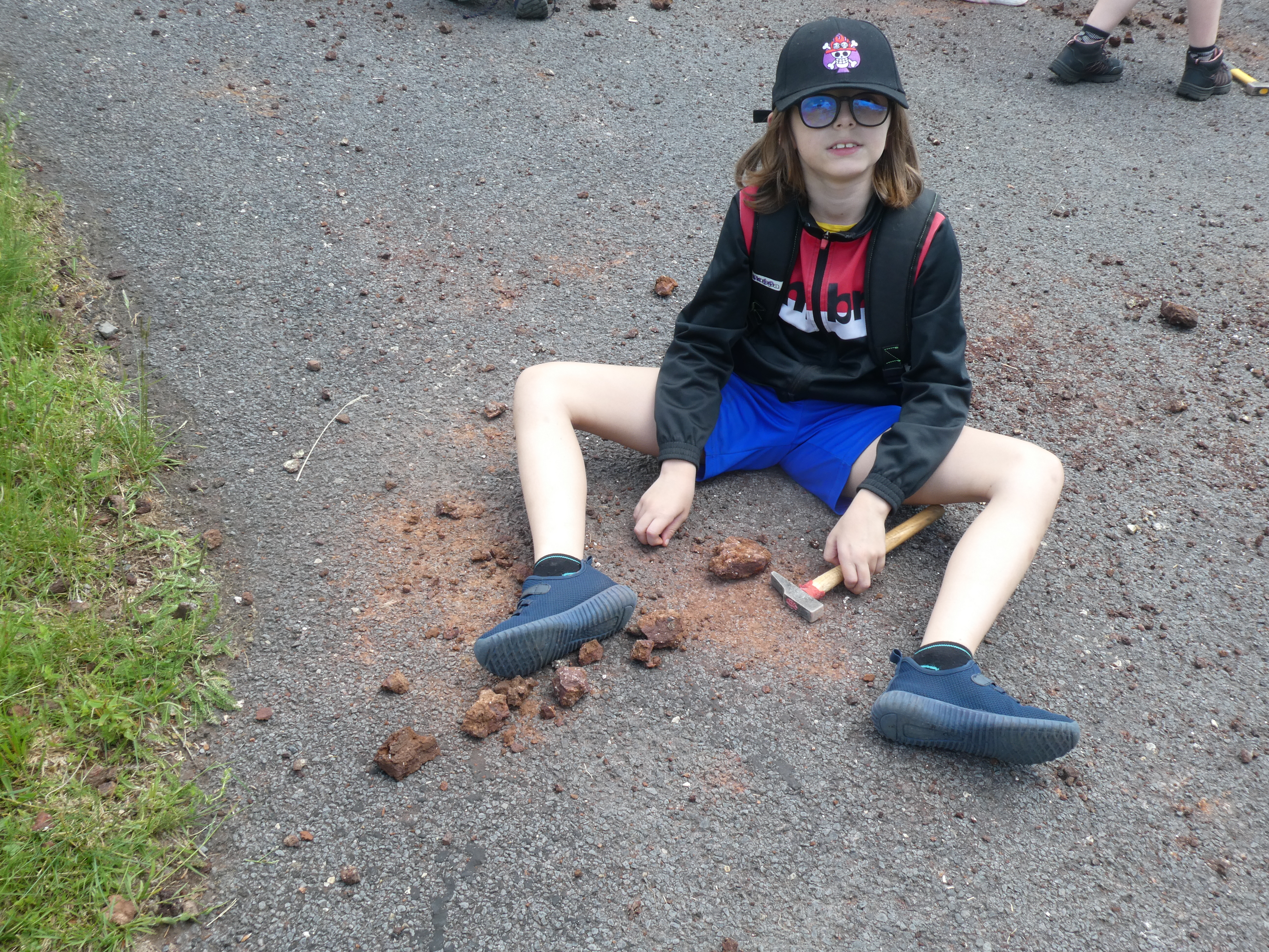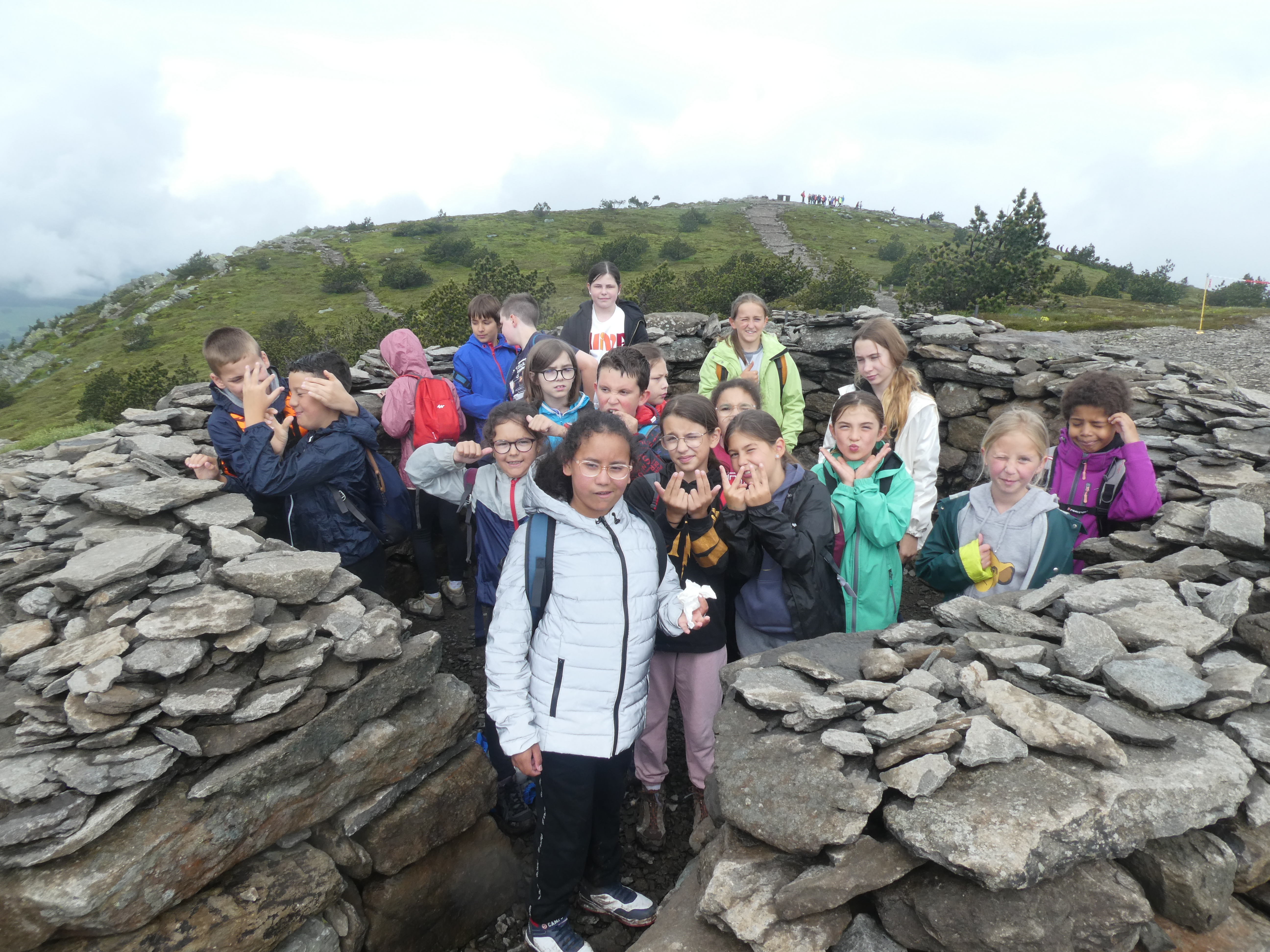 En sortant du bus, nous avons attaqué à gravir le Mont Gerbier de Jonc. En montant, nous nous sommes arrêtés quelques fois pour regarder le paysage puis, une fois arrivés au sommet, Hervé notre guide, nous a parlé du type de ce volcan et de ce qui l'entoure. A la fin, nous sommes redescendus puis nous avons pique-niqué au pied du volcan. Nous avons repris le bus pour aller au volcan du Cherche Muse où nous avons cassé des pierres (bombes volcaniques), que nous avons ramassées à l'aide d'Hervé et de Marylou une autre guide du chalet. En reprenant le bus, nous avons pris la direction du Lac d'Issarlés où nous avons parlé du volcan qu'il y avait dessous avec les deux guides. Nous avons goutté puis nous avons joué sur le sable. Nous avons repris le bus en direction du chalet où nous avons pris une douche, le soir nous avons mangé : une soupe de légumes, une poêlée forestière, de la pizza et une mousse au chocolat.