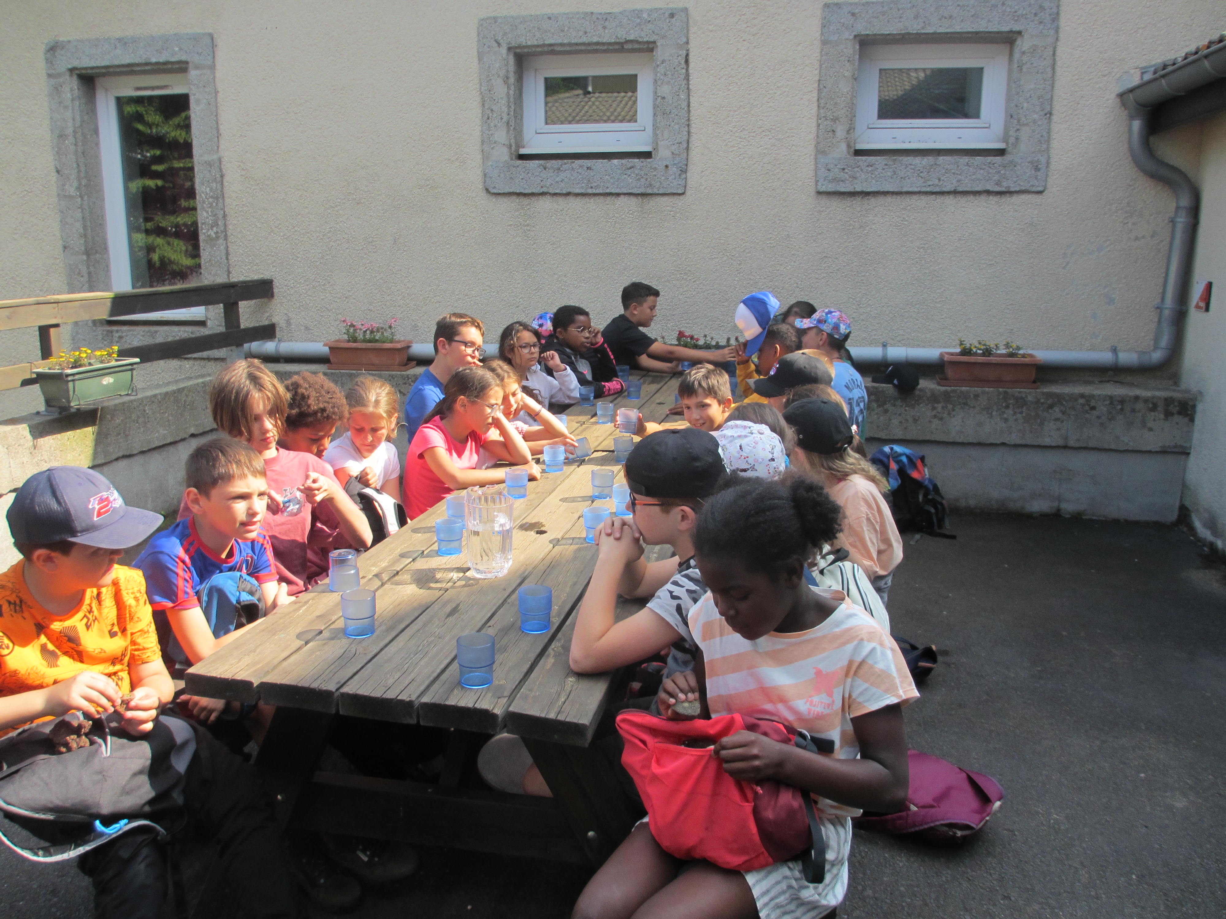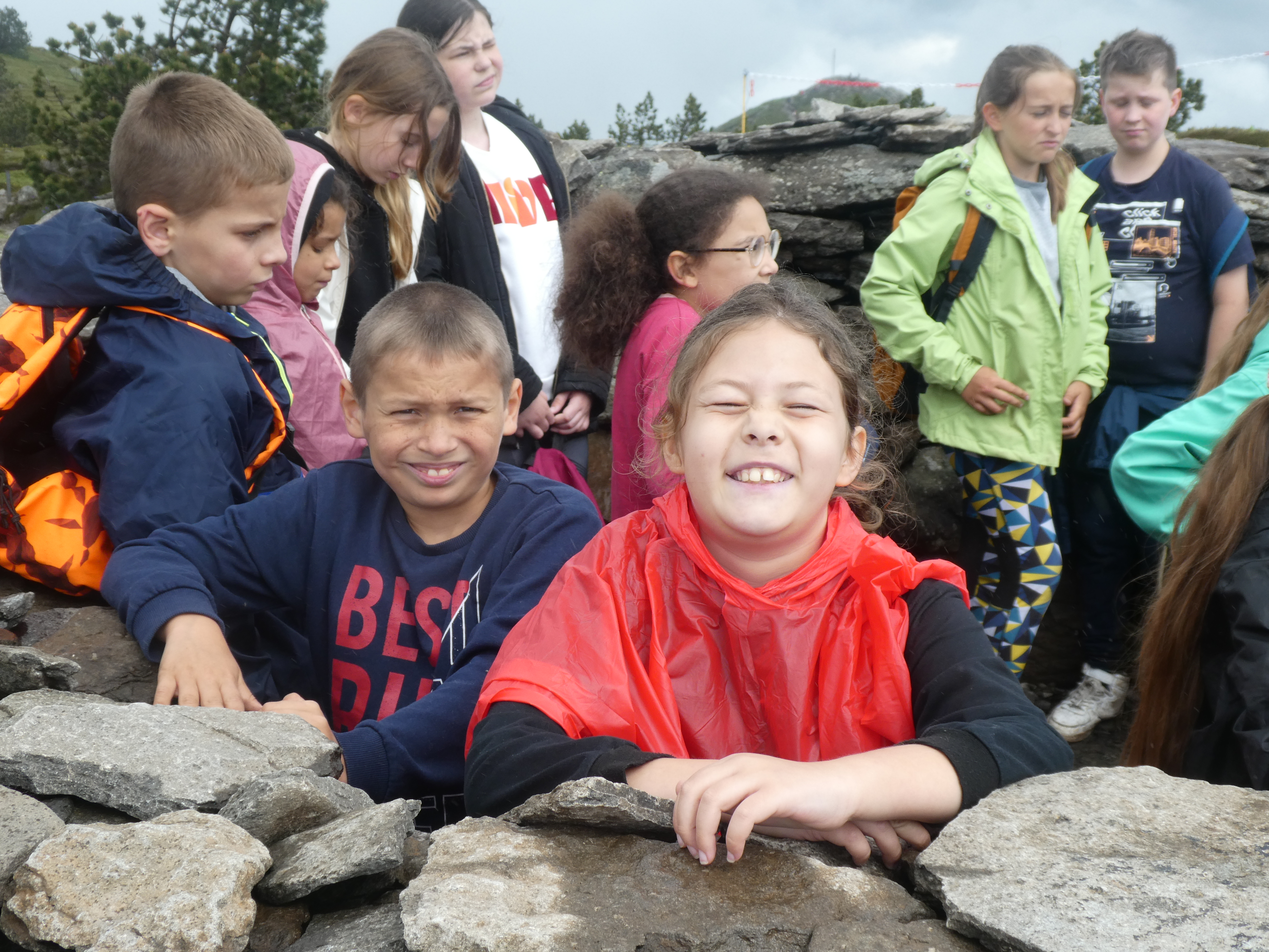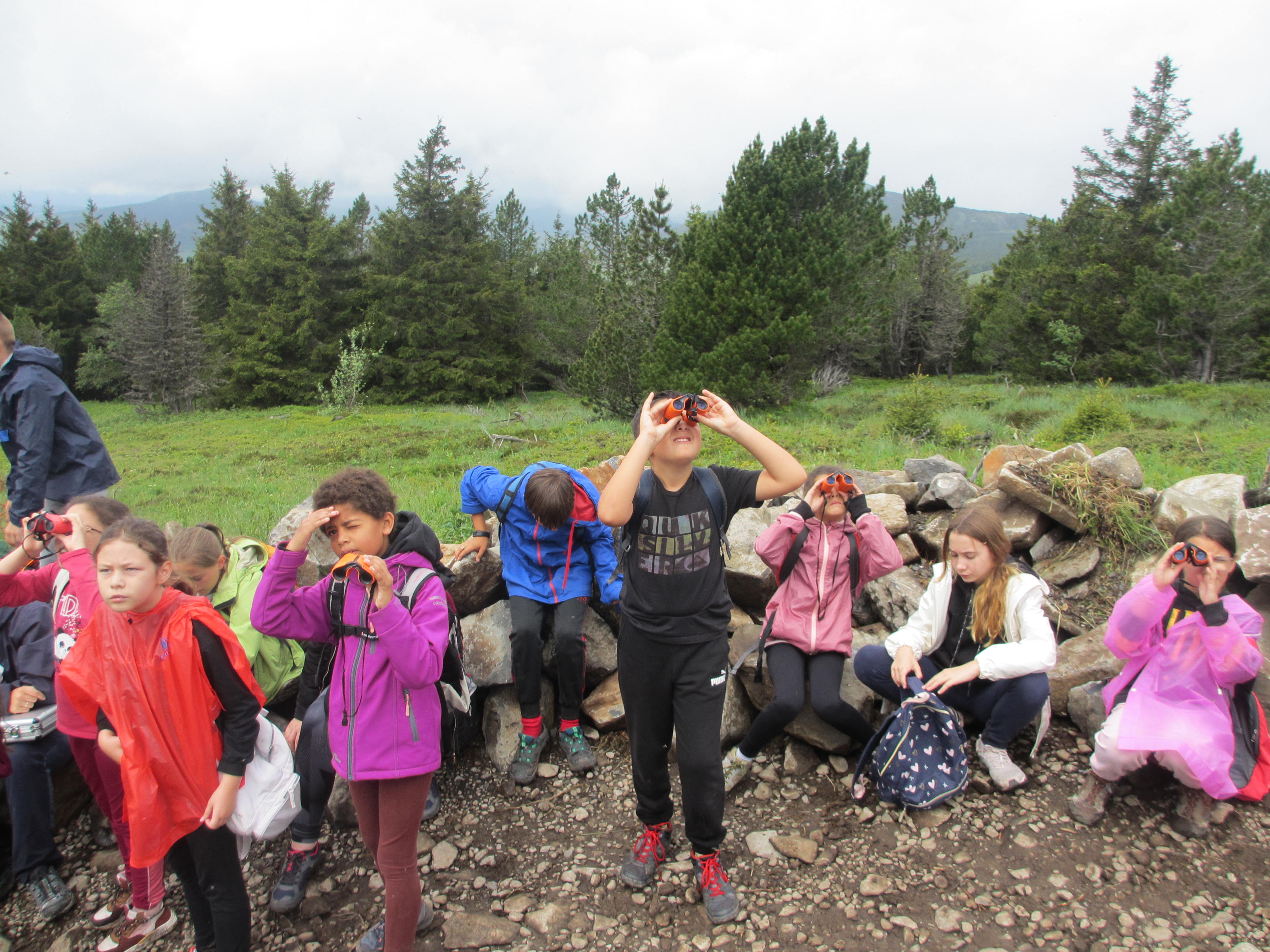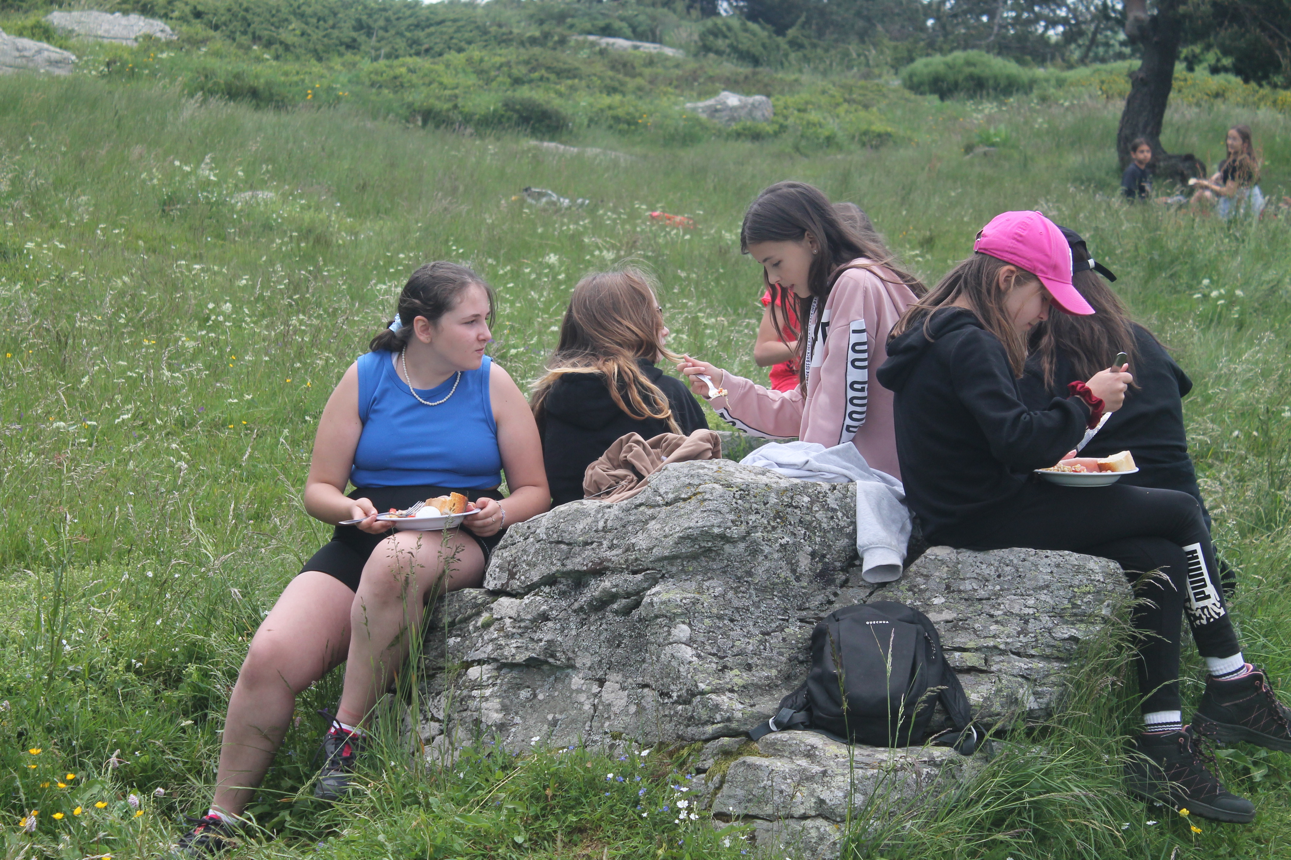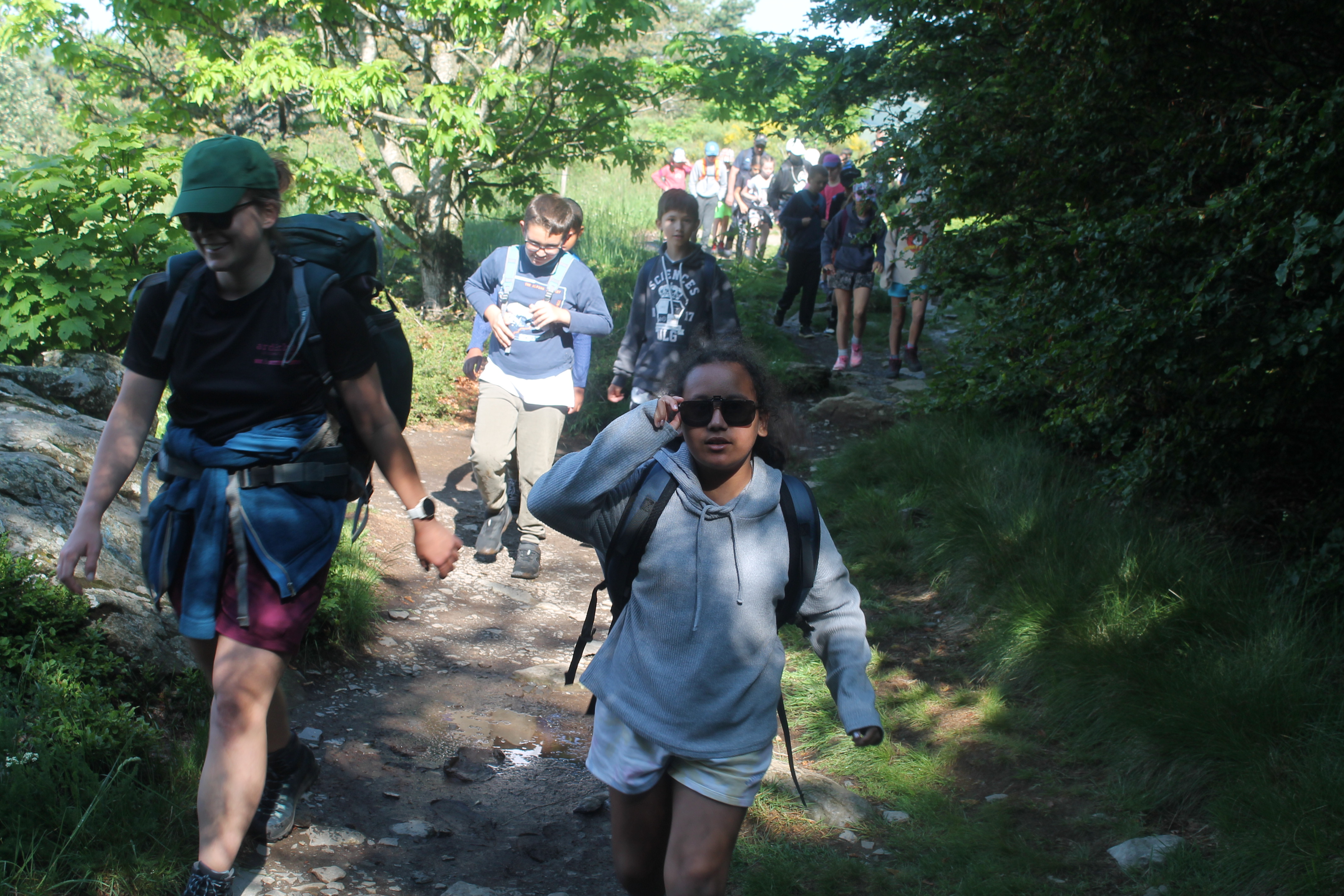 En sortant du bus, nous avons attaqué à gravir le Mont Gerbier de Jonc. En montant, nous nous sommes arrêtés quelques fois pour regarder le paysage puis, une fois arrivés au sommet, Hervé notre guide, nous a parlé du type de ce volcan et de ce qui l'entoure. A la fin, nous sommes redescendus puis nous avons pique-niqué au pied du volcan. Nous avons repris le bus pour aller au volcan du Cherche Muse où nous avons cassé des pierres (bombes volcaniques), que nous avons ramassées à l'aide d'Hervé et de Marylou une autre guide du chalet. En reprenant le bus, nous avons pris la direction du Lac d'Issarlés où nous avons parlé du volcan qu'il y avait dessous avec les deux guides. Nous avons goutté puis nous avons joué sur le sable. Nous avons repris le bus en direction du chalet où nous avons pris une douche, le soir nous avons mangé : une soupe de légumes, une poêlée forestière, de la pizza et une mousse au chocolat.