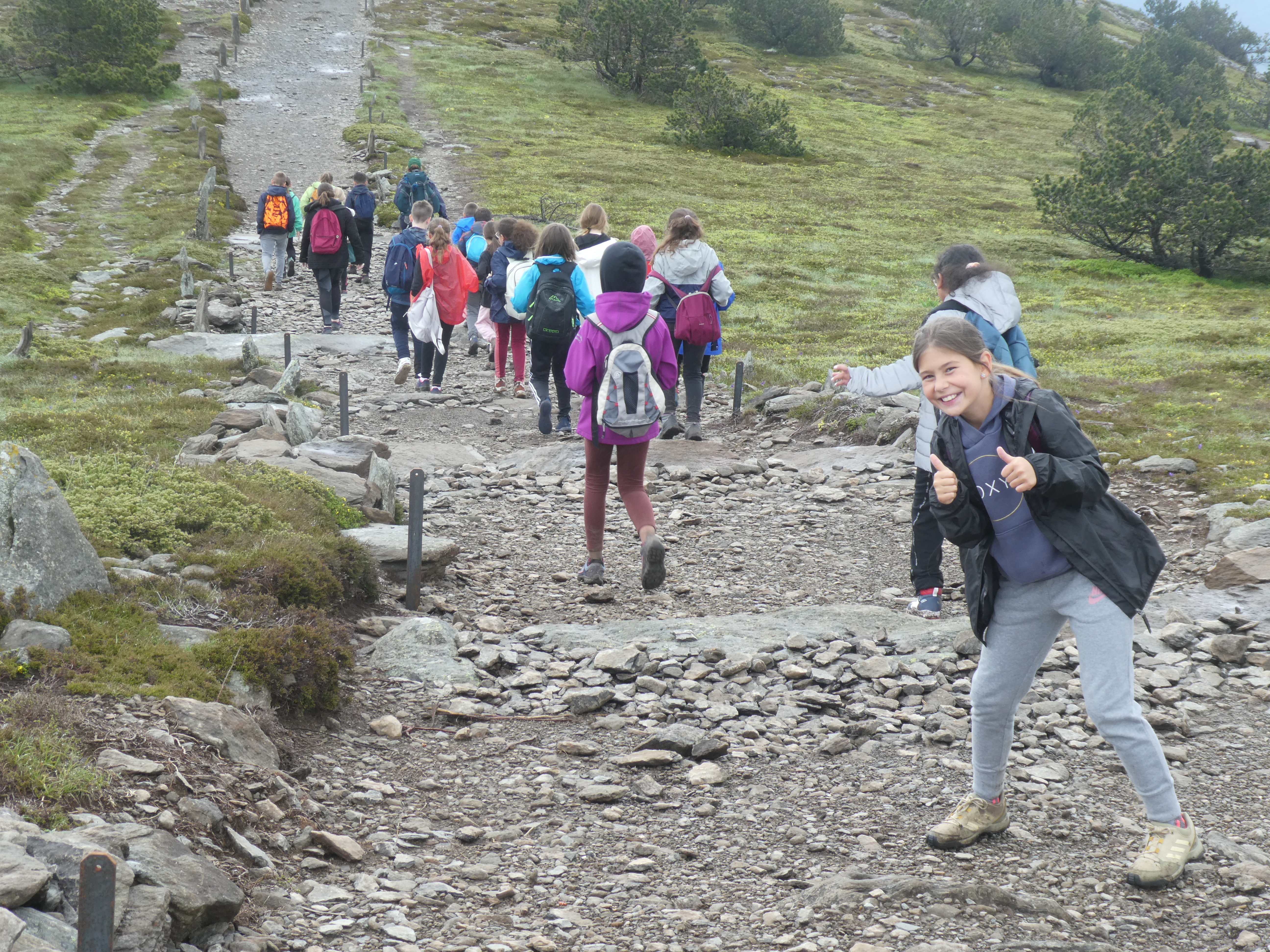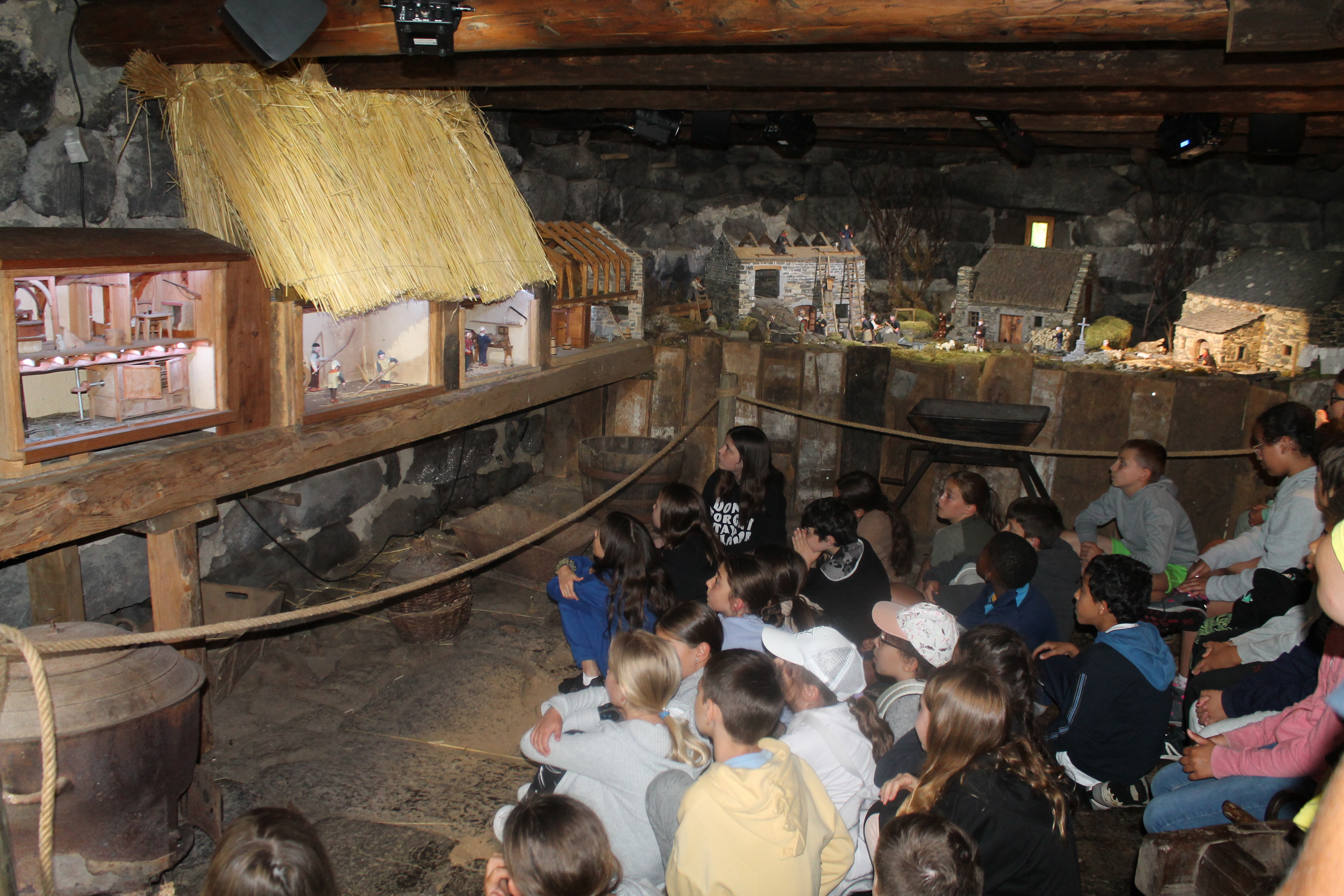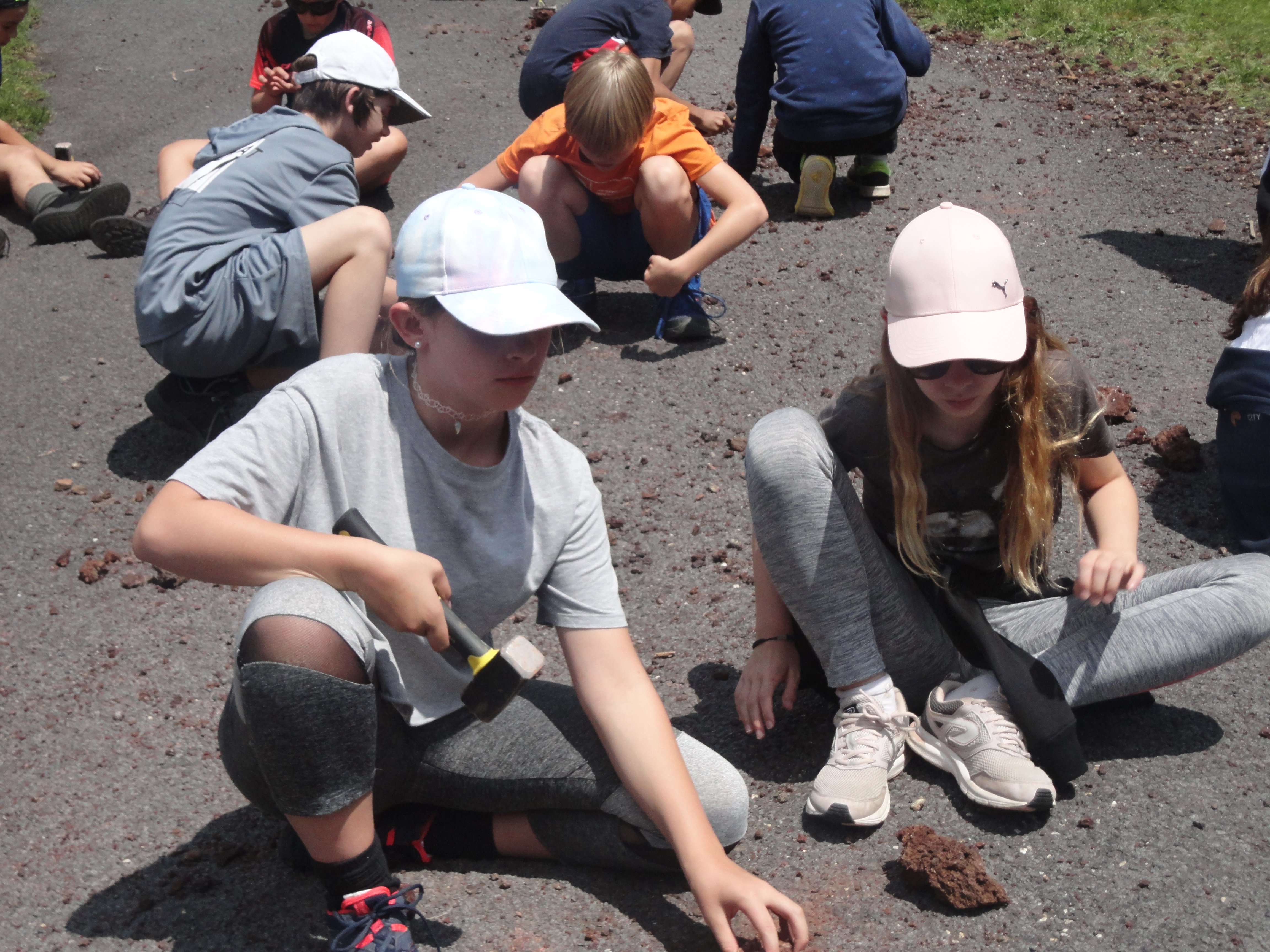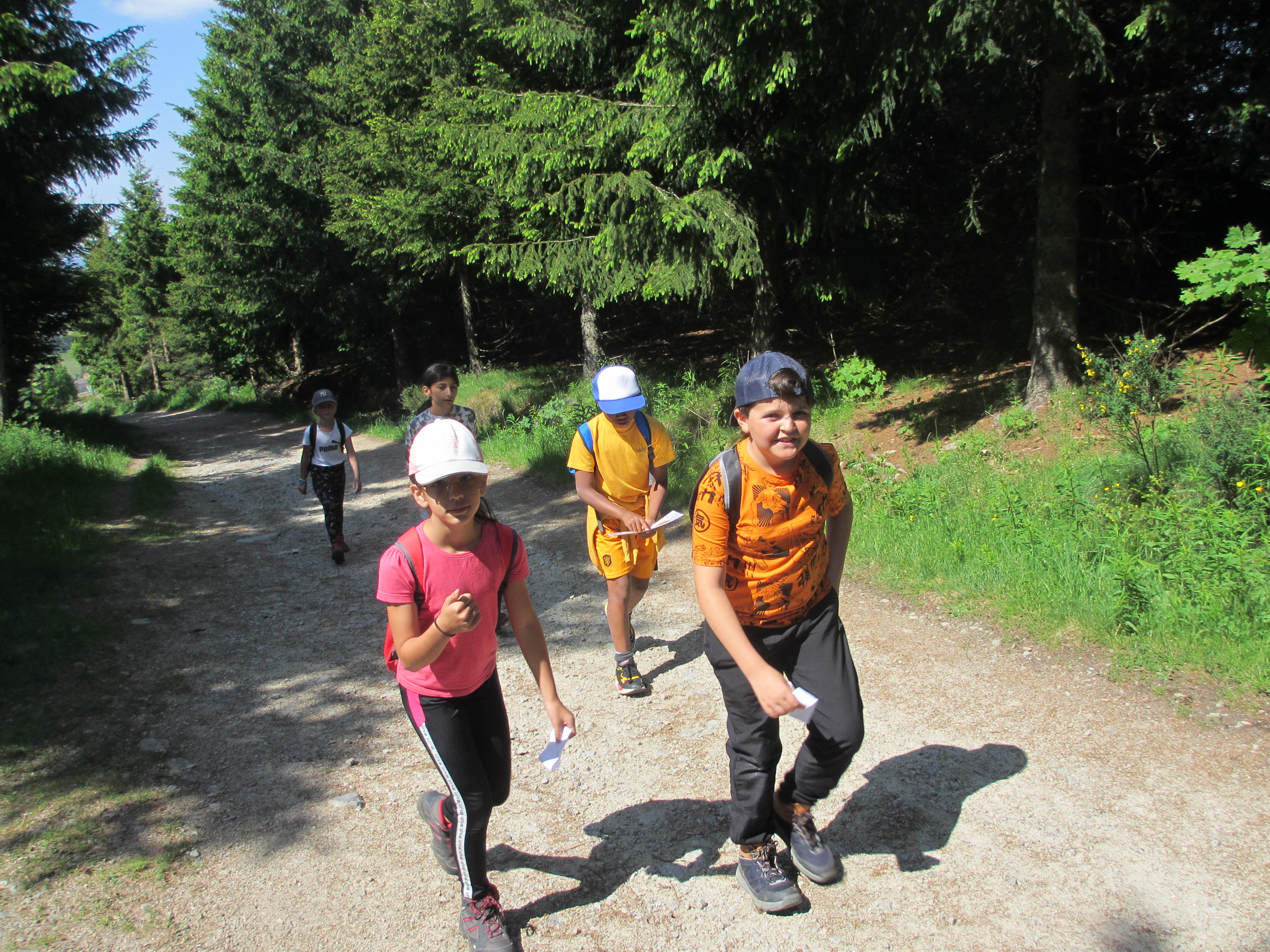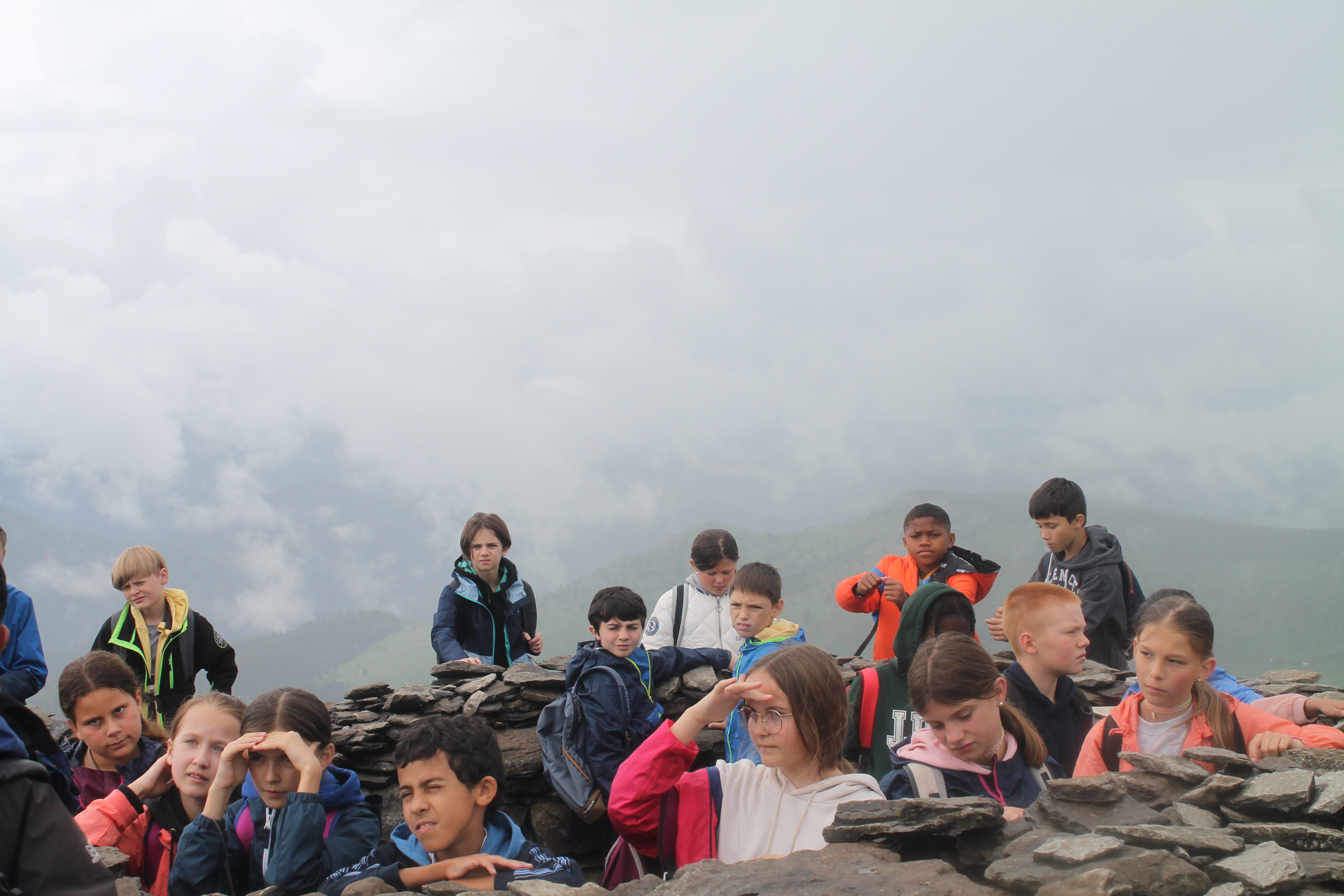 En sortant du bus, nous avons attaqué à gravir le Mont Gerbier de Jonc. En montant, nous nous sommes arrêtés quelques fois pour regarder le paysage puis, une fois arrivés au sommet, Hervé notre guide, nous a parlé du type de ce volcan et de ce qui l'entoure. A la fin, nous sommes redescendus puis nous avons pique-niqué au pied du volcan. Nous avons repris le bus pour aller au volcan du Cherche Muse où nous avons cassé des pierres (bombes volcaniques), que nous avons ramassées à l'aide d'Hervé et de Marylou une autre guide du chalet. En reprenant le bus, nous avons pris la direction du Lac d'Issarlés où nous avons parlé du volcan qu'il y avait dessous avec les deux guides. Nous avons goutté puis nous avons joué sur le sable. Nous avons repris le bus en direction du chalet où nous avons pris une douche, le soir nous avons mangé : une soupe de légumes, une poêlée forestière, de la pizza et une mousse au chocolat.