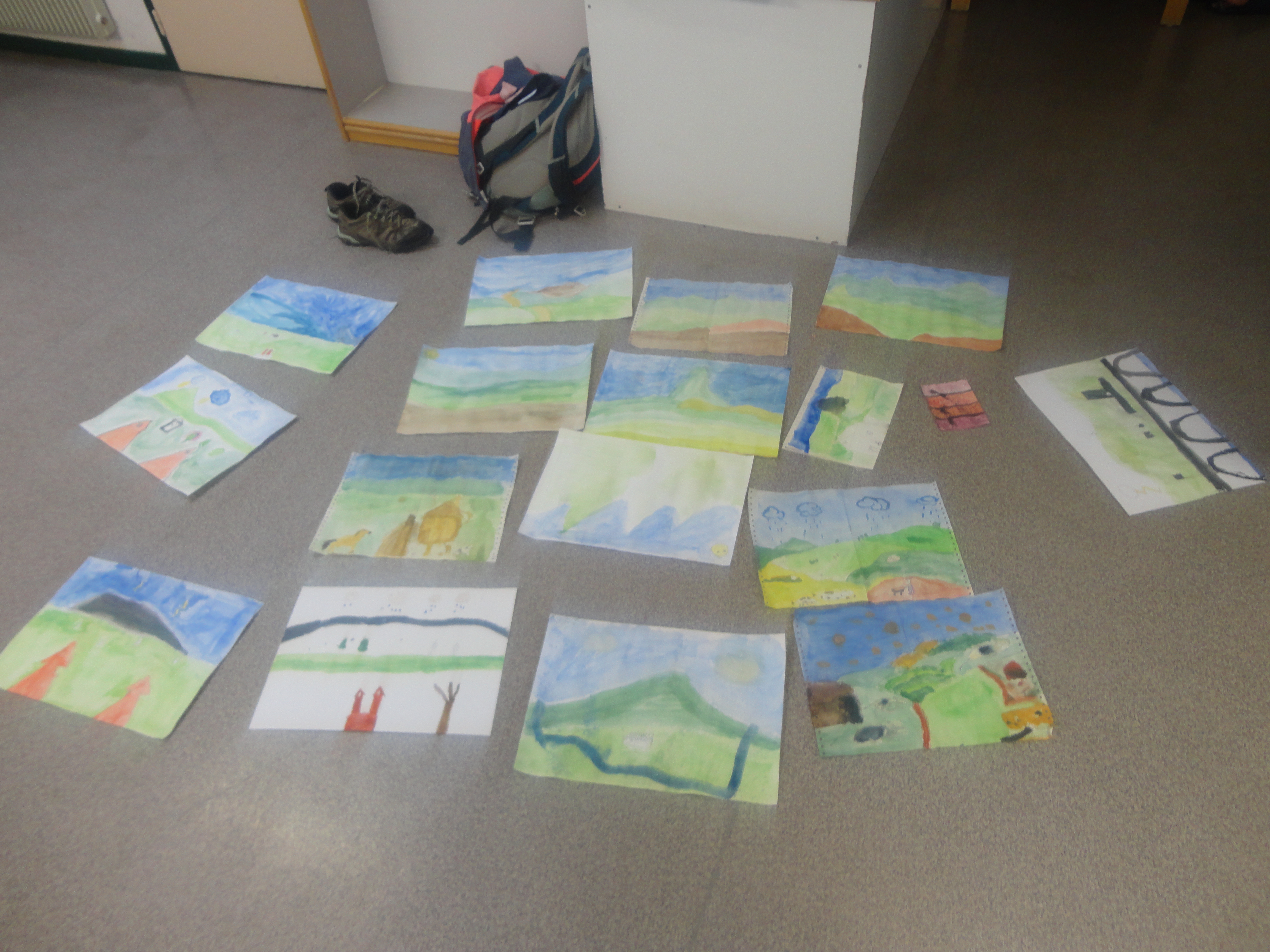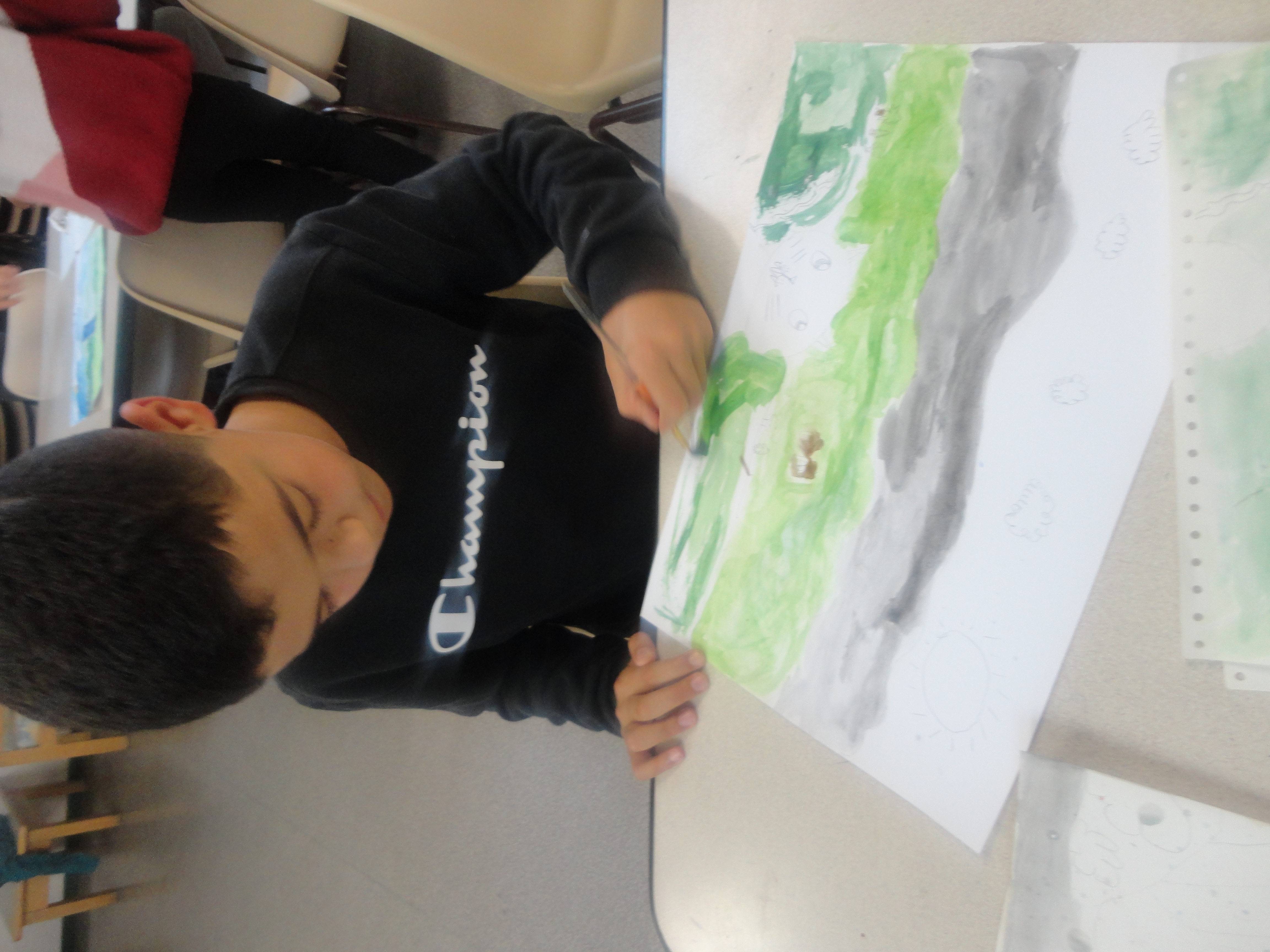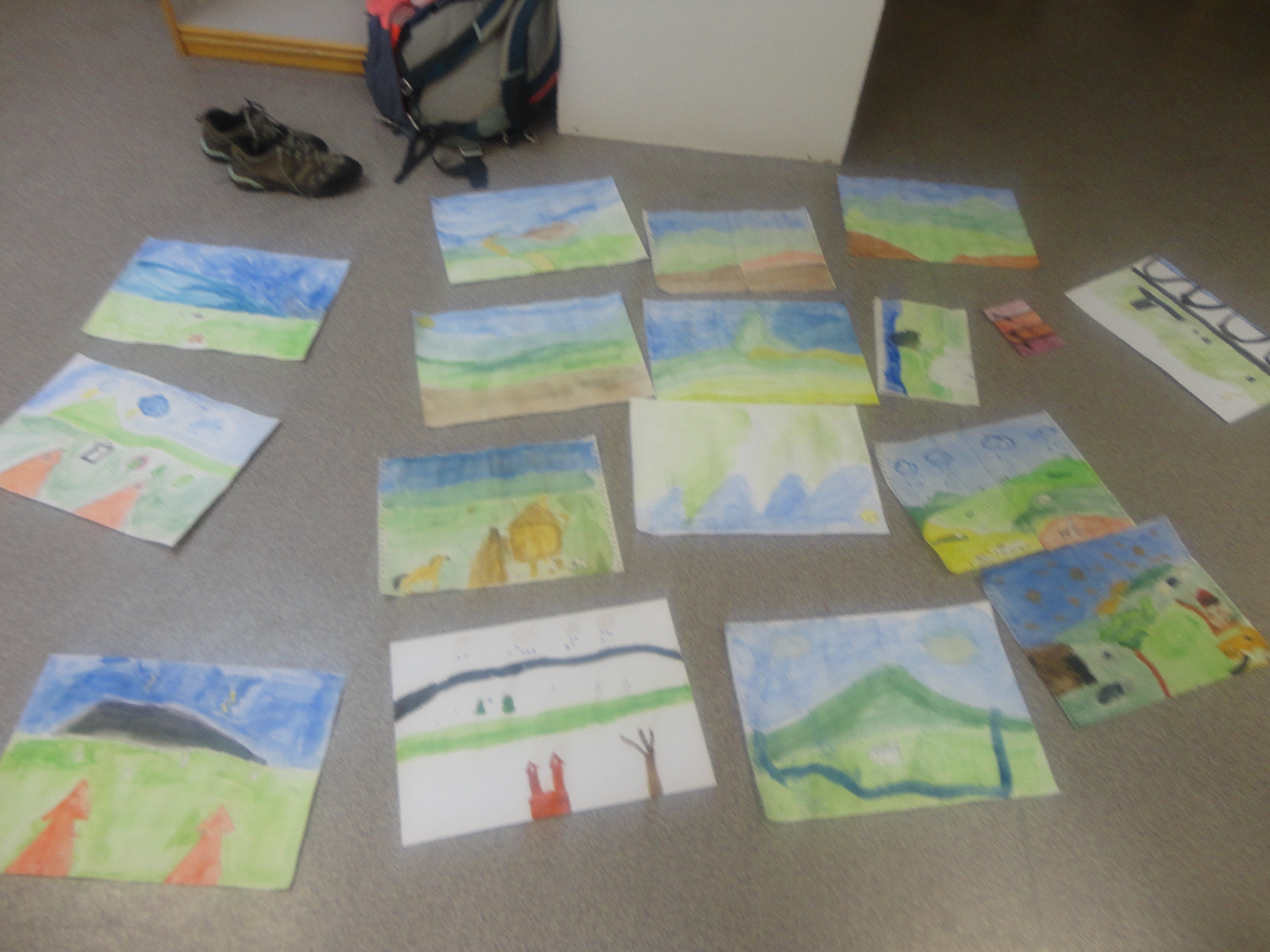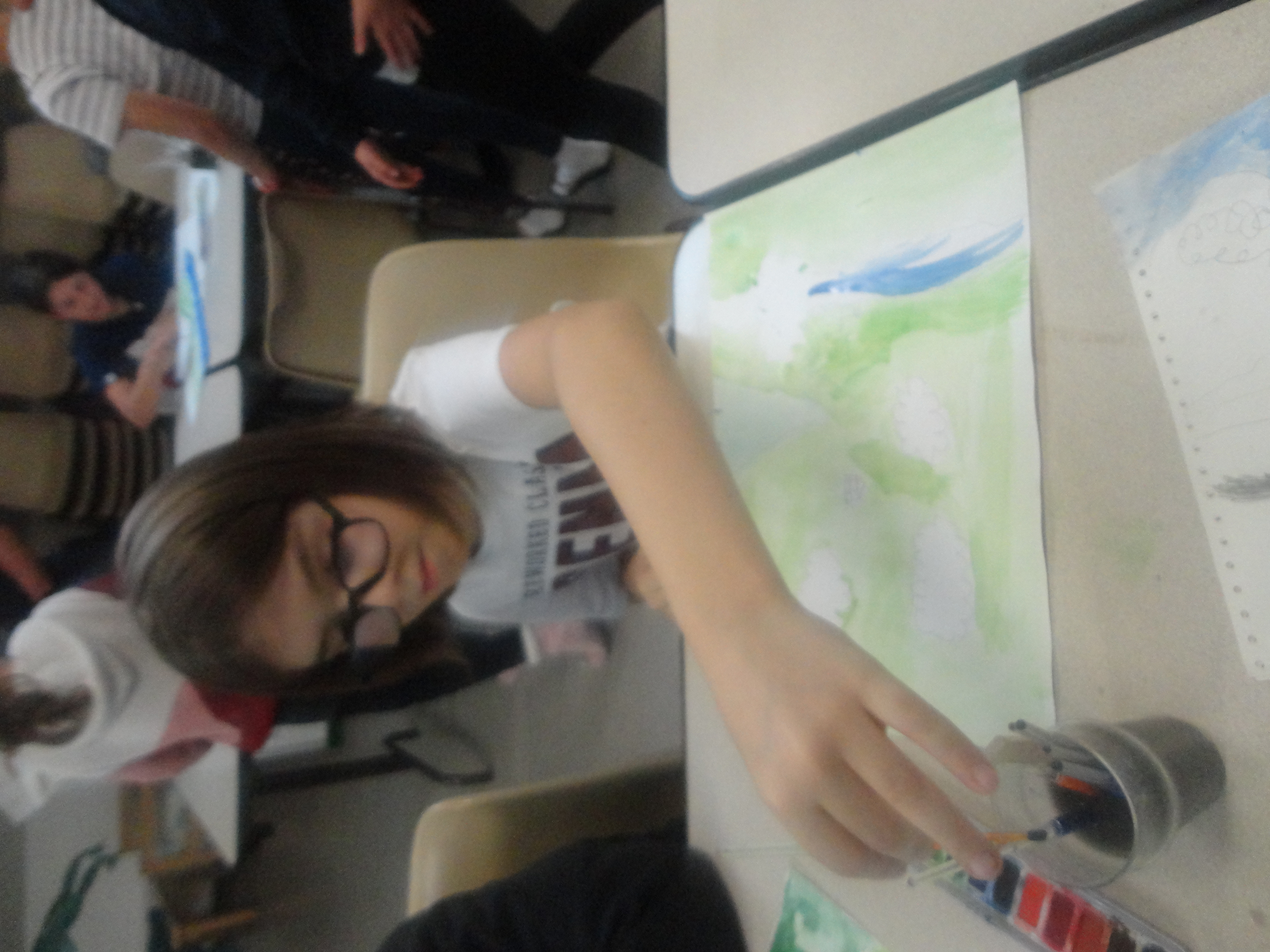 Cette après midi au moment des orages nous avons peint avec de l'aquarelle ( pierre, craie ) , nous avons représenté des lieux qui se trouvent aux Estables.