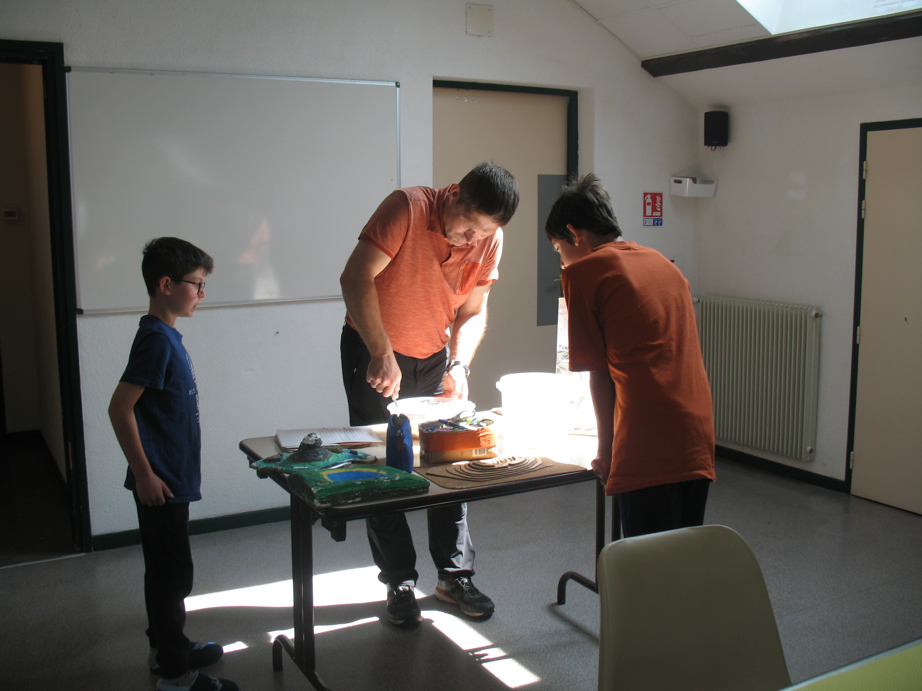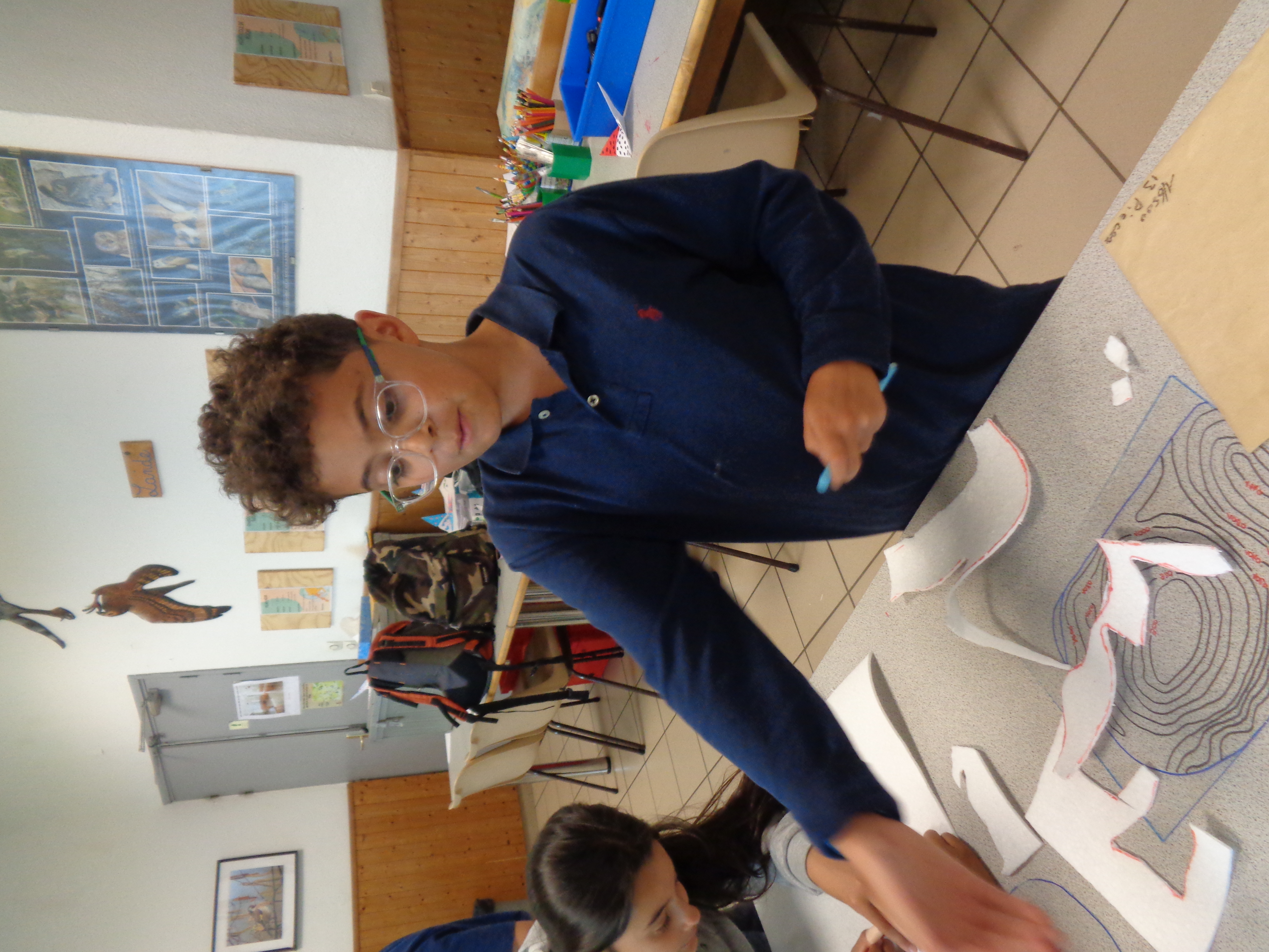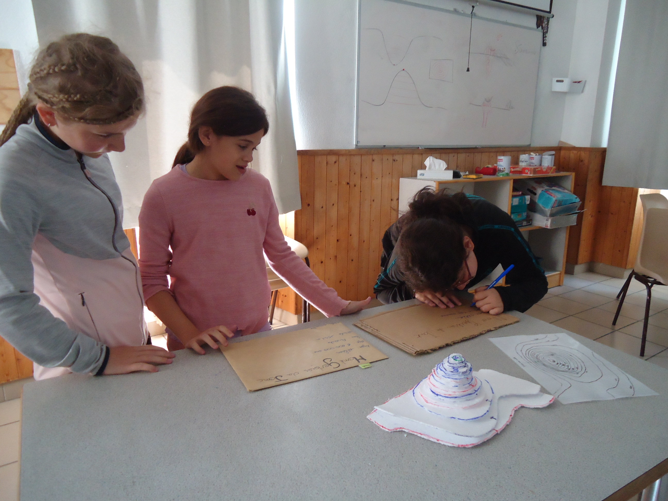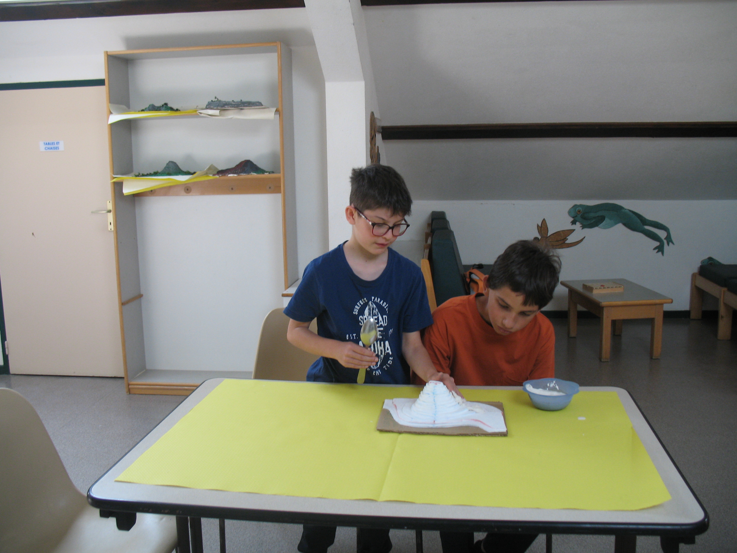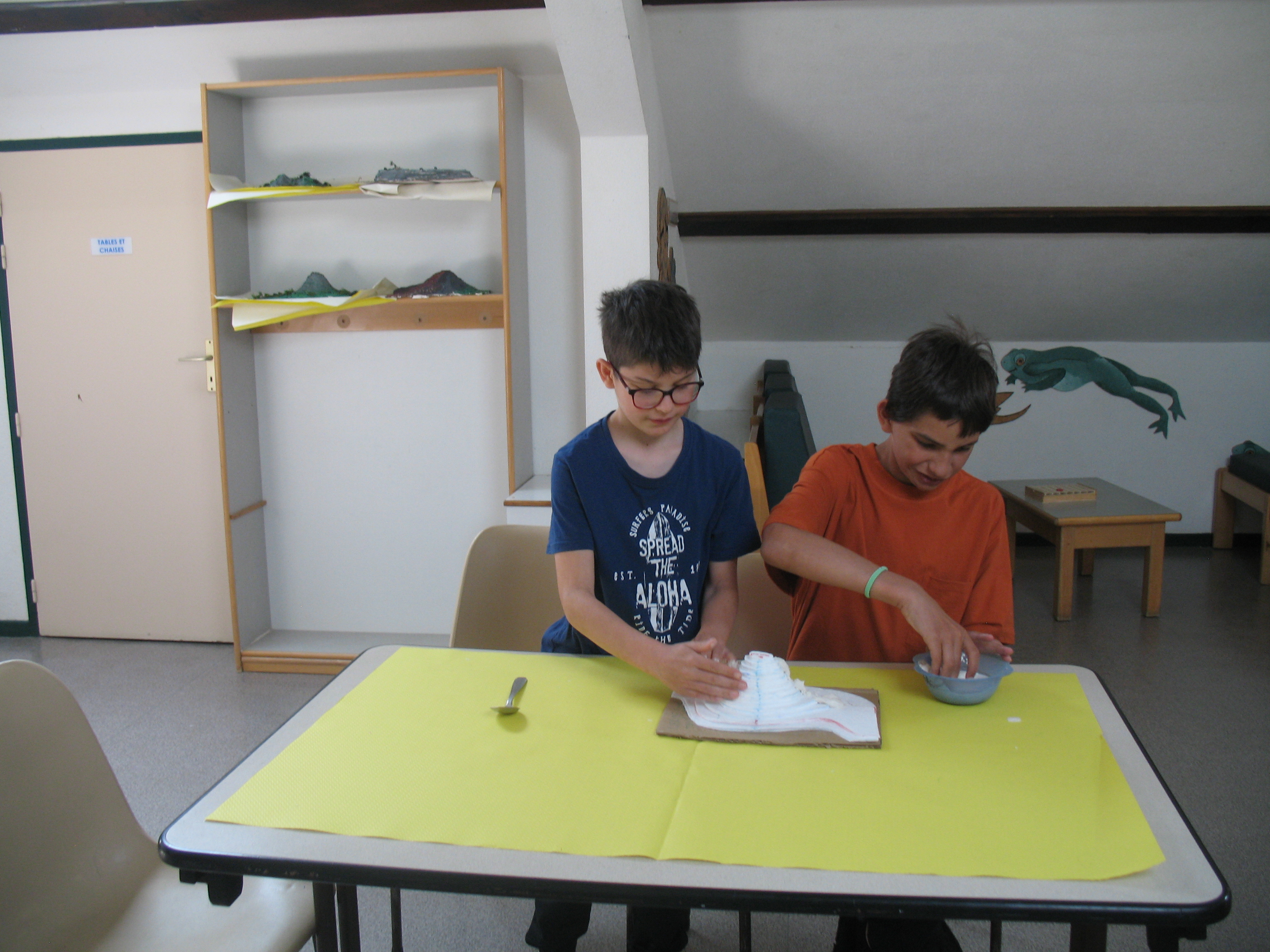 Aujourd’hui nous avons fait des maquettes sur les volcans. Nous, on a fait le Mont mézenc. On a sorti des bouts de plastique de l’enveloppe. Stan nous a donné du polystyrène ensuite nous avons découpé. Il nous a donné un carton, on a collé les morceaux de polystyrène qui formait le Mont Mézenc. Ensuite il a mis le plâtre et on l’a étalé, on a attendu qu’il sèche.