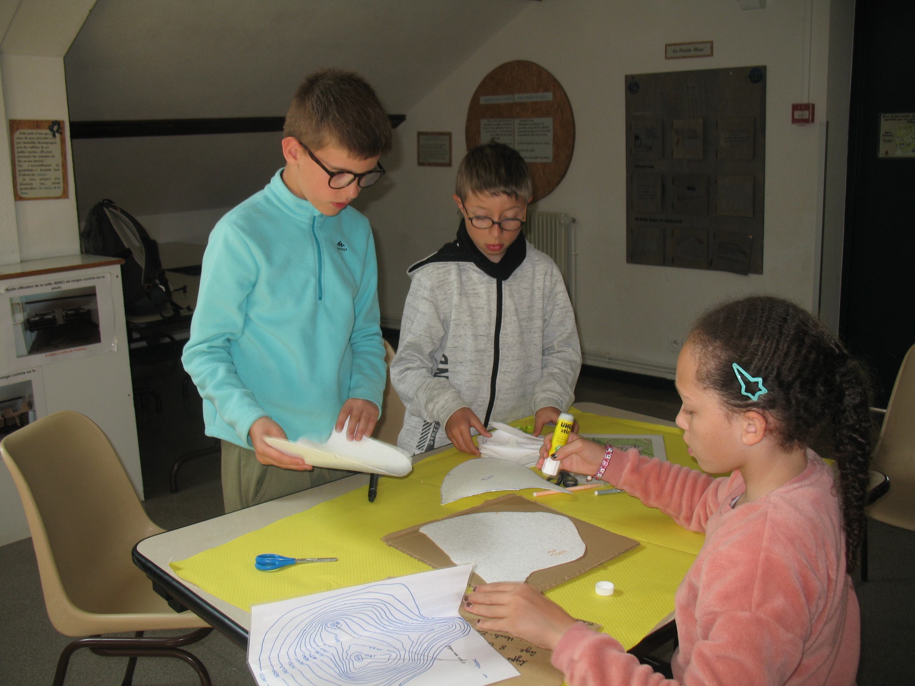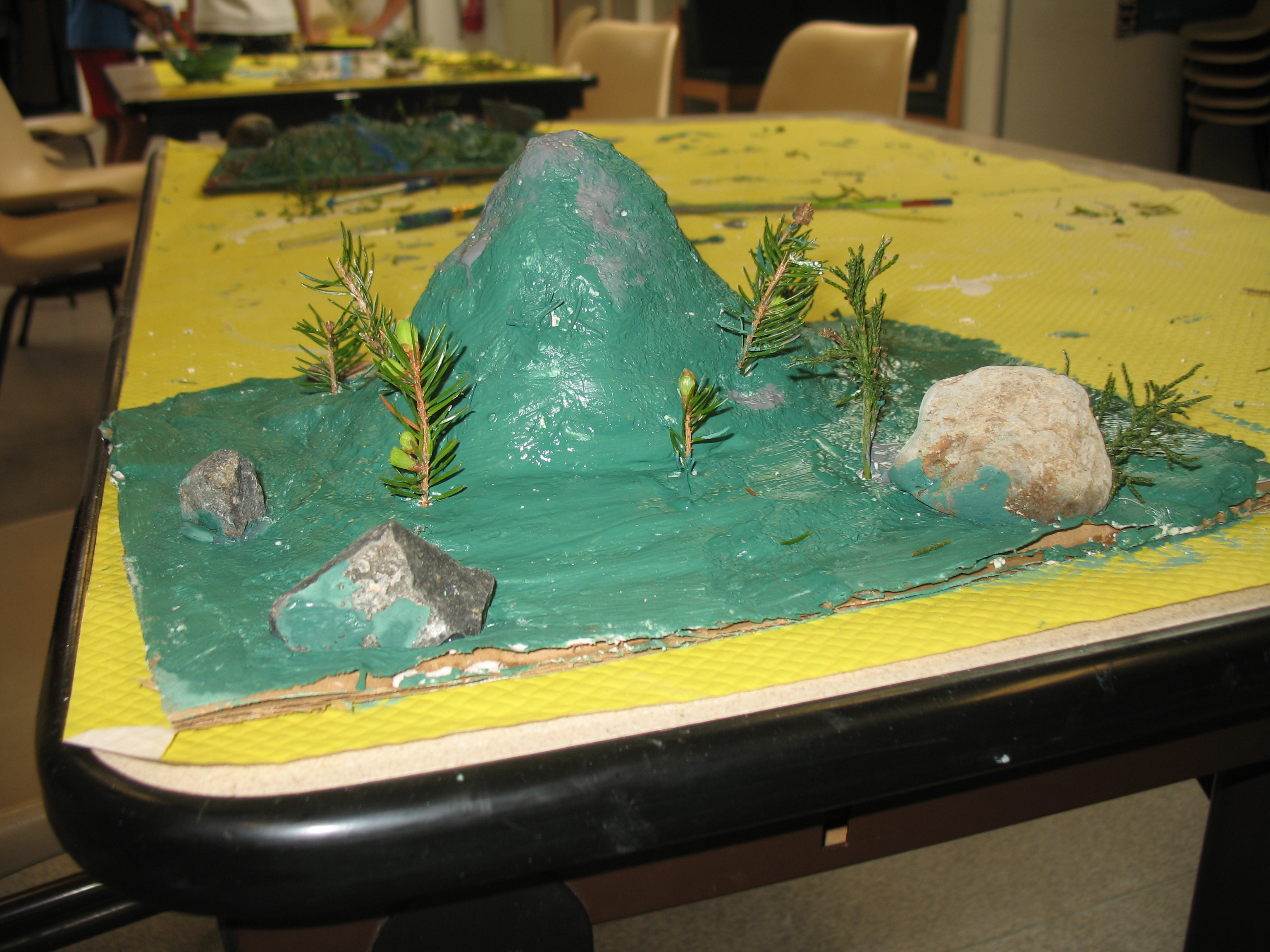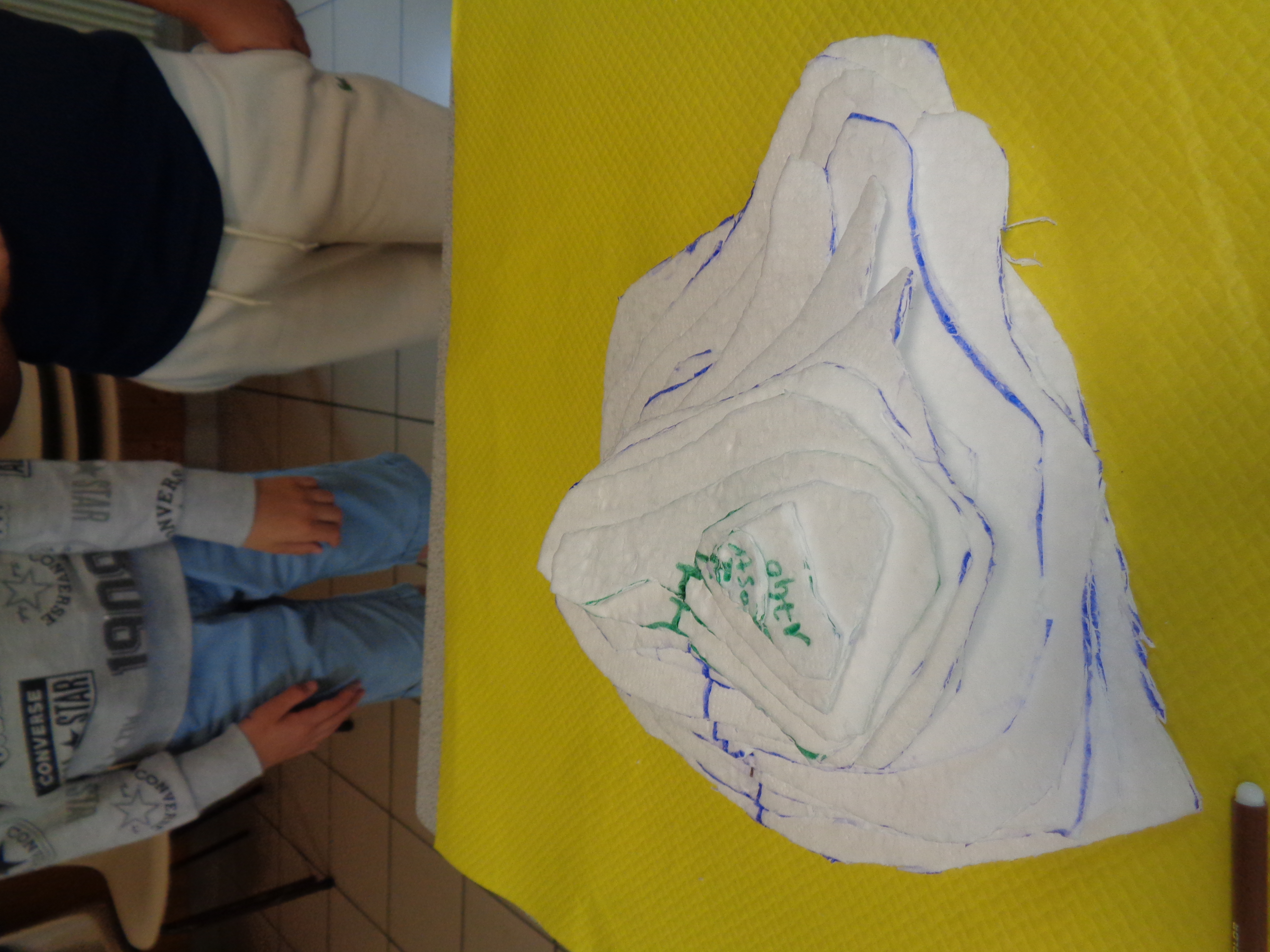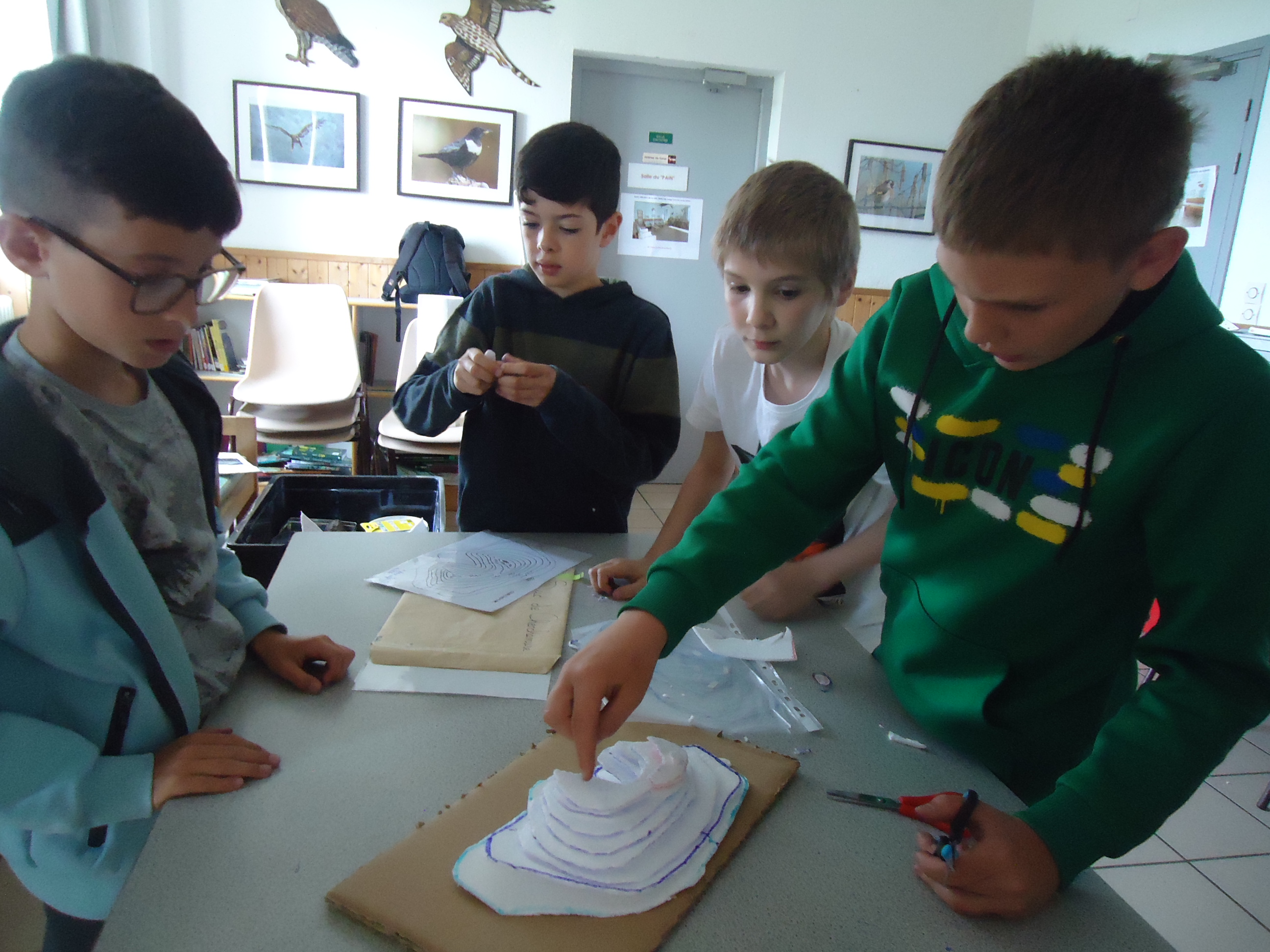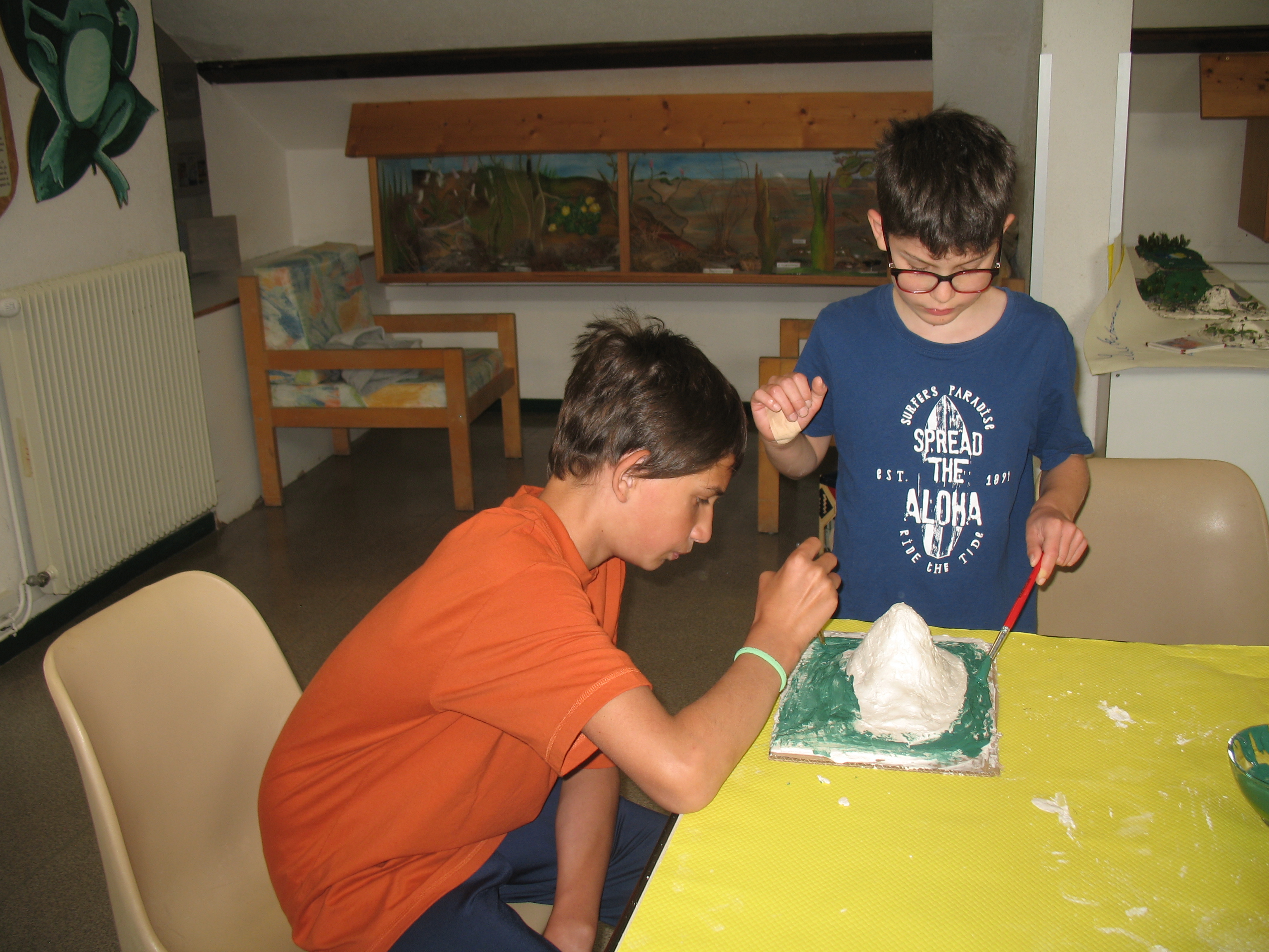 Aujourd’hui nous avons fait des maquettes sur les volcans. Nous, on a fait le Mont mézenc. On a sorti des bouts de plastique de l’enveloppe. Stan nous a donné du polystyrène ensuite nous avons découpé. Il nous a donné un carton, on a collé les morceaux de polystyrène qui formait le Mont Mézenc. Ensuite il a mis le plâtre et on l’a étalé, on a attendu qu’il sèche.