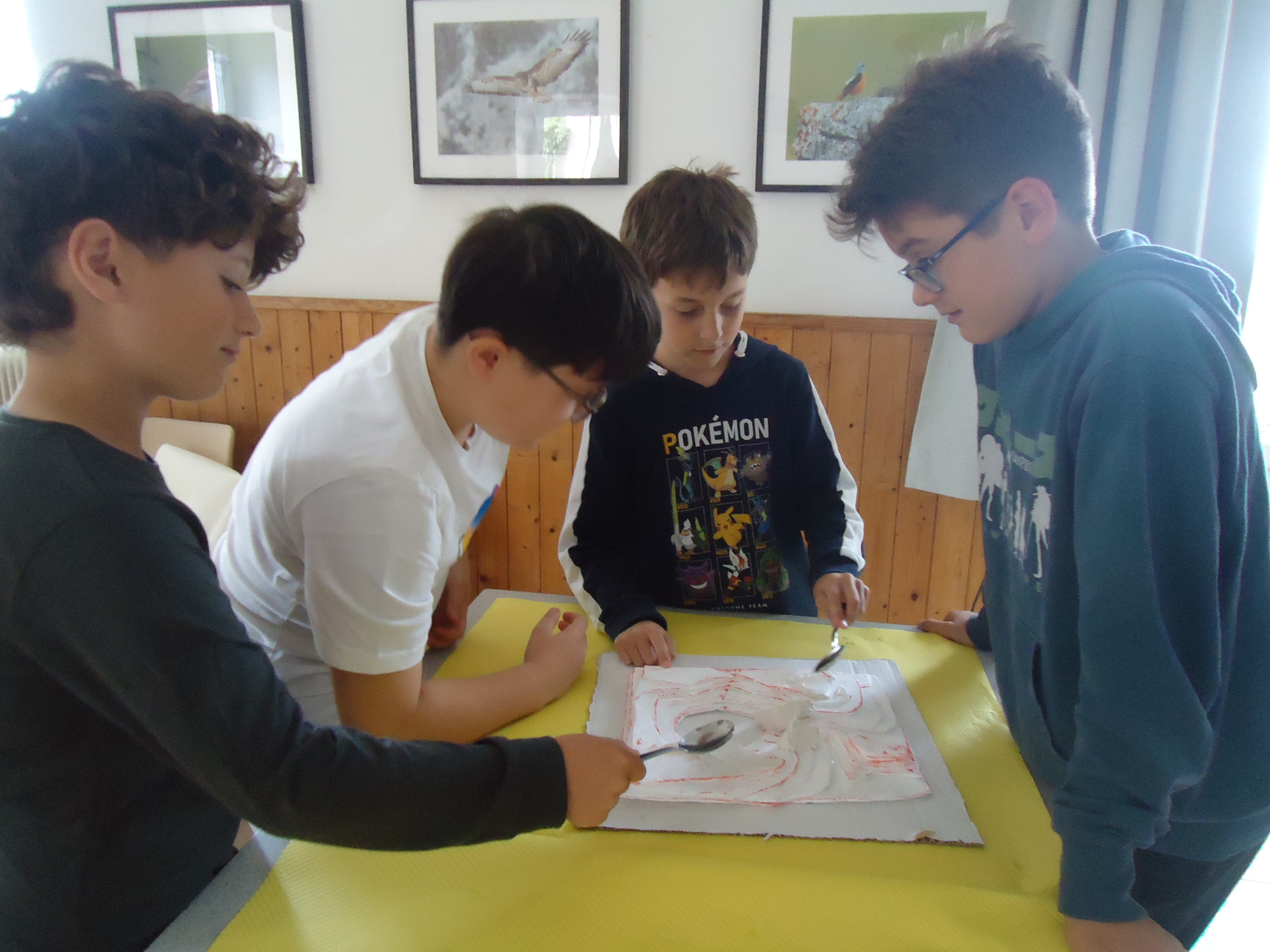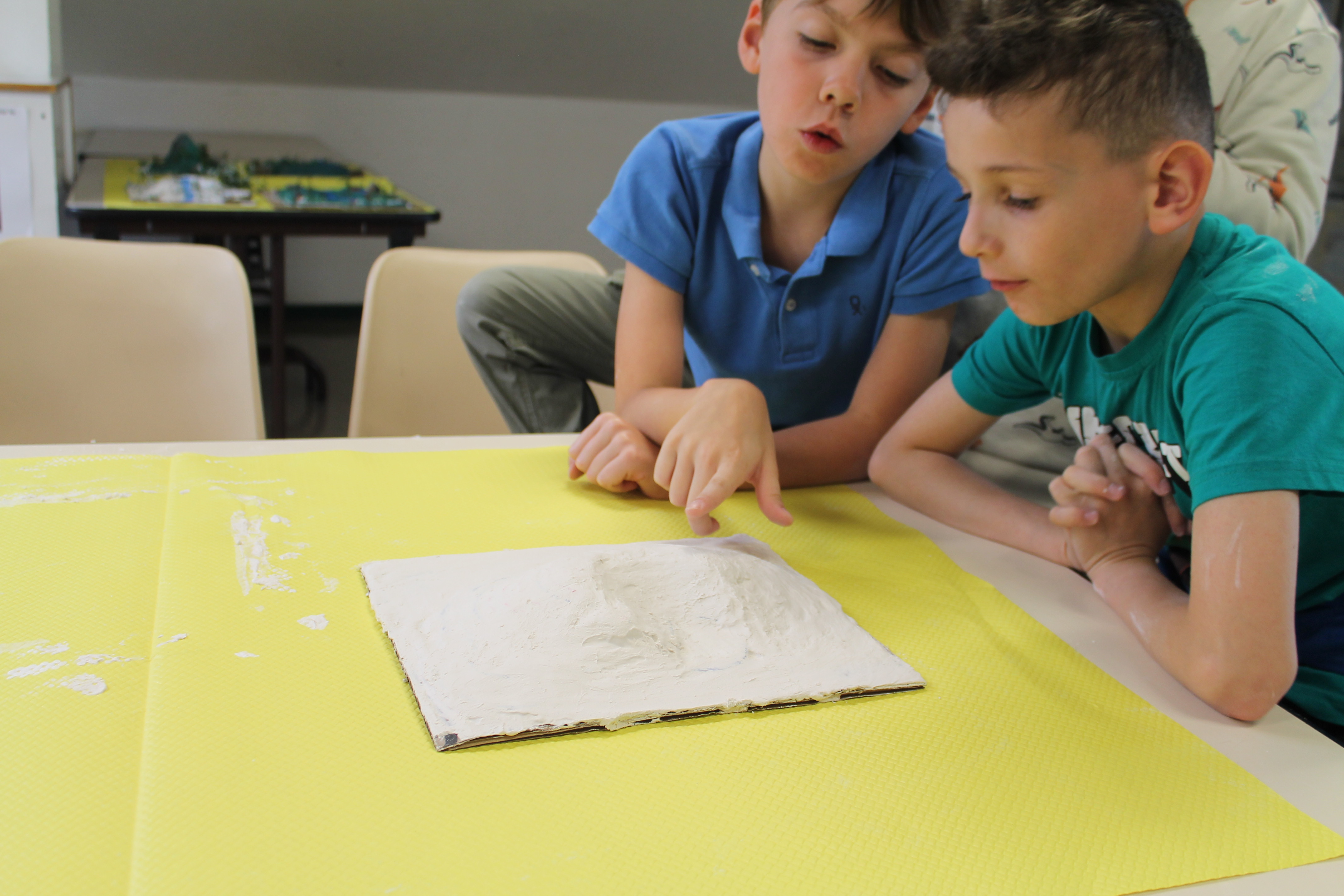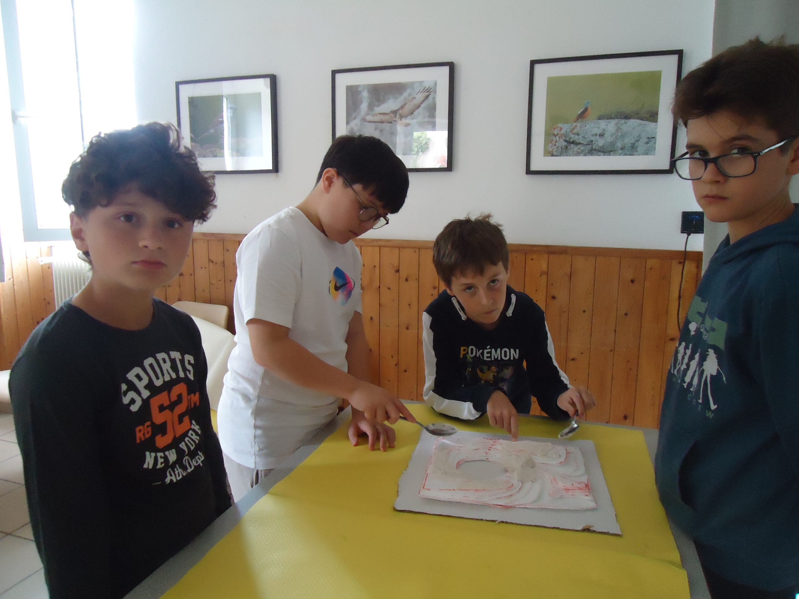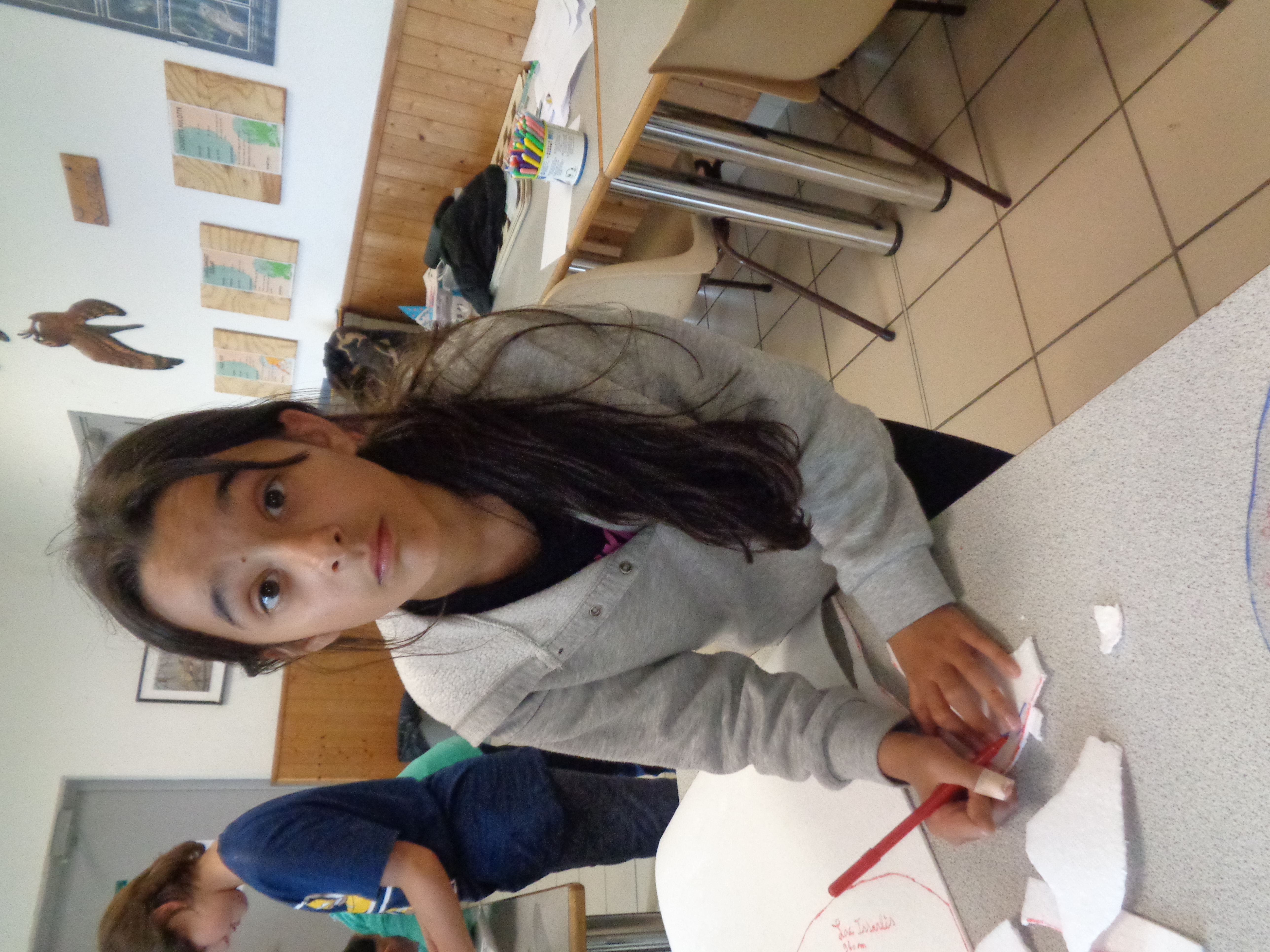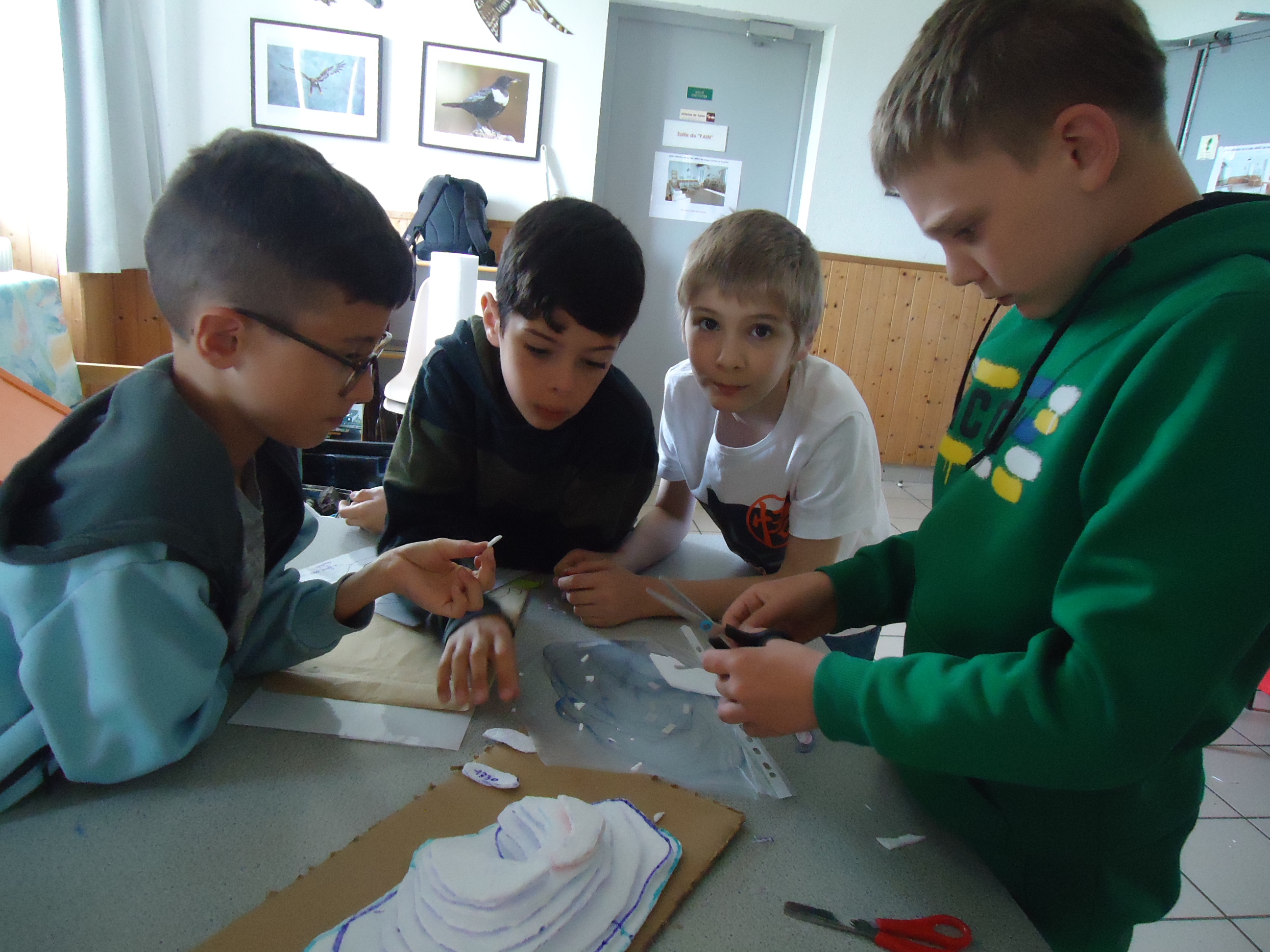 Aujourd’hui nous avons fait des maquettes sur les volcans. Nous, on a fait le Mont mézenc. On a sorti des bouts de plastique de l’enveloppe. Stan nous a donné du polystyrène ensuite nous avons découpé. Il nous a donné un carton, on a collé les morceaux de polystyrène qui formait le Mont Mézenc. Ensuite il a mis le plâtre et on l’a étalé, on a attendu qu’il sèche.