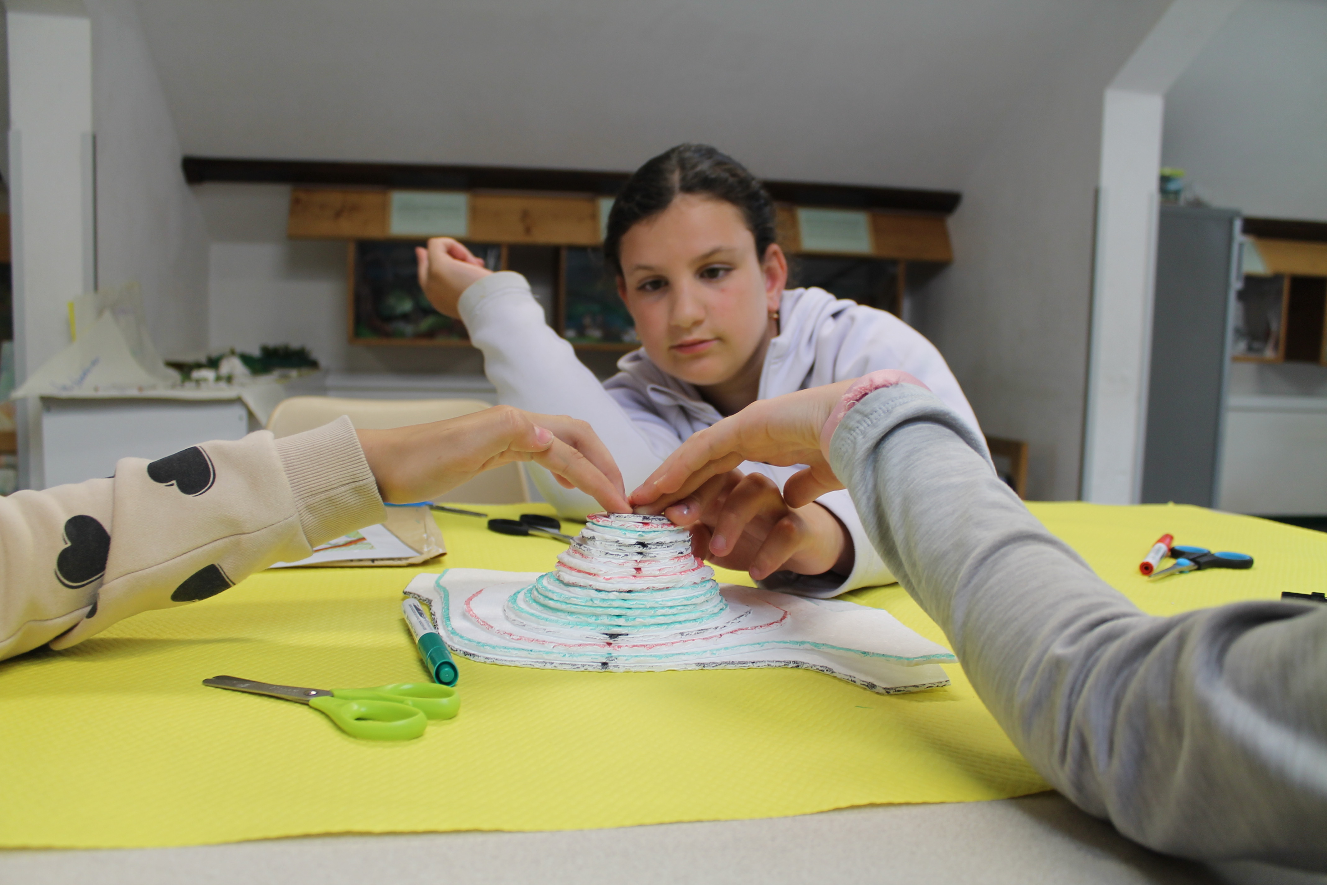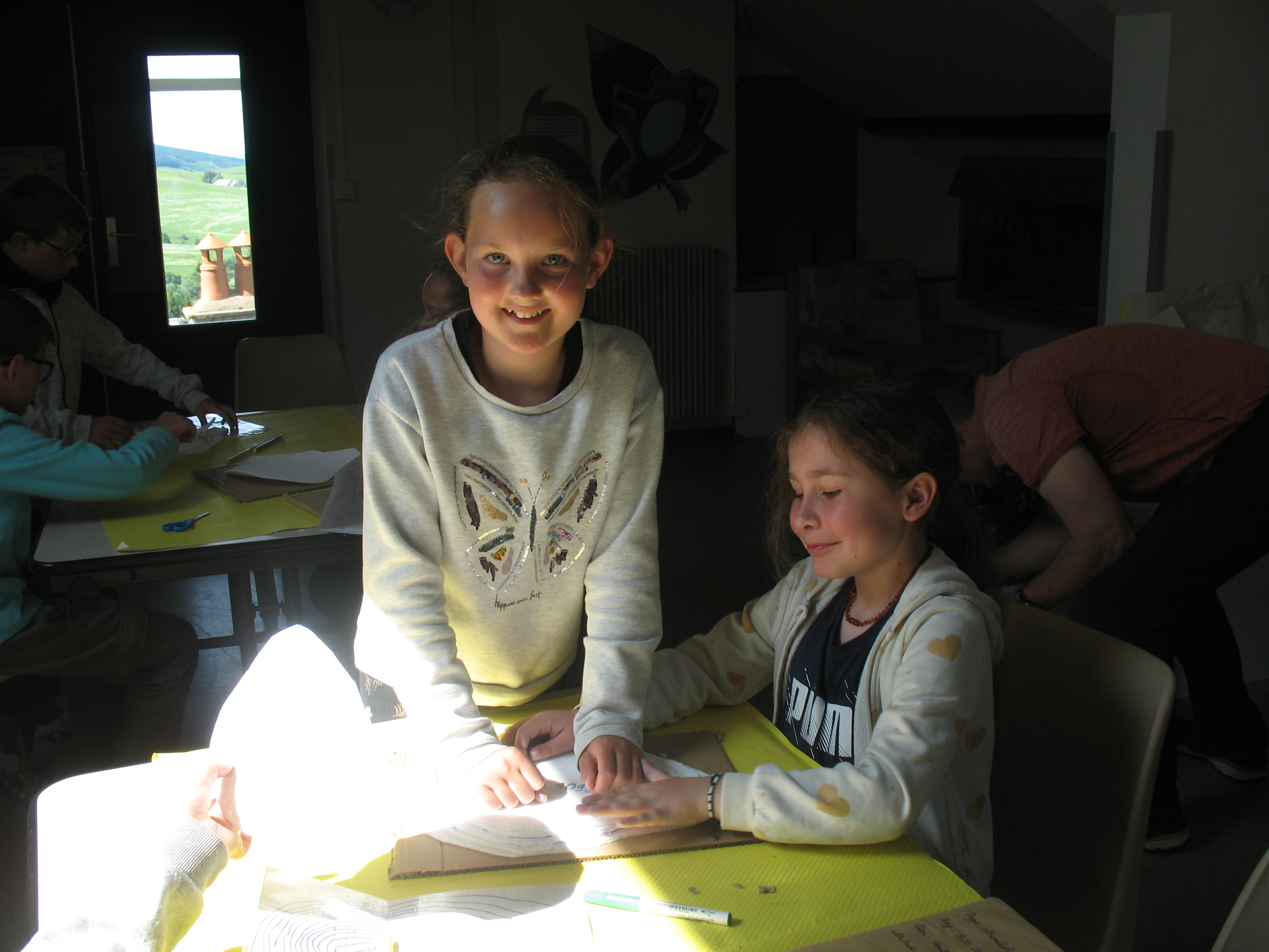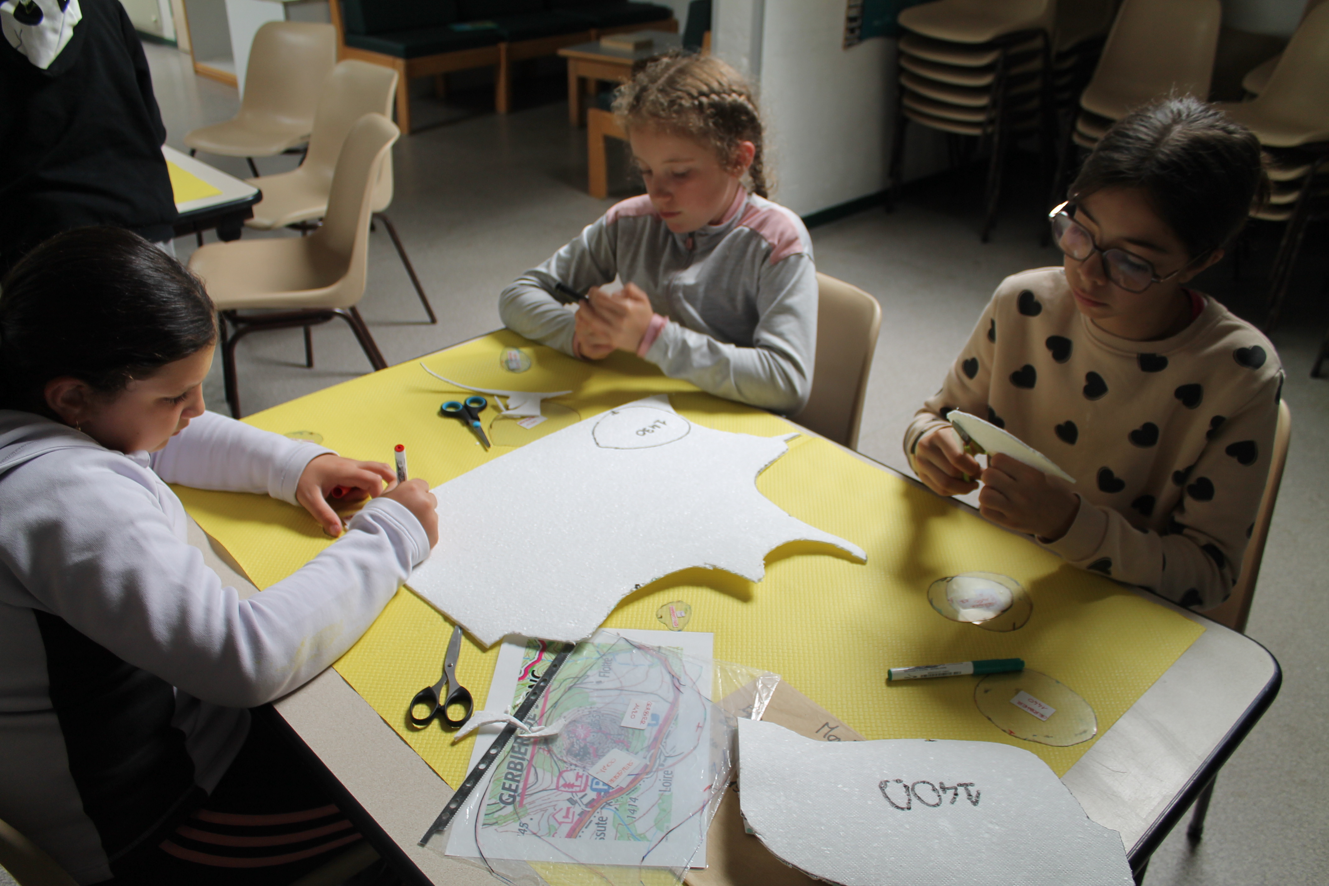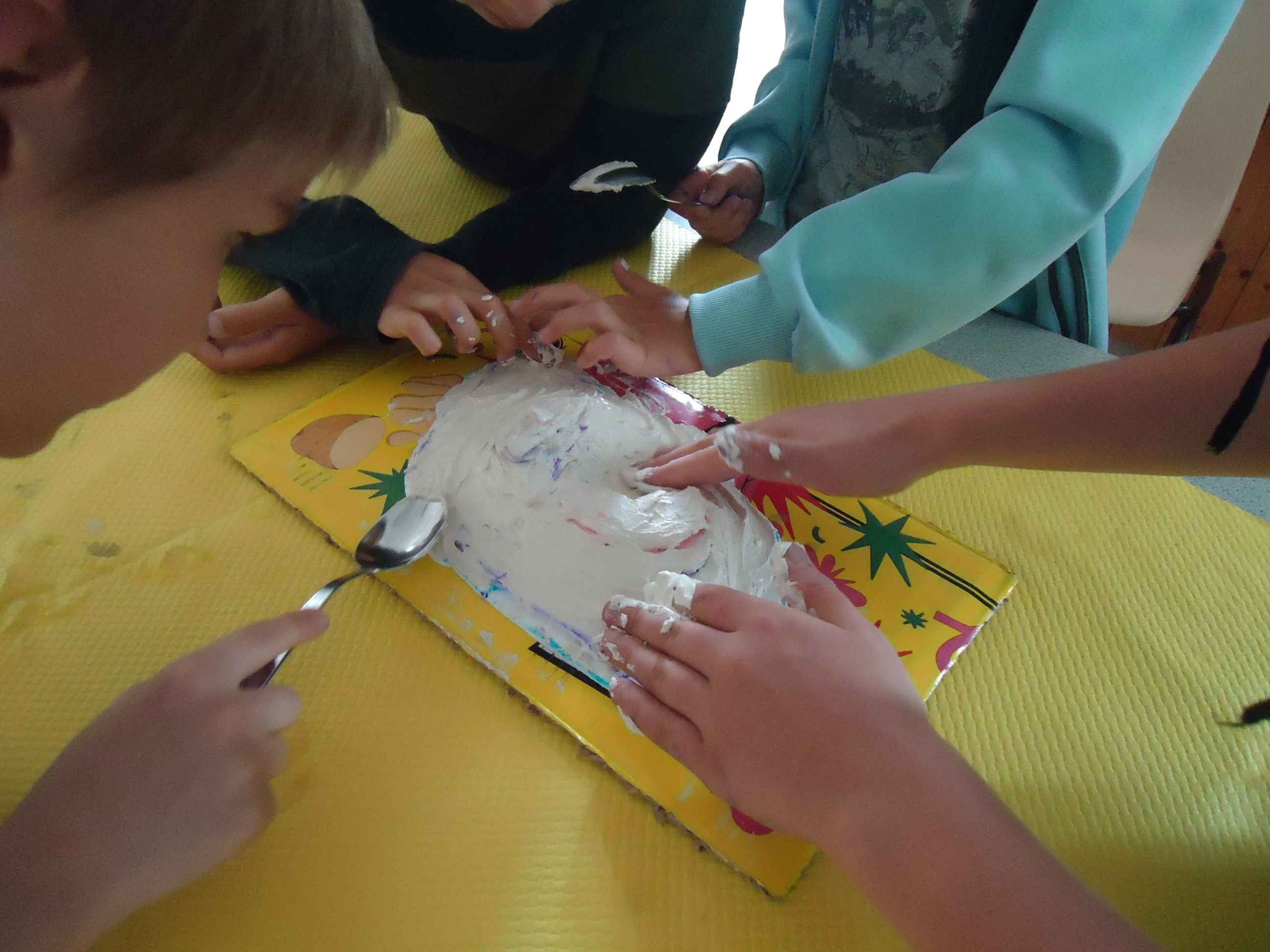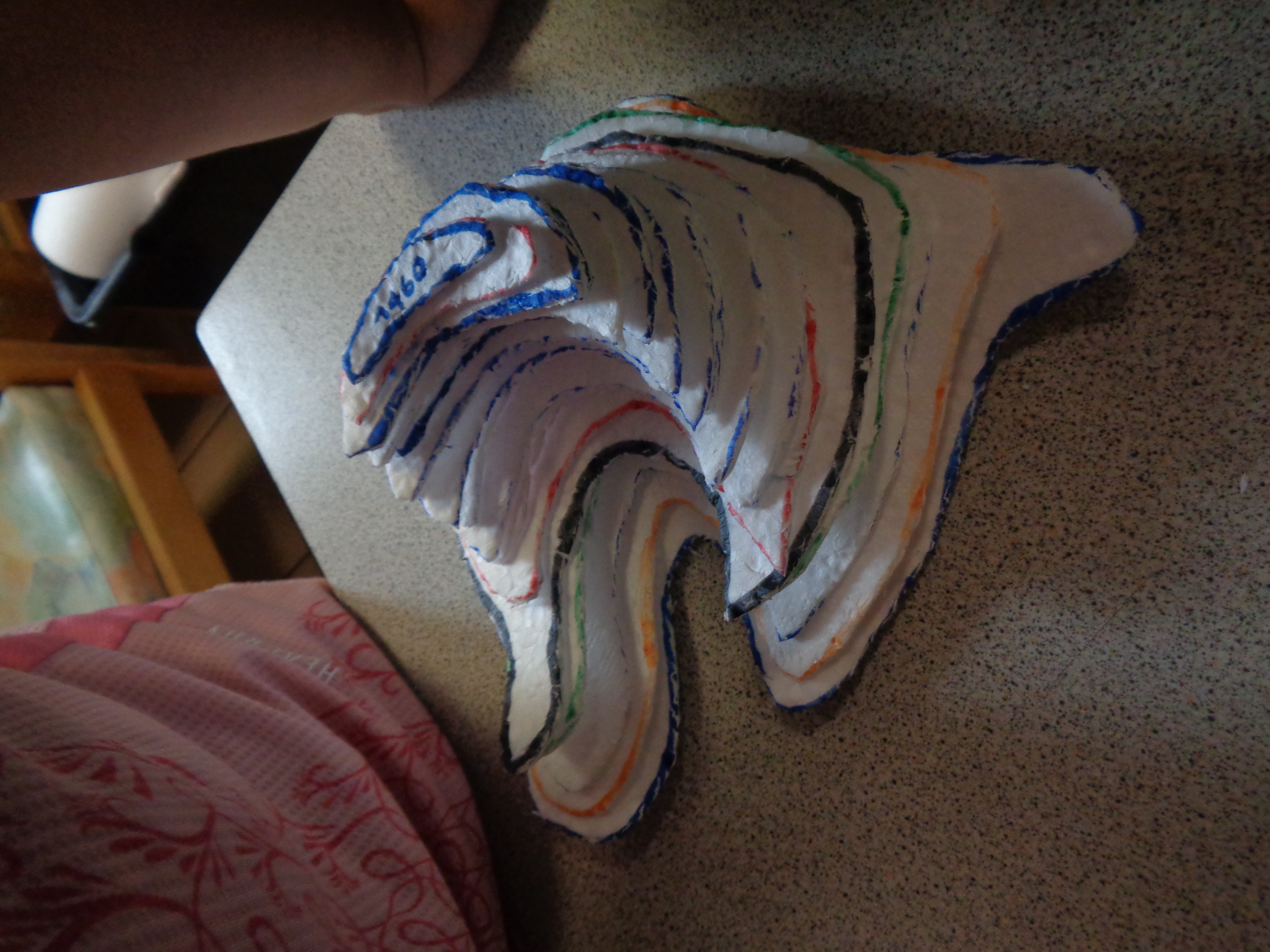 Aujourd’hui nous avons fait des maquettes sur les volcans. Nous, on a fait le Mont mézenc. On a sorti des bouts de plastique de l’enveloppe. Stan nous a donné du polystyrène ensuite nous avons découpé. Il nous a donné un carton, on a collé les morceaux de polystyrène qui formait le Mont Mézenc. Ensuite il a mis le plâtre et on l’a étalé, on a attendu qu’il sèche.