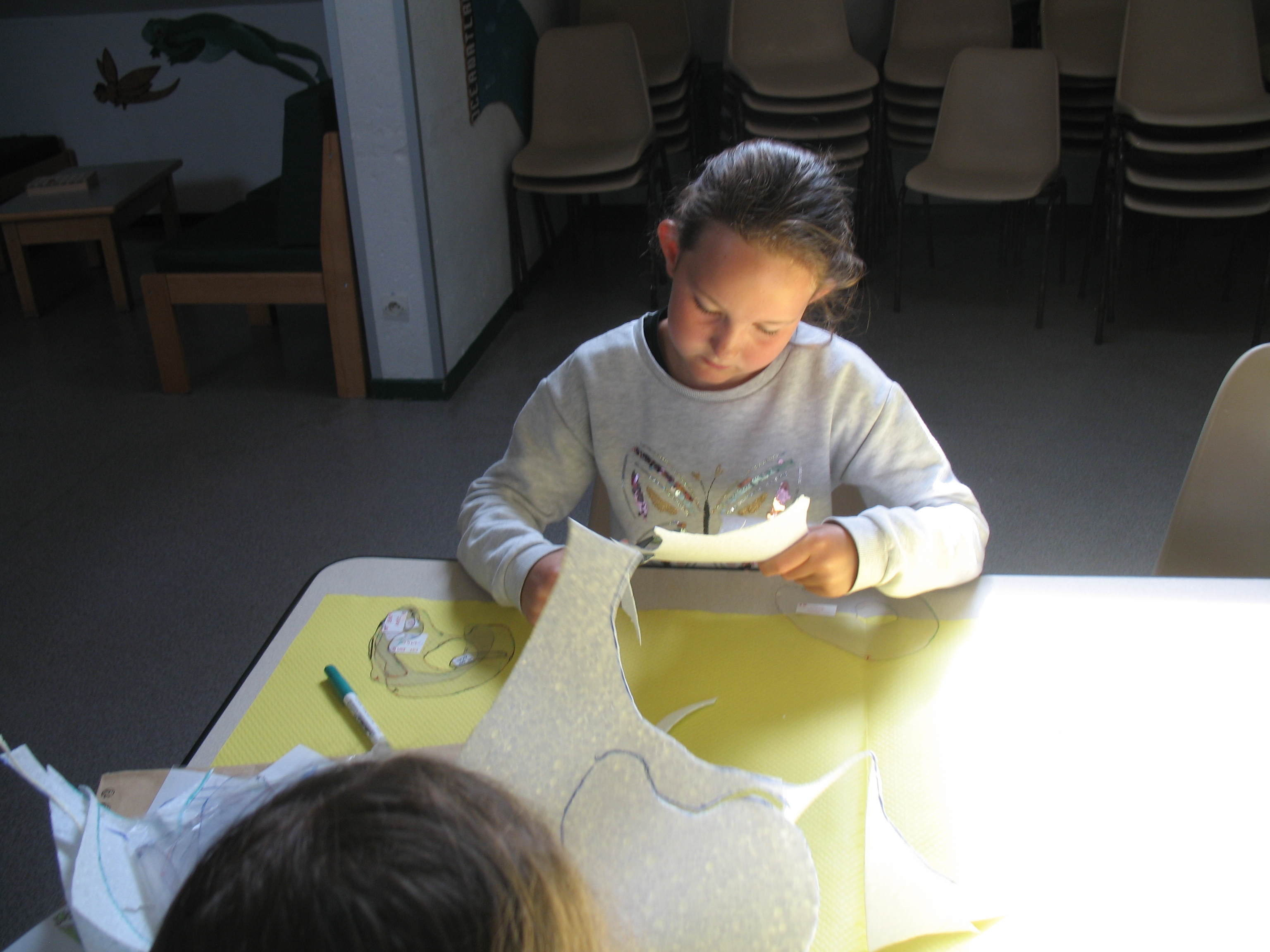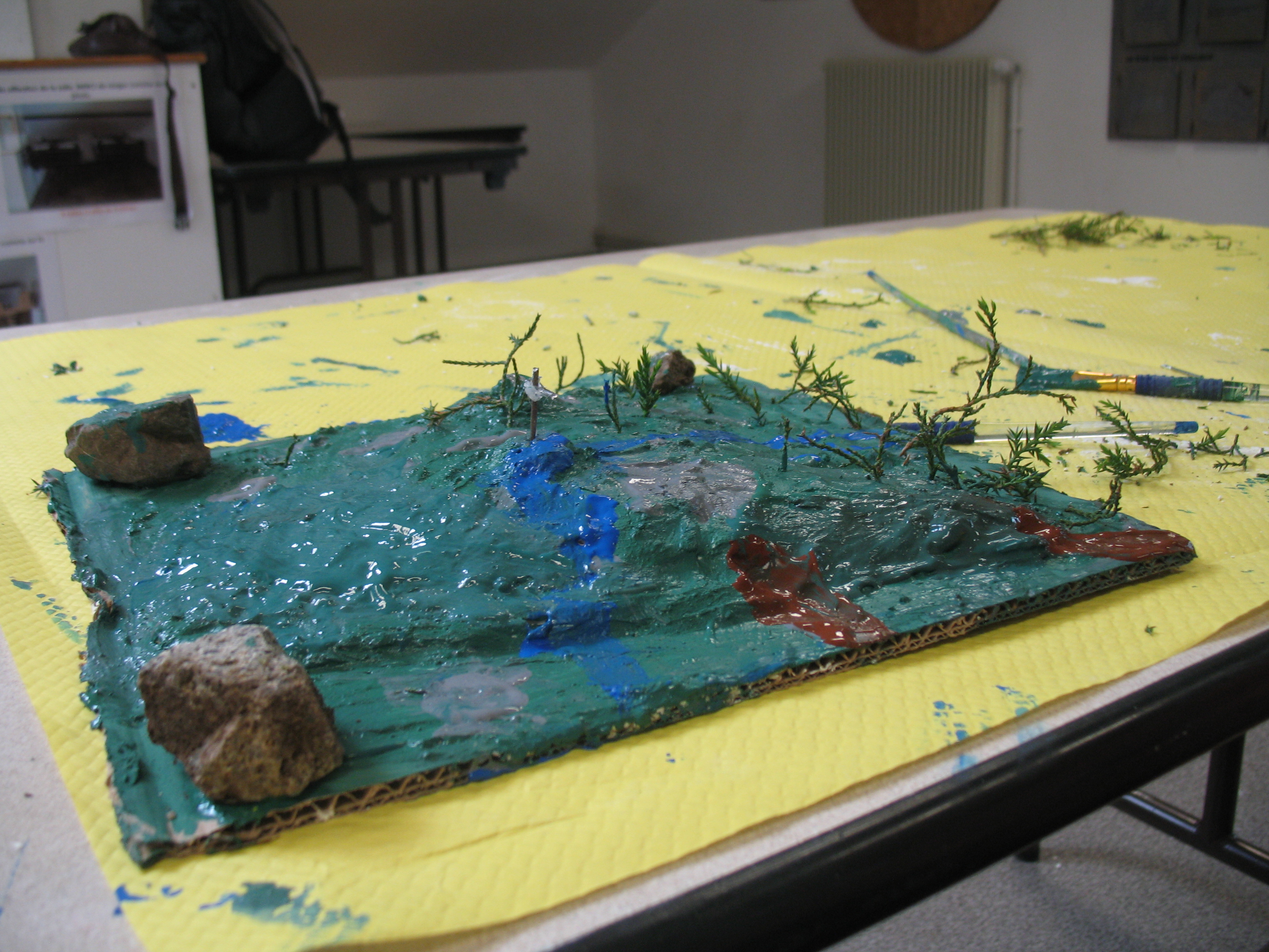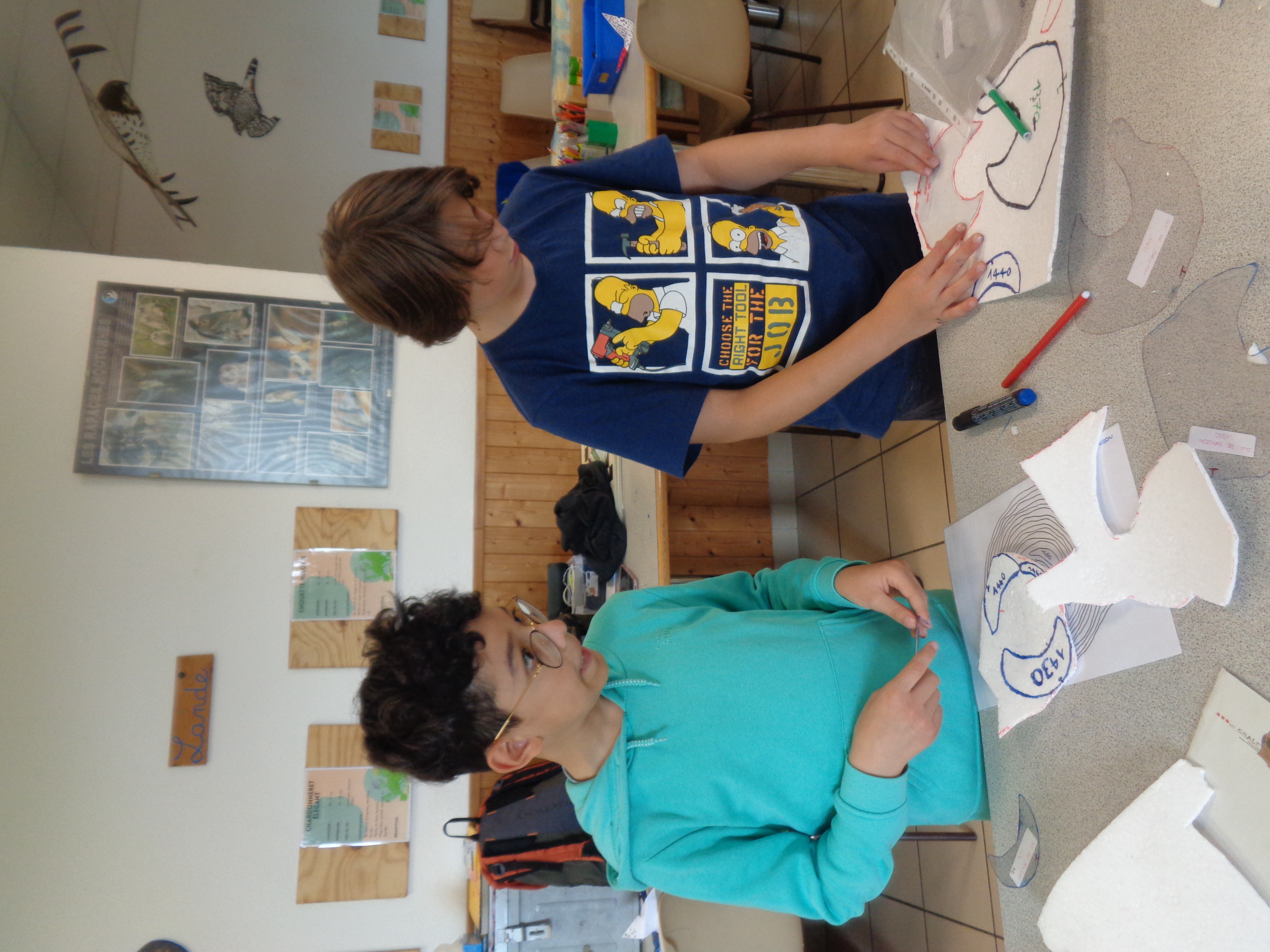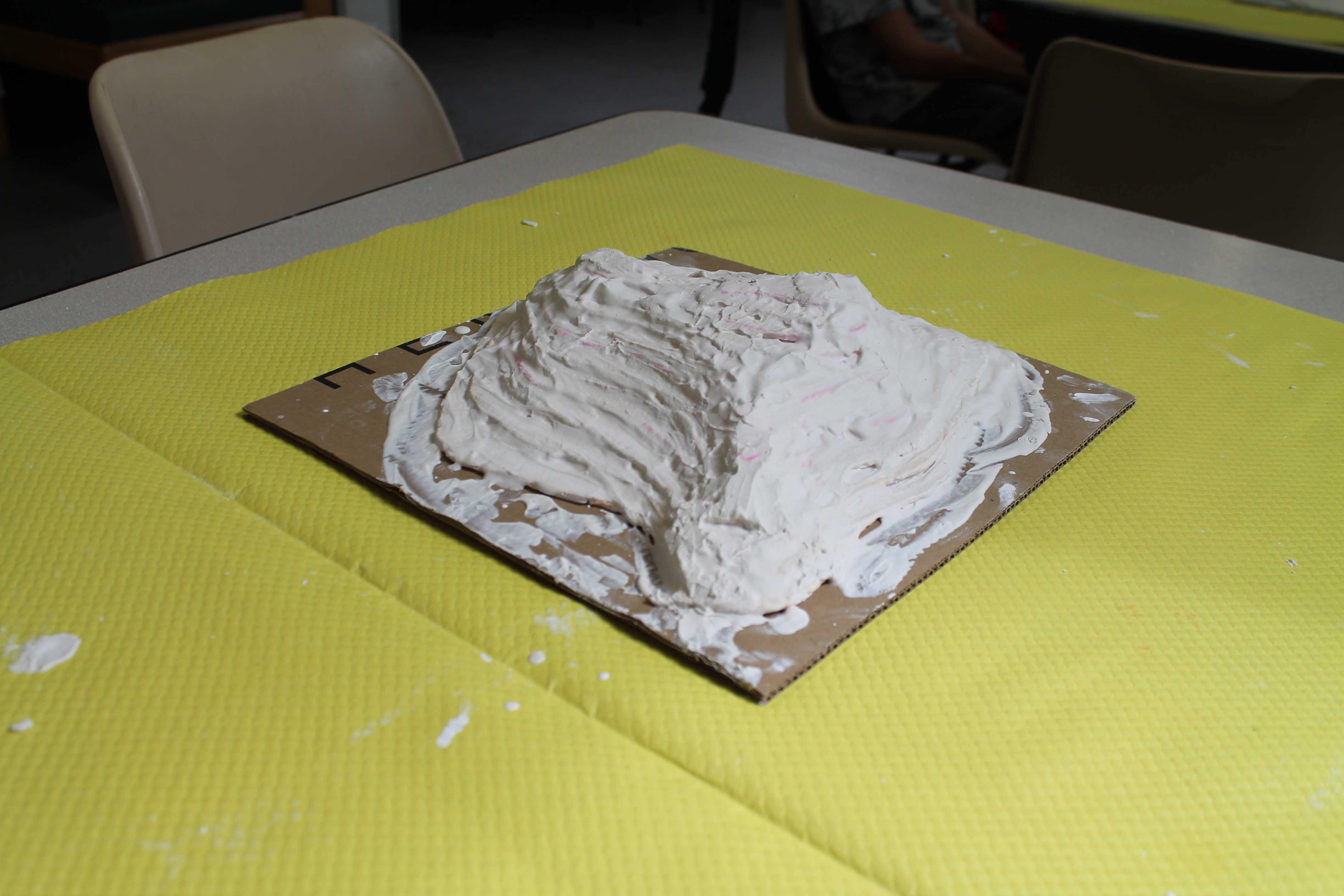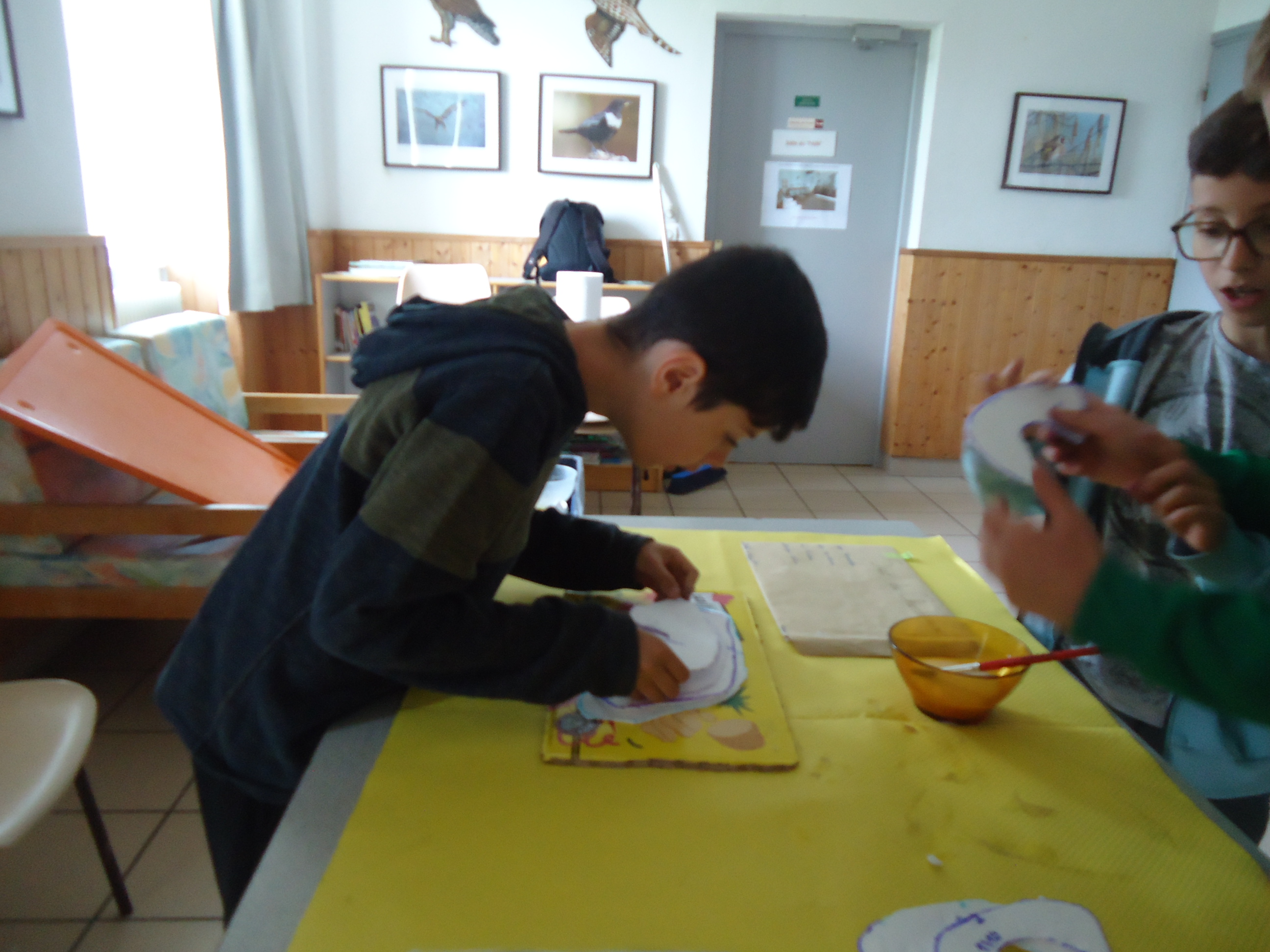 Aujourd’hui nous avons fait des maquettes sur les volcans. Nous, on a fait le Mont mézenc. On a sorti des bouts de plastique de l’enveloppe. Stan nous a donné du polystyrène ensuite nous avons découpé. Il nous a donné un carton, on a collé les morceaux de polystyrène qui formait le Mont Mézenc. Ensuite il a mis le plâtre et on l’a étalé, on a attendu qu’il sèche.