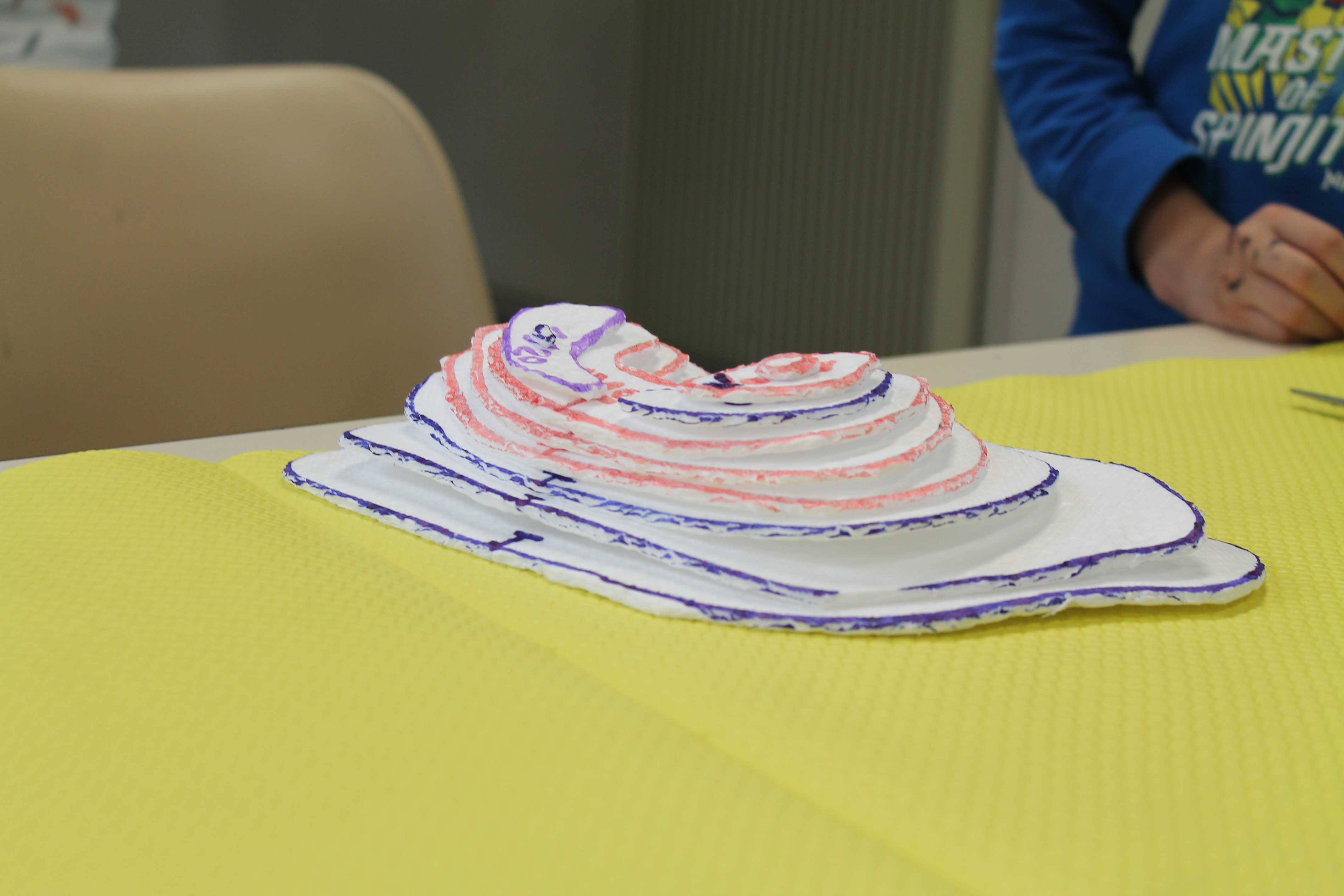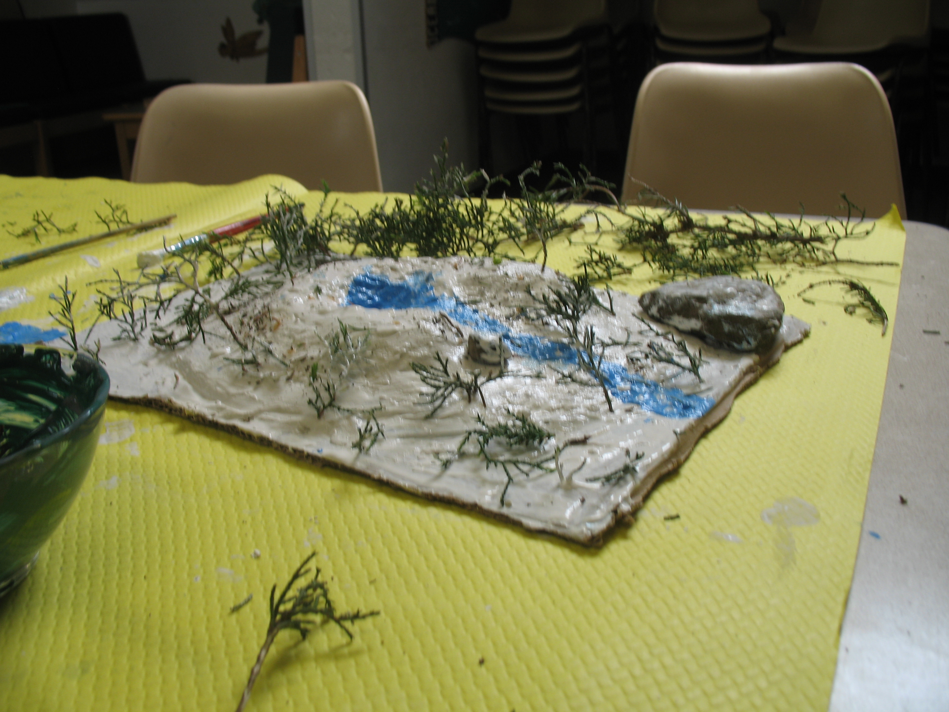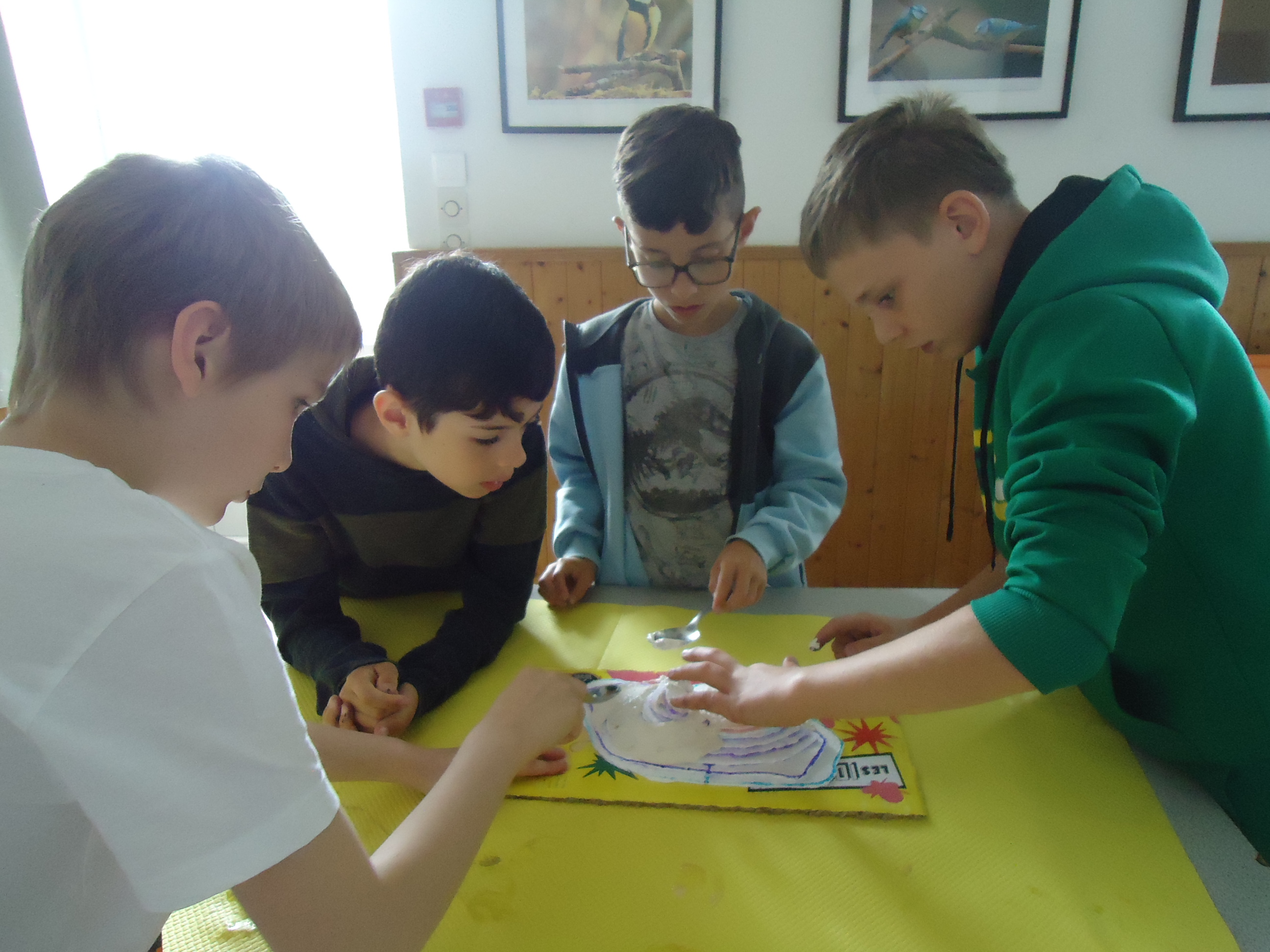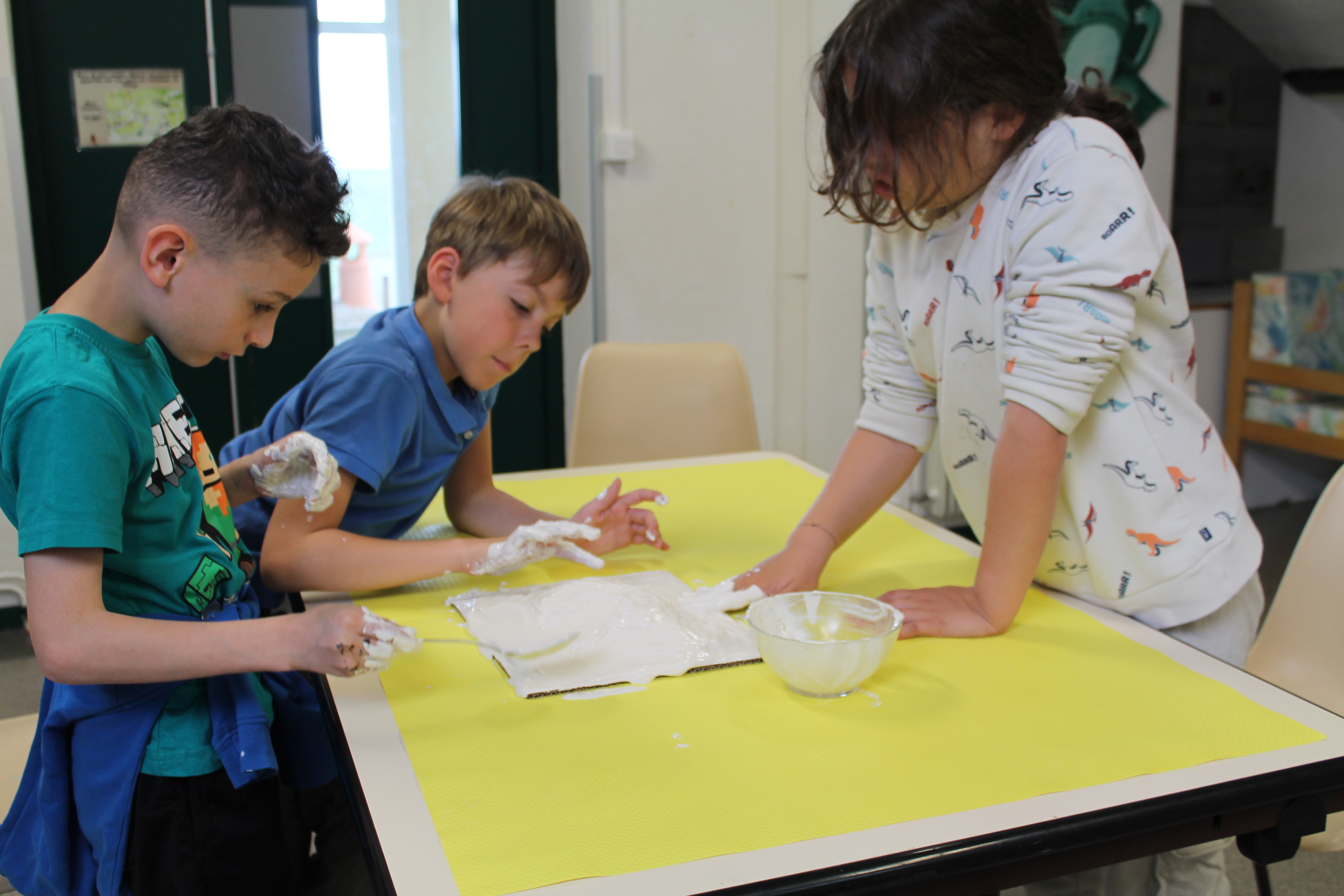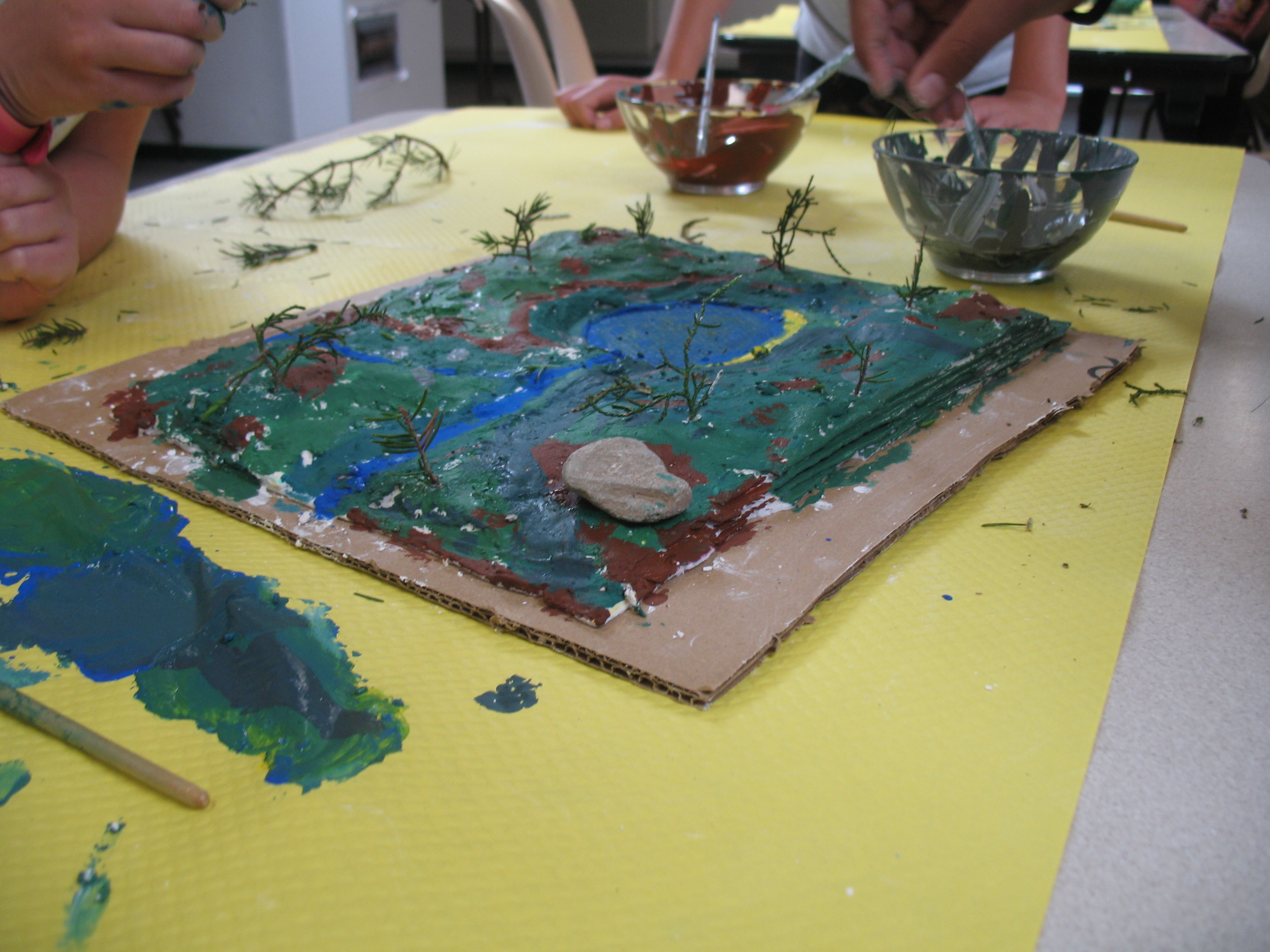 Aujourd’hui nous avons fait des maquettes sur les volcans. Nous, on a fait le Mont mézenc. On a sorti des bouts de plastique de l’enveloppe. Stan nous a donné du polystyrène ensuite nous avons découpé. Il nous a donné un carton, on a collé les morceaux de polystyrène qui formait le Mont Mézenc. Ensuite il a mis le plâtre et on l’a étalé, on a attendu qu’il sèche.