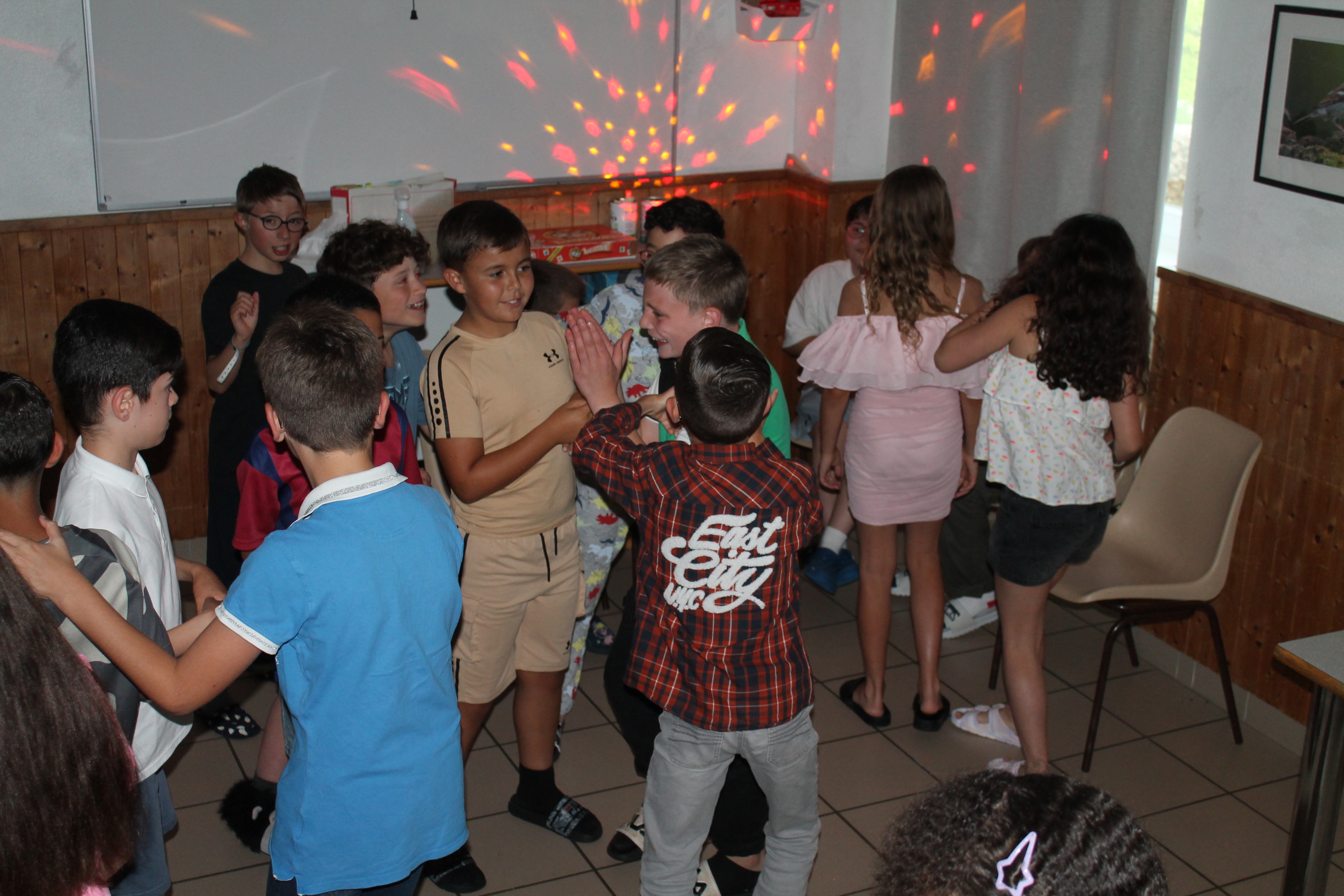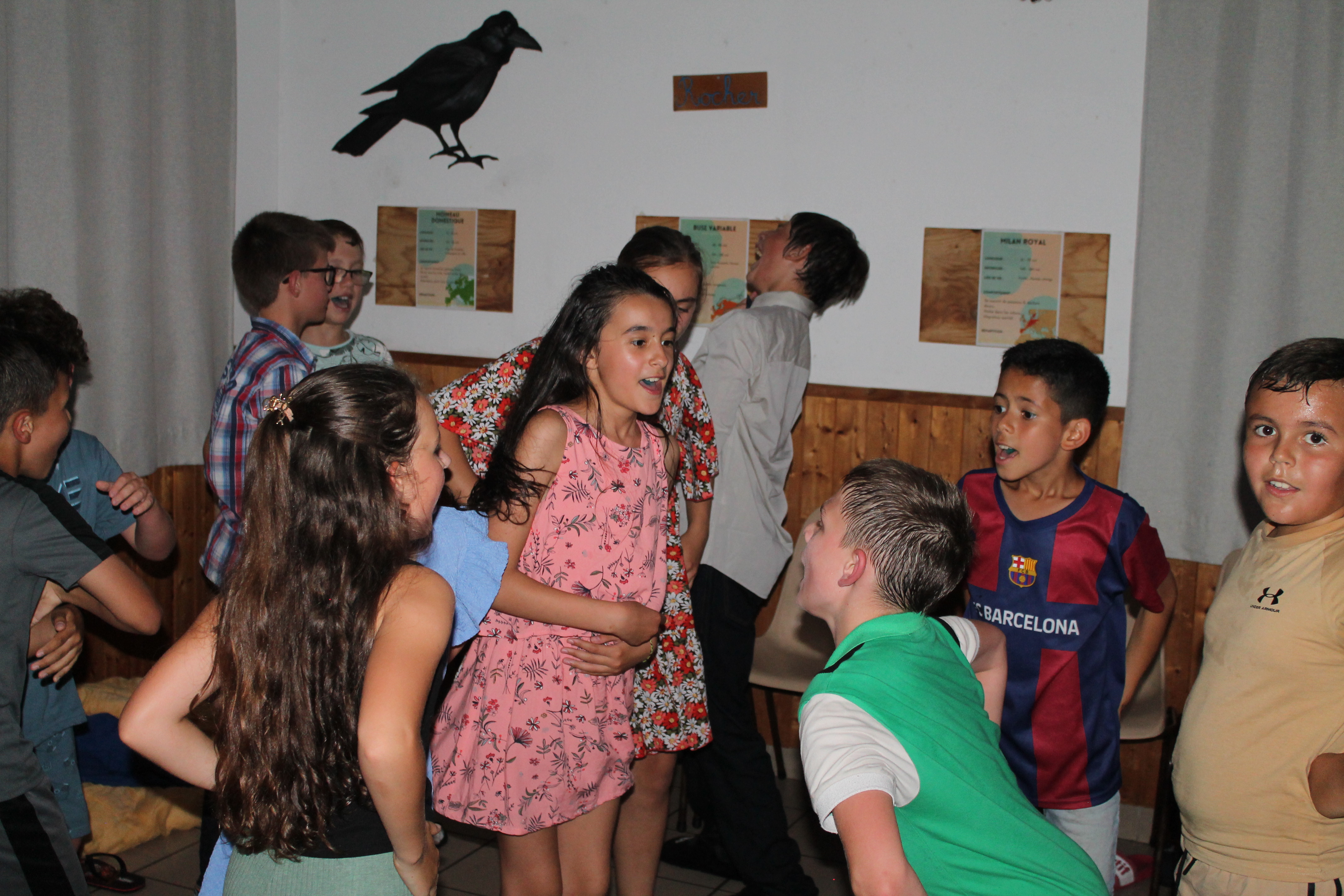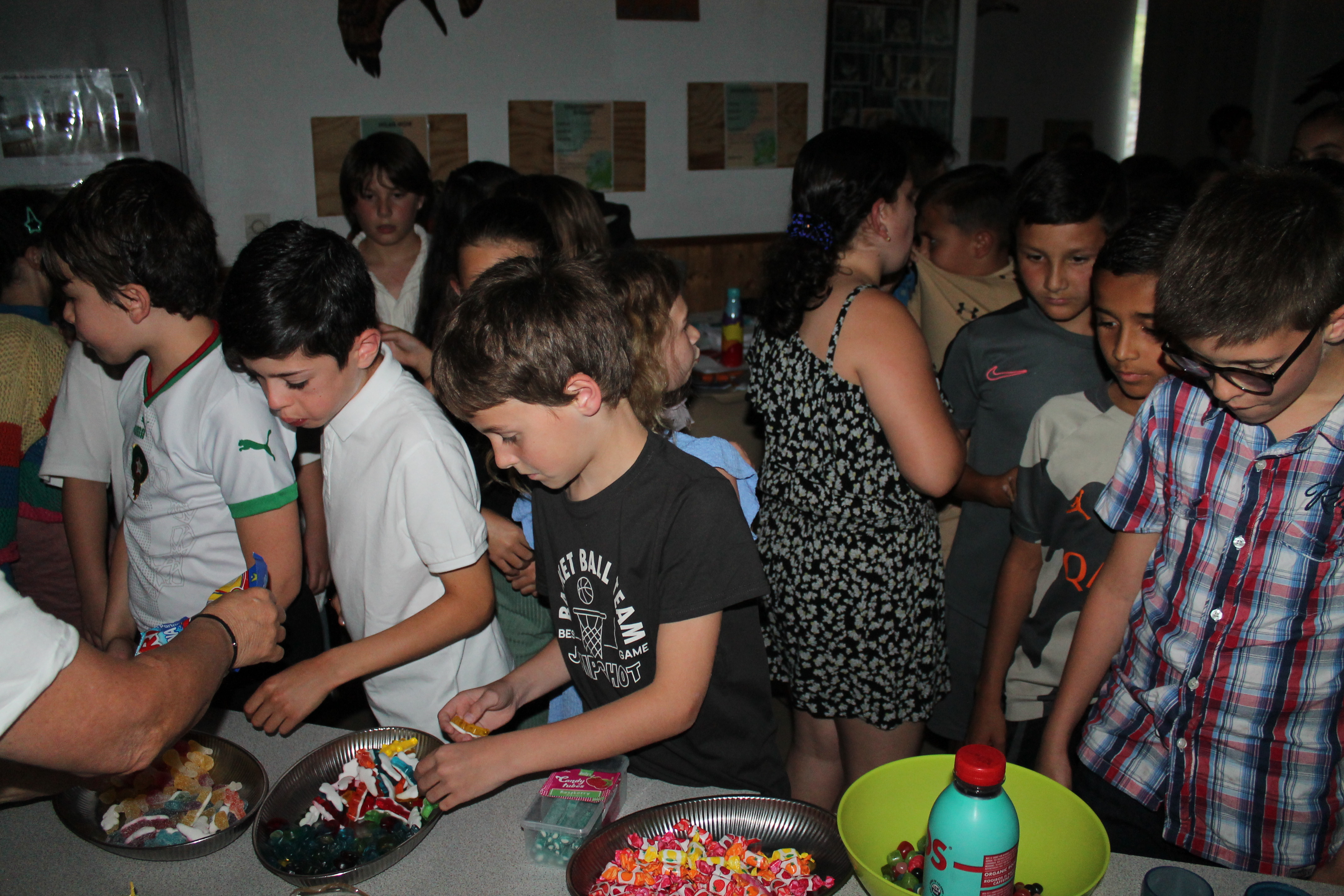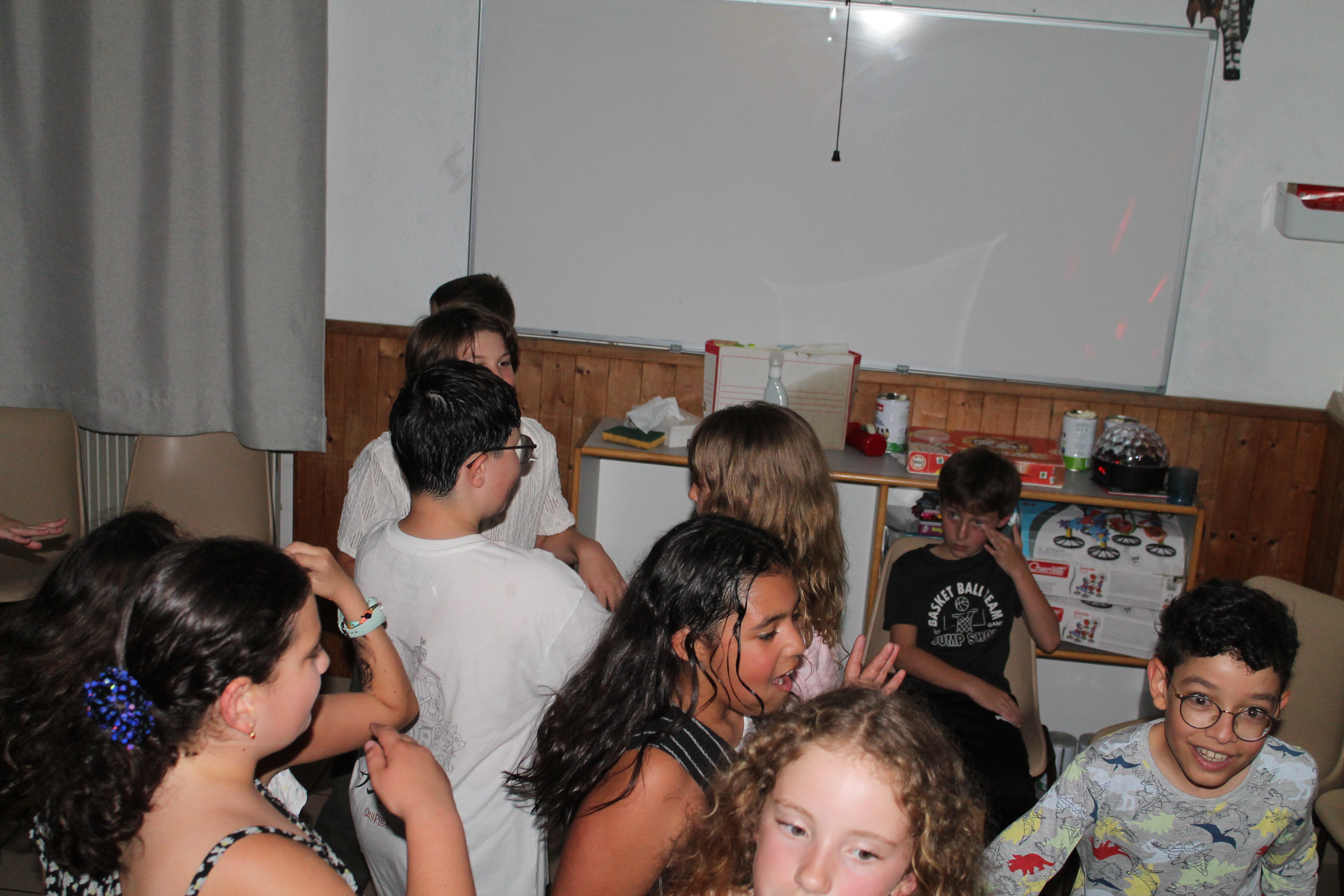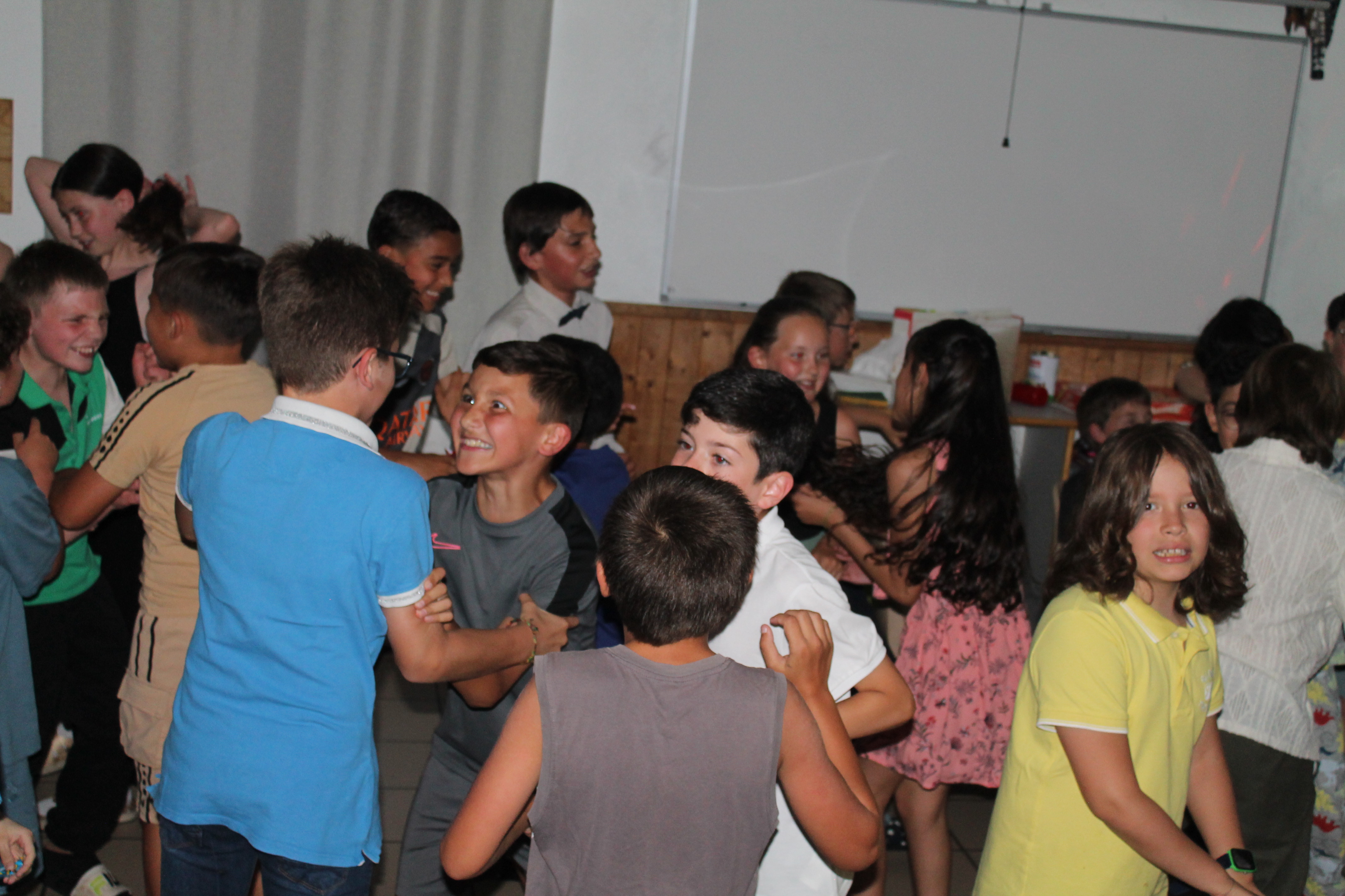 Pendant le repas du soir, Marc et Denis préparaient la boum pour pour mes camarades et moi. Après le repas nous sommes allé nous brosser les dents. Puis après notre brossage de dents nous sommes descendus dans le salle de la boum pour profiter. Aussi il y avait des bonbons, des boissons et de la musique. Et nous avons vraiment bien profité.