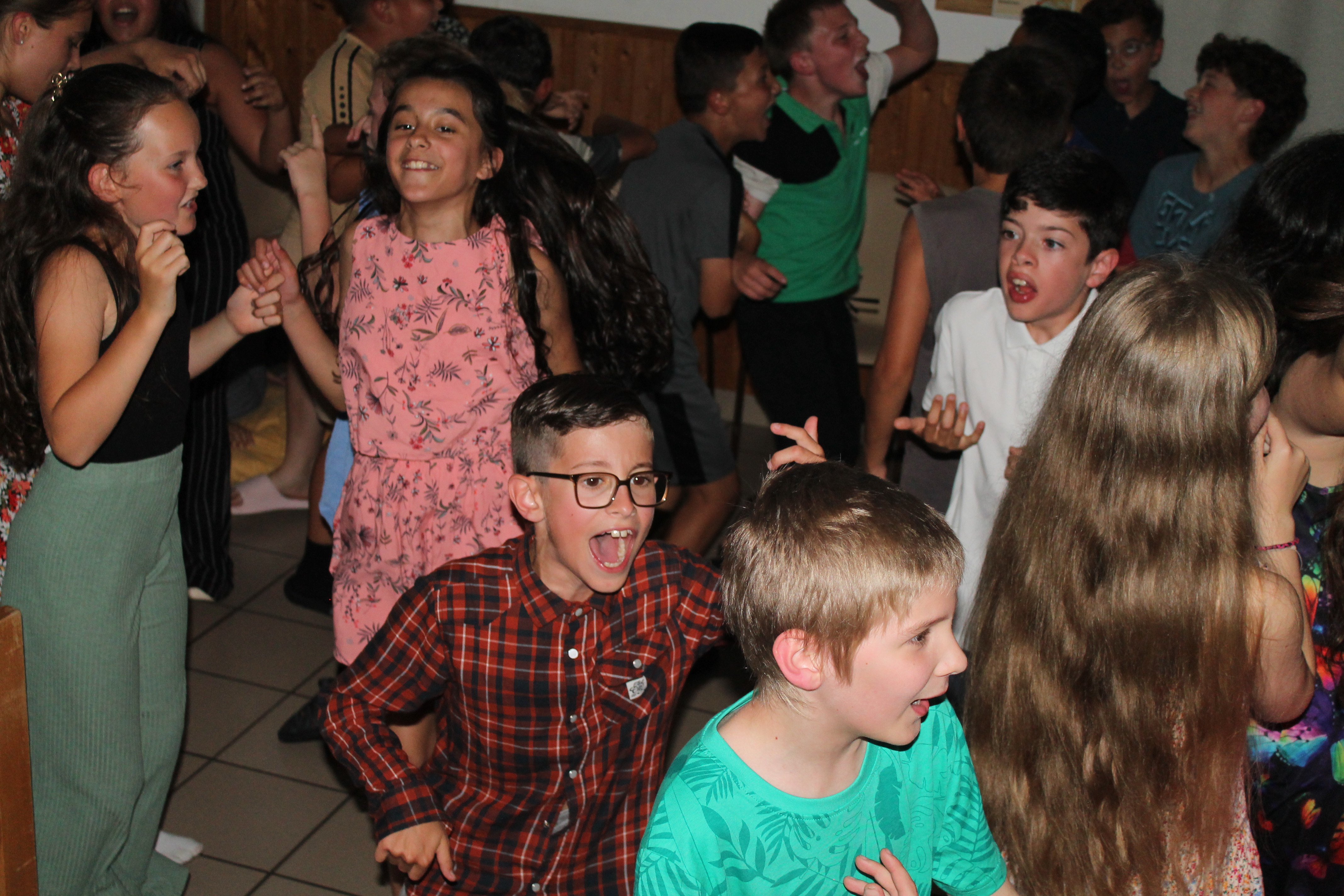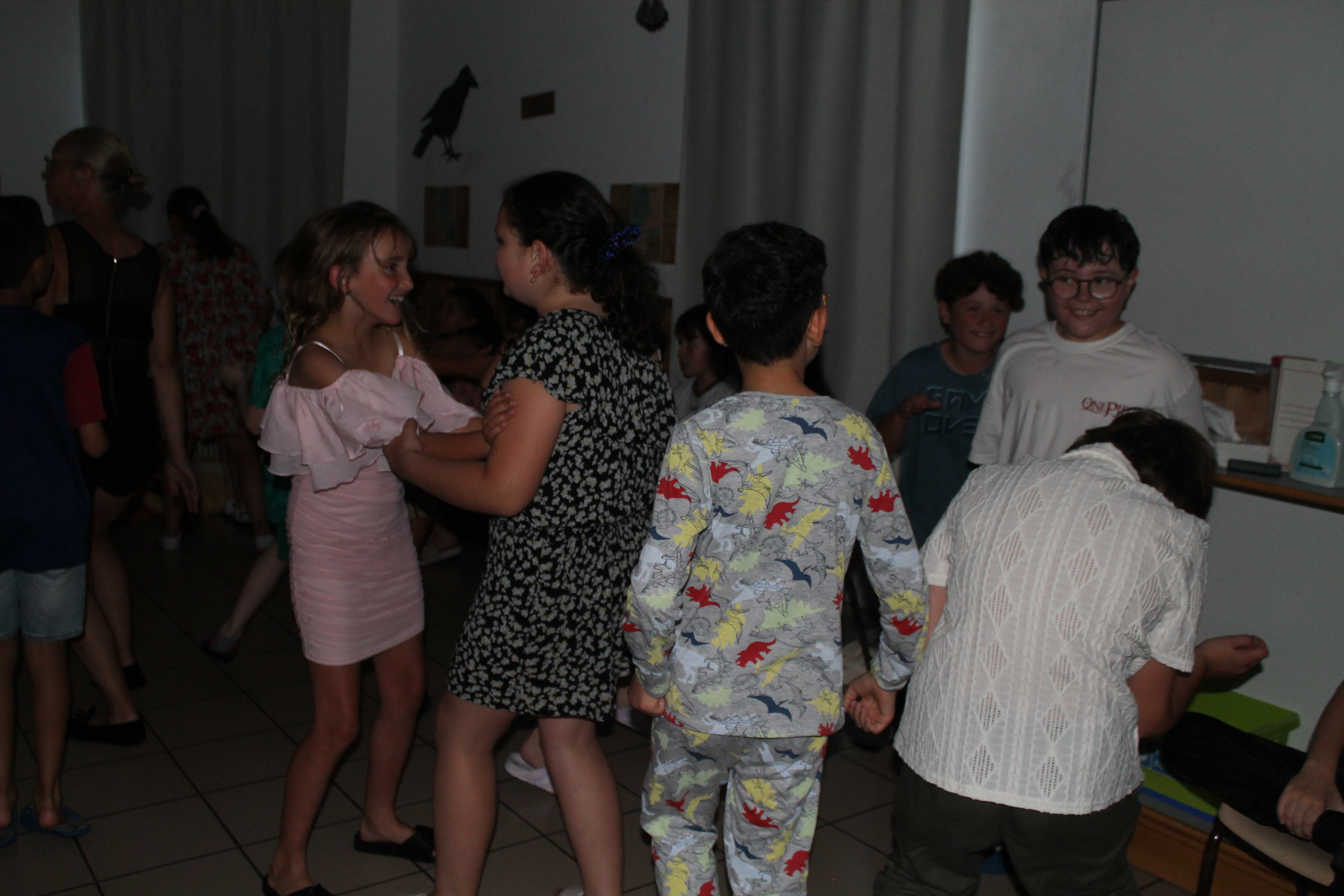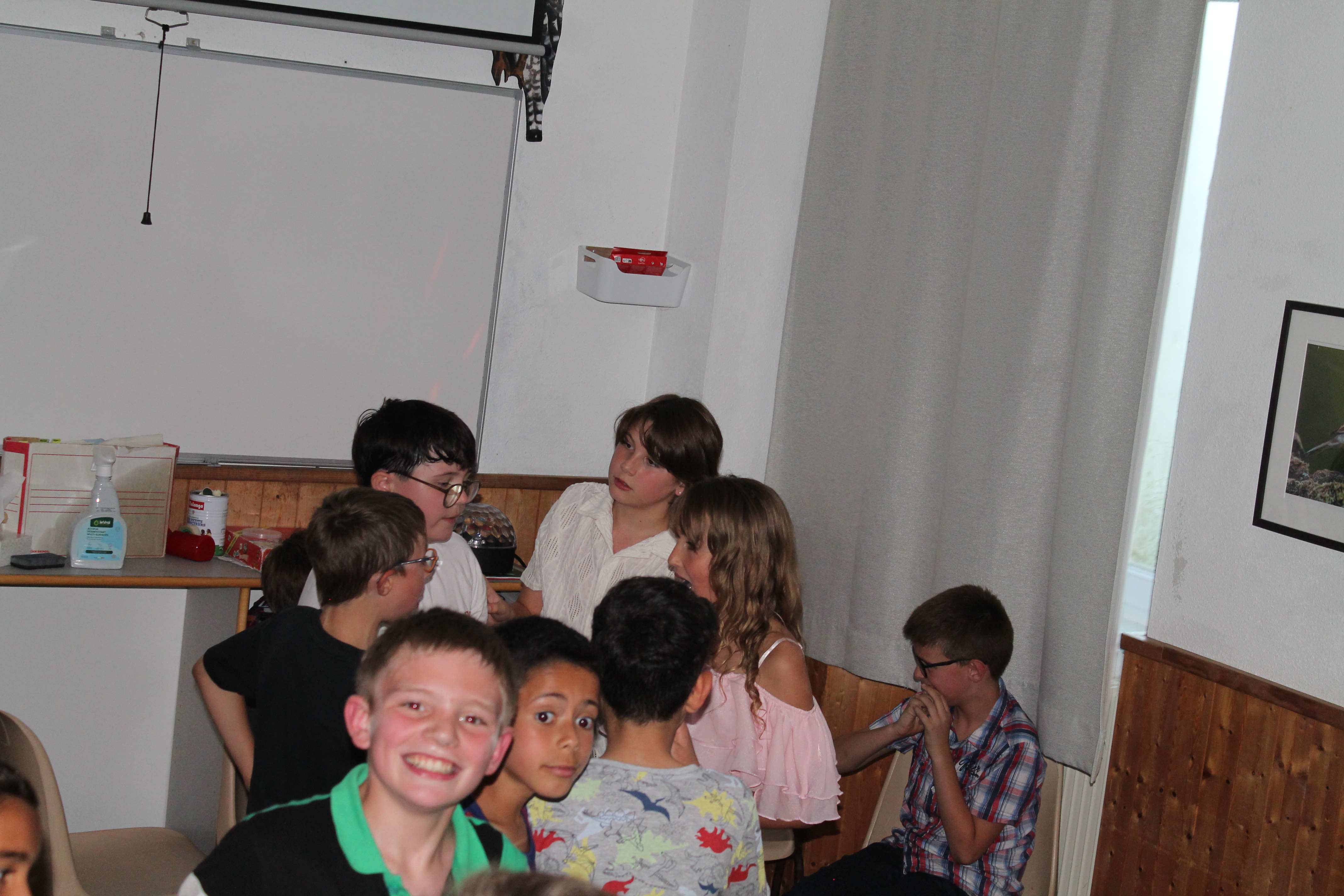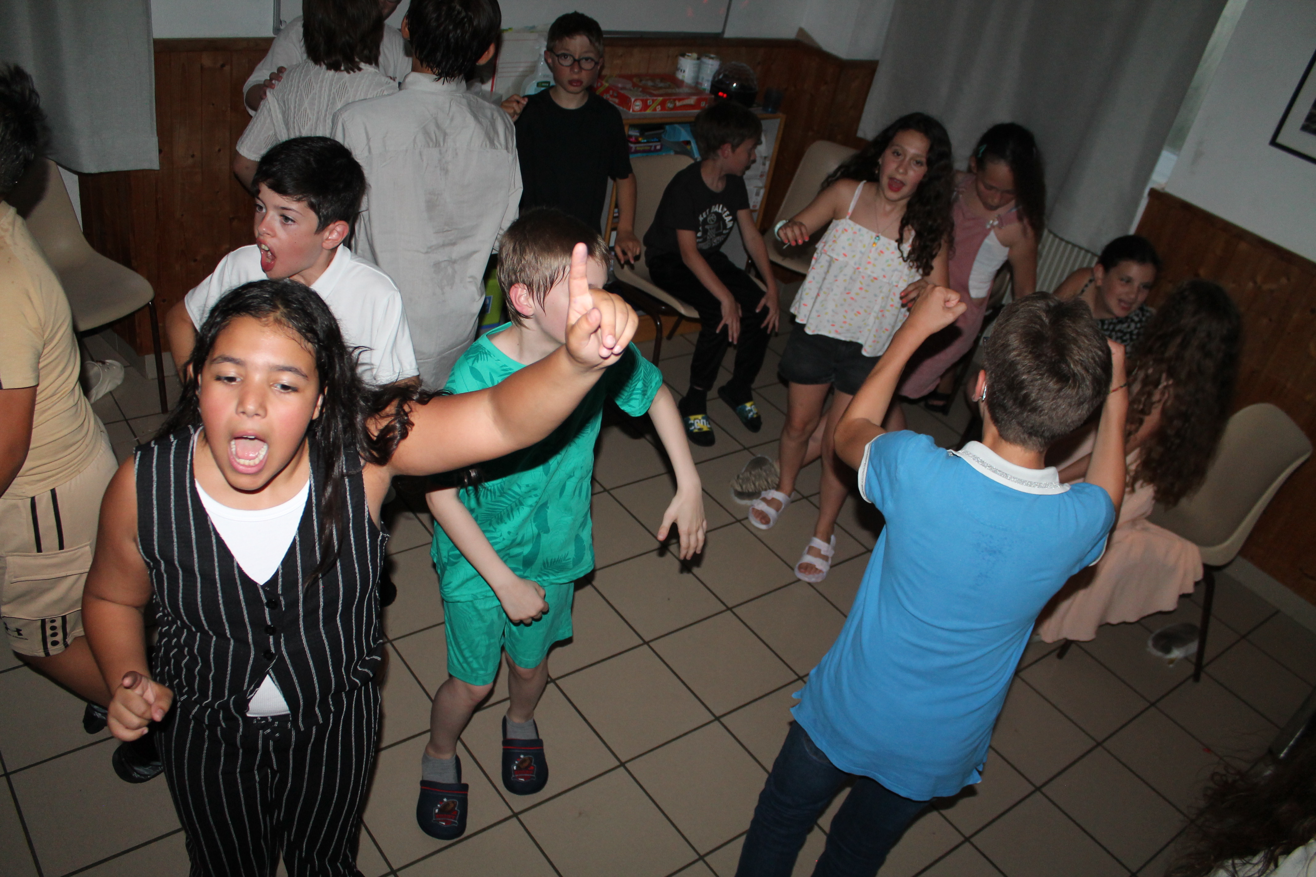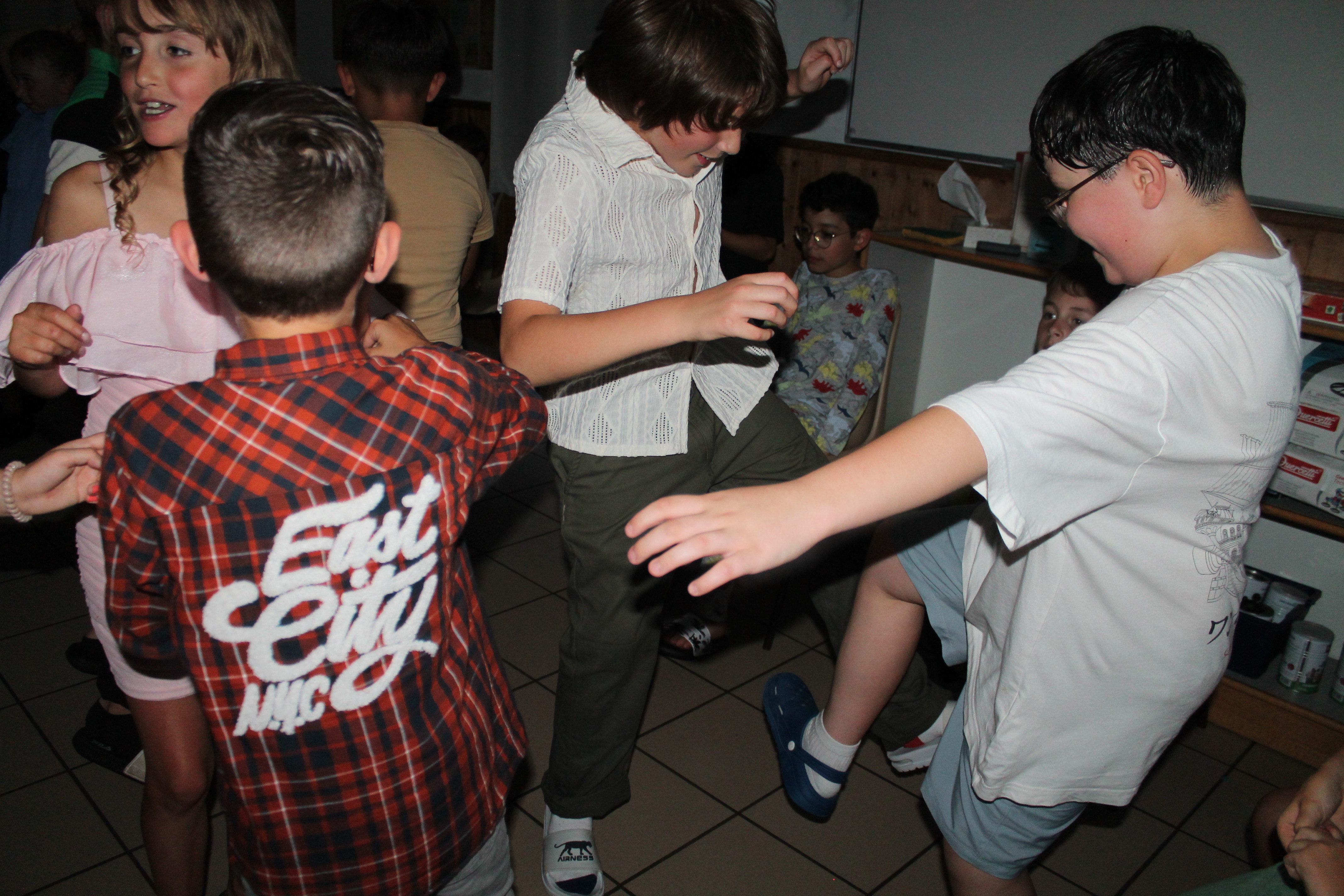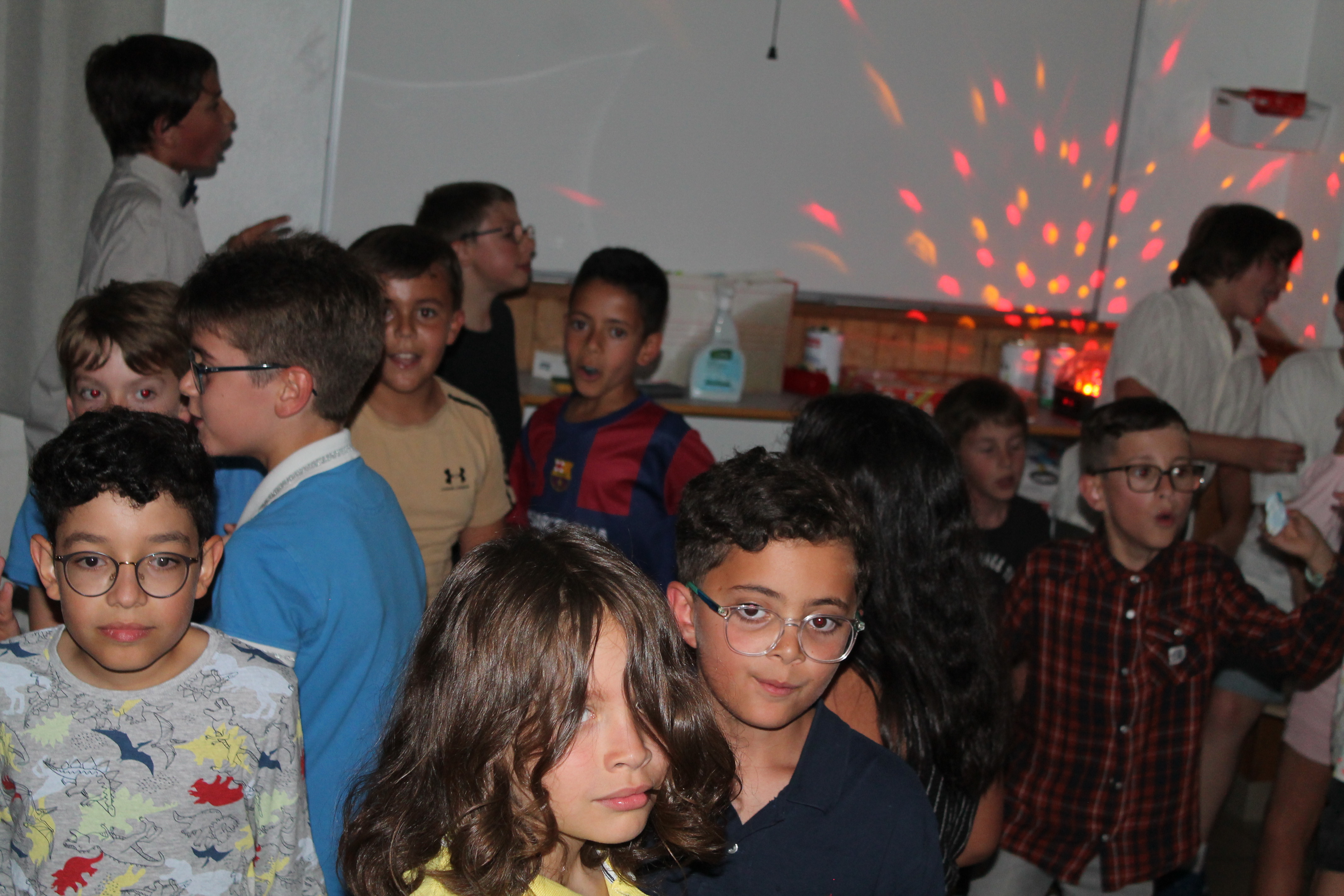 Pendant le repas du soir, Marc et Denis préparaient la boum pour pour mes camarades et moi. Après le repas nous sommes allé nous brosser les dents. Puis après notre brossage de dents nous sommes descendus dans le salle de la boum pour profiter. Aussi il y avait des bonbons, des boissons et de la musique. Et nous avons vraiment bien profité.