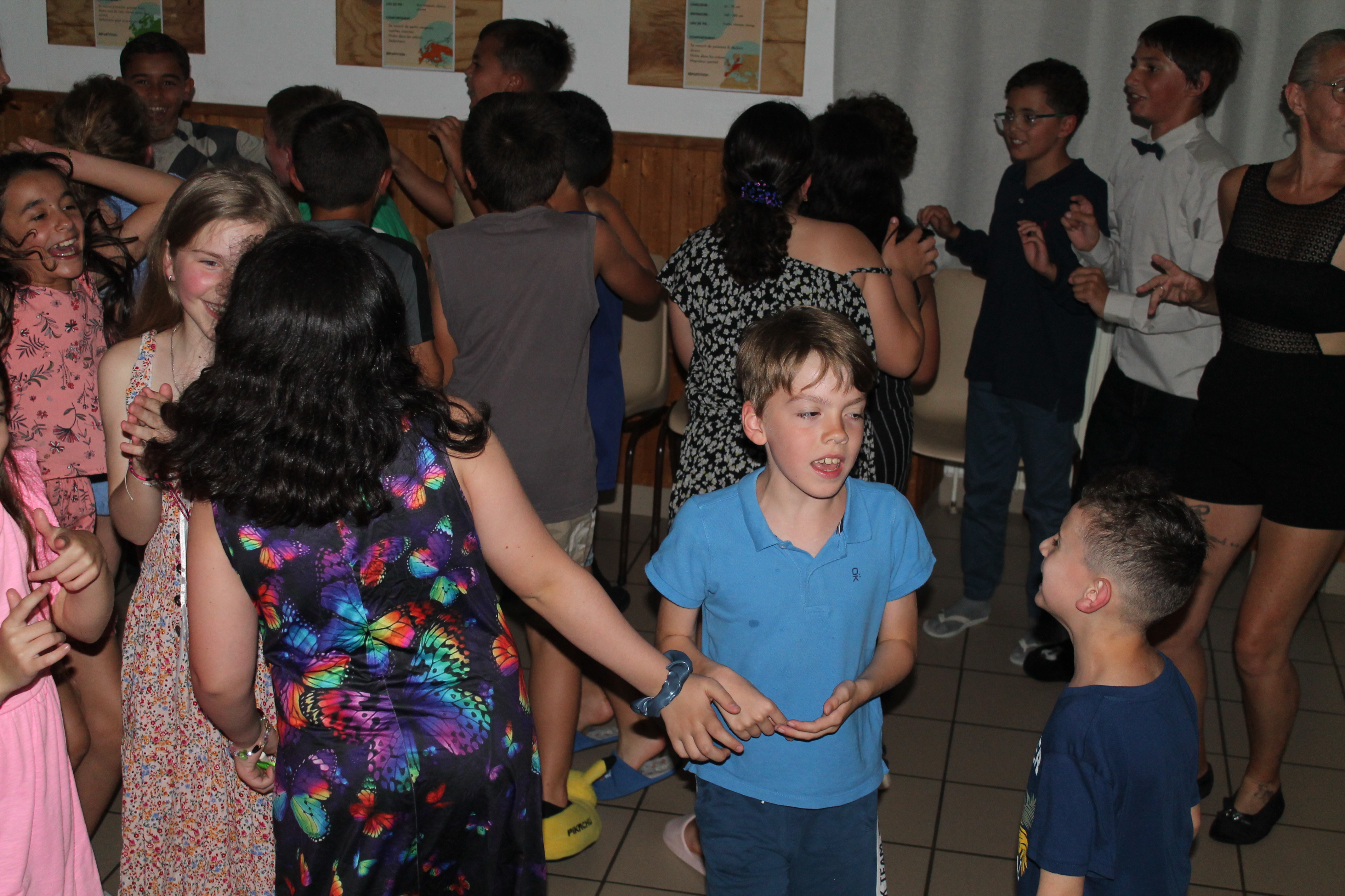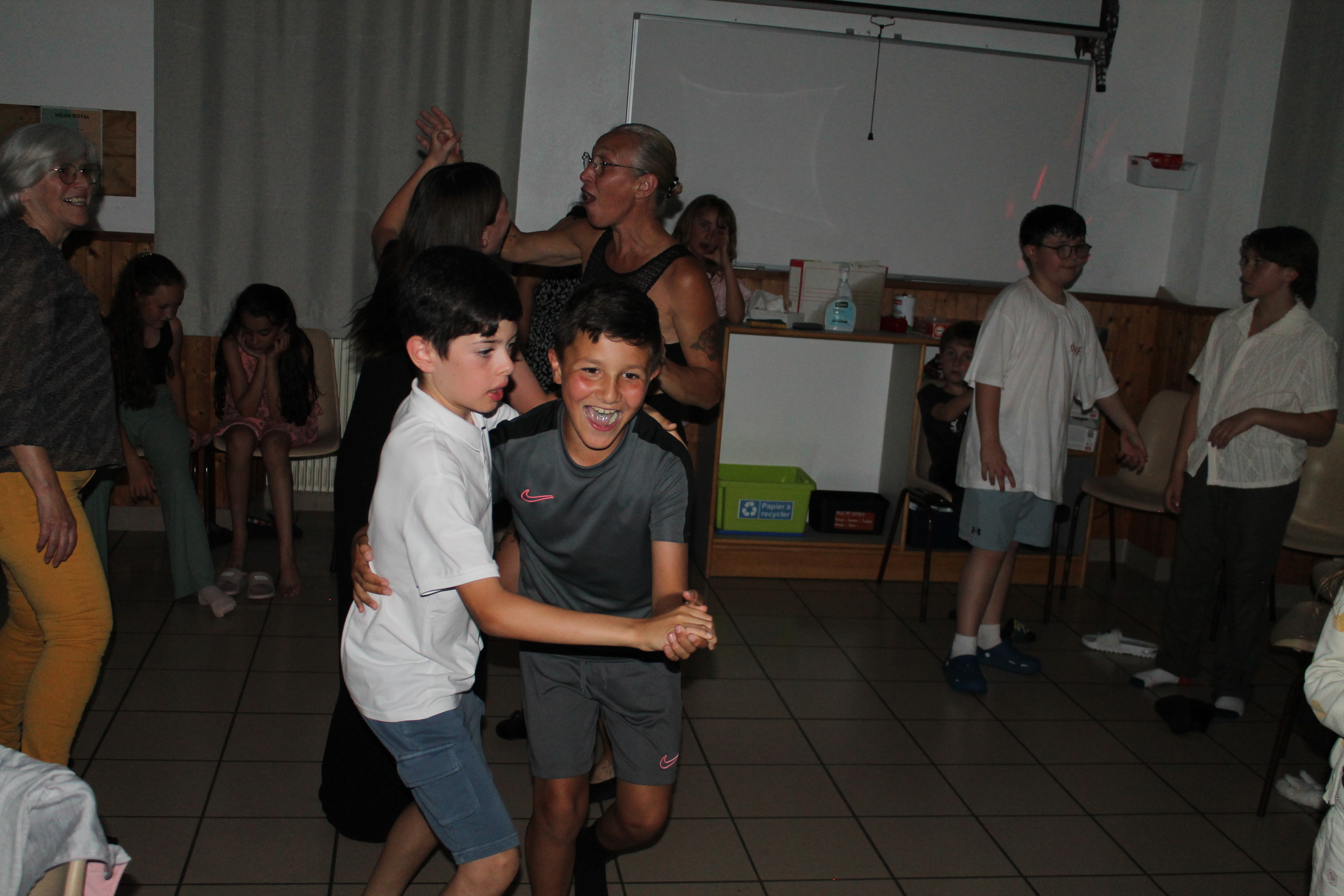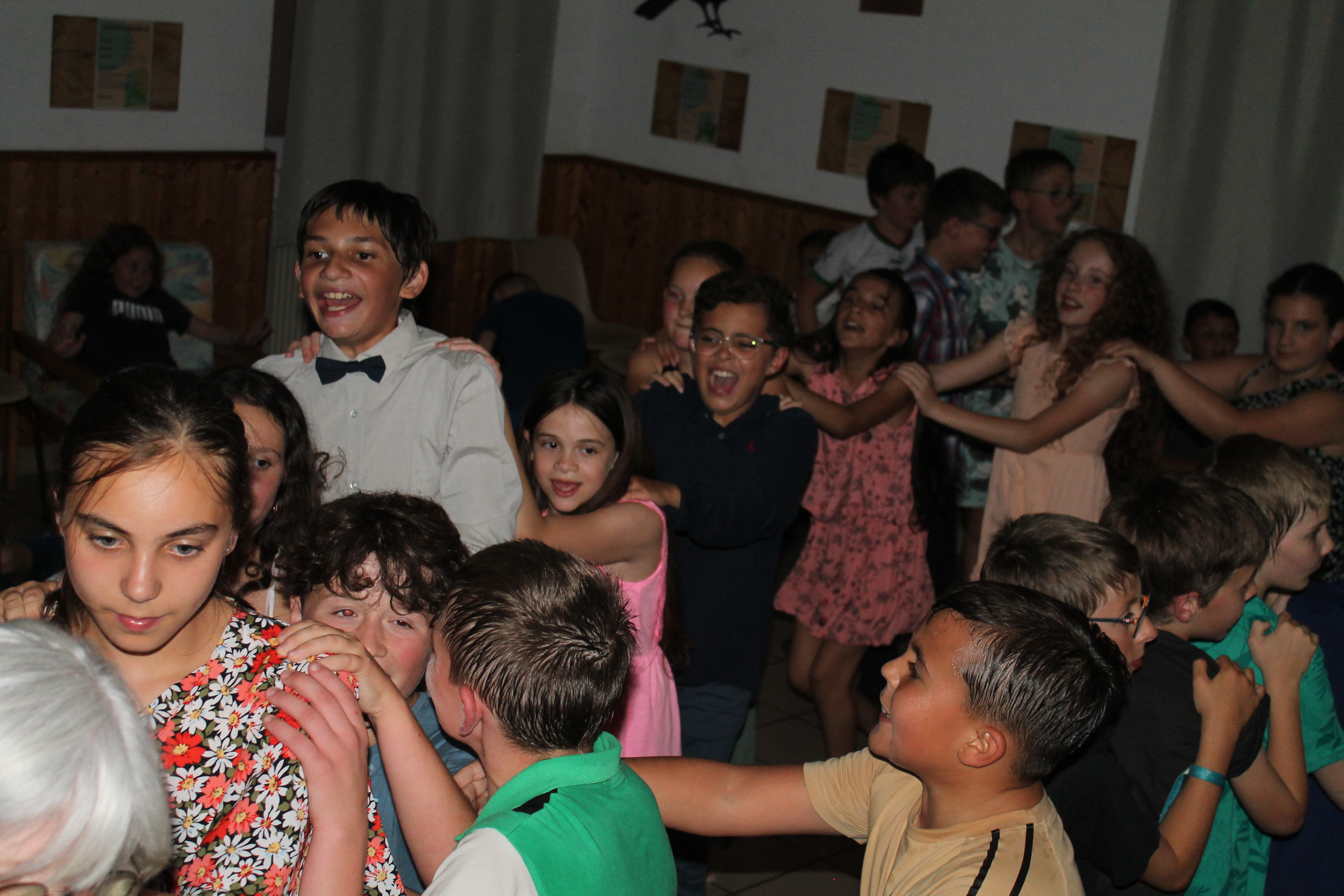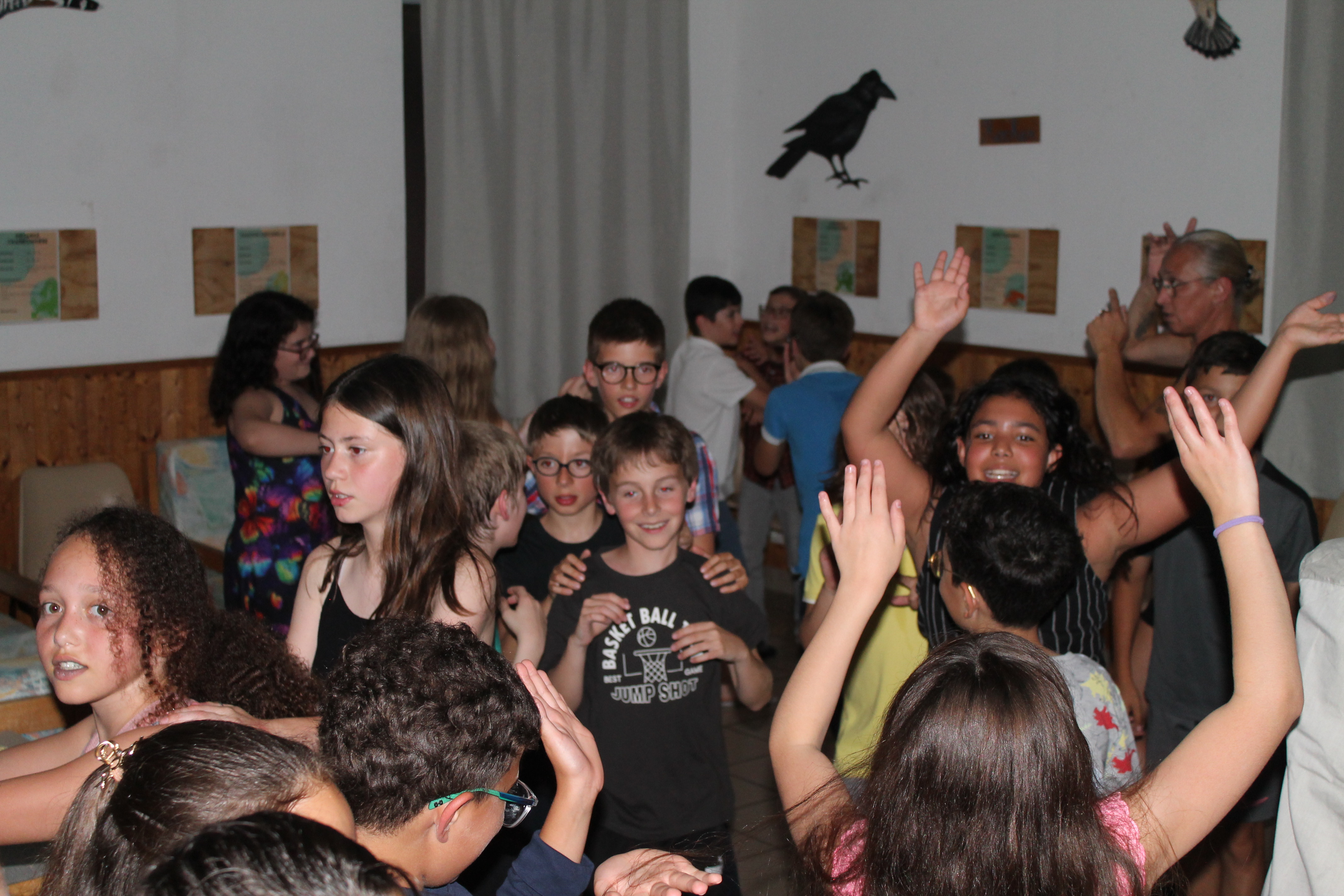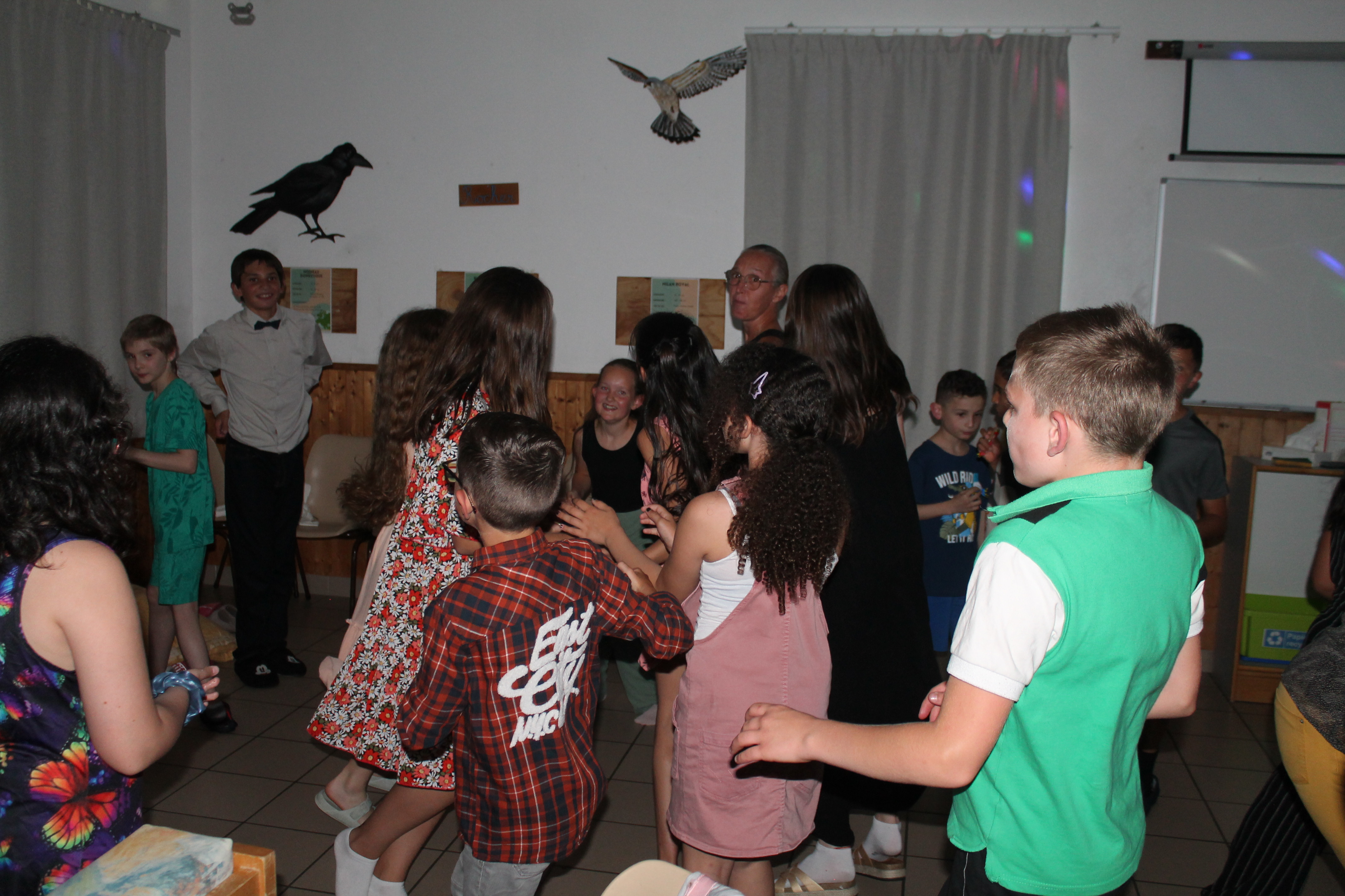 Pendant le repas du soir, Marc et Denis préparaient la boum pour pour mes camarades et moi. Après le repas nous sommes allé nous brosser les dents. Puis après notre brossage de dents nous sommes descendus dans le salle de la boum pour profiter. Aussi il y avait des bonbons, des boissons et de la musique. Et nous avons vraiment bien profité.