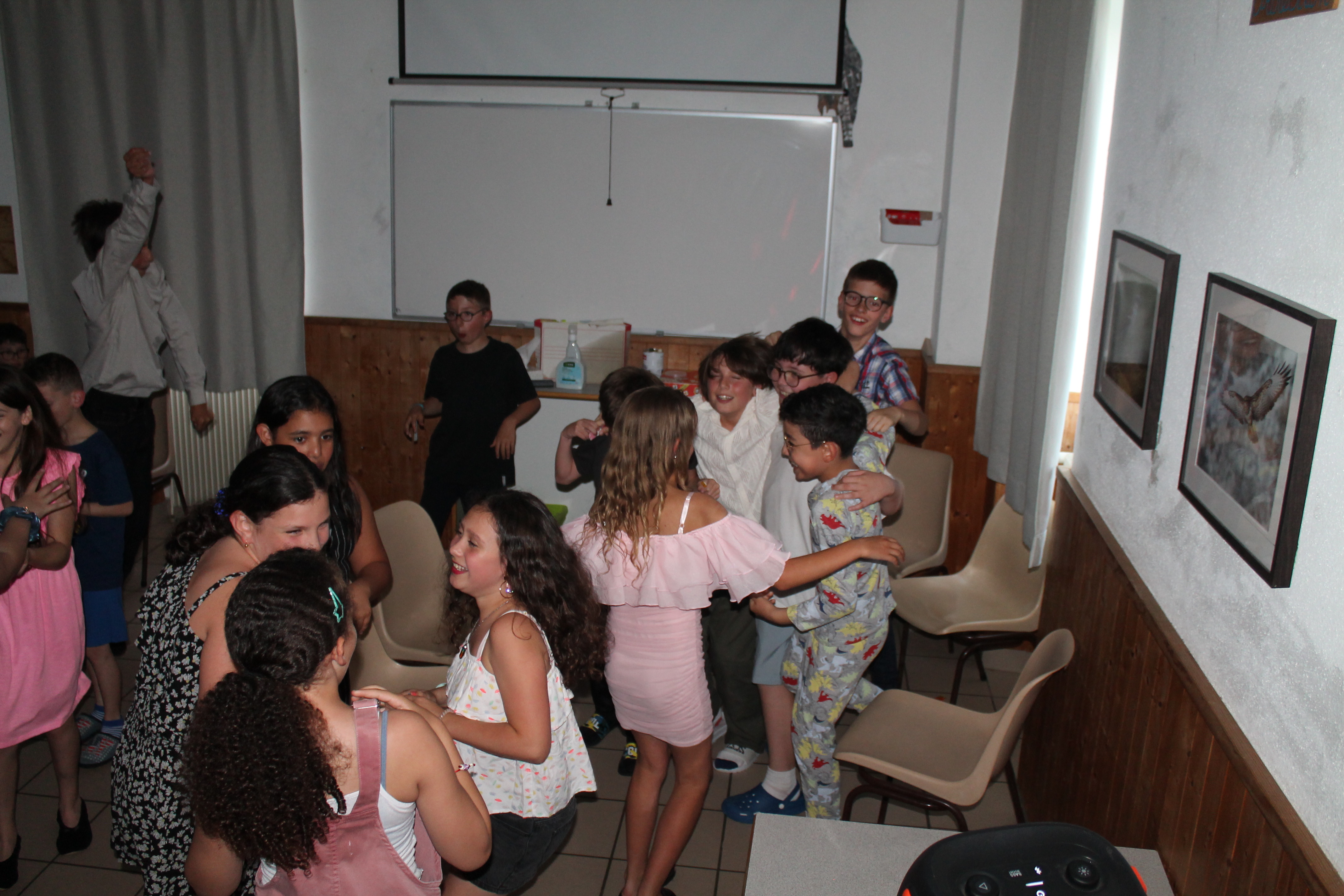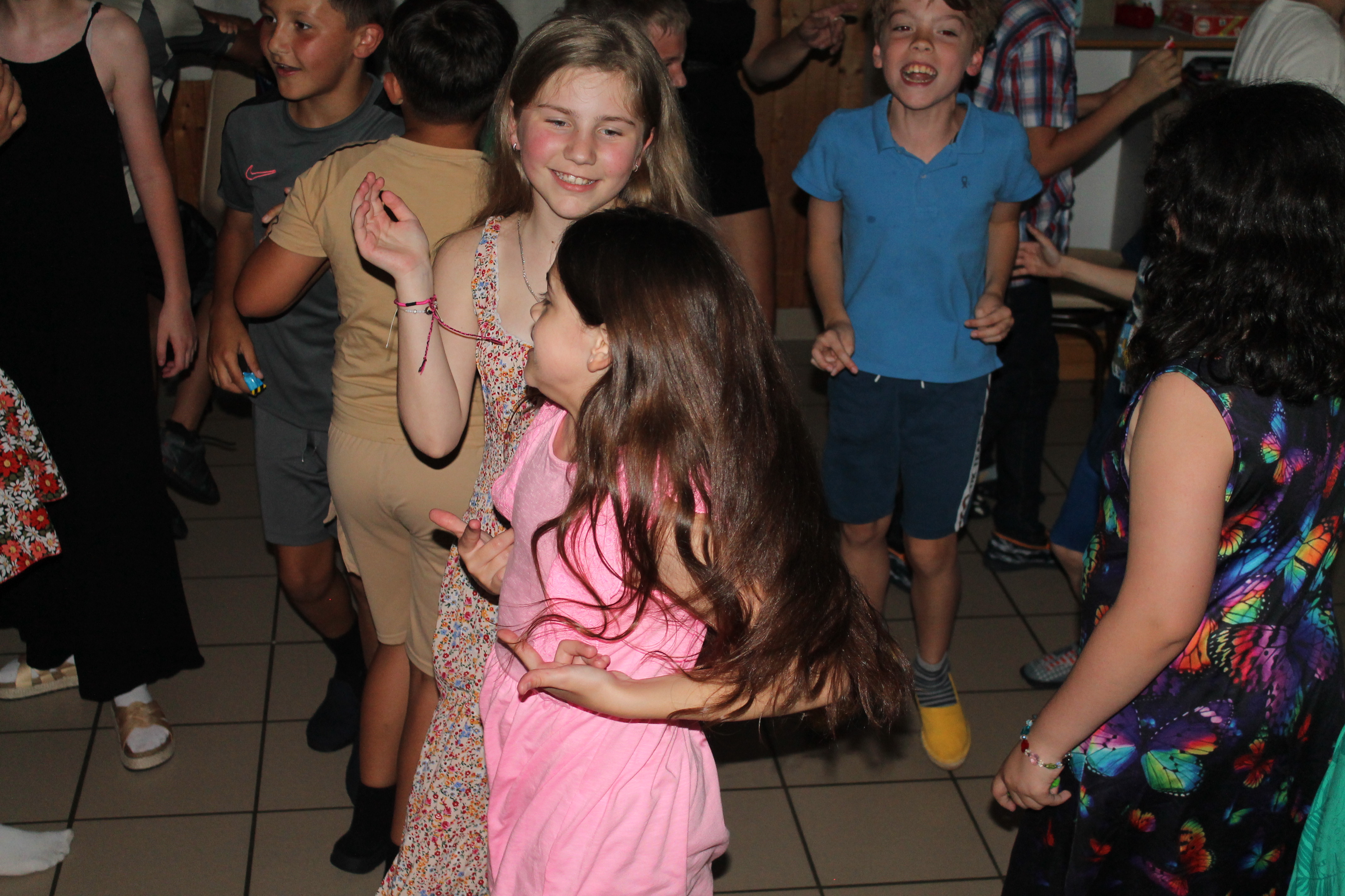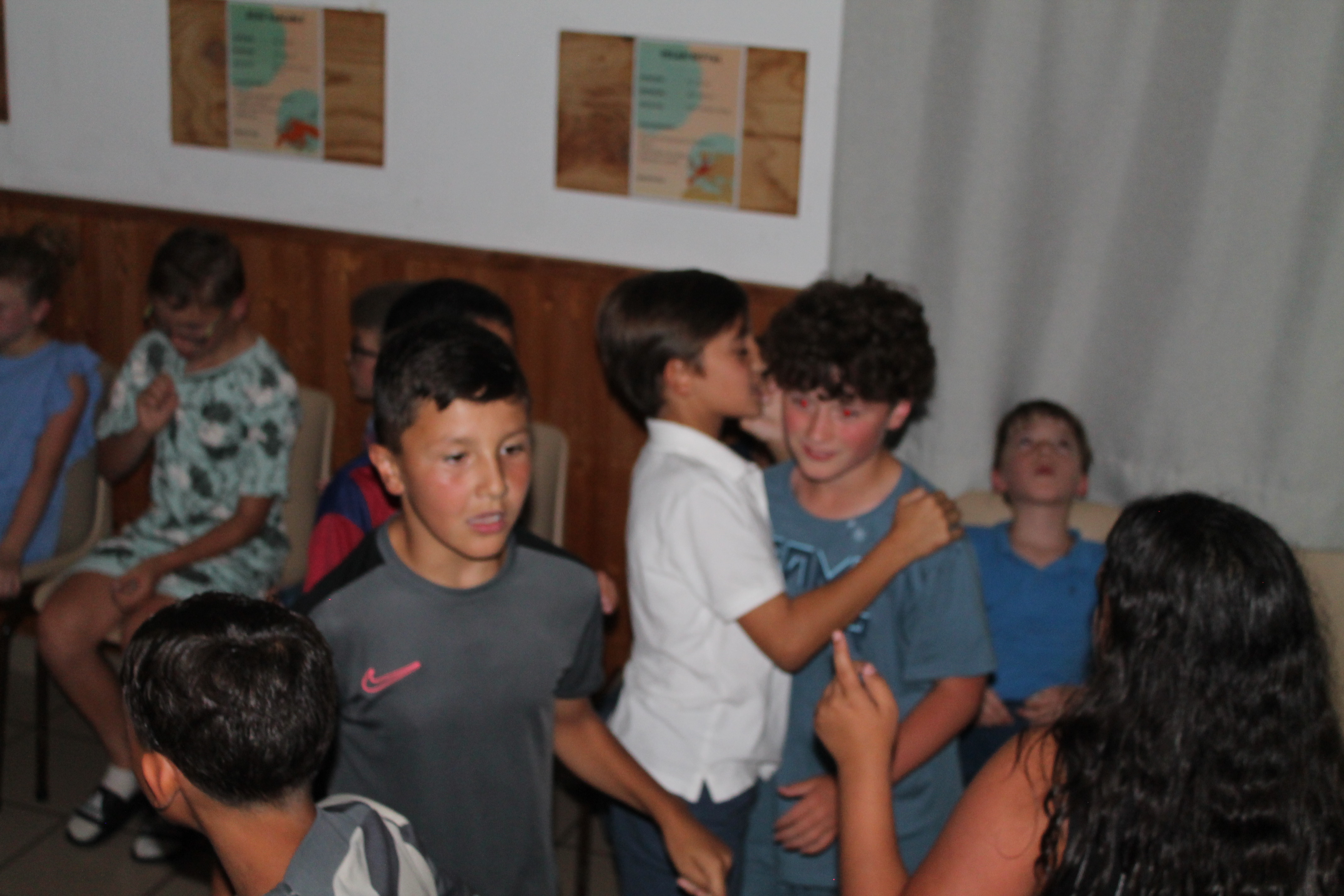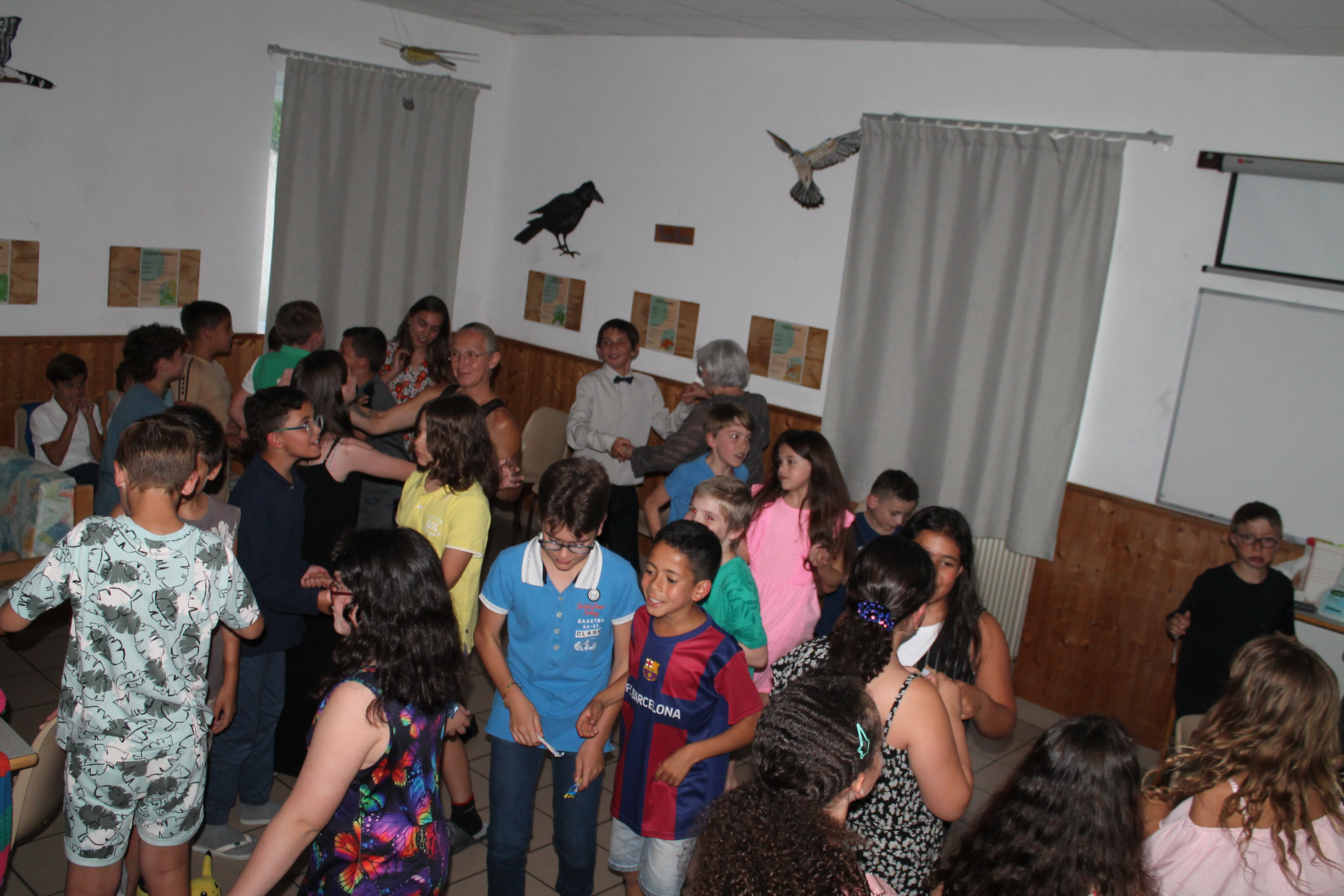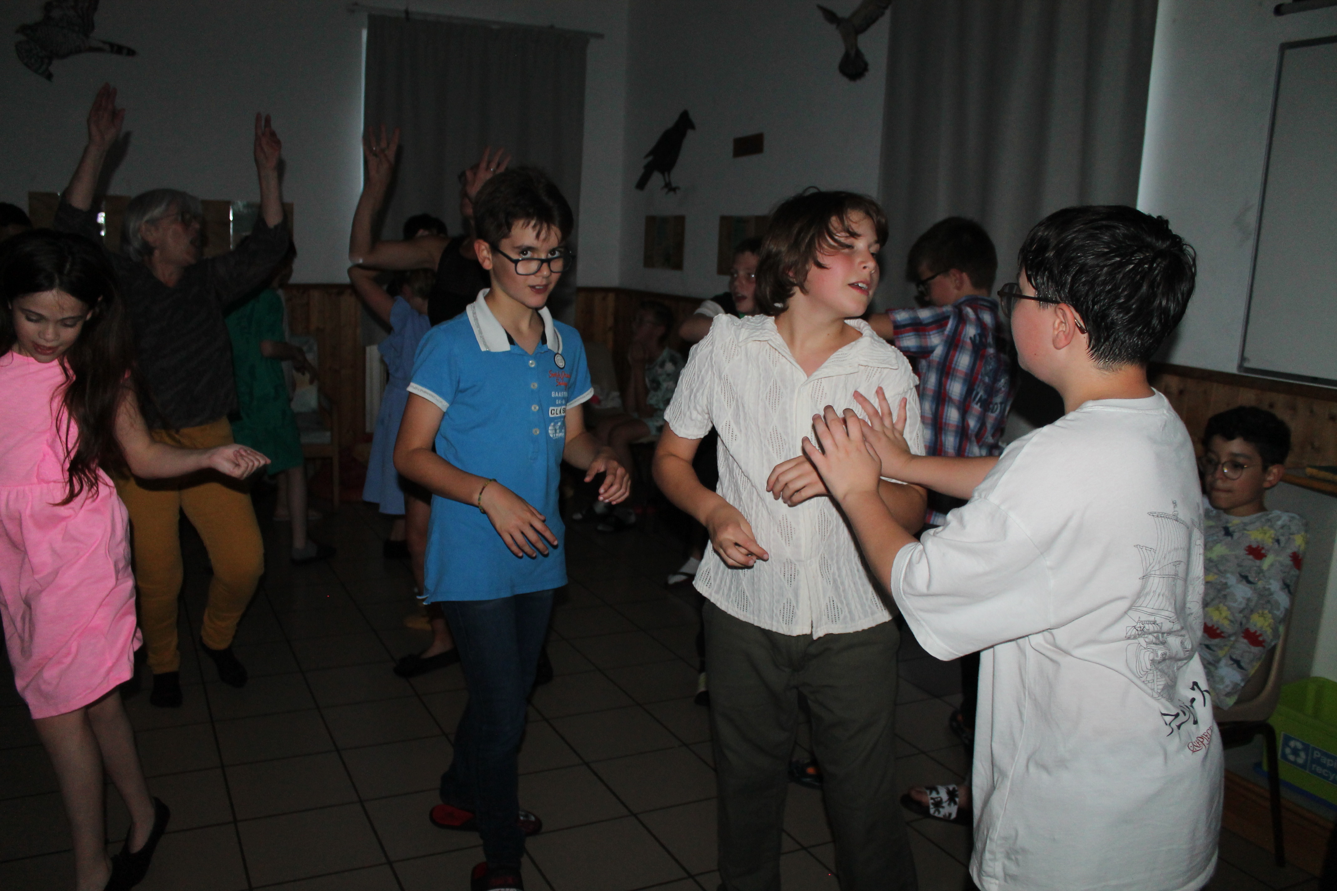 Pendant le repas du soir, Marc et Denis préparaient la boum pour pour mes camarades et moi. Après le repas nous sommes allé nous brosser les dents. Puis après notre brossage de dents nous sommes descendus dans le salle de la boum pour profiter. Aussi il y avait des bonbons, des boissons et de la musique. Et nous avons vraiment bien profité.