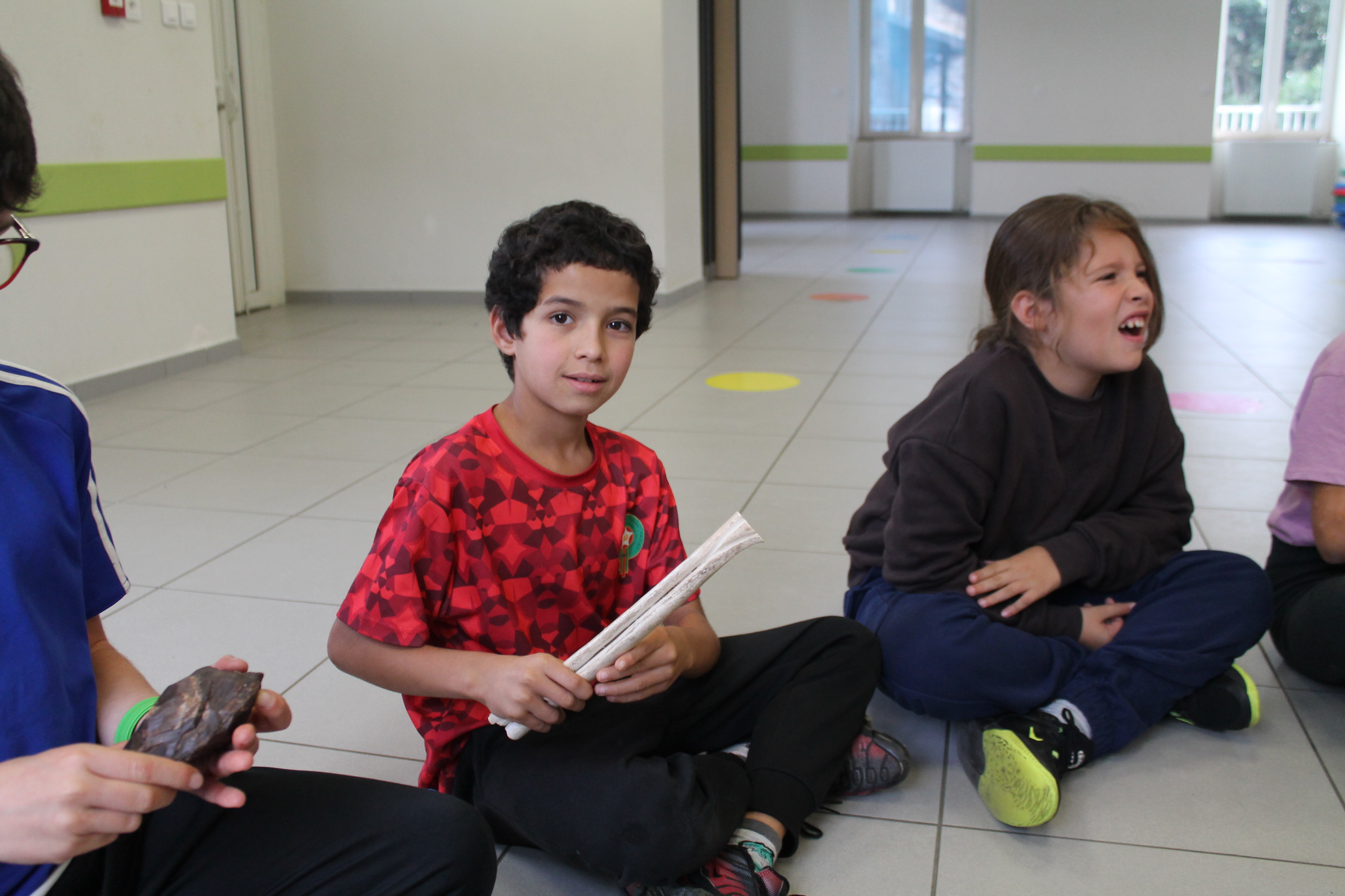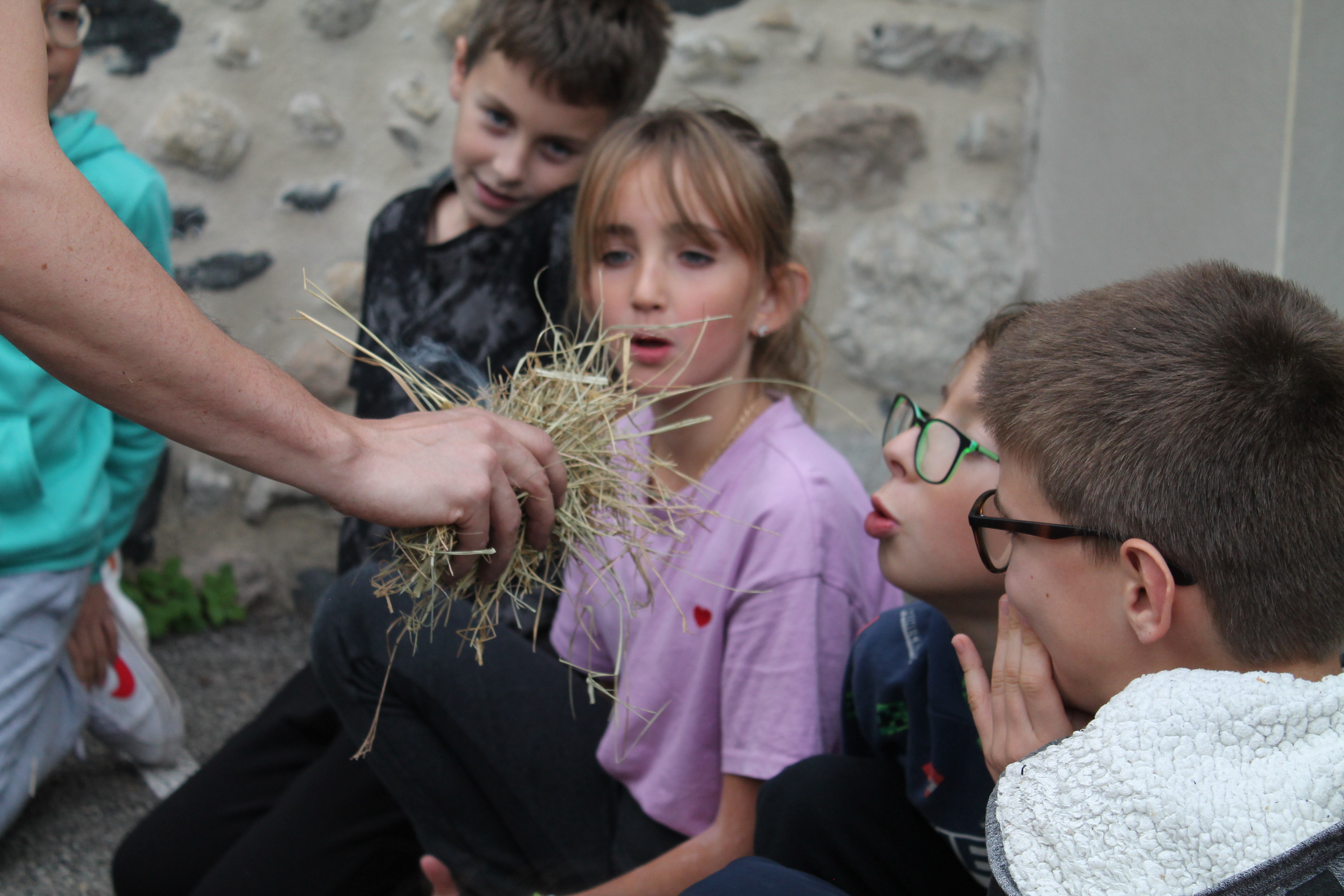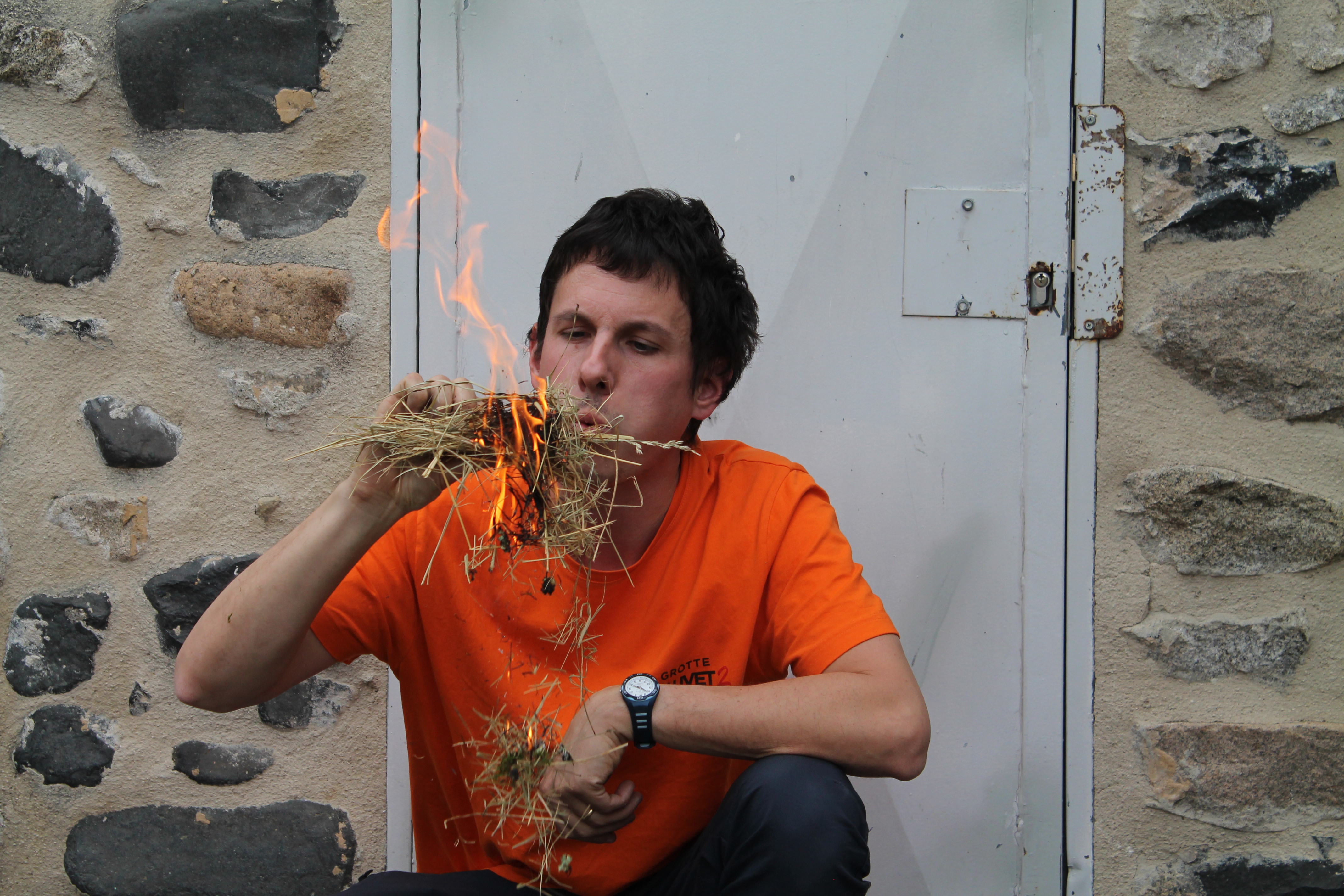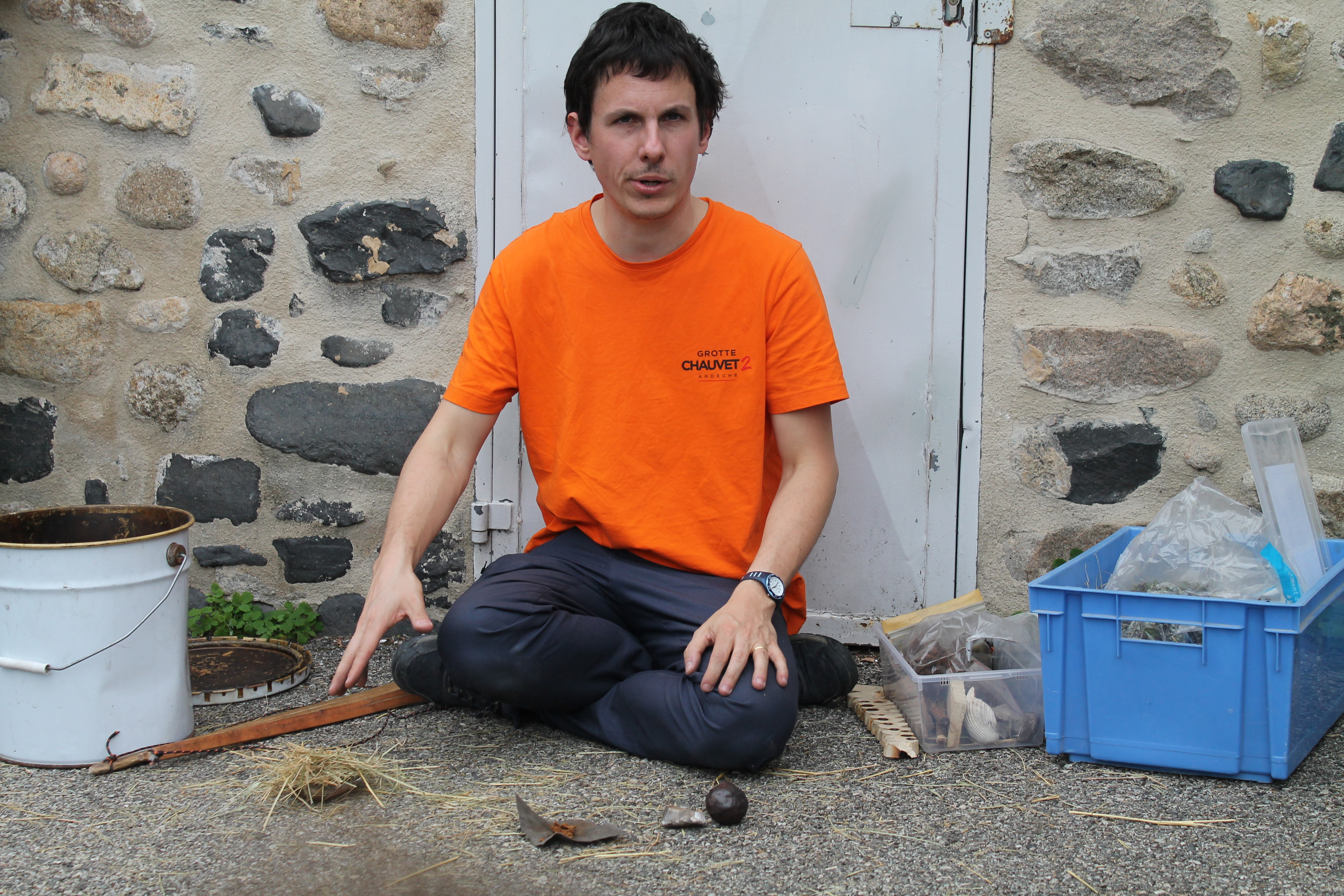 Florian qui travaille à la grotte Chauvet 2 est venu à l'école pour nous montrer des objets. Il y avait des os, une peau, une grosse dent de mammouth, des pierres pour allumer le feu, couper, racler les peaux. Florian nous a fait voir comment on allumait le feu dans la cour . Pour cela il a mis un bout de tissu et un morceau de champignon séché. Il tape une pierre contre une boule de fer. Une étincelle apparaît sur le champignon séché puis dans la paille. Il nous demande de souffler doucement et longuement : le feu apparaît !!!