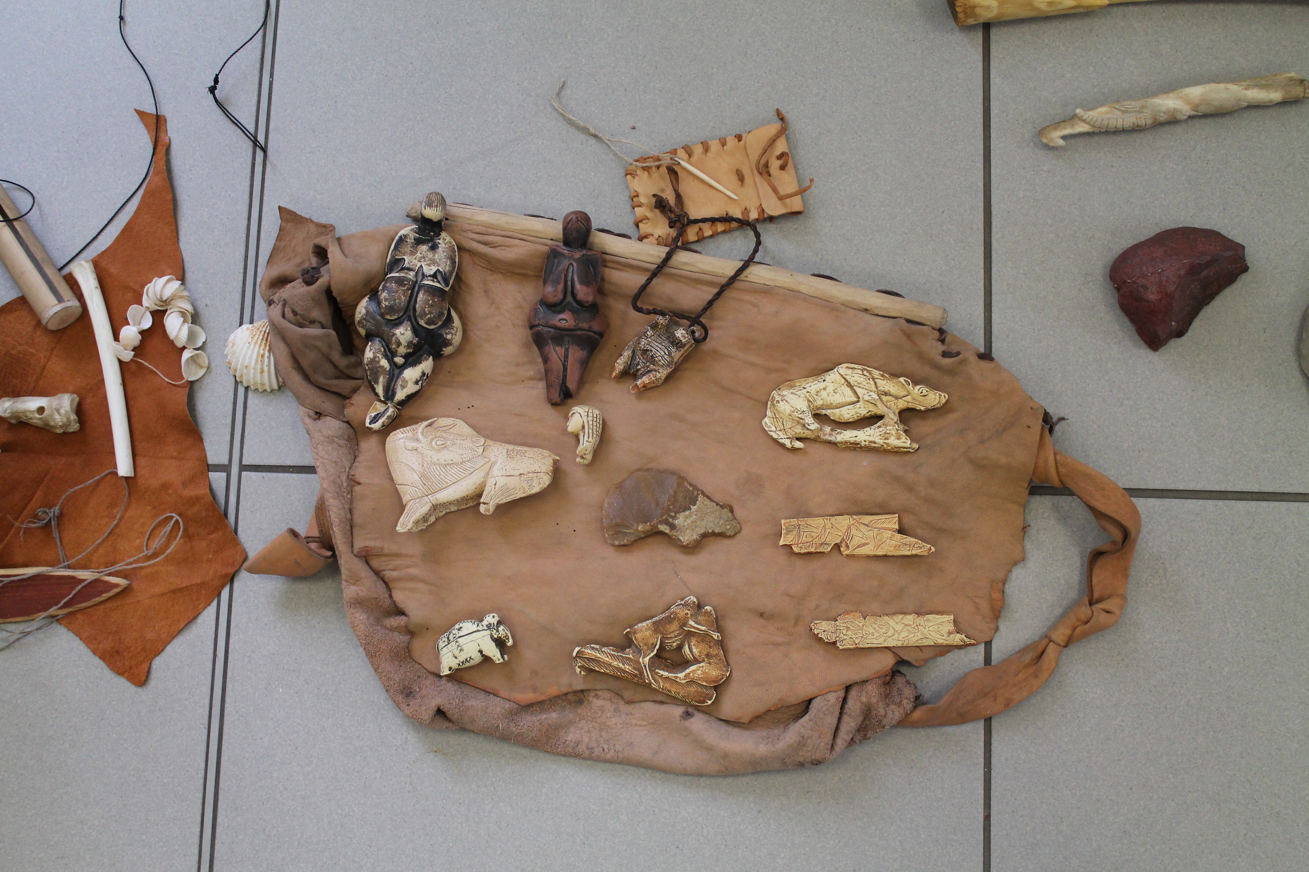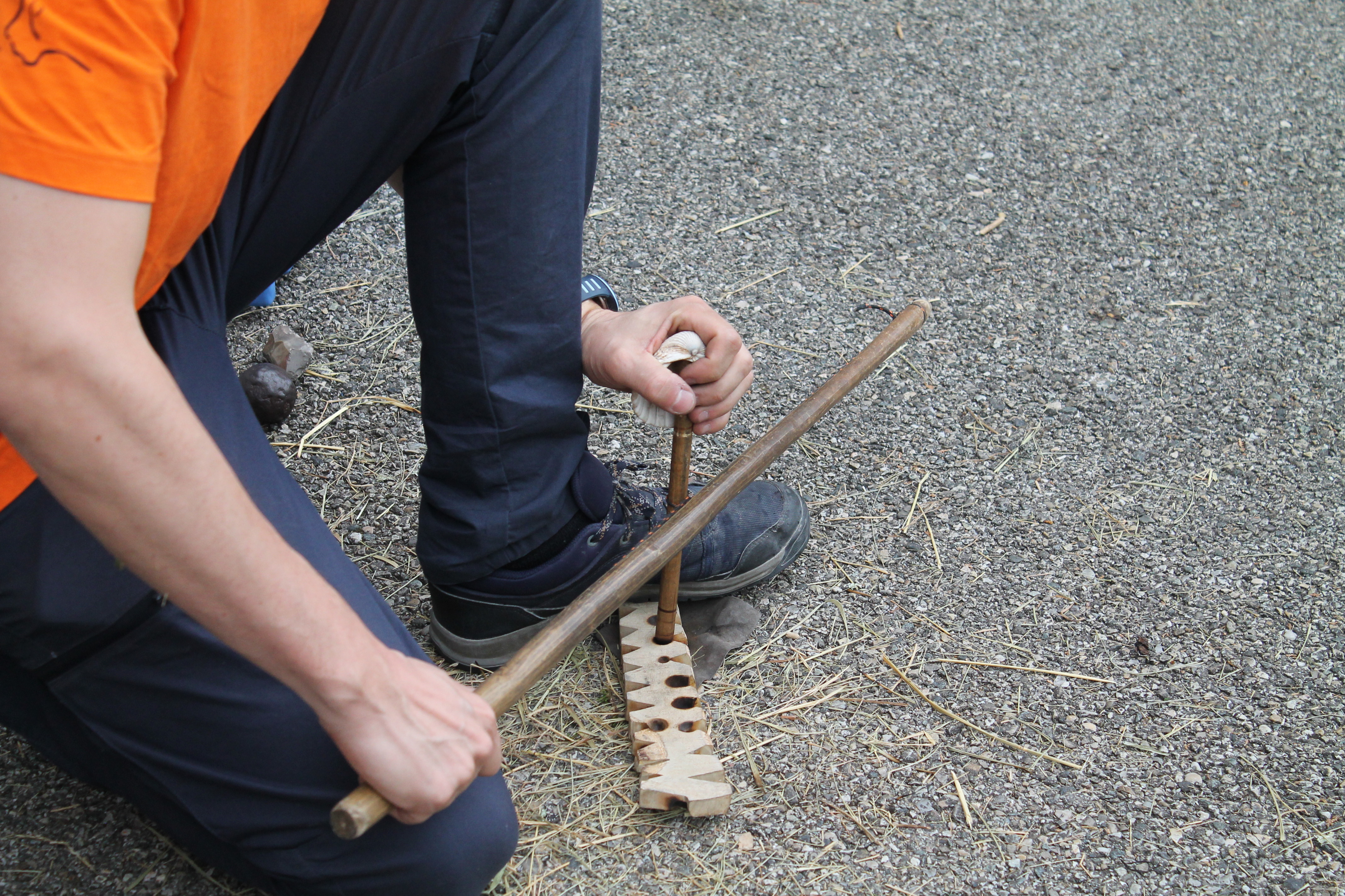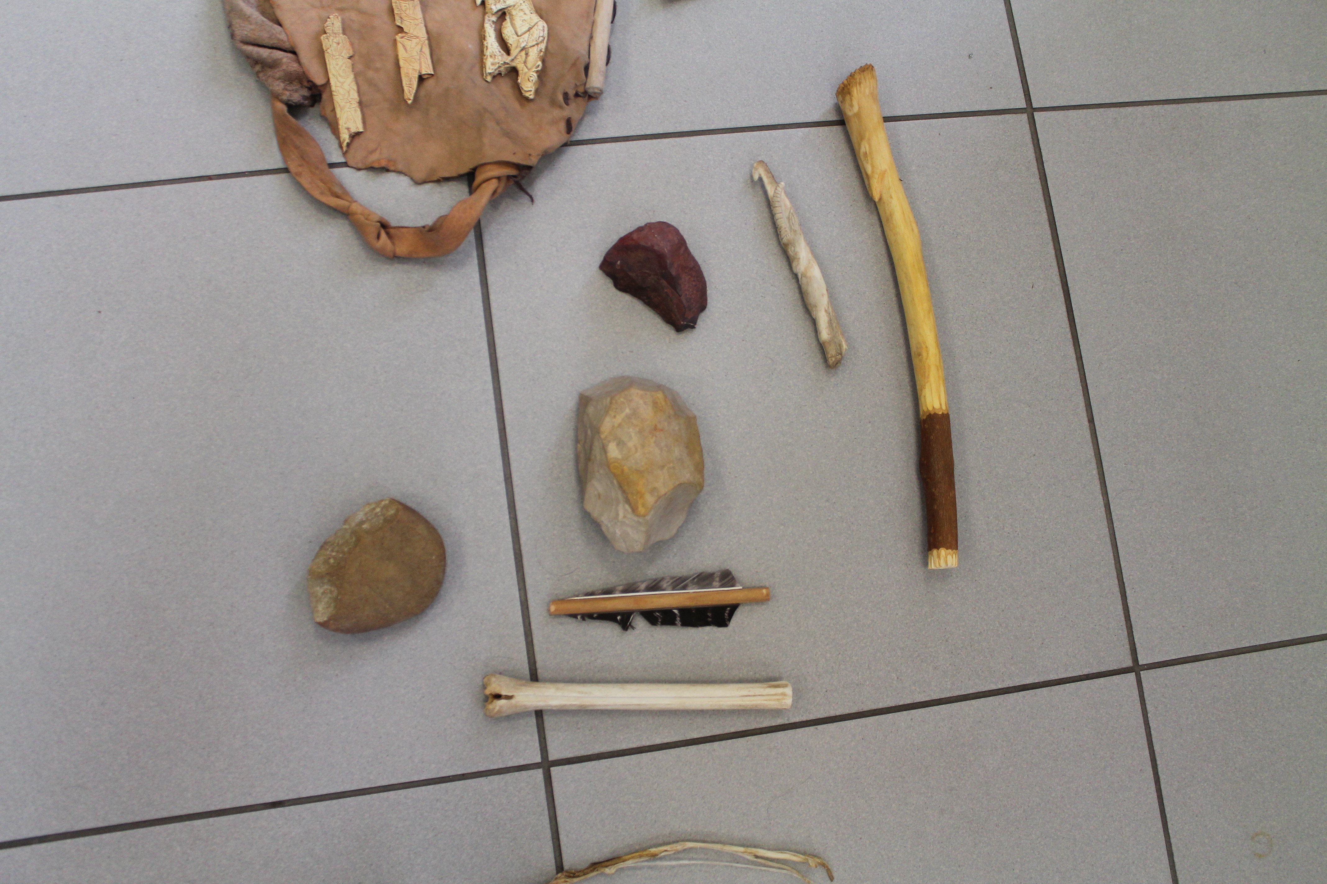 Florian qui travaille à la grotte Chauvet 2 est venu à l'école pour nous montrer des objets. Il y avait des os, une peau, une grosse dent de mammouth, des pierres pour allumer le feu, couper, racler les peaux. Florian nous a fait voir comment on allumait le feu dans la cour . Pour cela il a mis un bout de tissu et un morceau de champignon séché. Il tape une pierre contre une boule de fer. Une étincelle apparaît sur le champignon séché puis dans la paille. Il nous demande de souffler doucement et longuement : le feu apparaît !!!