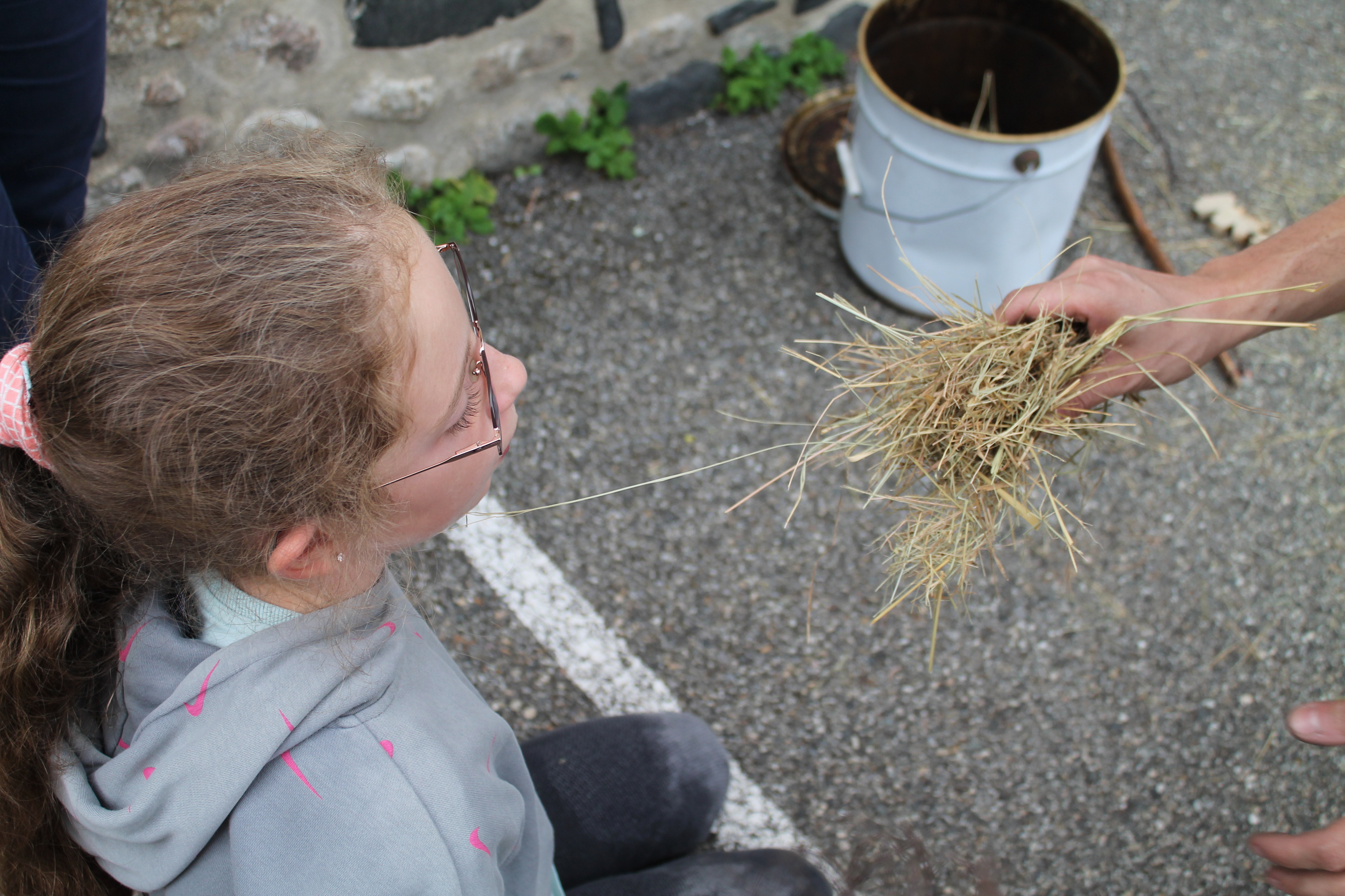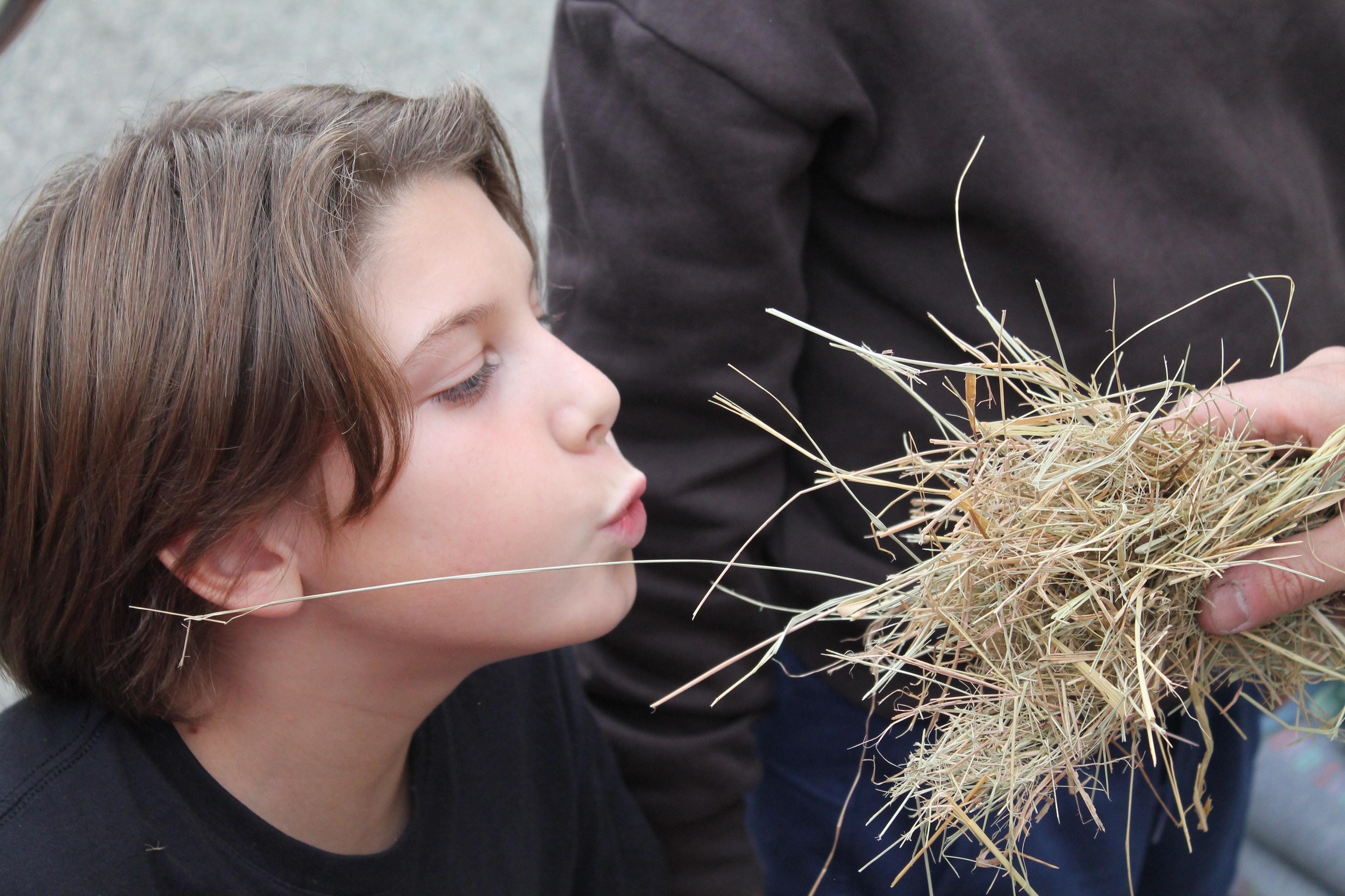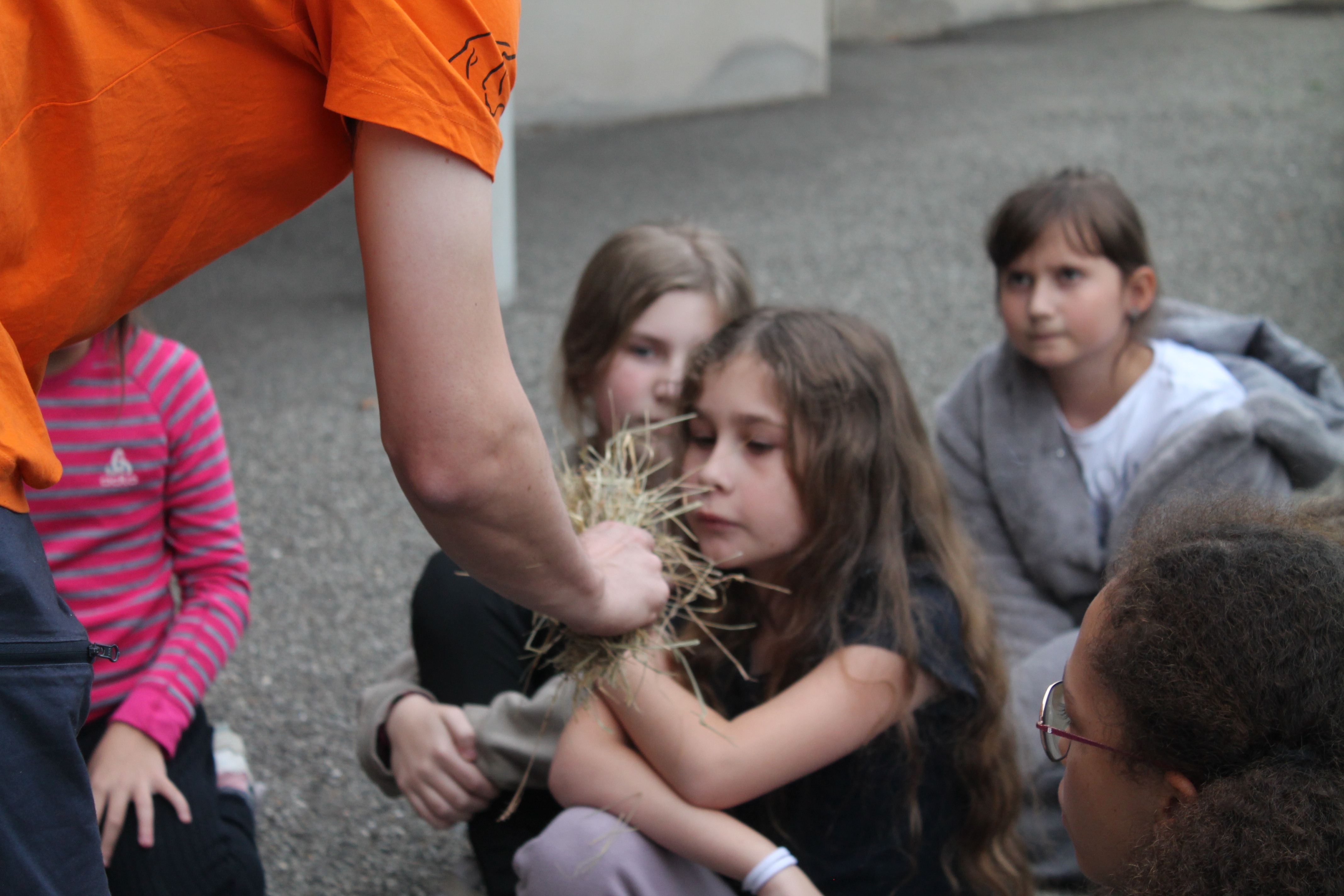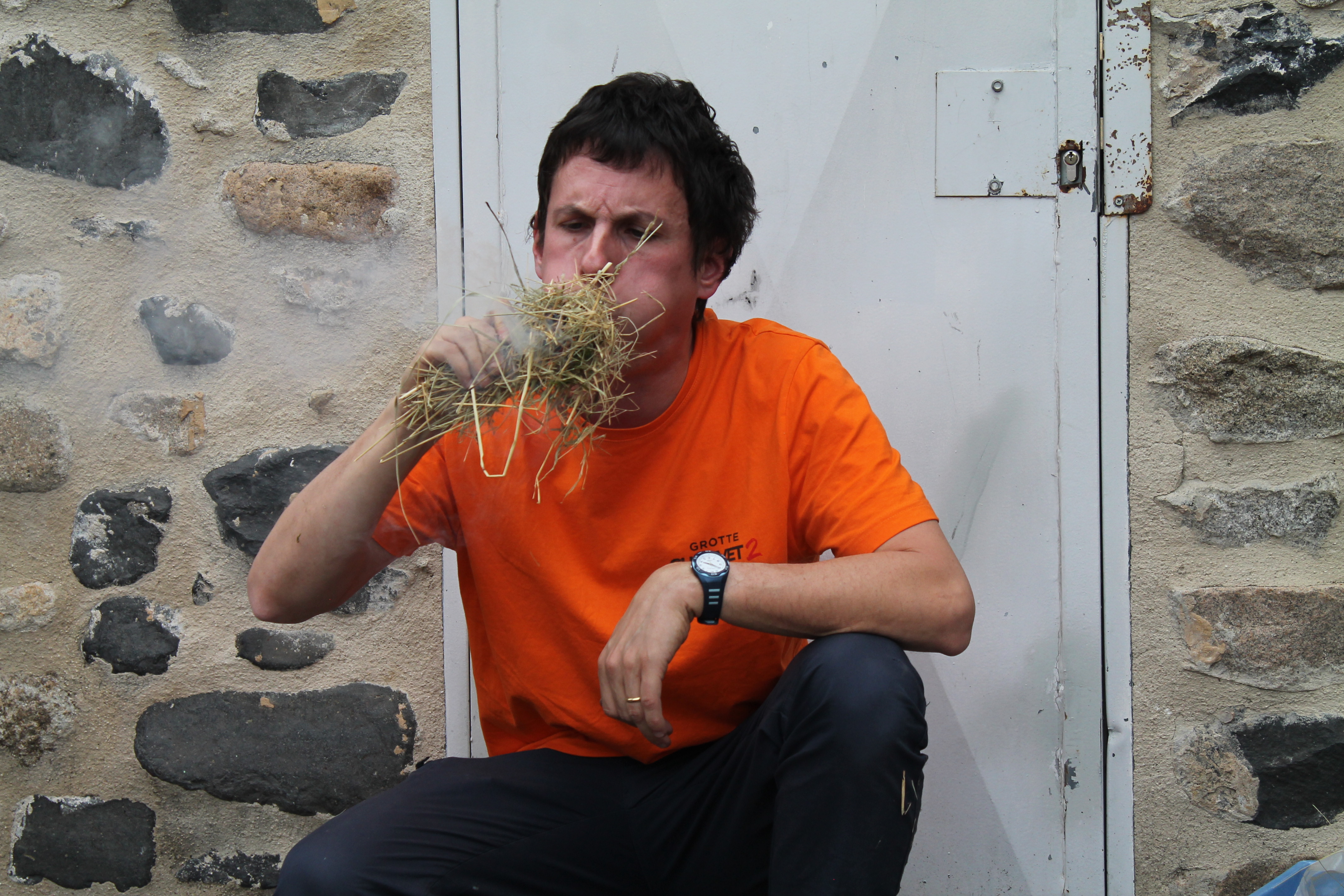 Florian qui travaille à la grotte Chauvet 2 est venu à l'école pour nous montrer des objets. Il y avait des os, une peau, une grosse dent de mammouth, des pierres pour allumer le feu, couper, racler les peaux. Florian nous a fait voir comment on allumait le feu dans la cour . Pour cela il a mis un bout de tissu et un morceau de champignon séché. Il tape une pierre contre une boule de fer. Une étincelle apparaît sur le champignon séché puis dans la paille. Il nous demande de souffler doucement et longuement : le feu apparaît !!!