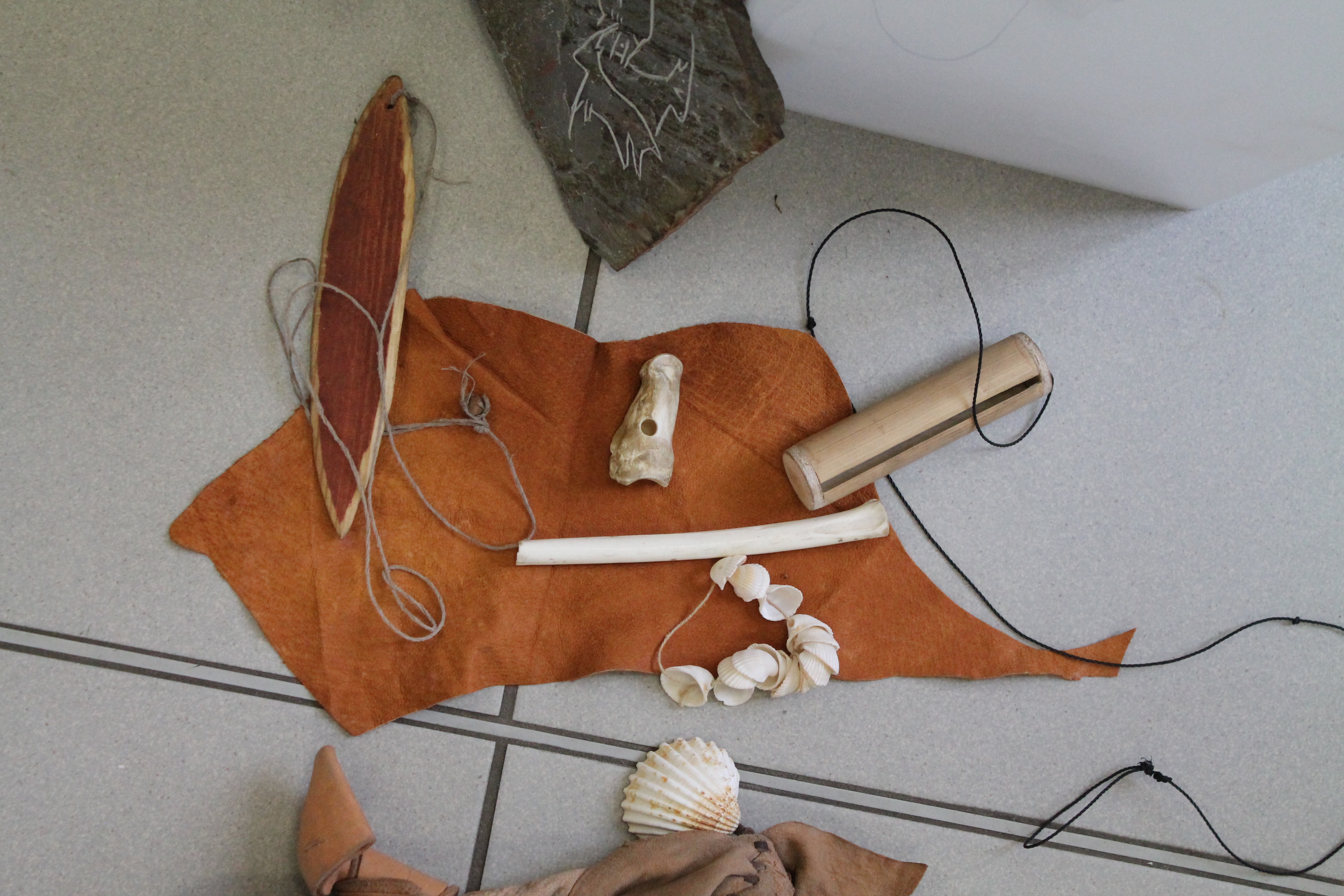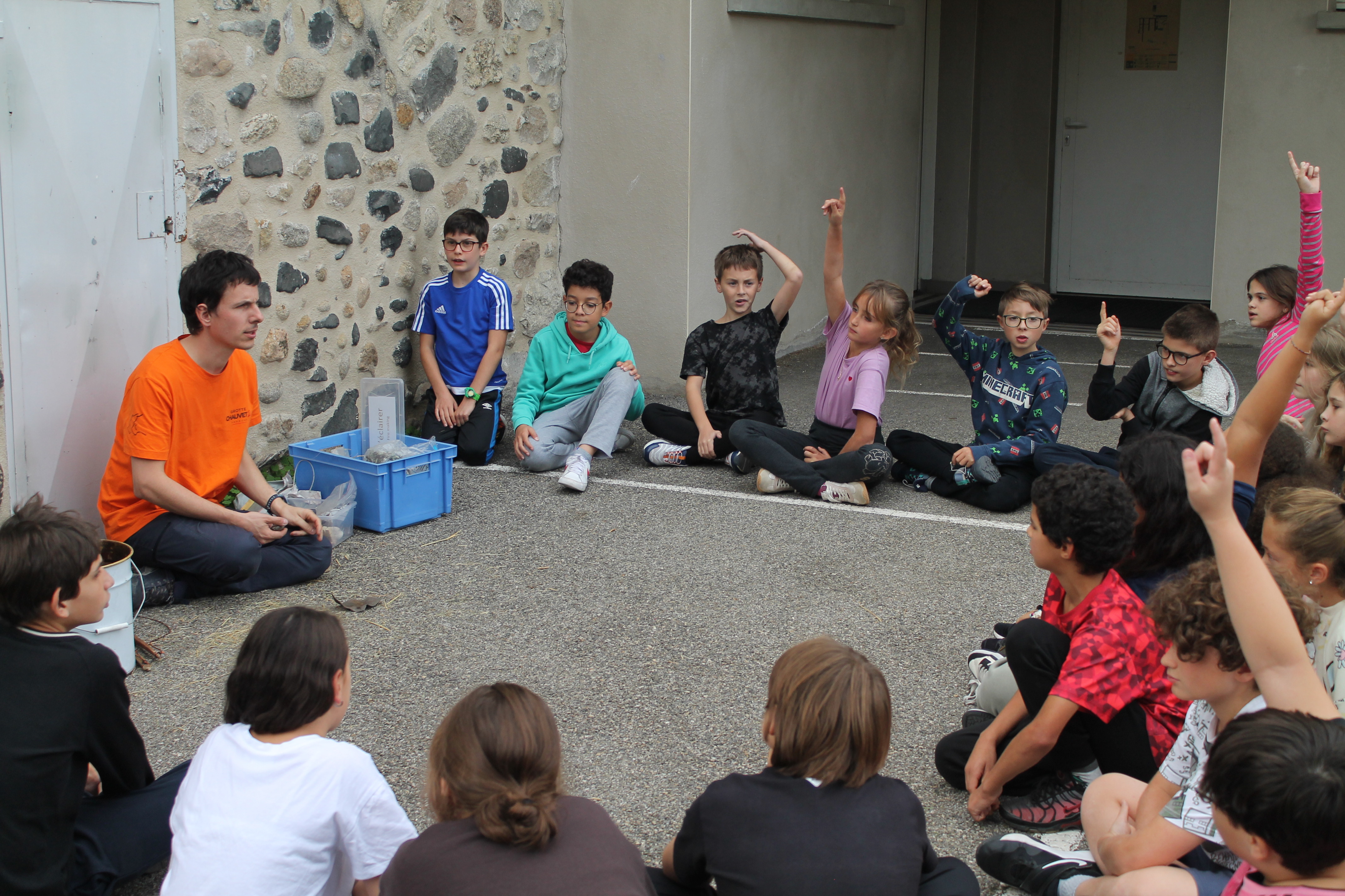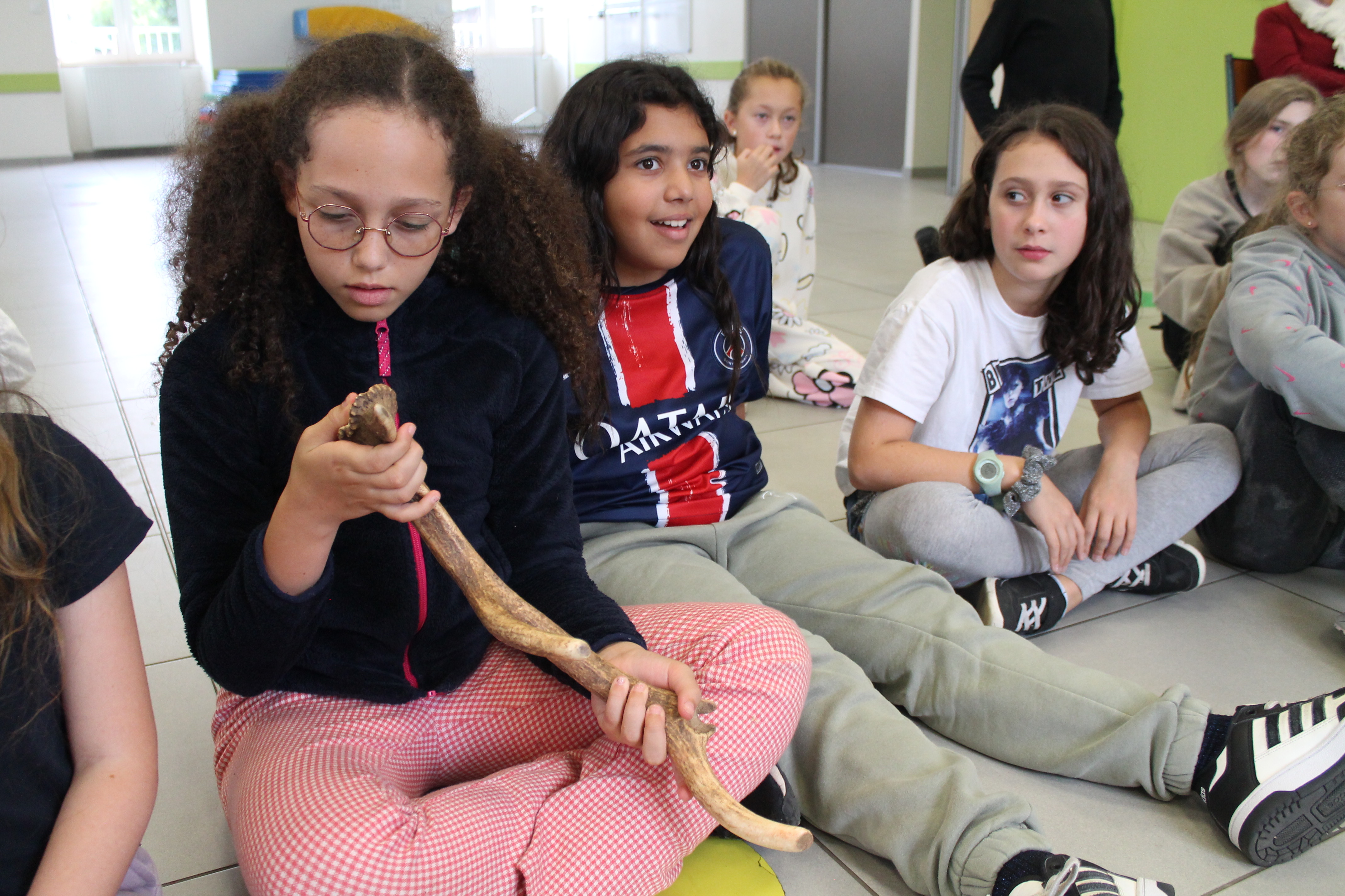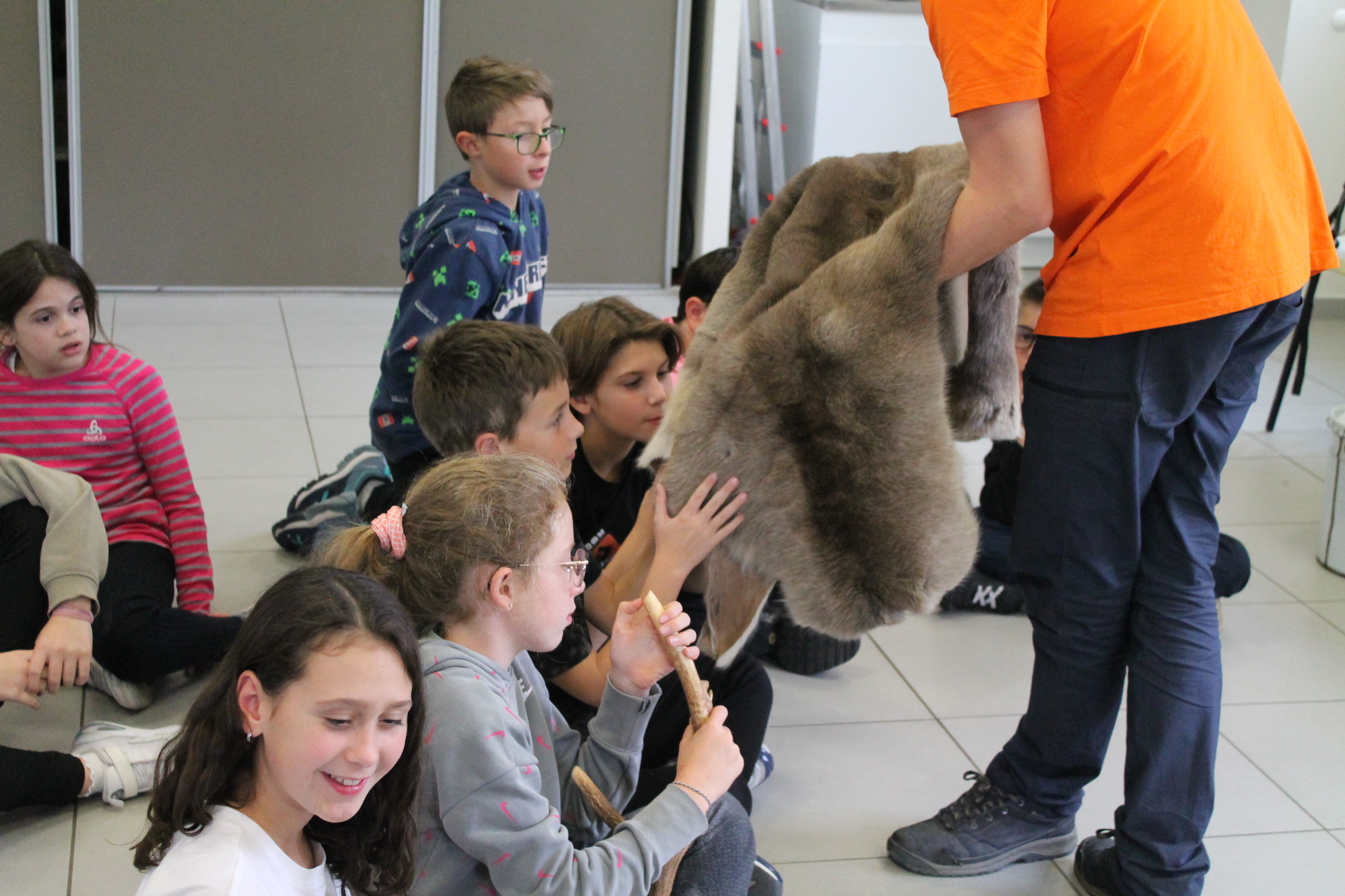Un monsieur est venu et s’est présenté. Il s’appelle Florian et il travaille à la grotte Chauvet 2. Il nous a expliqué comment on vivait à la préhistoire et nous à posé des question. Nous avons tous répondu à ses questions. Et après il nous à montré une pierre qui servait à racler la peau, il nous l'a passée est nous l'avons regardée. Puis il a fait la même chose mais avec un bois de cerf chassé à la préhistoire. Puis enfin une vraie peu de cerf grise. Elle était toute douce. Aussi il nous a montré des bijoux en bois, c’était des corps de femme, une flûte en os d’oiseau, des sculptures en bois (des animaux), des armes, une dent de mamouth et un gros champignon. A la fin nous sommes allés dans la cour et il nous à montré comment faisaient les hommes préhistoriques pour faire du feu, il nous à fait souffler sur la braise pour qu’elle s’embrase et elle s’est enflammée, il y a eu du feu. Wouuuu !